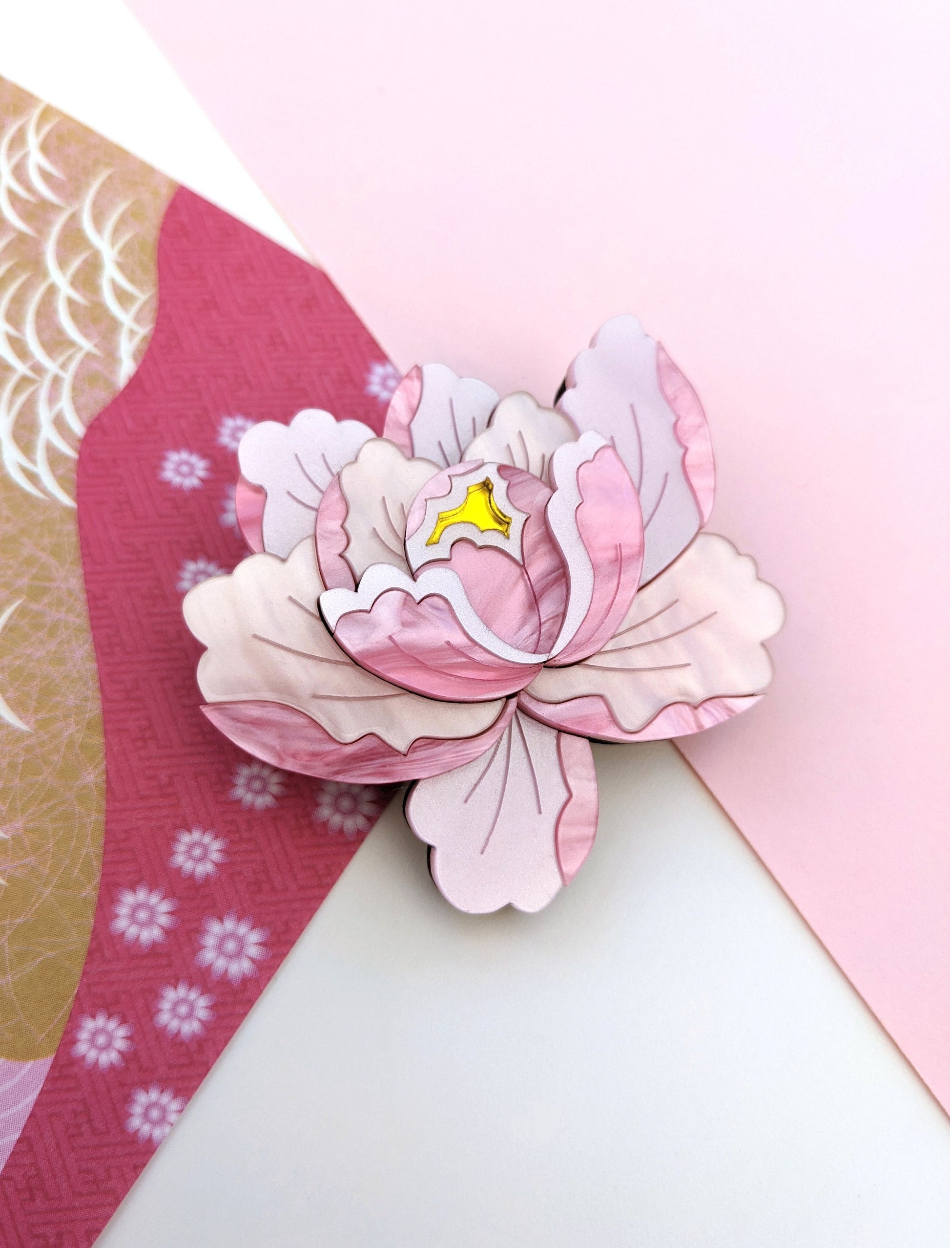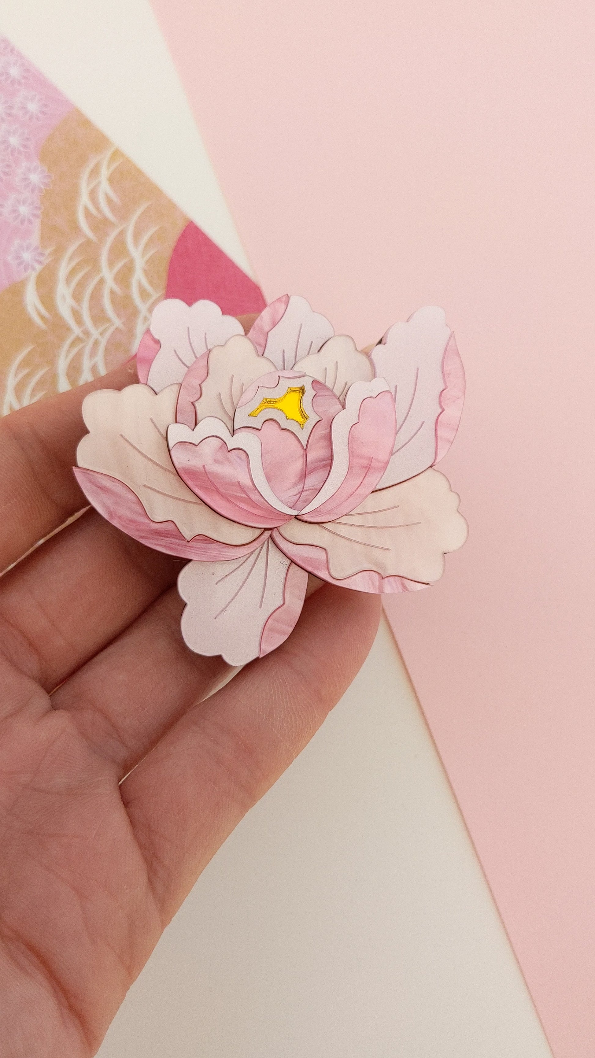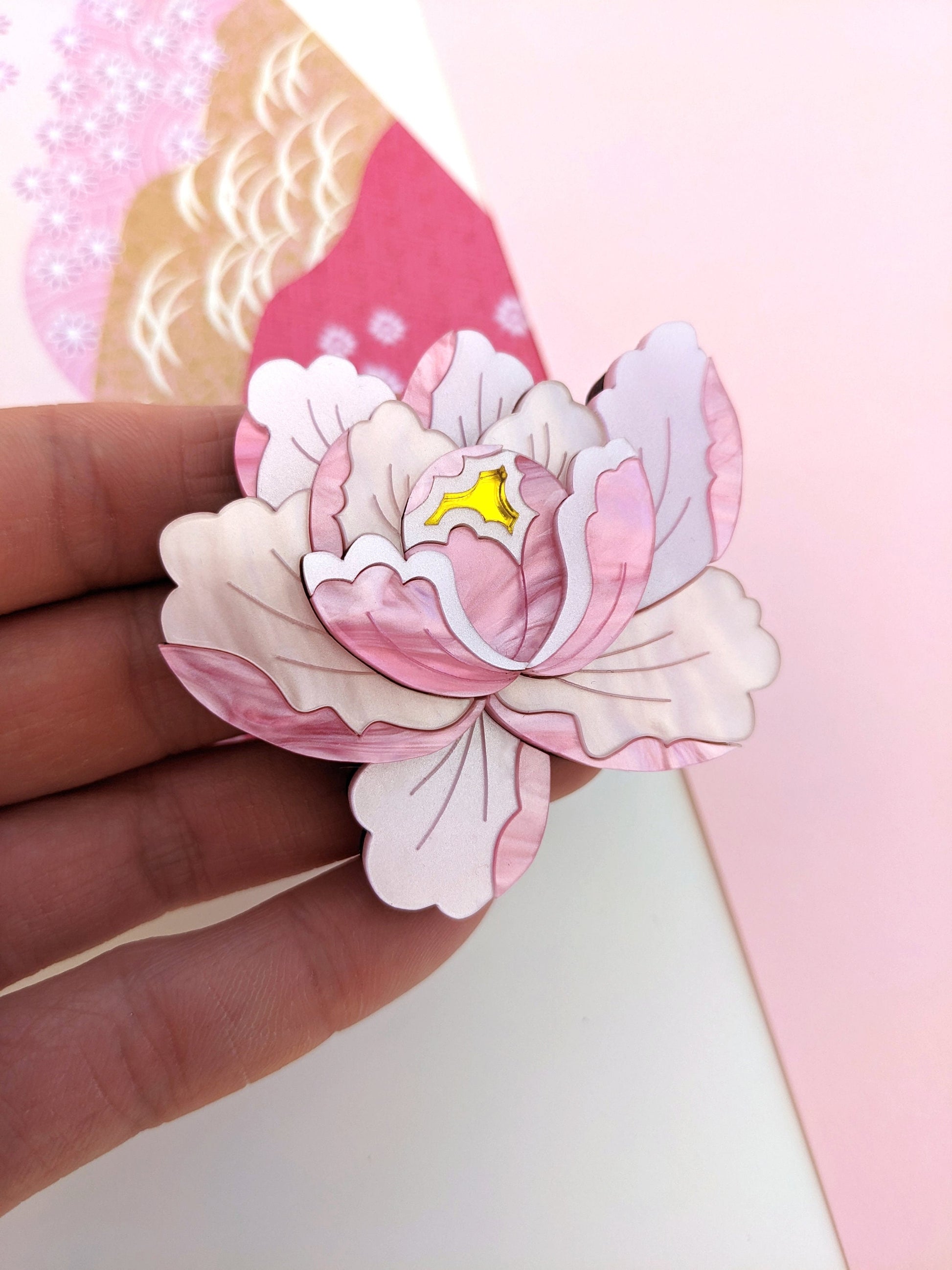 Inspired by Japanese style, this brooch is a nice wearable piece that is easy to wear and can be paired with other pieces. The brooch measures approximately h5.7cm x w5.4cm at the angle it is intended to be worn (see photo) and features hand mixed pearl marble, pearlescent, plain Perspex and mirror acrylic backed onto a varnished ash veneered plywood base with a little plywood layering which adds depth. This can be changed to acrylic if preferred, just message me to request. I always attach brooch backs on brooches horizontally with a strong glue and they're mostly the 3 hole 35mm type unless the brooch is smaller. All work is solely done by Rock The Panda designer and maker Ruth Anna Moore in Sheffield, United Kingdom.
