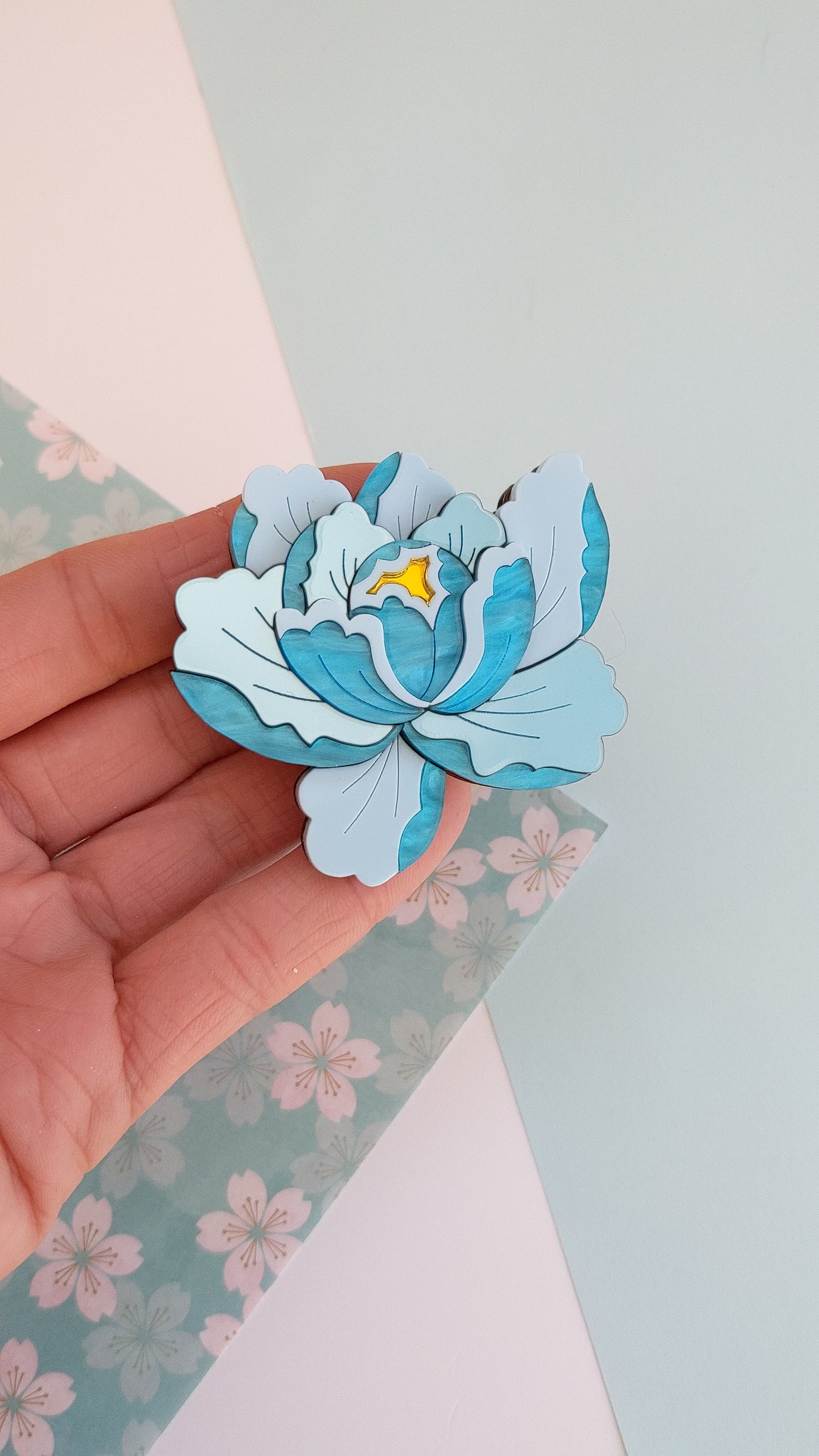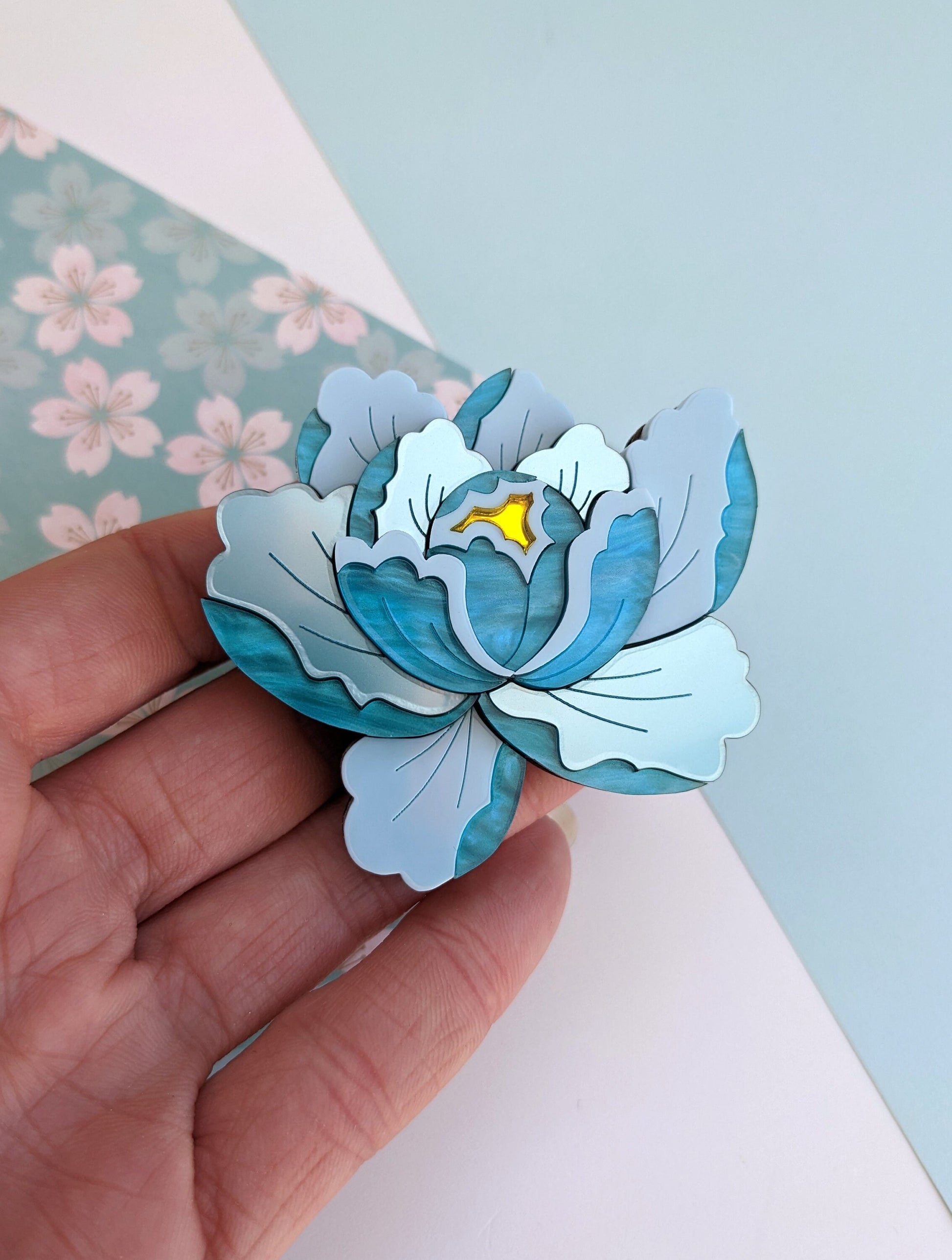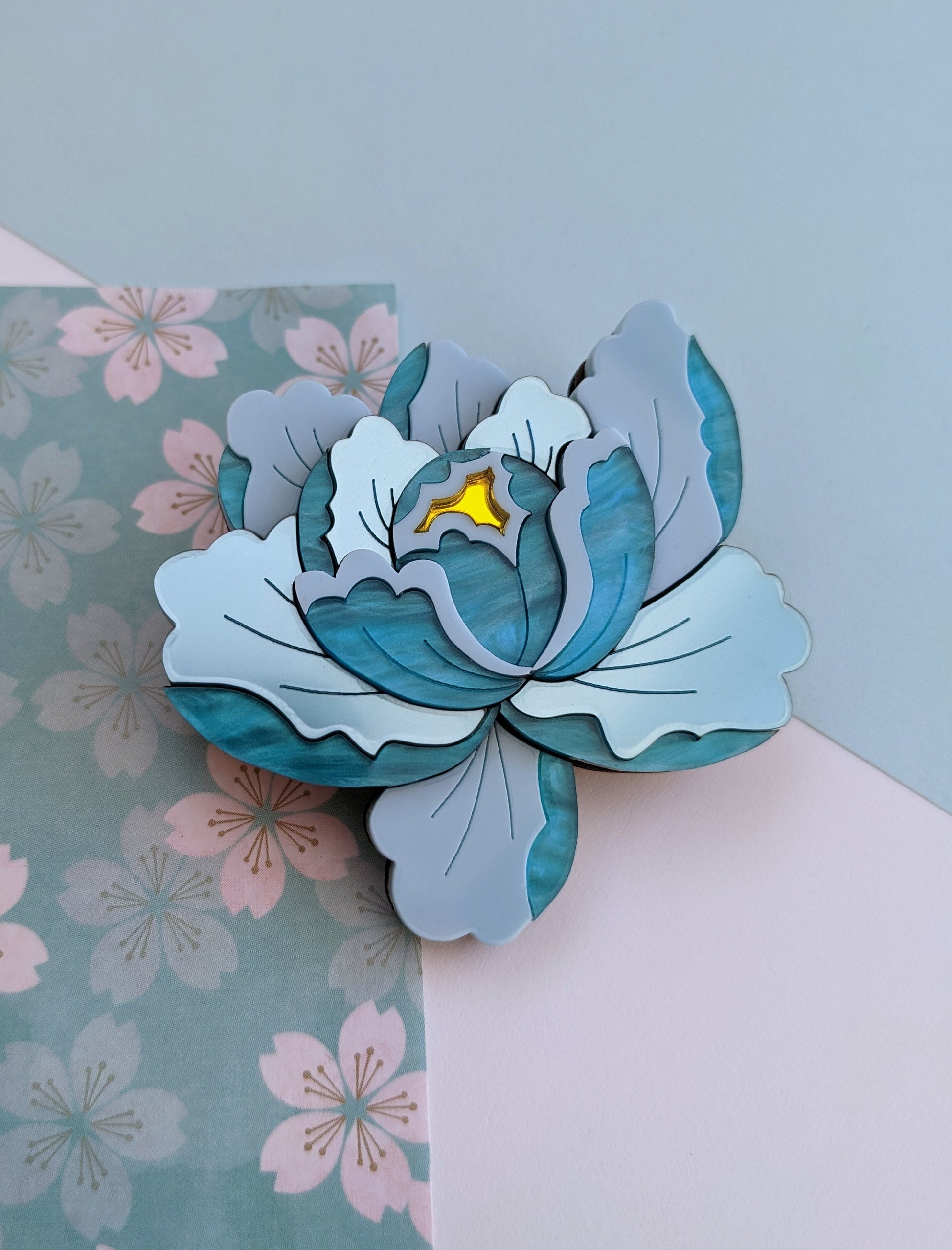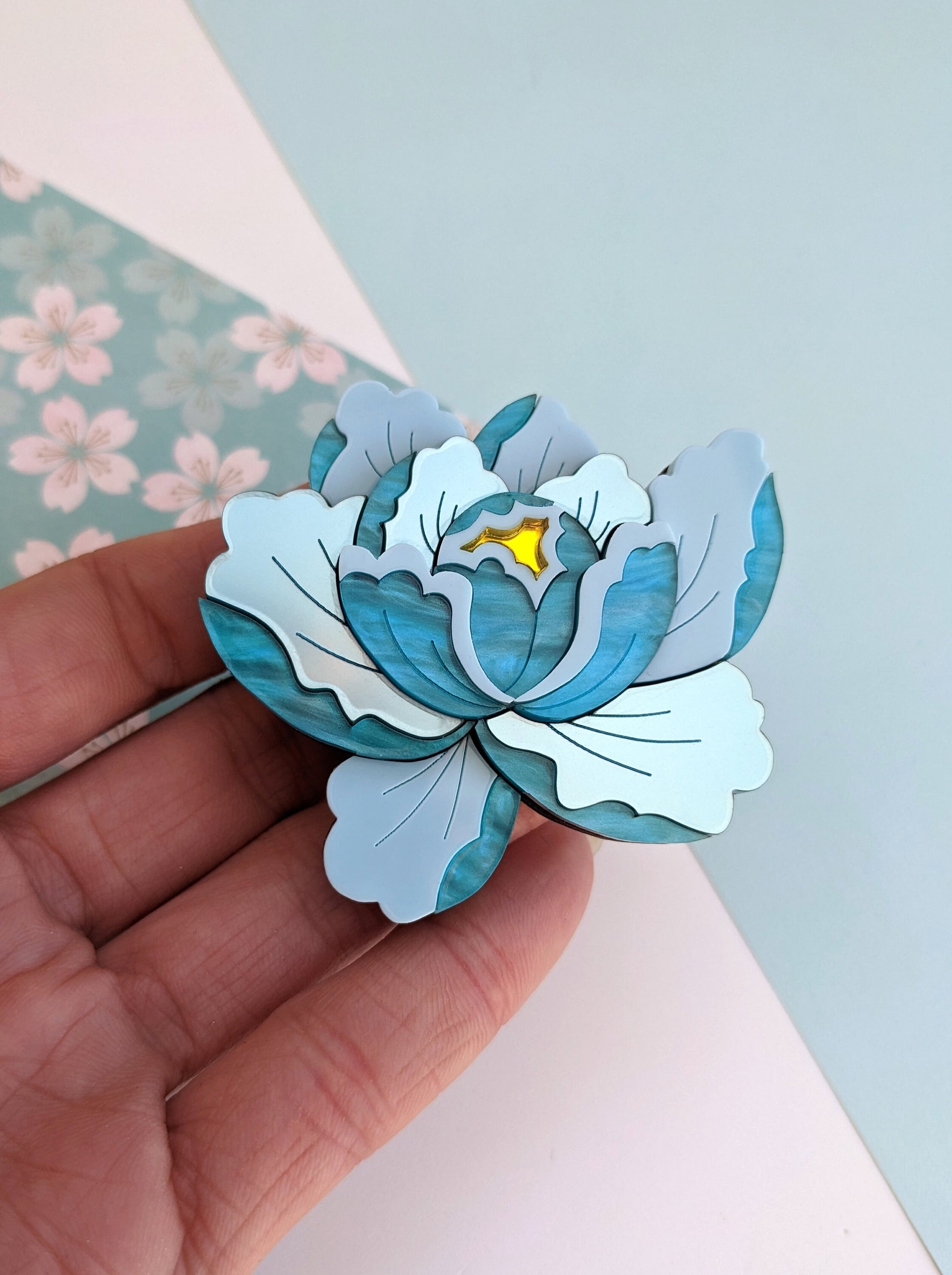 Inspired by Japanese style, this brooch is a nice wearable piece that is easy to wear and can be paired with other pieces. The brooch measures approximately h5.7cm x w5.4cm at the angle it is intended to be worn (see photo) and features hand mixed pearl marble, metallic acrylic, plain Perspex and mirror acrylic backed onto a varnished ash veneered plywood base with a little plywood layering which adds depth. This can be changed to acrylic if preferred, just message me to request. I always attach brooch backs on brooches horizontally with a strong glue and they're mostly the 3 hole 35mm type unless the brooch is smaller. All work is solely done by Rock The Panda designer and maker Ruth Anna Moore in Sheffield, United Kingdom.