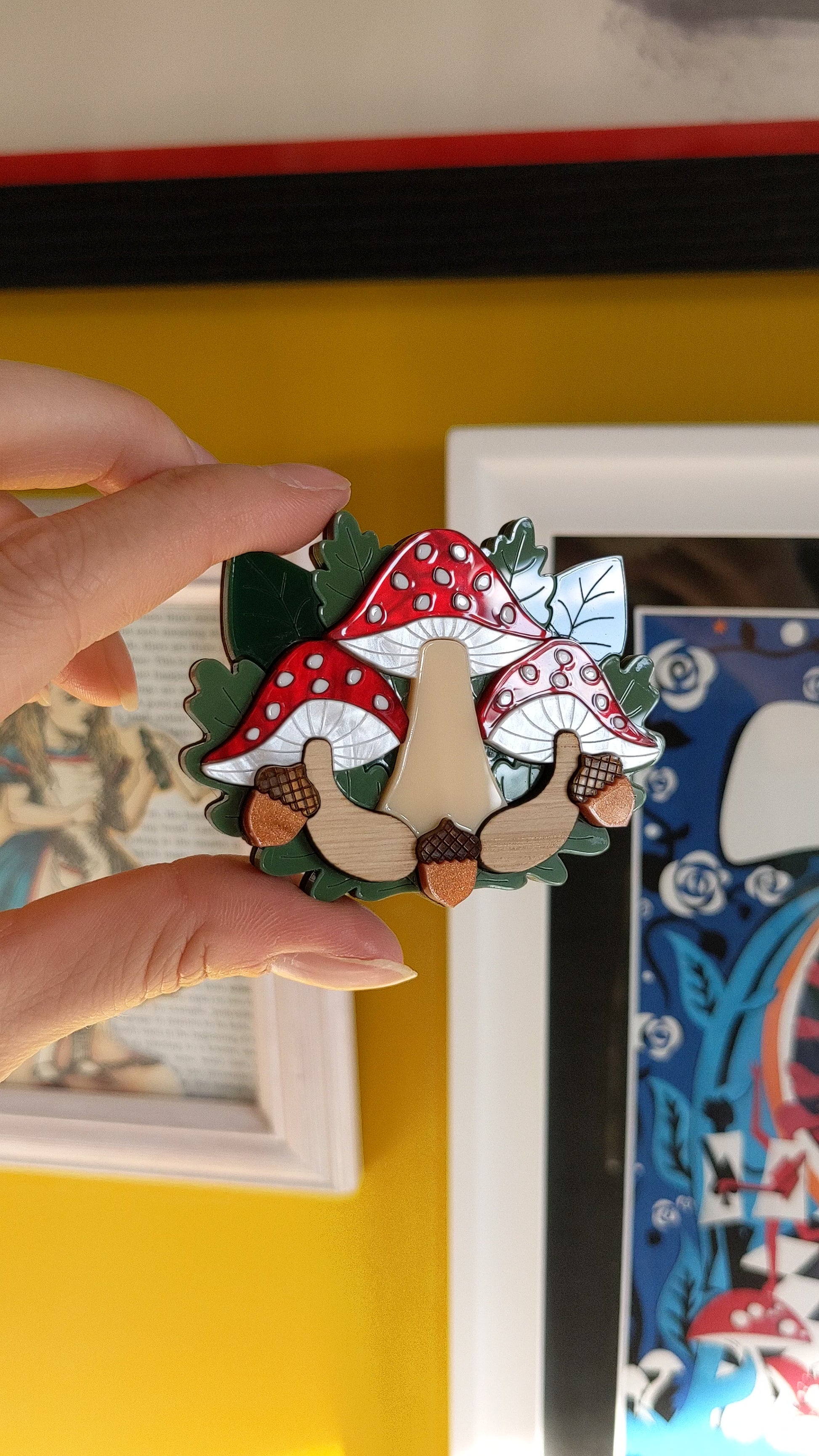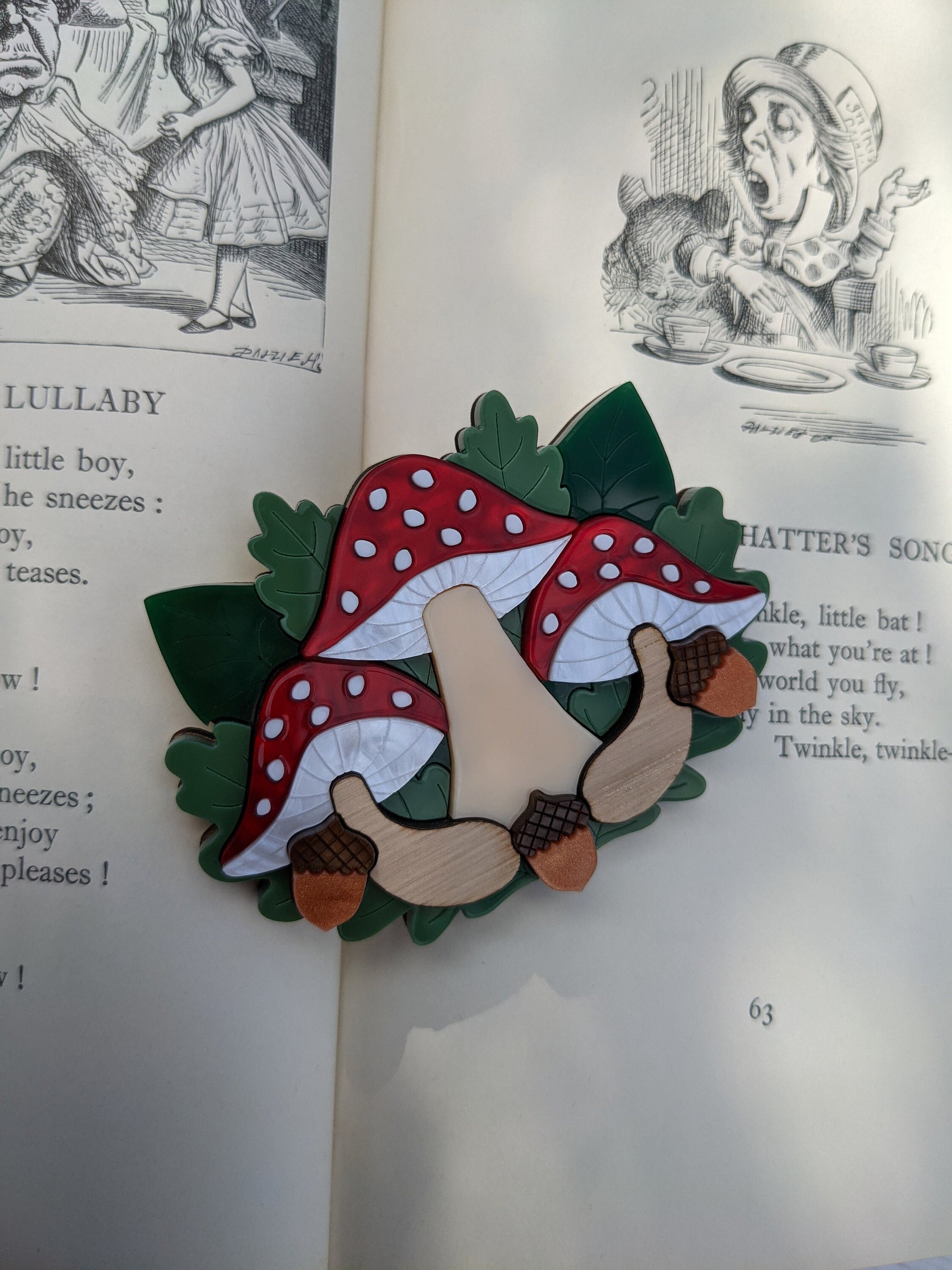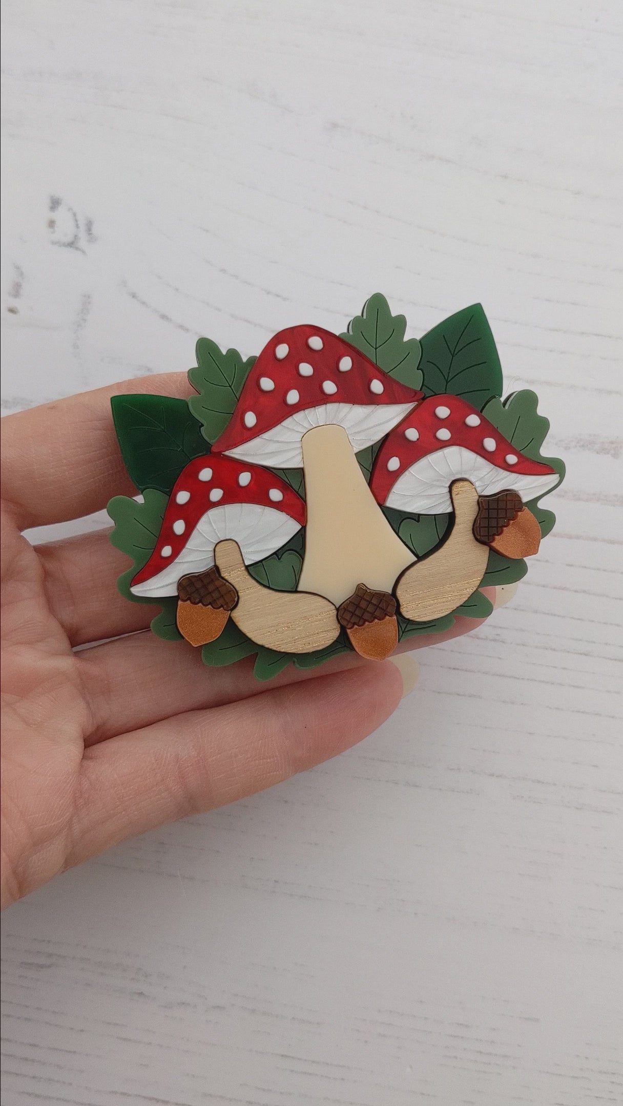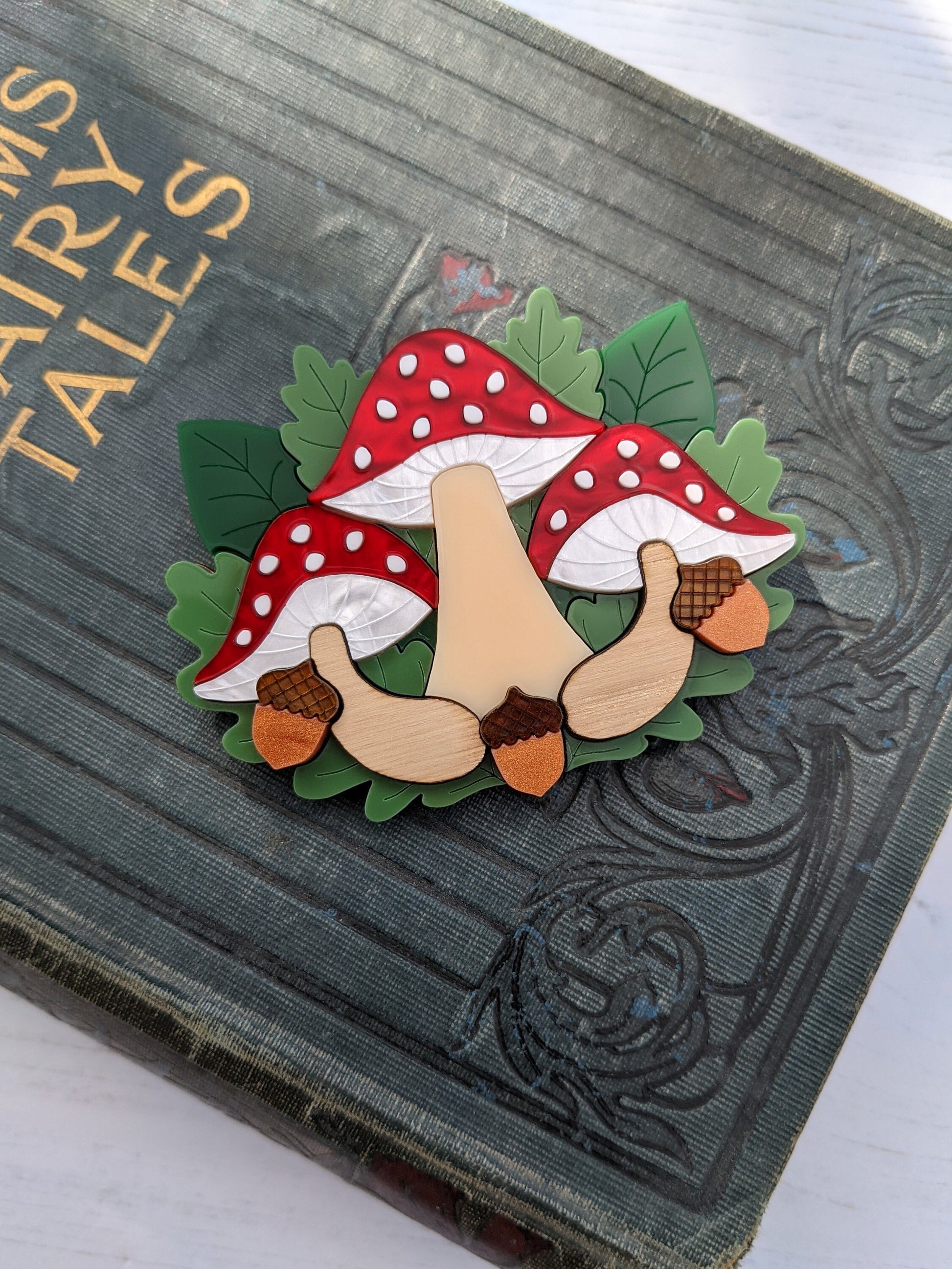 Inspired by a love of toadstools and nature, this woodland toadstool brooch is completely laser cut from acrylic sheet right down to the spots on the caps! It is a very stylised, unique piece that measures approximately h5.5cm x w7.1cm and features two shades of green Perspex, cream Perspex, marble white, red, brown and copper hand mixed acrylic as well as oak veneered plywood all assembled onto an hand sanded and varnished ash veneered plywood base (pre 2024 poplar plywood). I always attach brooch backs on brooches horizontally with a strong glue and they're mostly the 3 hole 35mm type unless the brooch is smaller. All work is solely done by Rock The Panda designer and maker Ruth Anna Moore in Sheffield, United Kingdom. Note that the grain of the wood can vary between pieces but I do check wooden pieces before assembling and I don't send any out that I wouldn't be happy to receive myself.