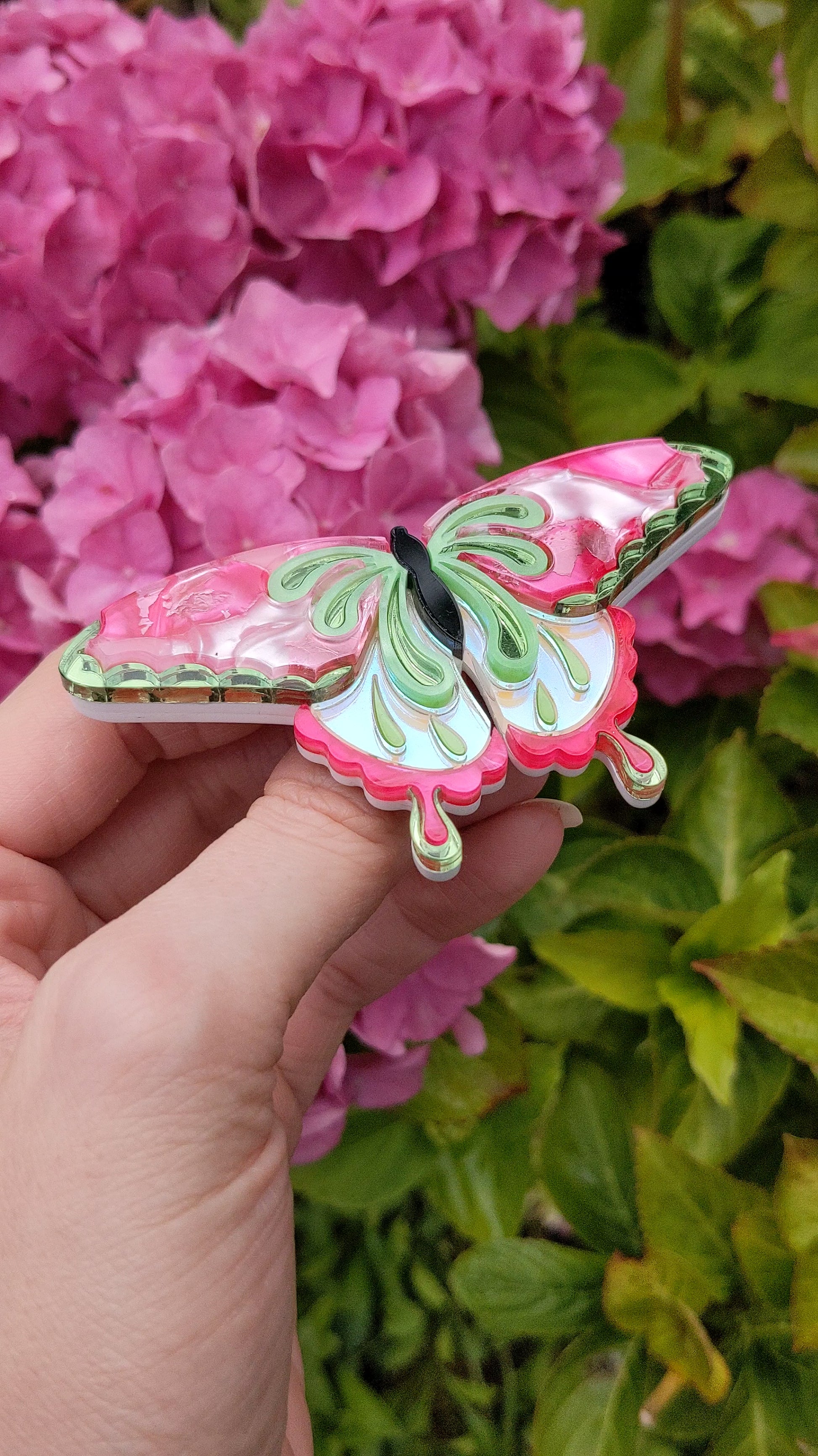 This butterfly brooch was a little bit inspired by 70s style and features a recycled acrylic made from three different pink offcuts with pink foil running through it. The rest of the design features a customised iridescent acrylic, bright pink and lime pearl marble, plain black, green mirror and metallic green acrylic all backed onto 2mm white acrylic. Pieces that use recycled acrylic may be more limited in numbers than my usual range.