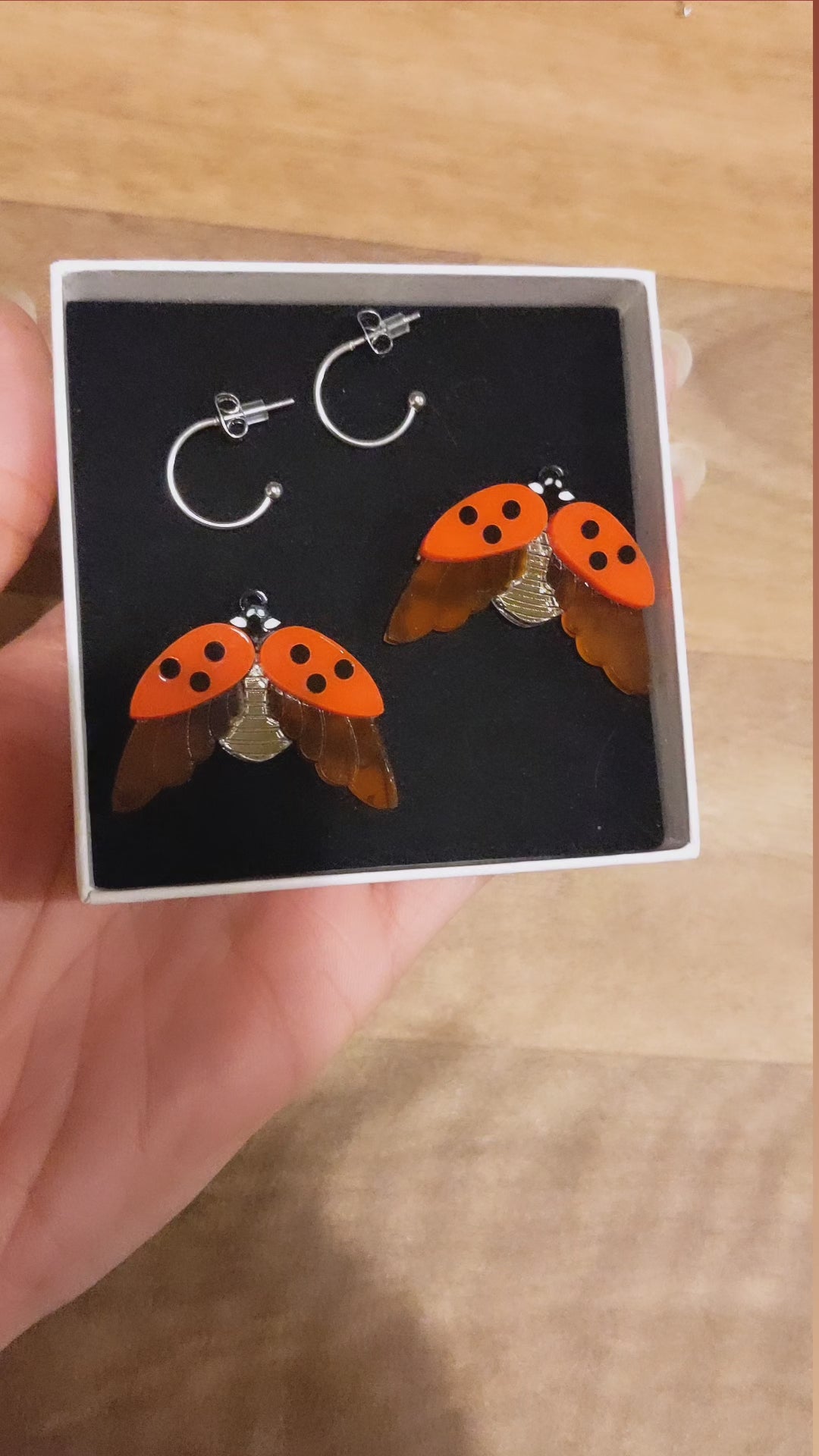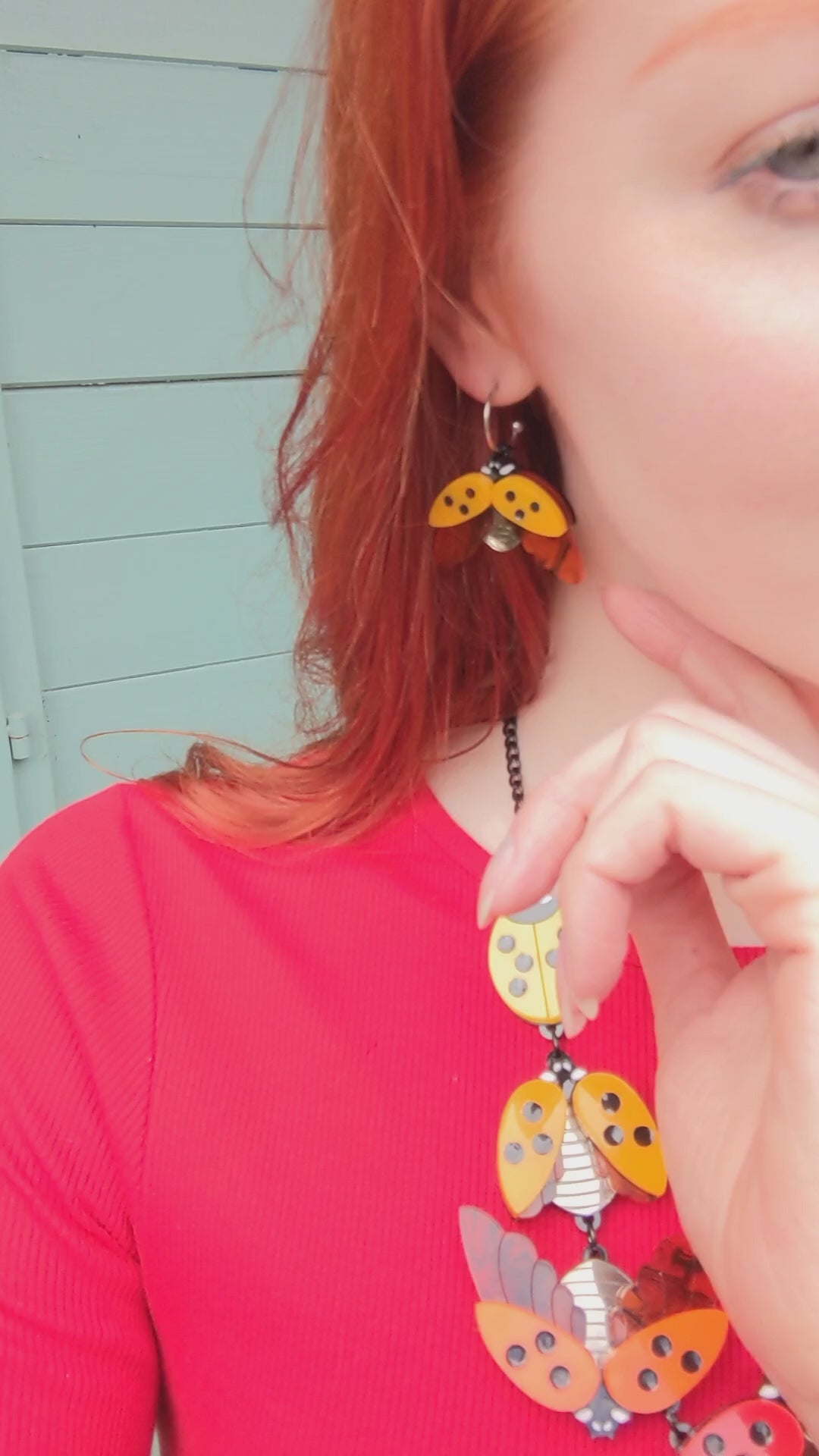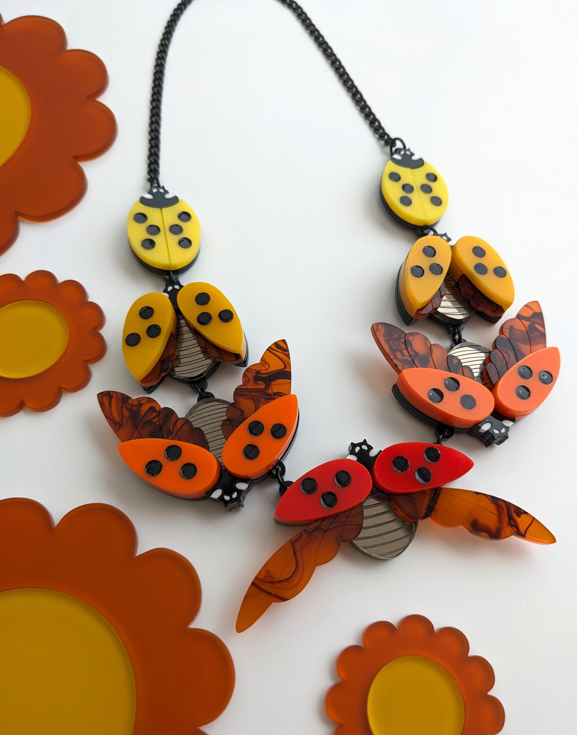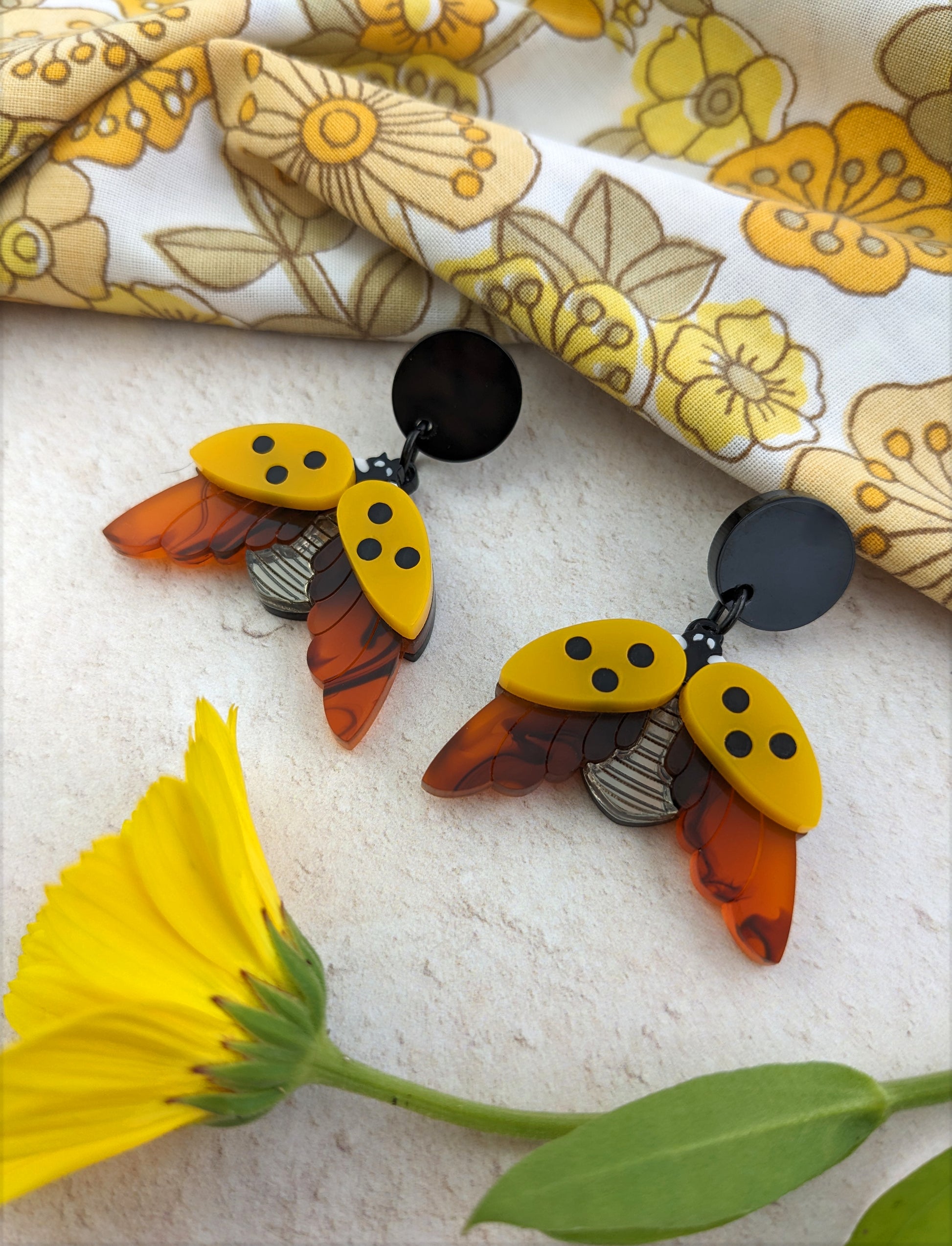 These ladybird earrings were inspired by my childhood love of ladybirds. I focused on the different wing stages when I designed the statement necklace and felt this was the best shape for the dangle earrings. Each ladybird is backed with 2mm black acrylic so they're easy to wear. The outer wings are plain yellow acrylic and have cut acrylic spots. They then have tortoiseshell acrylic for the transparent wings which I feel is a good likeness, and the bodies are a greyish bronze mirror acrylic.
