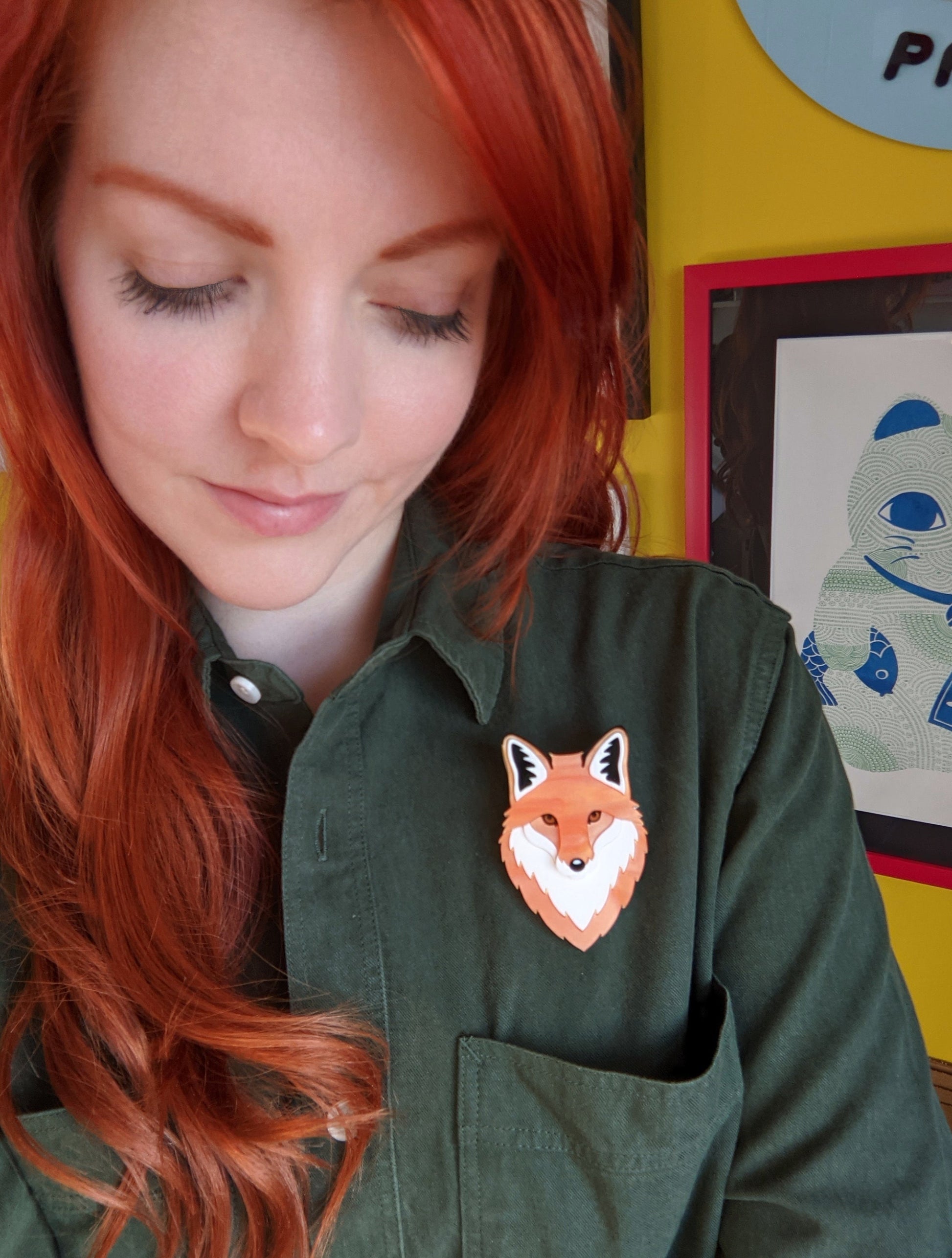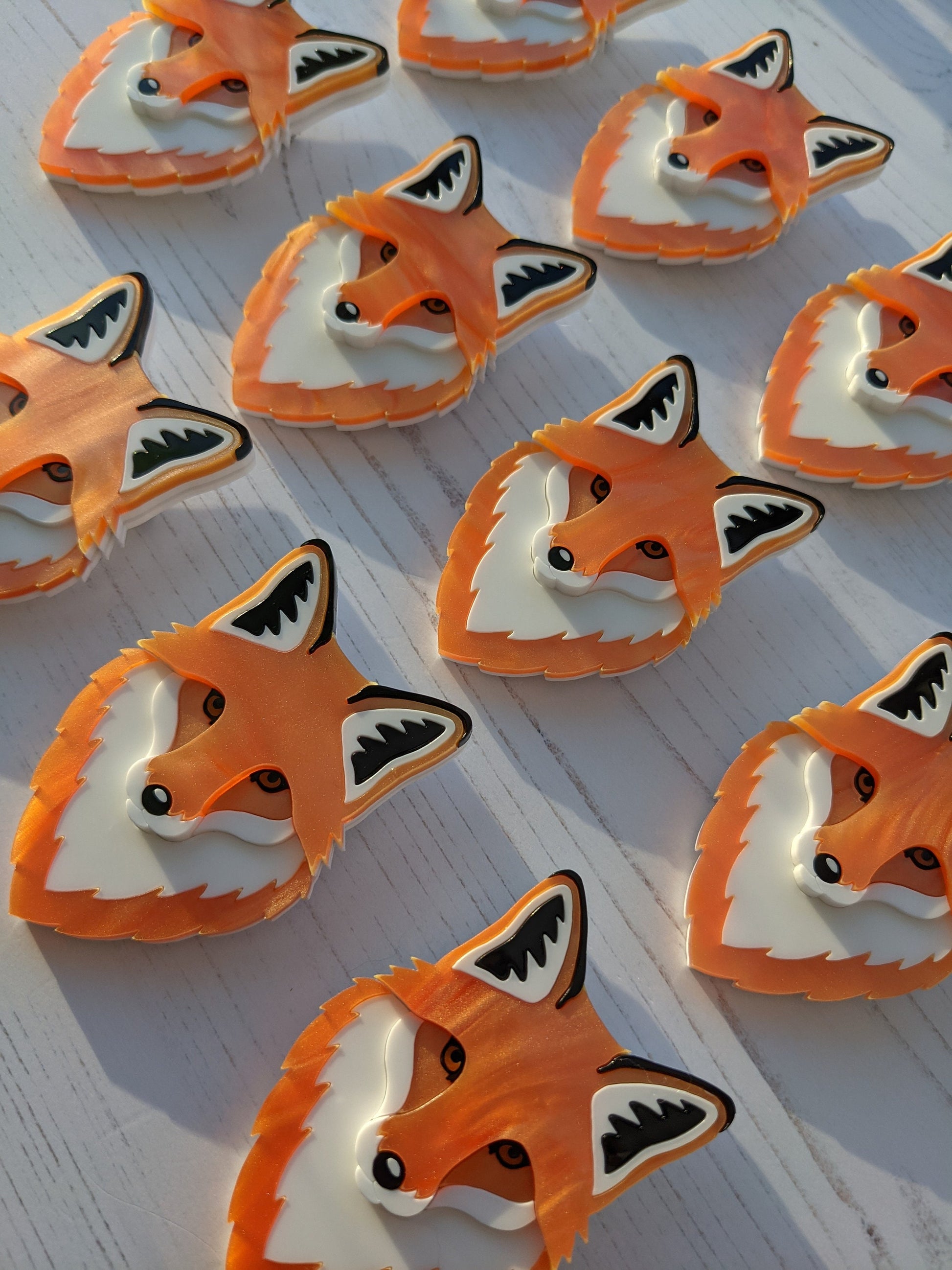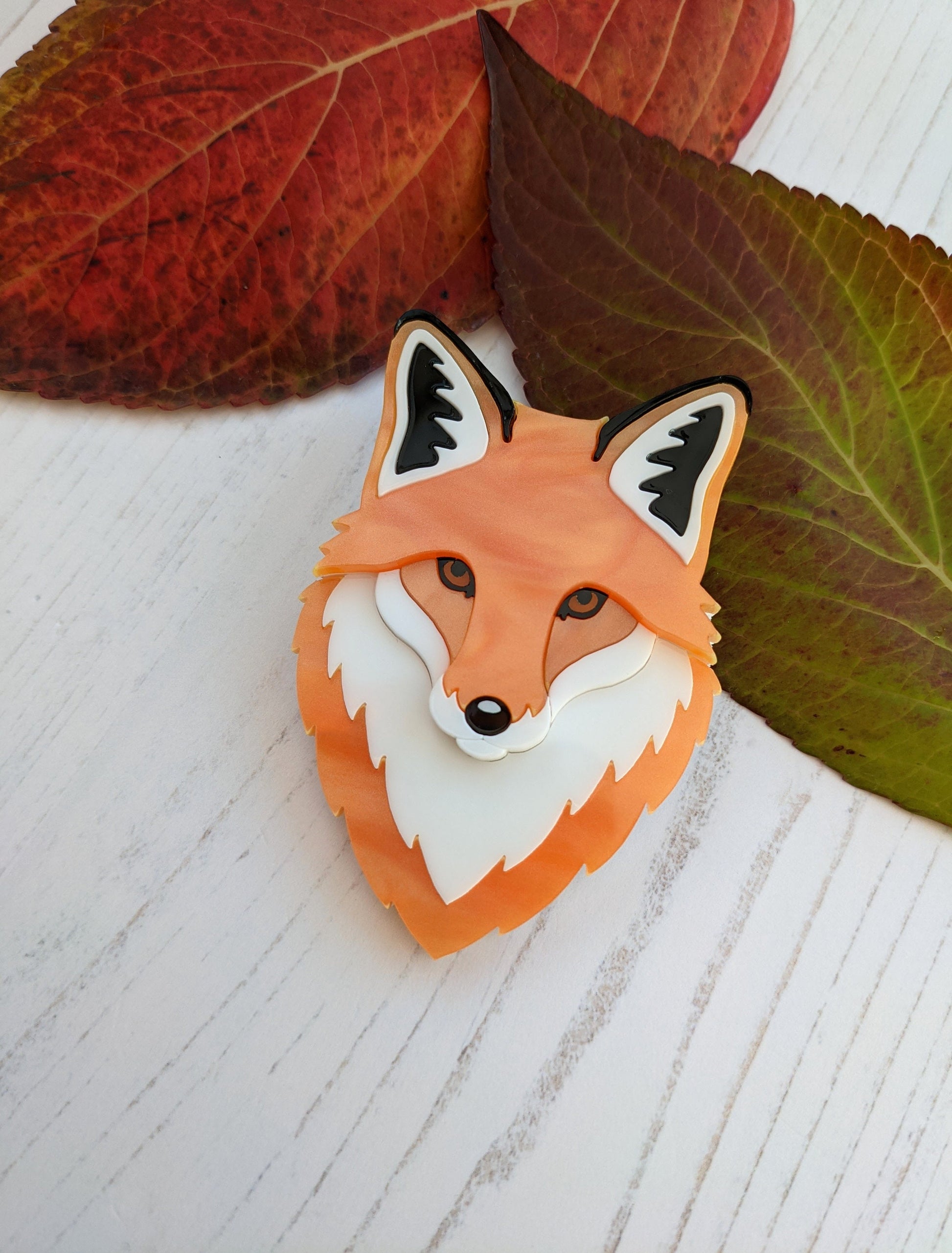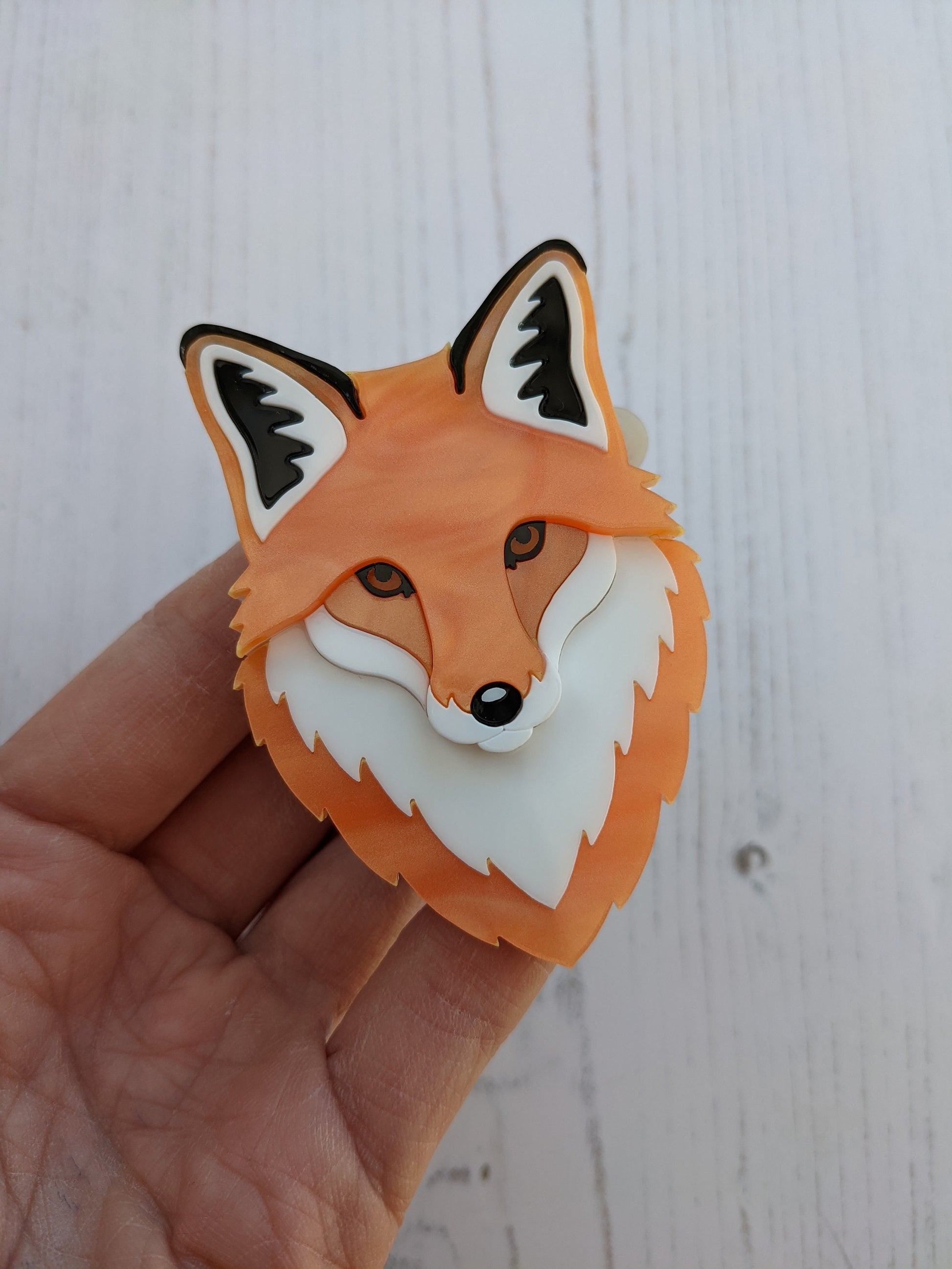 Inspired by my love of foxes, I really wanted to capture the innocence and beauty in them to contrast the sneaky villain they're sometimes portrayed as. This fox brooch is completely laser cut from acrylic and is then assembled by hand. It's a nice wearable piece that measures approximately h7.5cm x w5cm and features marbled pearl orange acrylic (which varies slightly from piece to piece) white, black and orange Perspex. I always attach brooch backs on brooches horizontally with a strong glue and they're mostly the 3 hole 35mm type unless the brooch is smaller.