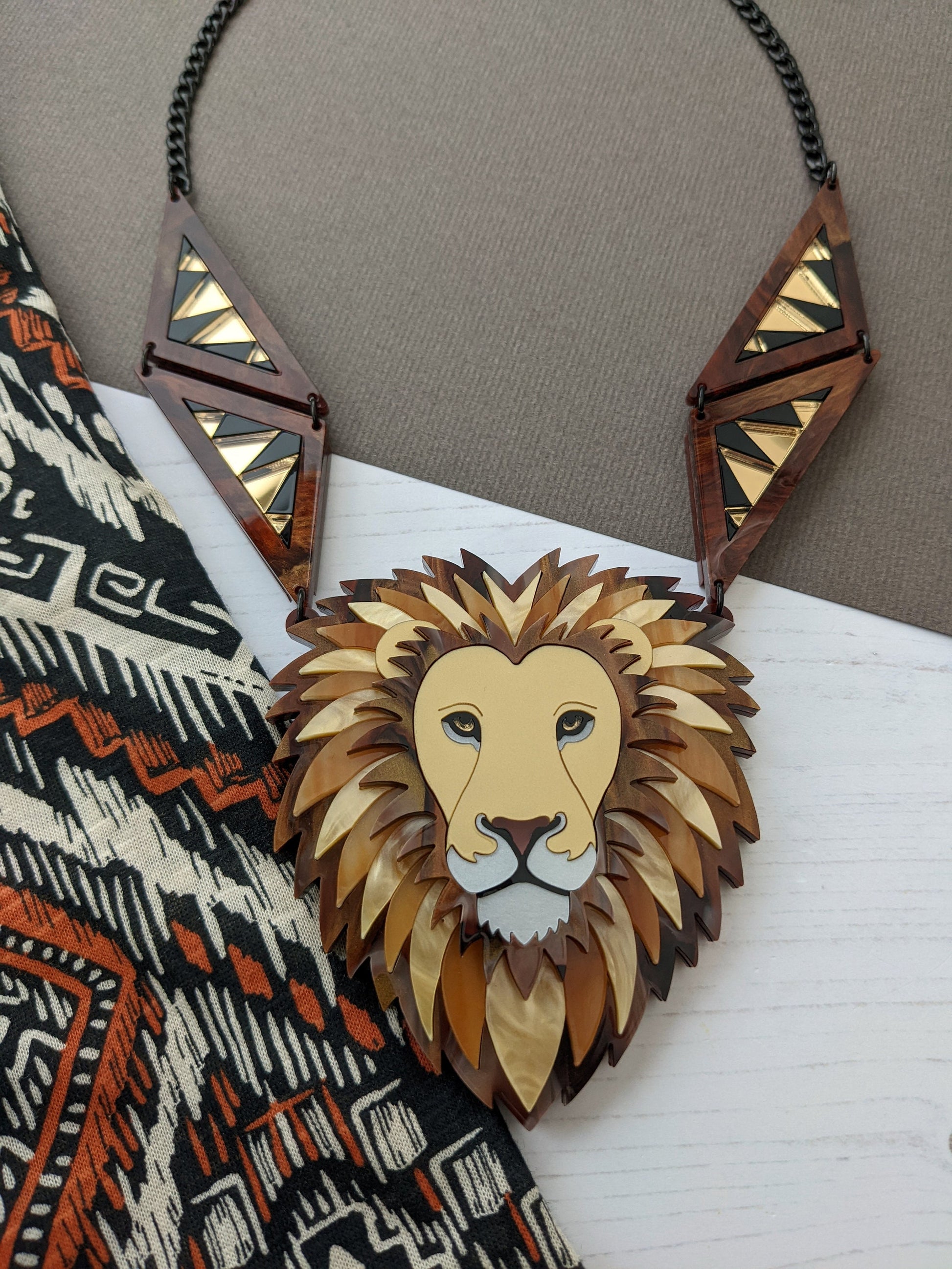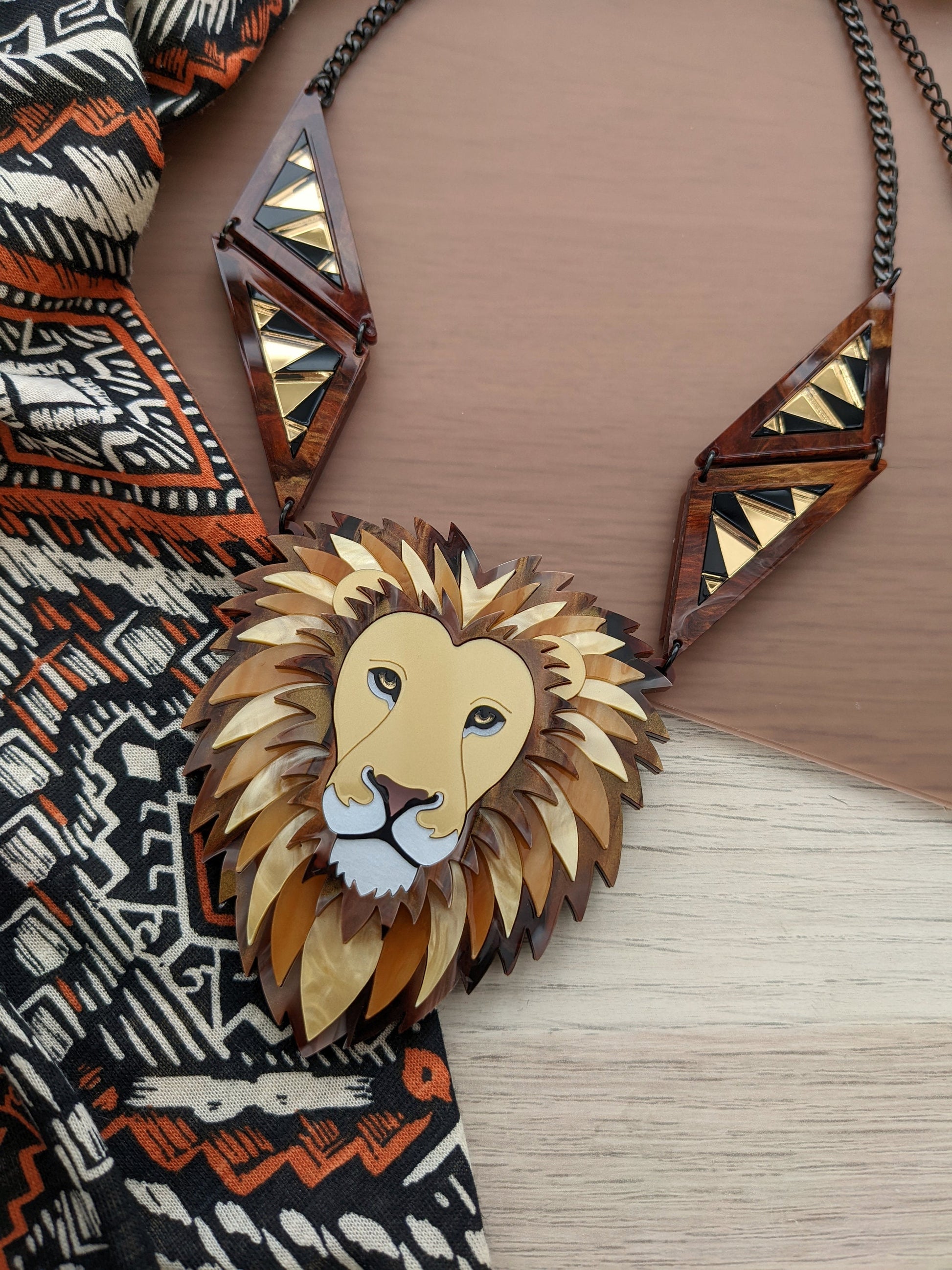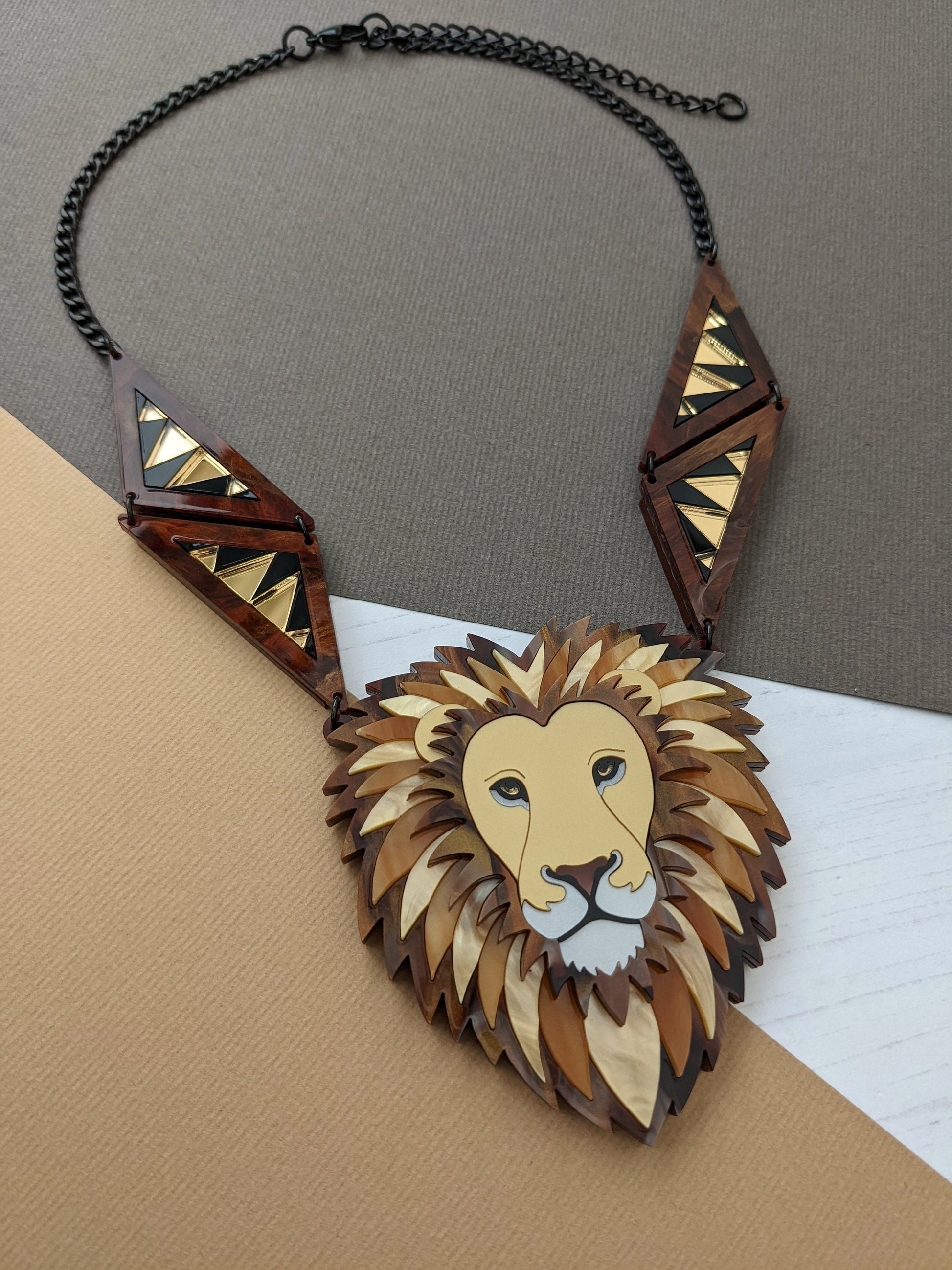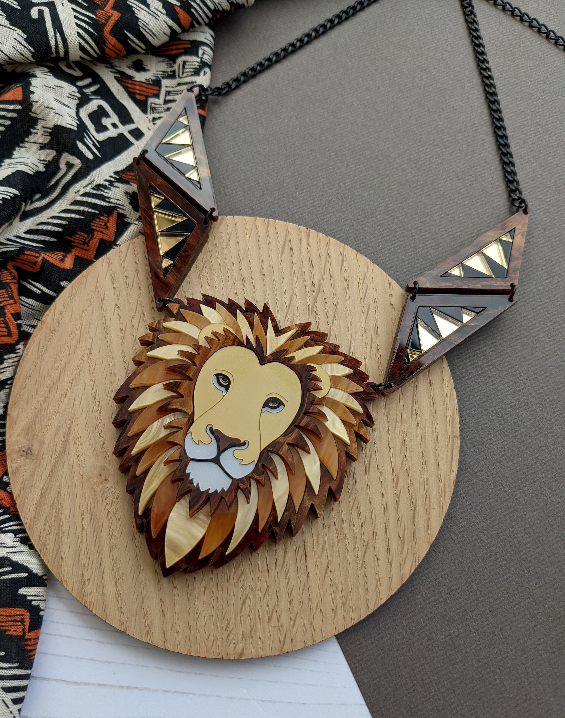 This lion design has been in the pipeline since I first started Rock The Panda in 2018 and in that year I also sourced the lighter golden marble pearl acrylic from a supplier in the US. Lions are an animal that is close to my heart and I've depicted them in acrylic paintings a couple of times. These paintings have provided inspiration over the past few years. The lion face is made from gold metallic acrylic, pearlescent Perspex with black details and golden mirror eyes, whilst the mane is made from a caramel coloured acrylic, light golden pearl marble acrylic framed with a beautiful rich brown/gold/milky brown mixed acrylic that has a lot of variation from sheet to sheet, all backed onto 3mm rust brown acrylic which tones in perfectly. The necklaces will be chosen at random for orders. Take a look at the group shot of the lion heads to get an idea of variation. The triangular sections running through the chain are loosely inspired by African patterns as I felt the lion had a real African vibe about it and I wanted to bring it out further. The brown acrylic framing is made from the underneath of the darker acrylic in the lion so it tones in well. It is however limited as I believe the way the sheets are made has changed slightly so this piece will be limited to around 20. The black and gold triangular sections are all cut and placed in the centre of the triangles.