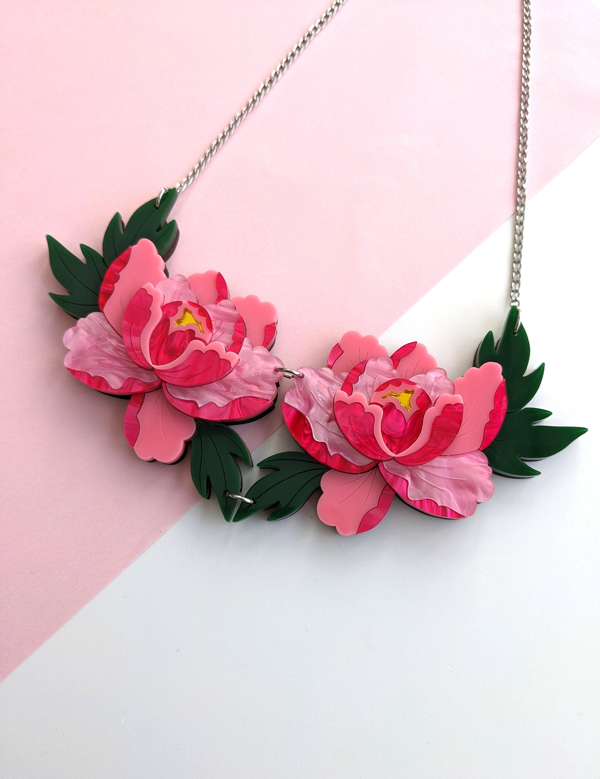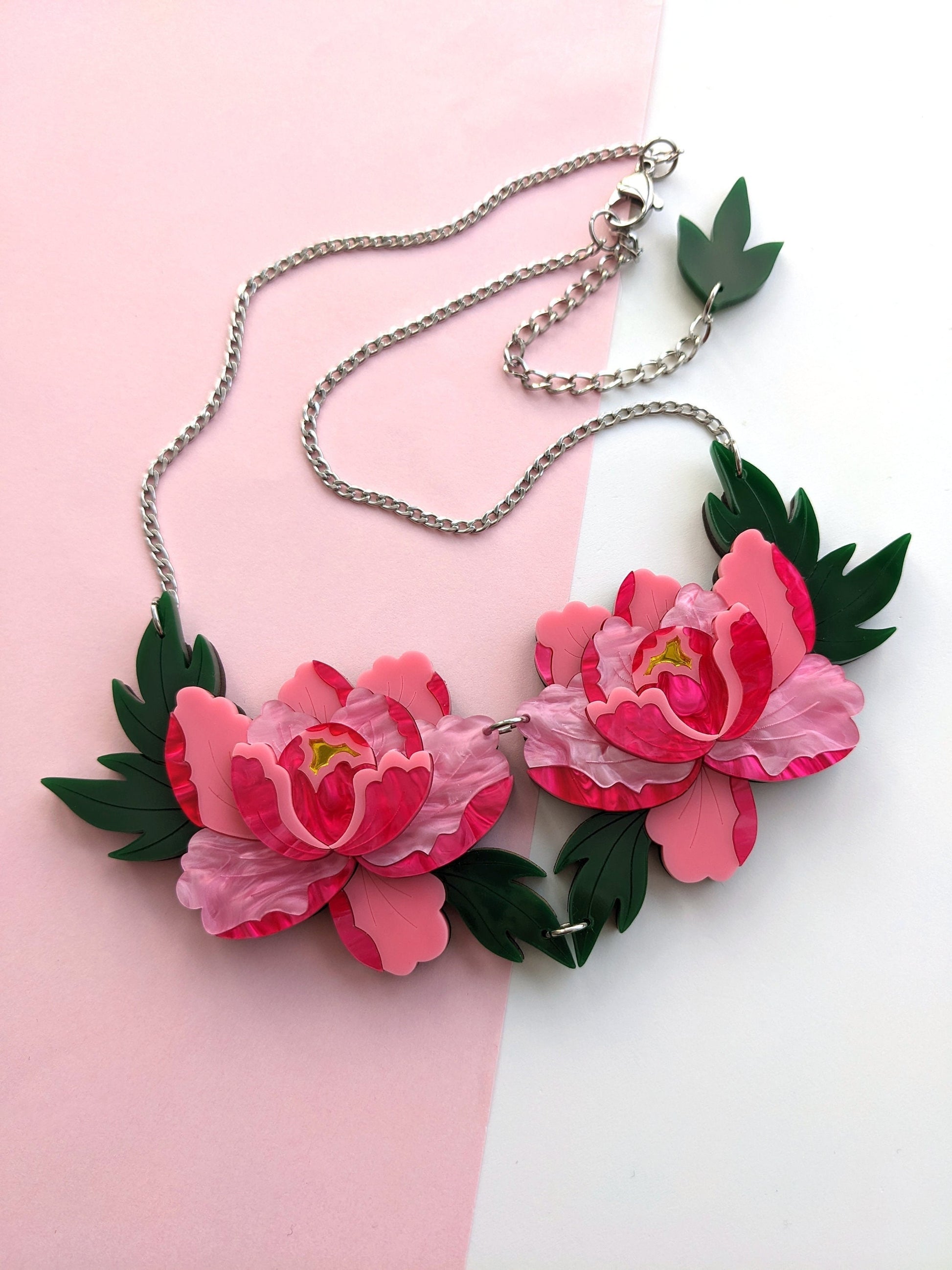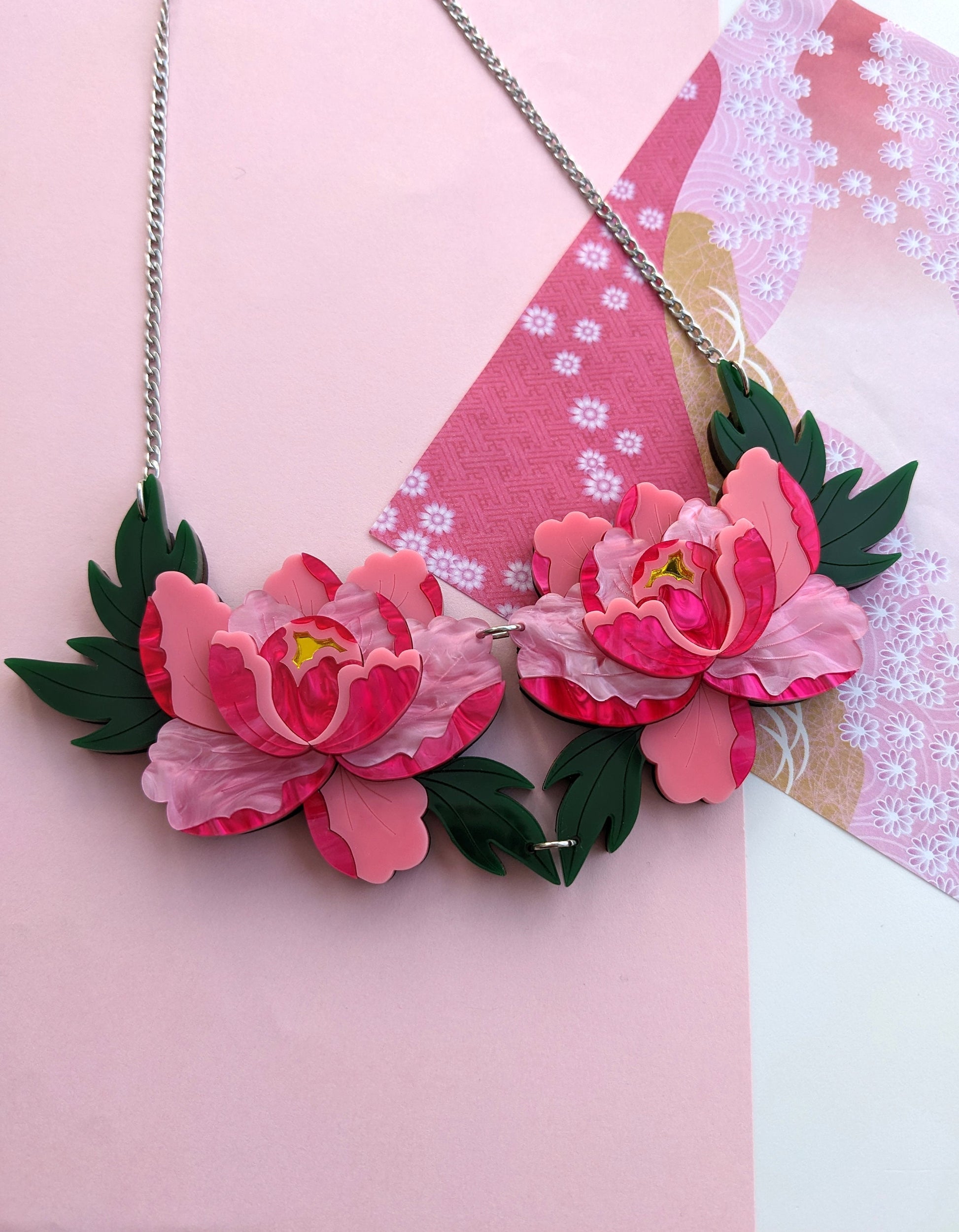 This statement double peony necklace features two stylised vibrant pink peonies and is loosely inspired by Japanese style.
