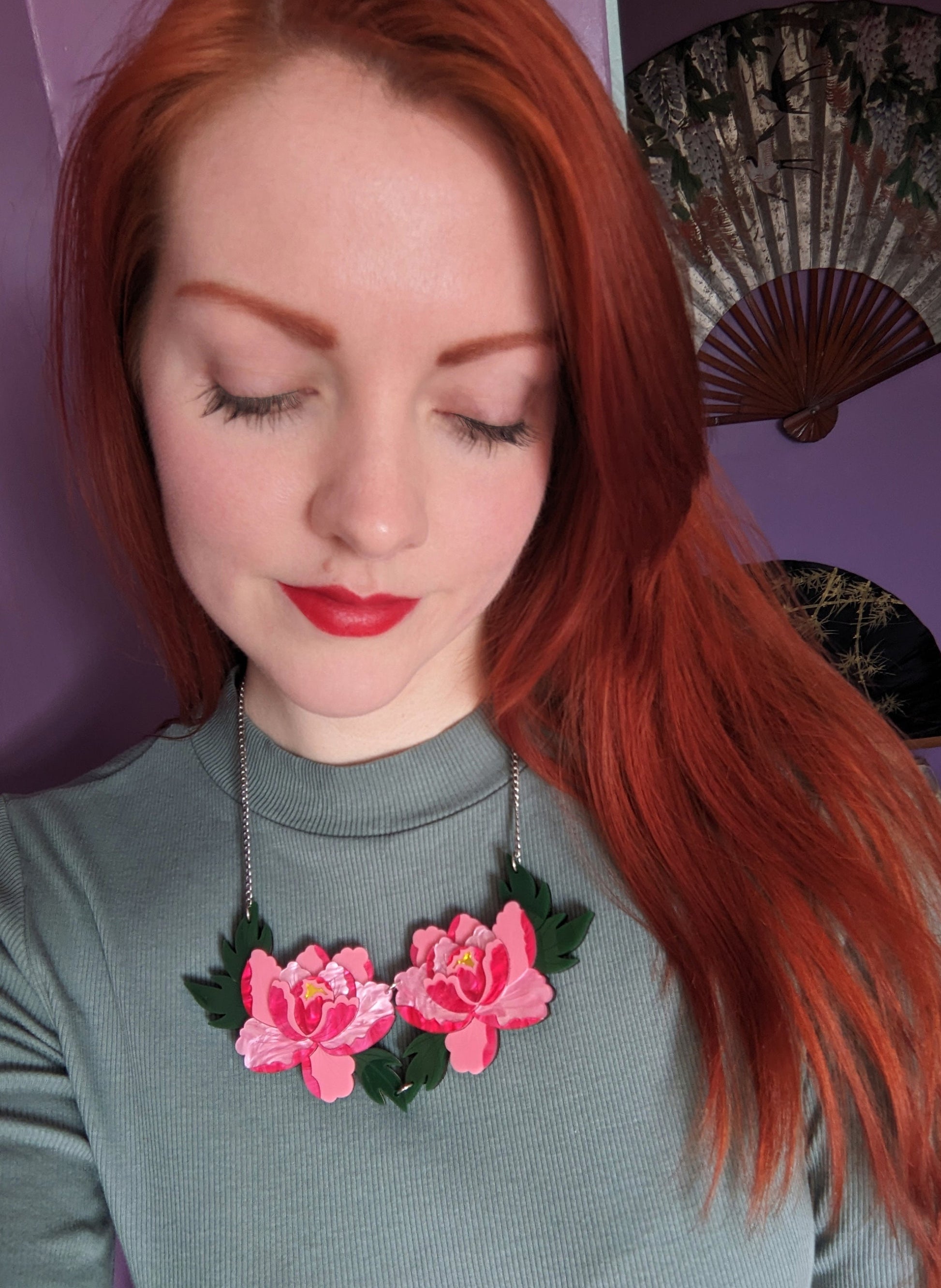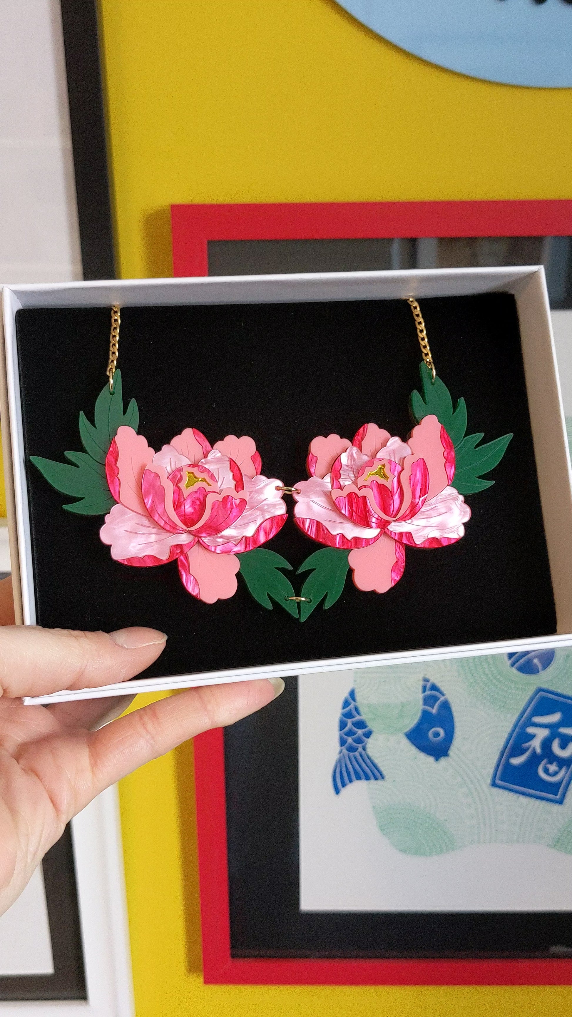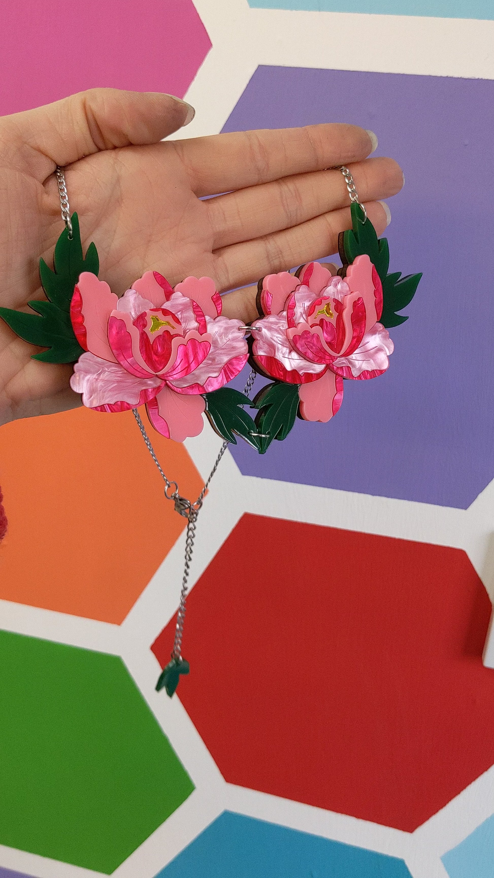 This statement double peony necklace features two stylised vibrant pink peonies and is loosely inspired by Japanese style.