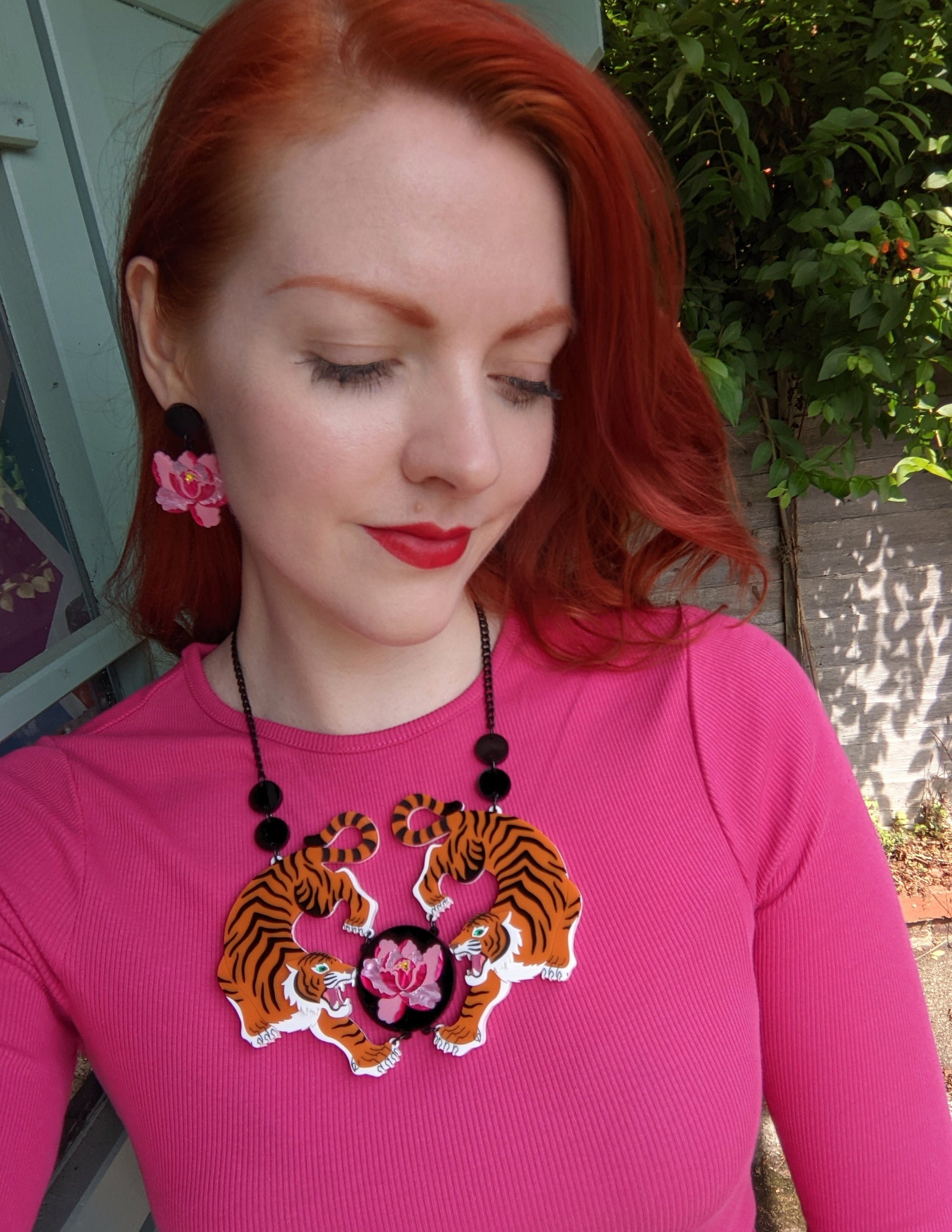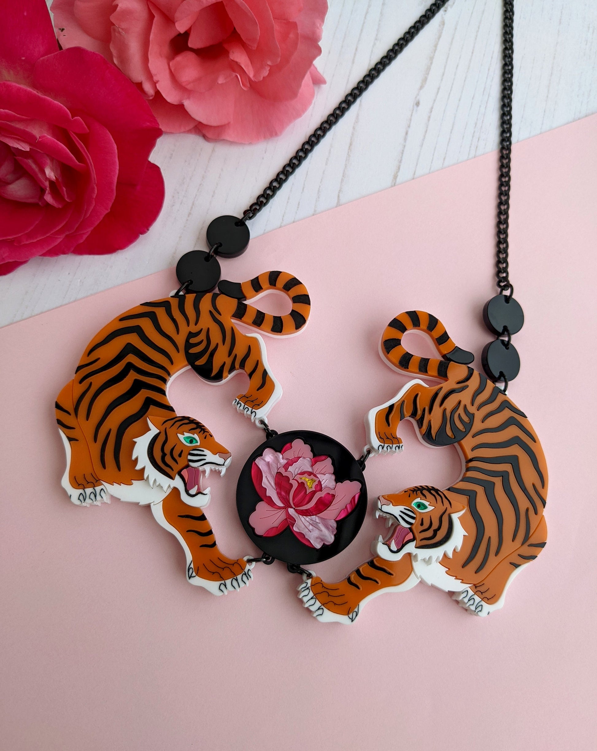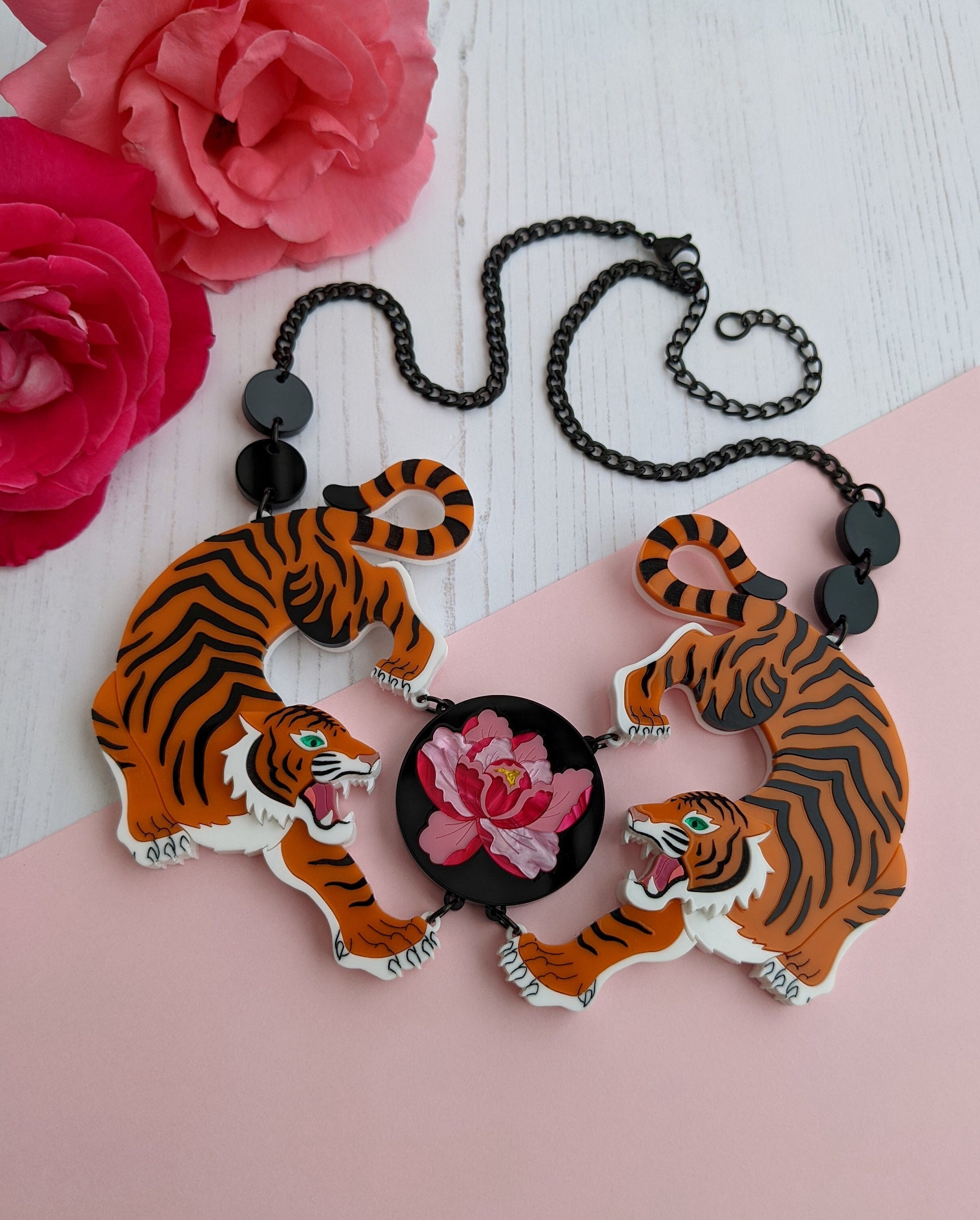 This statement double tiger necklace is a striking piece that is loosely Japanese inspired. The tigers are made entirely from laser cut acrylic except the tail sections, details on the faces and the line details are all hand inked. The eyes are a beautiful green mirror acrylic that really 'pops' against the orange. The section in the middle is inspired by inlayed black lacquered boxes and features a detailed peony flower made from 3 different types of pink acrylic and with a yellow mirror centre.
