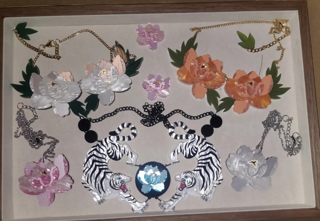 The tigers are made entirely from laser cut white pearl marble acrylic with plain Perspex accents except the tail sections, details on the faces and the line details are all hand inked. The eyes are a blue mirror acrylic which compliments teal blue peony in the centre. The peony is made from 3 different types of teal acrylic (marble pearl, metallic and plain Perspex) with a yellow mirror centre. Although you may request a pink peony like in the original orange version if you'd prefer.