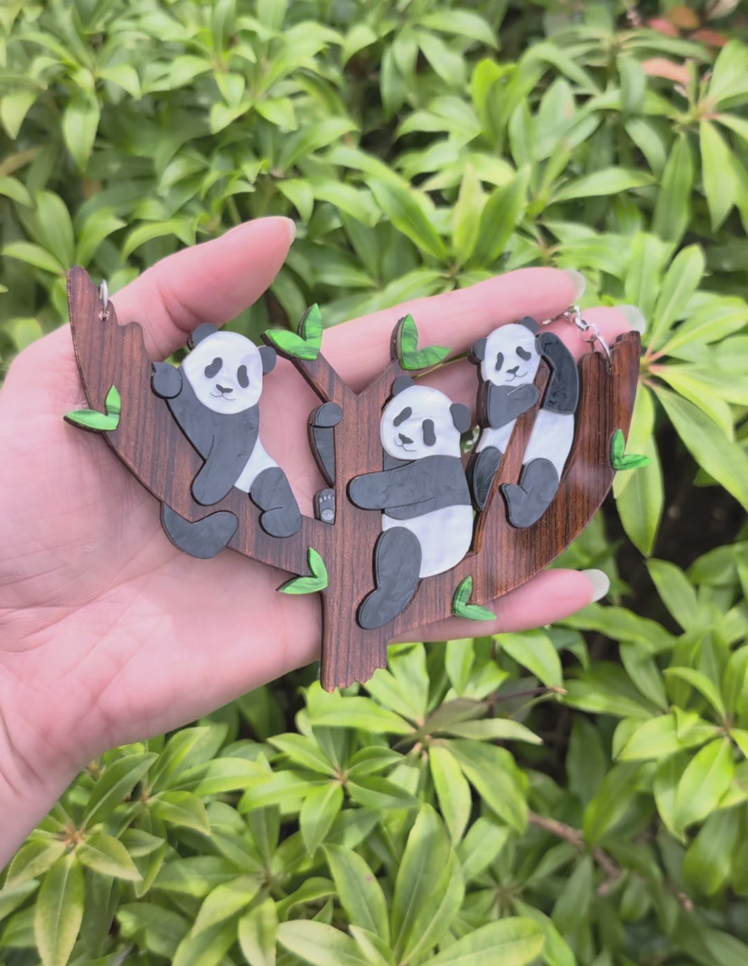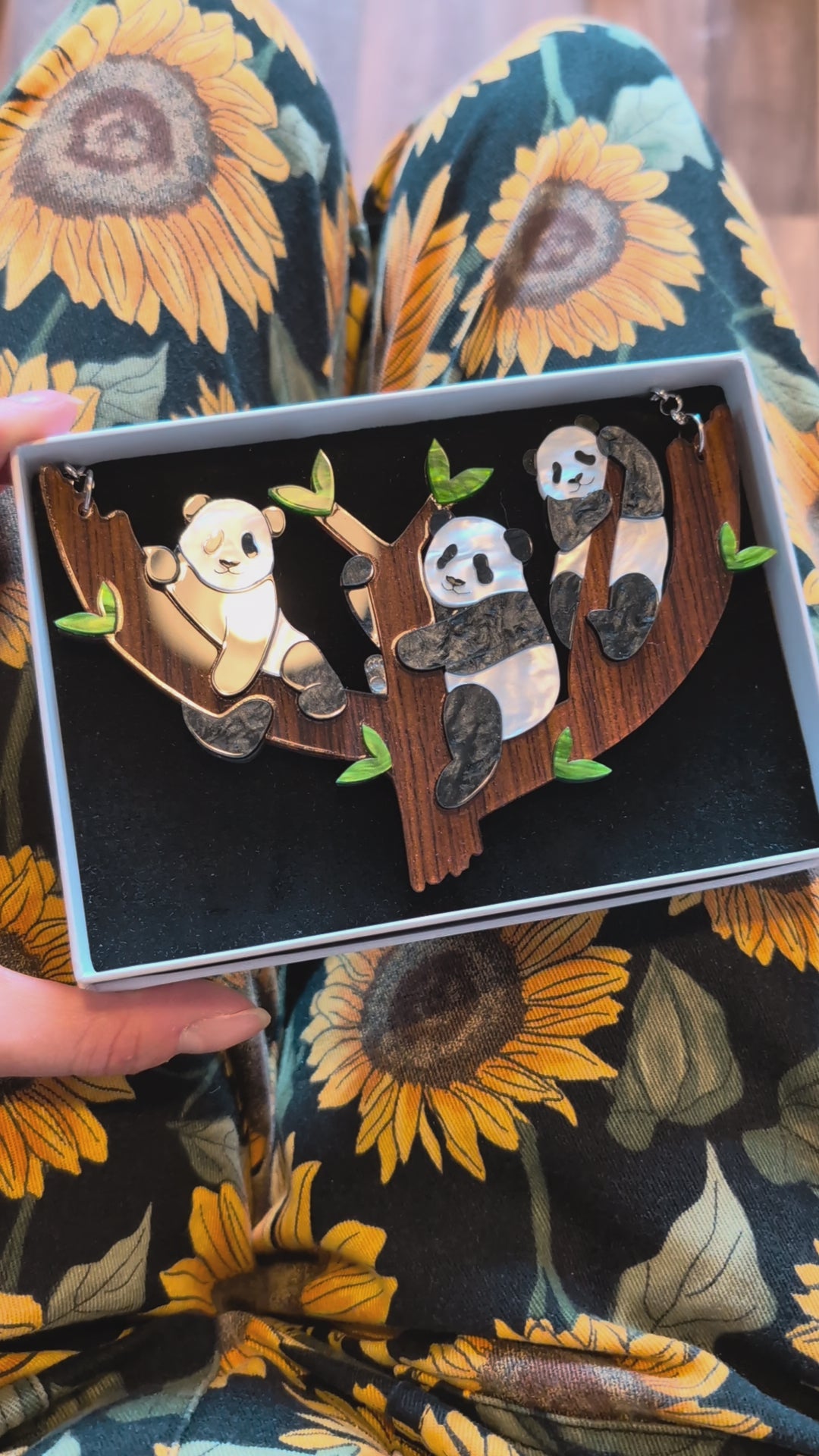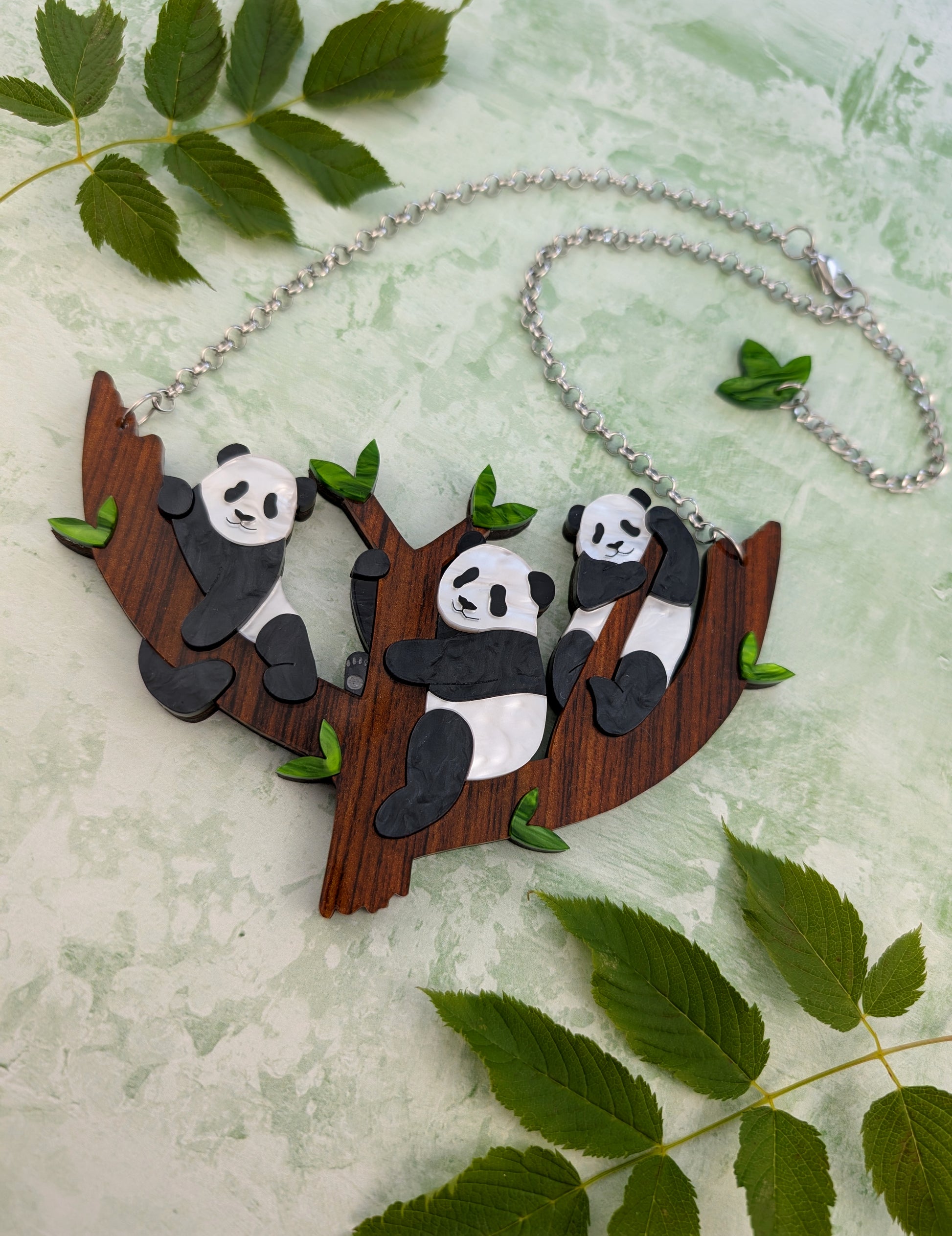 This adorable panda necklace features 3 pandas made from white and charcoal black pearl marble acrylic and they are sat on a lovely wood effect acrylic tree. It is quite a chunky piece but because of the back plate being American walnut veneered MDF it is fairly lightweight. The design measures approximately w14.1cm x 9.3cm. I've chosen a good quality stainless steel belcher chain which measures roughly 36cm but there is also a 10cm extender chain. Chains can also be lengthened if requested via the order notes how much by.