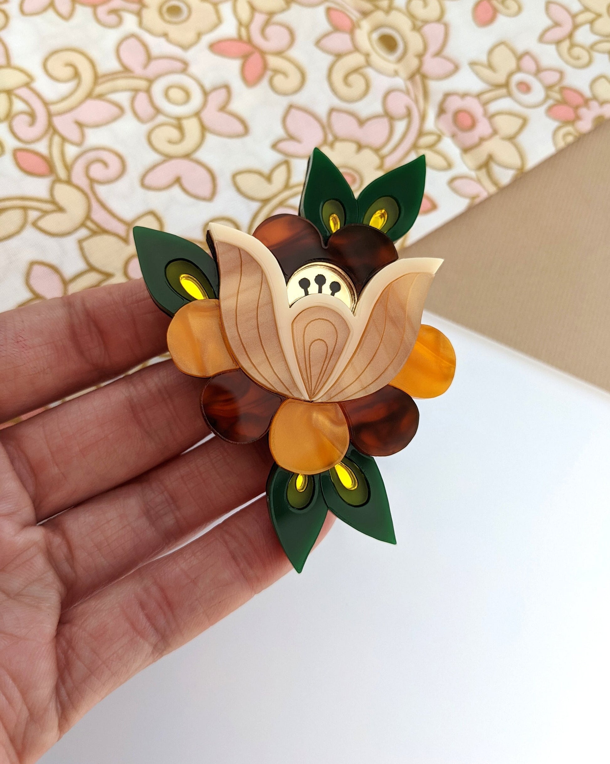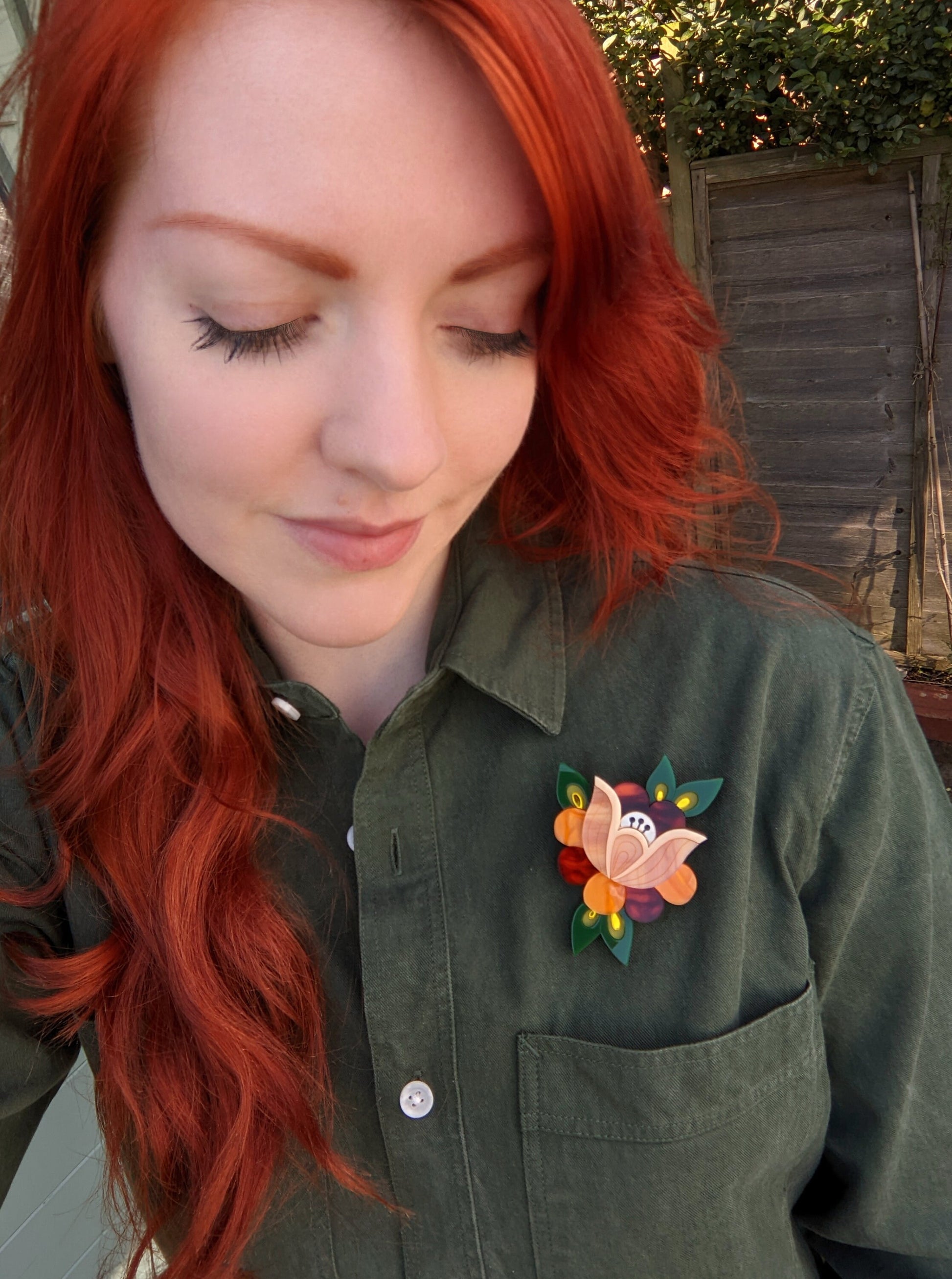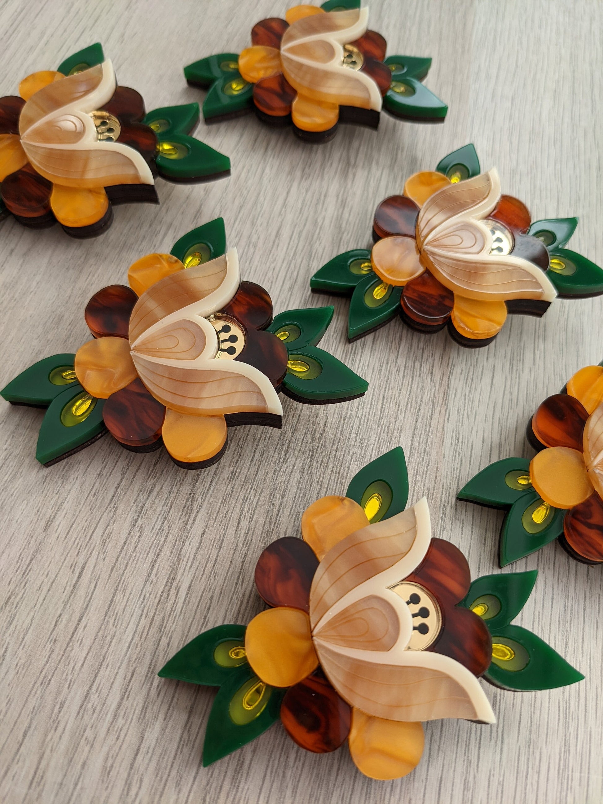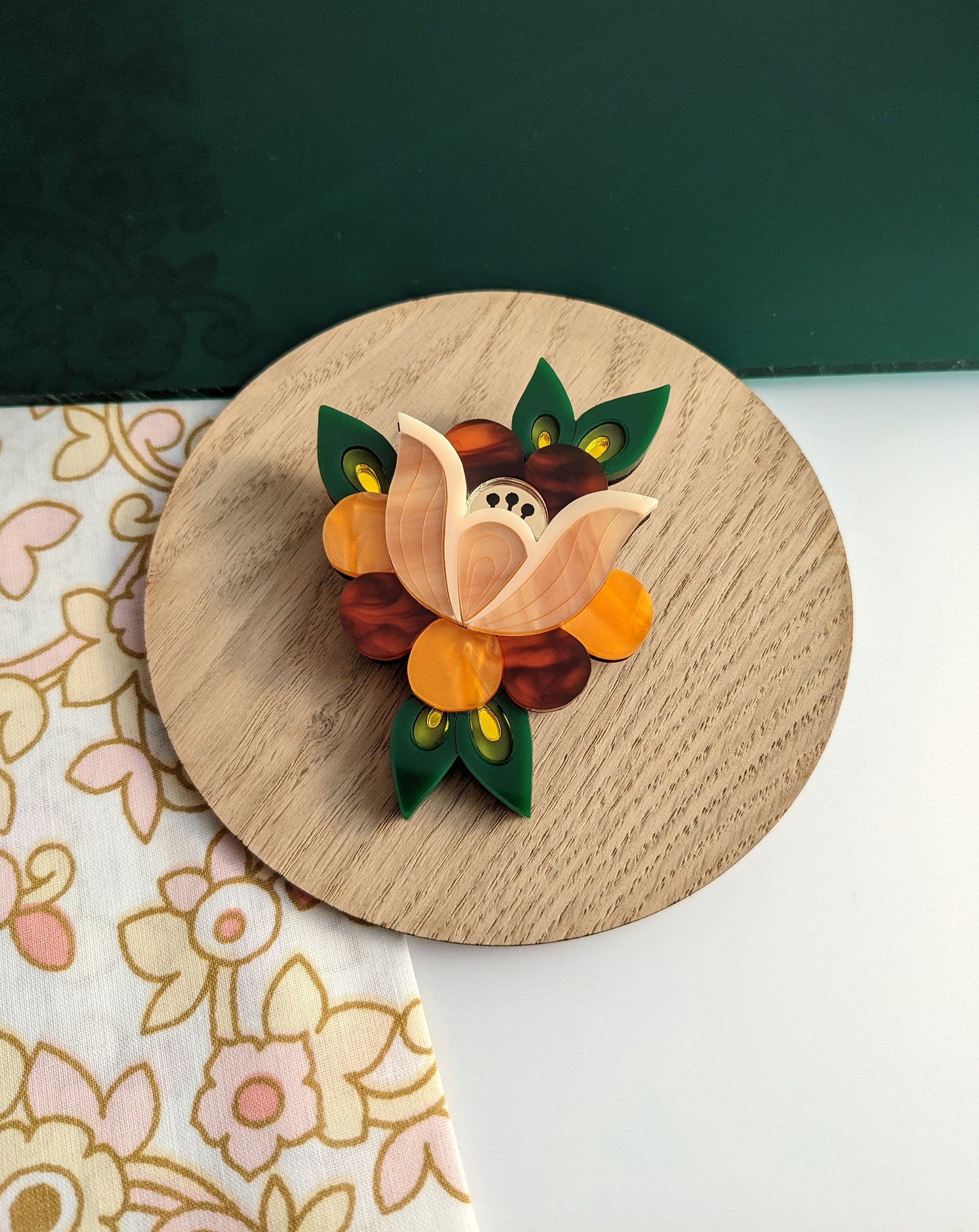 Inspired by a mixture of folk art and the 70s decade, this Folk Floral Brooch is a very versatile, wearable piece. It measures approximately h7.1cm x w5.8cm at the angle it is intended to be worn (see photo) and features a mixture of hand mixed pearl marble, faux tortoiseshell, plain Perspex and mirror acrylic all hand assembled onto varnished ash veneered plywood backing (previously poplar plywood). I always attach brooch backs on brooches horizontally with a strong glue and they're mostly the 3 hole 35mm type unless the brooch is smaller. All work is solely done by Rock The Panda designer and maker Ruth Anna Moore in Sheffield, United Kingdom. Note that there is a little variation in the acrylic (see photo of a batch of 6).