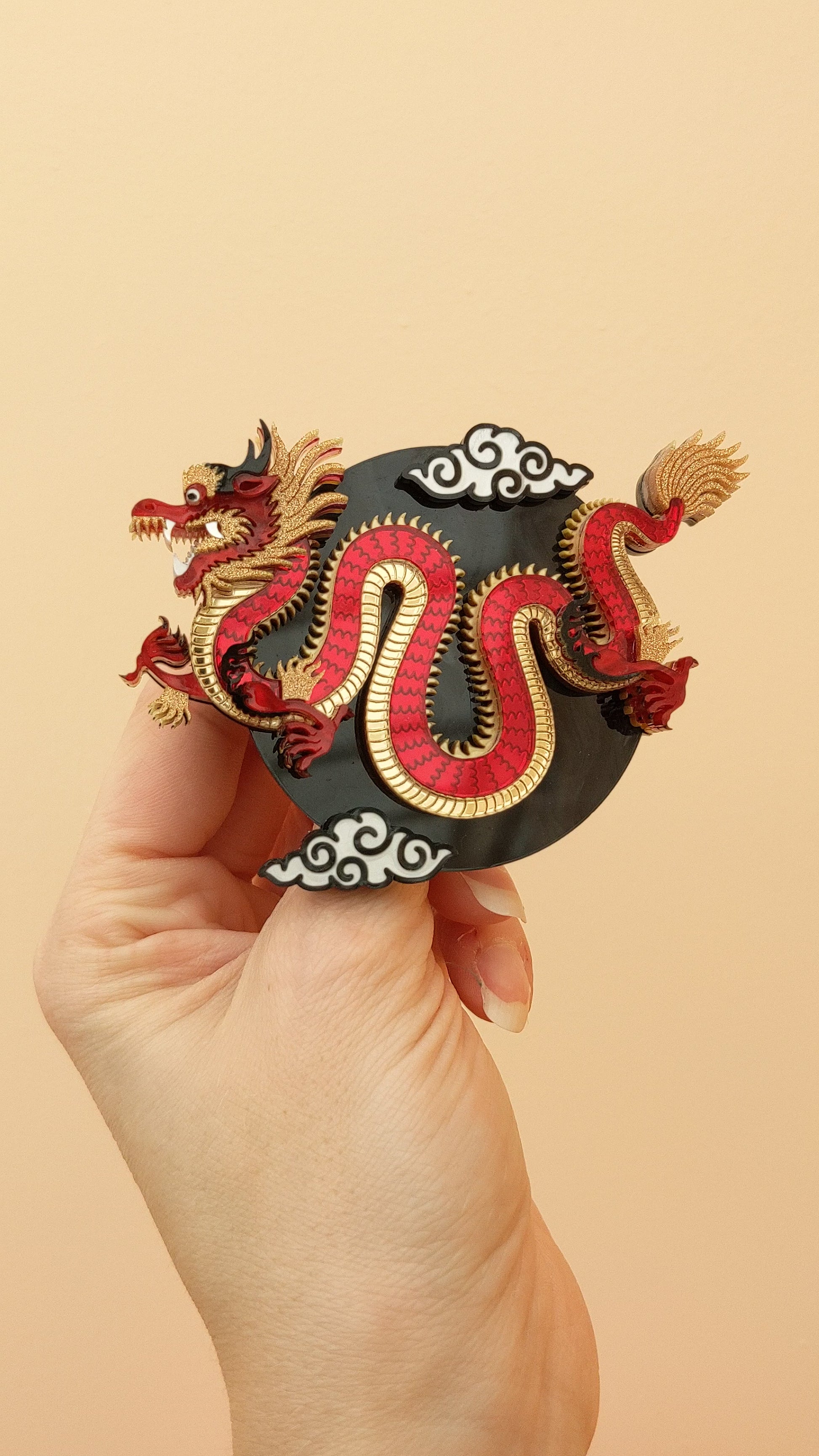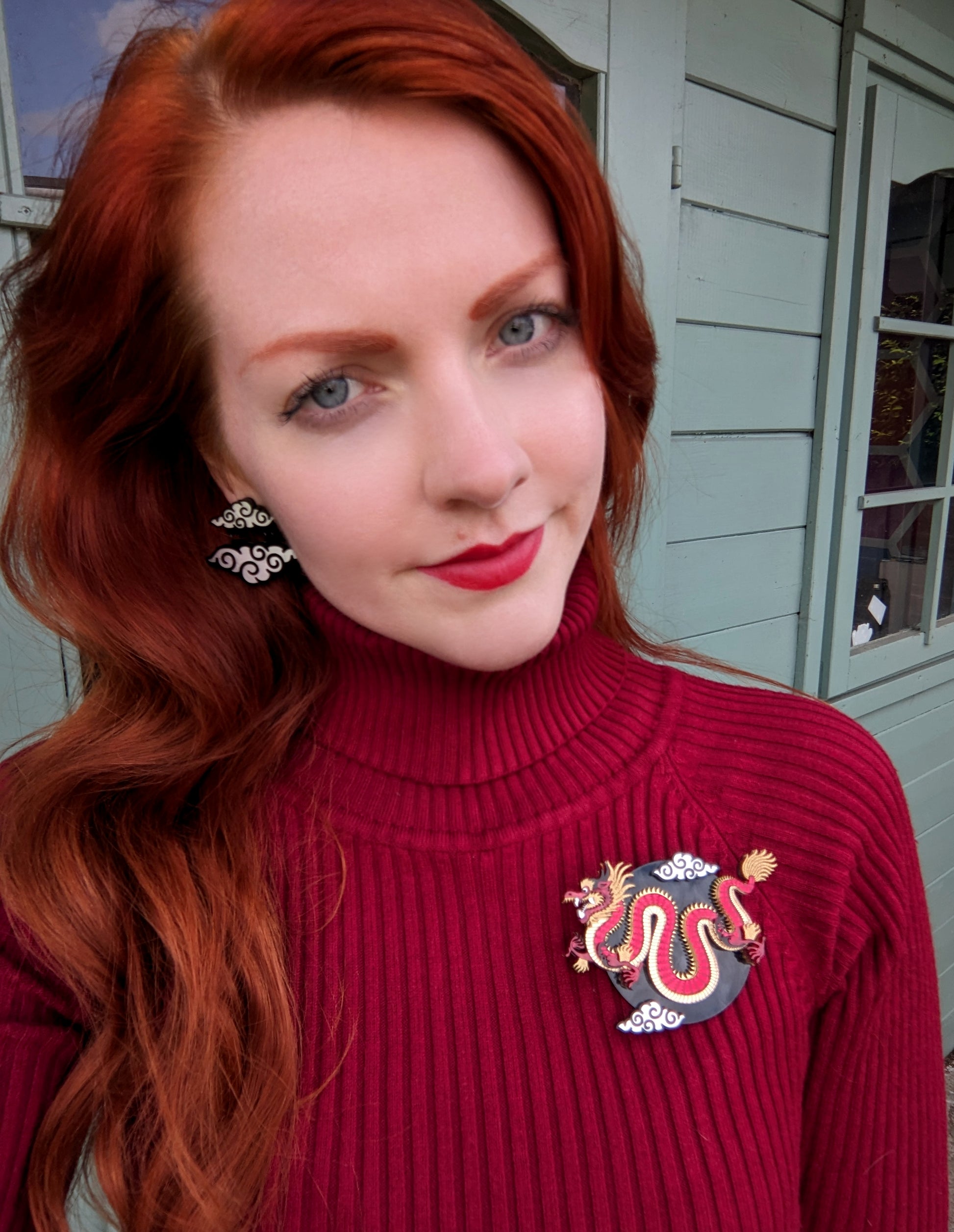 I've always admired Chinese dragons and Lunar year of the dragon was the perfect time to design one! Chinese dragons don't tend to breathe fire, they breathe clouds instead so you'll often see them surrounded by clouds and flying around in the air. The colour red is very prominent in Chinese culture as well as gold tones so this brooch/necklace is a really traditional looking piece. It's quite a large brooch but I feel it is easy to wear and isn't very heavy but it will certainly be noticed when worn!