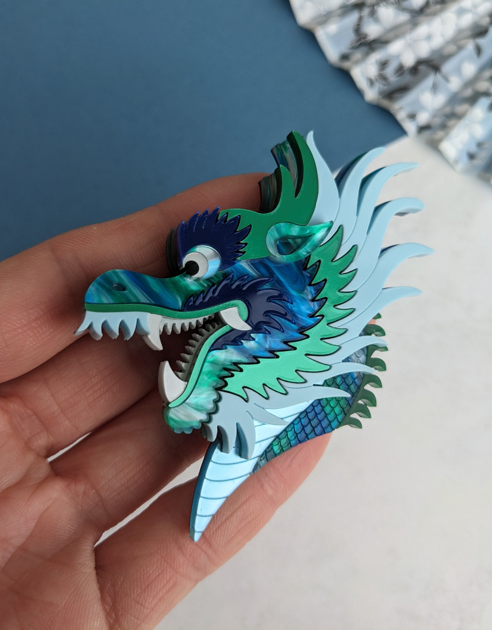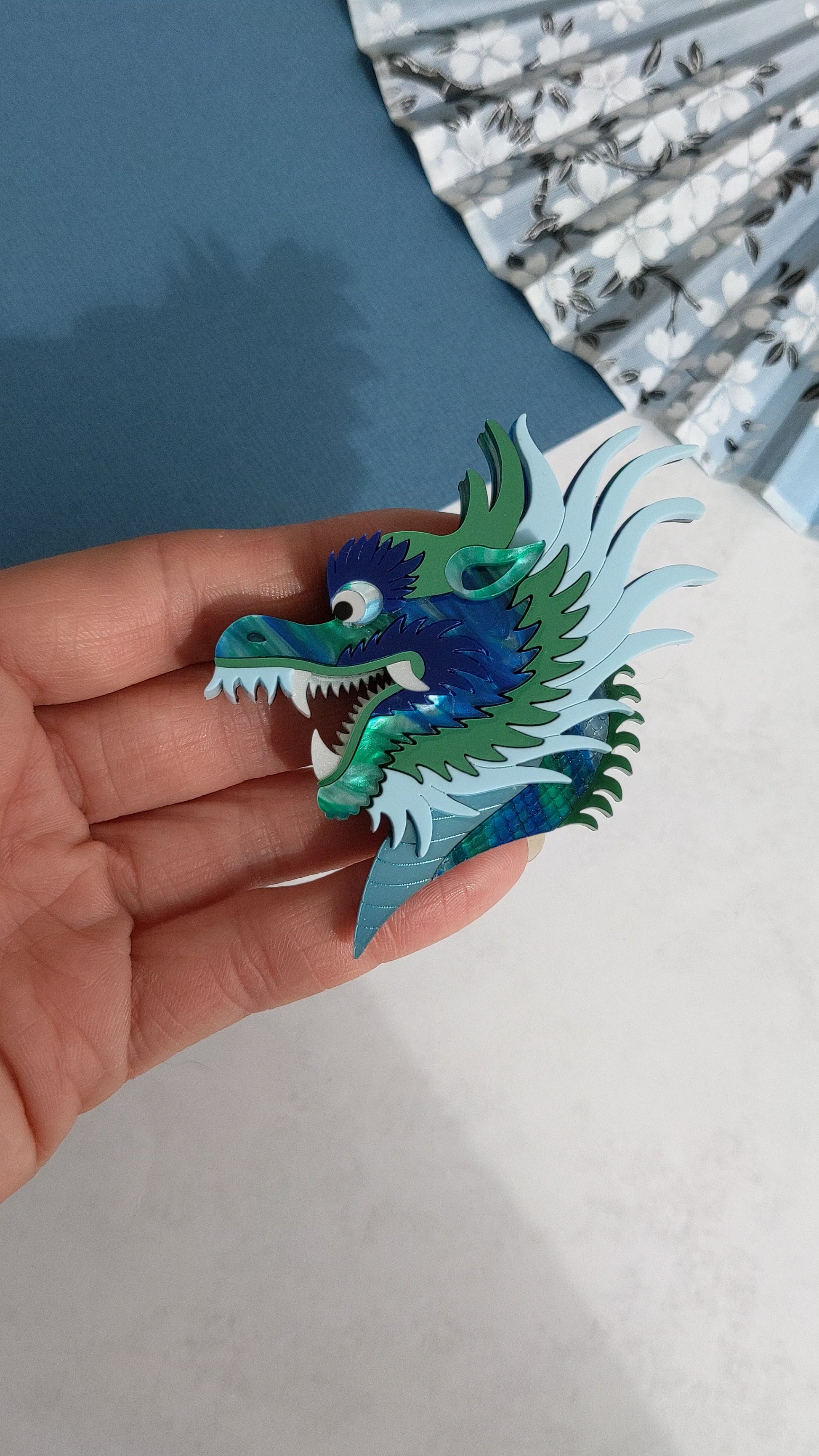 PRE ORDER Chinese Dragon Head Brooch BLUE/GREEN