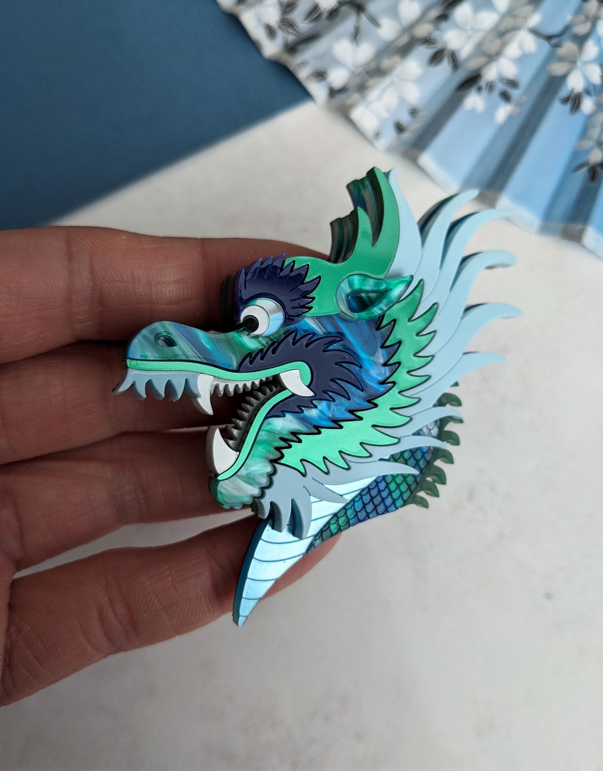 I've always admired Chinese dragons and Lunar year of the dragon was the perfect time to design one! Chinese dragons don't tend to breathe fire, they breathe clouds instead so you'll often see them surrounded by clouds and flying around in the air. This was the first colourway I made so it'll always be quite special to me. I'd say it's maybe the most traditional of the ones released so far and it is the most sophisticated looking. I would say it is the most versatile of the dragon colourways in terms of what colours you can wear it with. It's quite an average size brooch that is nice and lightweight to wear.