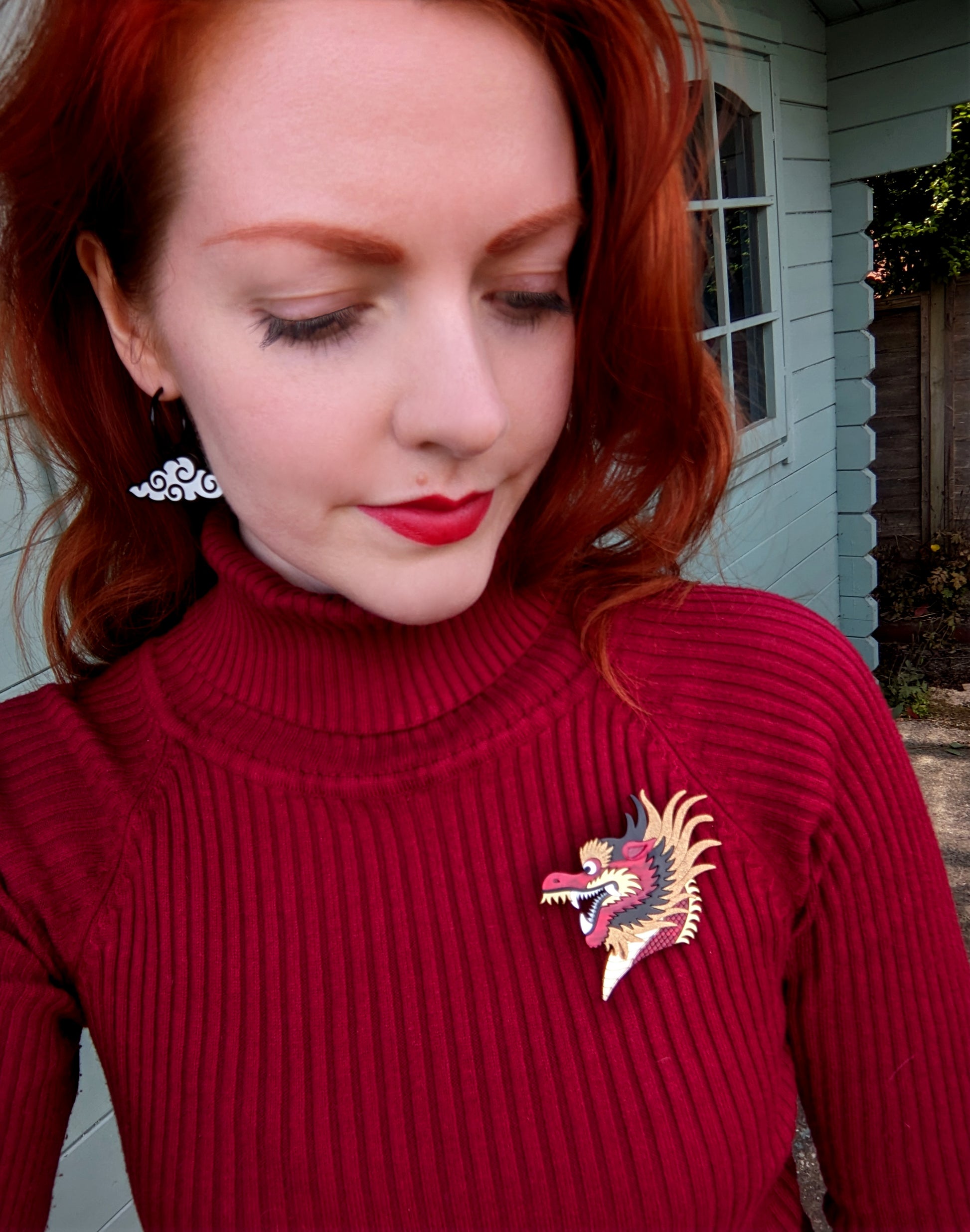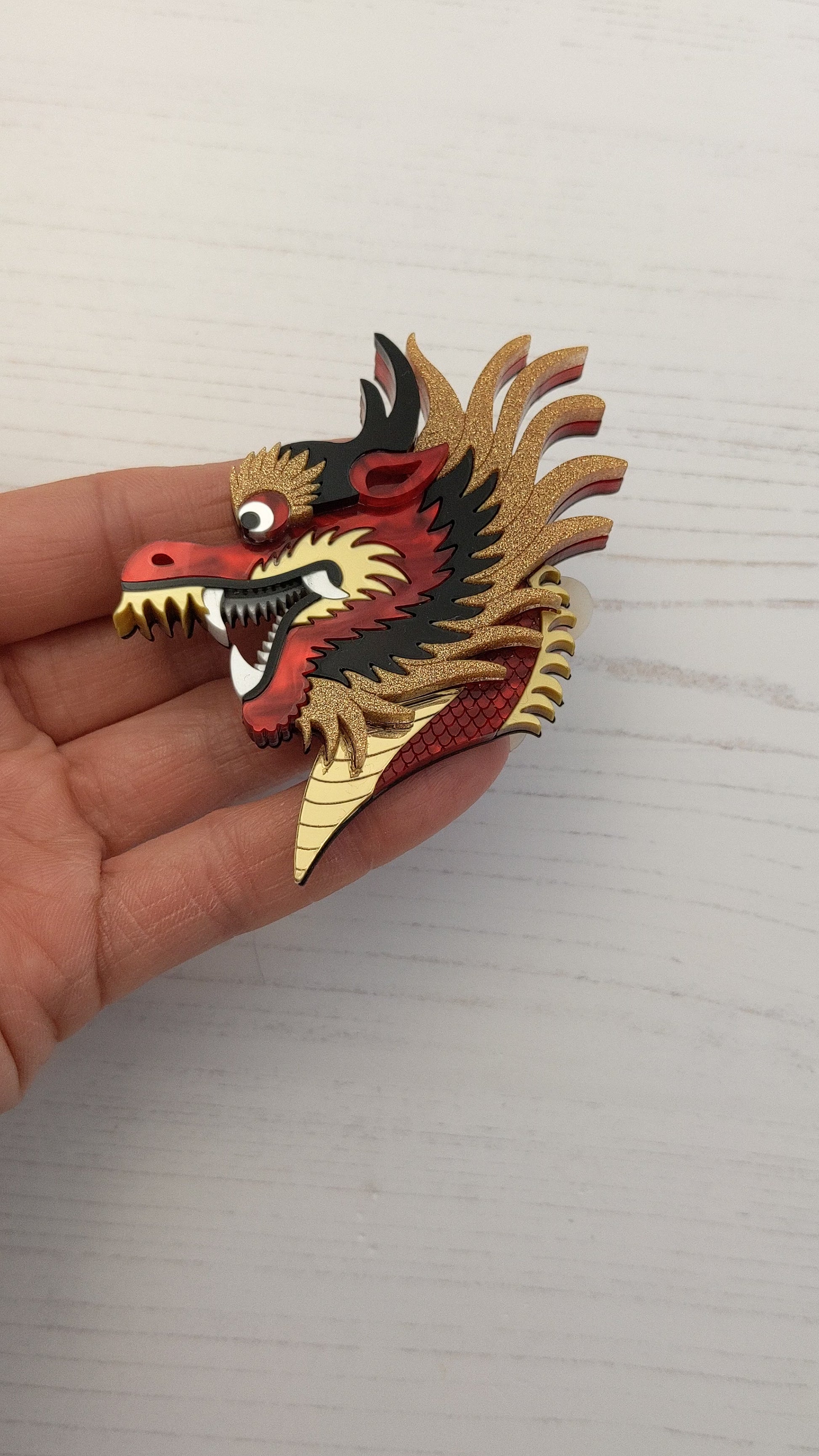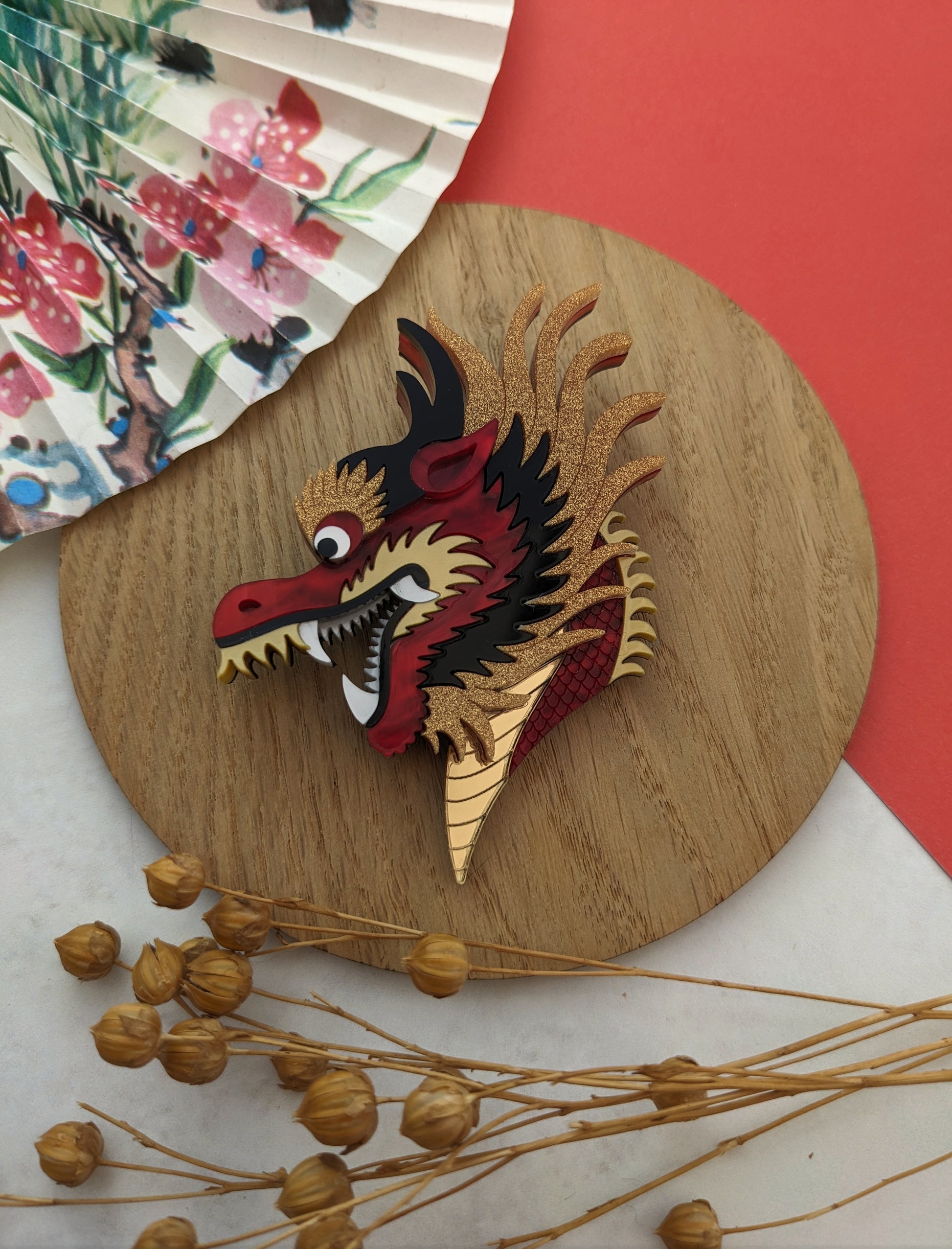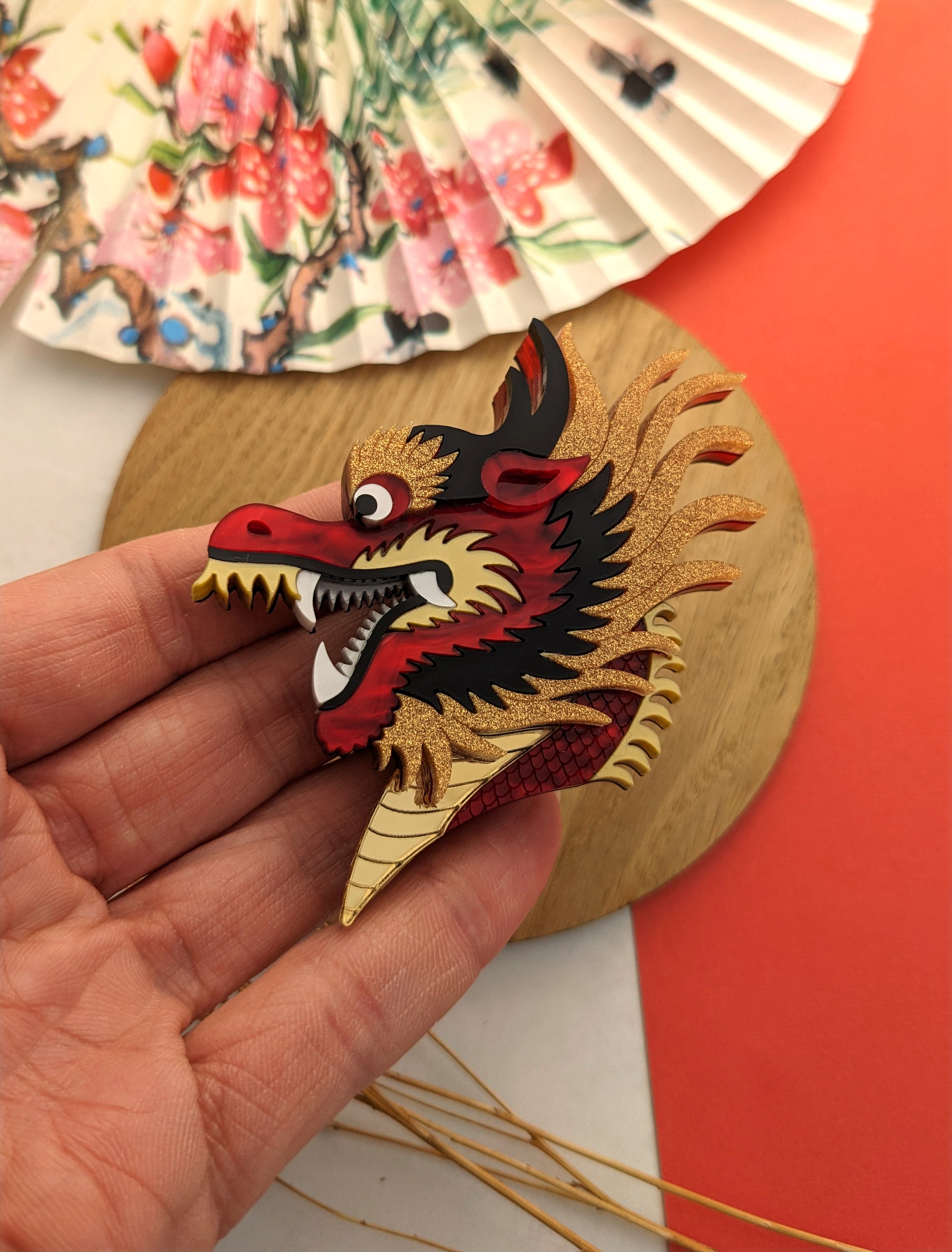 I've always admired Chinese dragons and Lunar year of the dragon was the perfect time to design one! Chinese dragons don't tend to breathe fire, they breathe clouds instead so you'll often see them surrounded by clouds and flying around in the air. The colour red is very prominent in Chinese culture as well as gold tones this brooch is a really traditional looking piece but due to removing the whiskers I feel it could be a European styled dragon too.