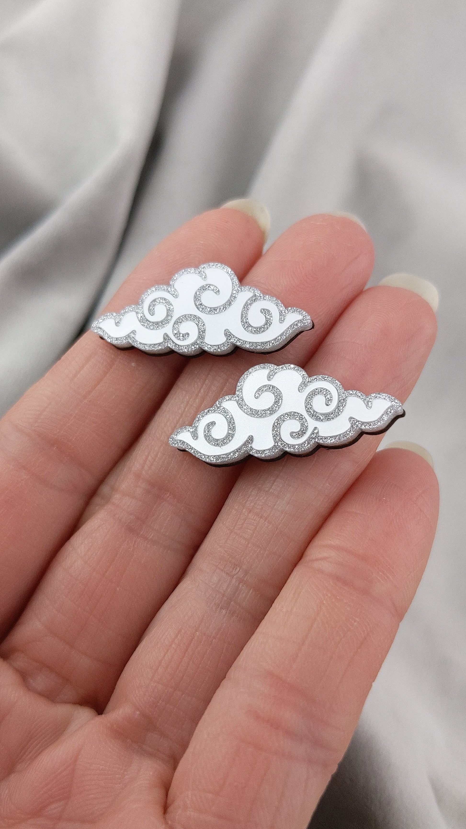 These cloud studs were inspired by and match my blue/green Chinese dragon pieces. They sit comfortably with the surgical steel posts glued on slightly to one side and they're then secured with butterfly backs. The clouds are made from white pearl marble acrylic which has a nice shimmer to it, and a magical light silver glitter acrylic all backed onto thin plywood which is painted black and varnished. I decided to cut the swirls rather than paint them as it just looked so much better to when I tested a painted version. They do create offcuts but as I'm not a really big business and I can easily recycle offcuts into new sheets I felt that it is worth it. They measure approximately 30mm x 11mm.