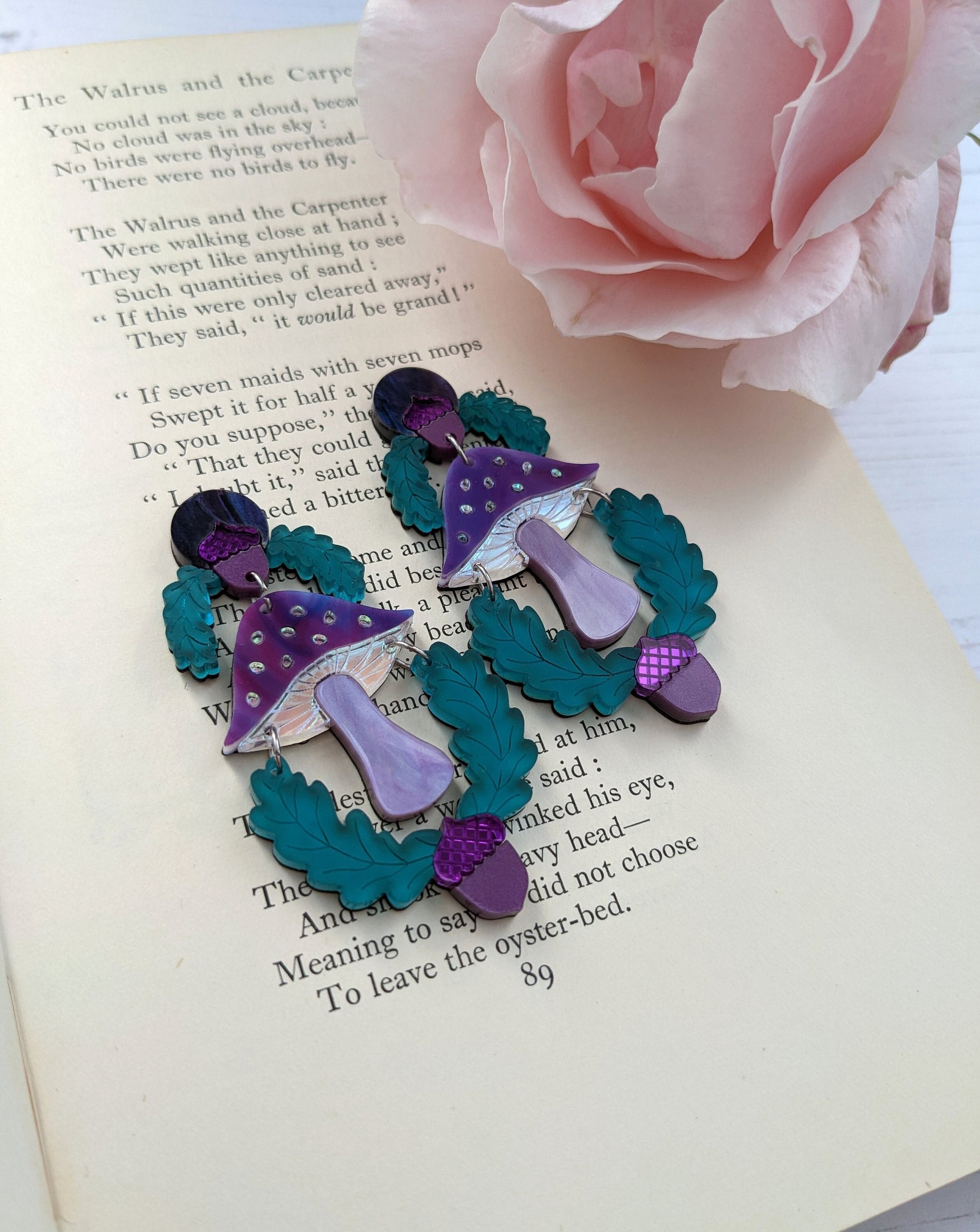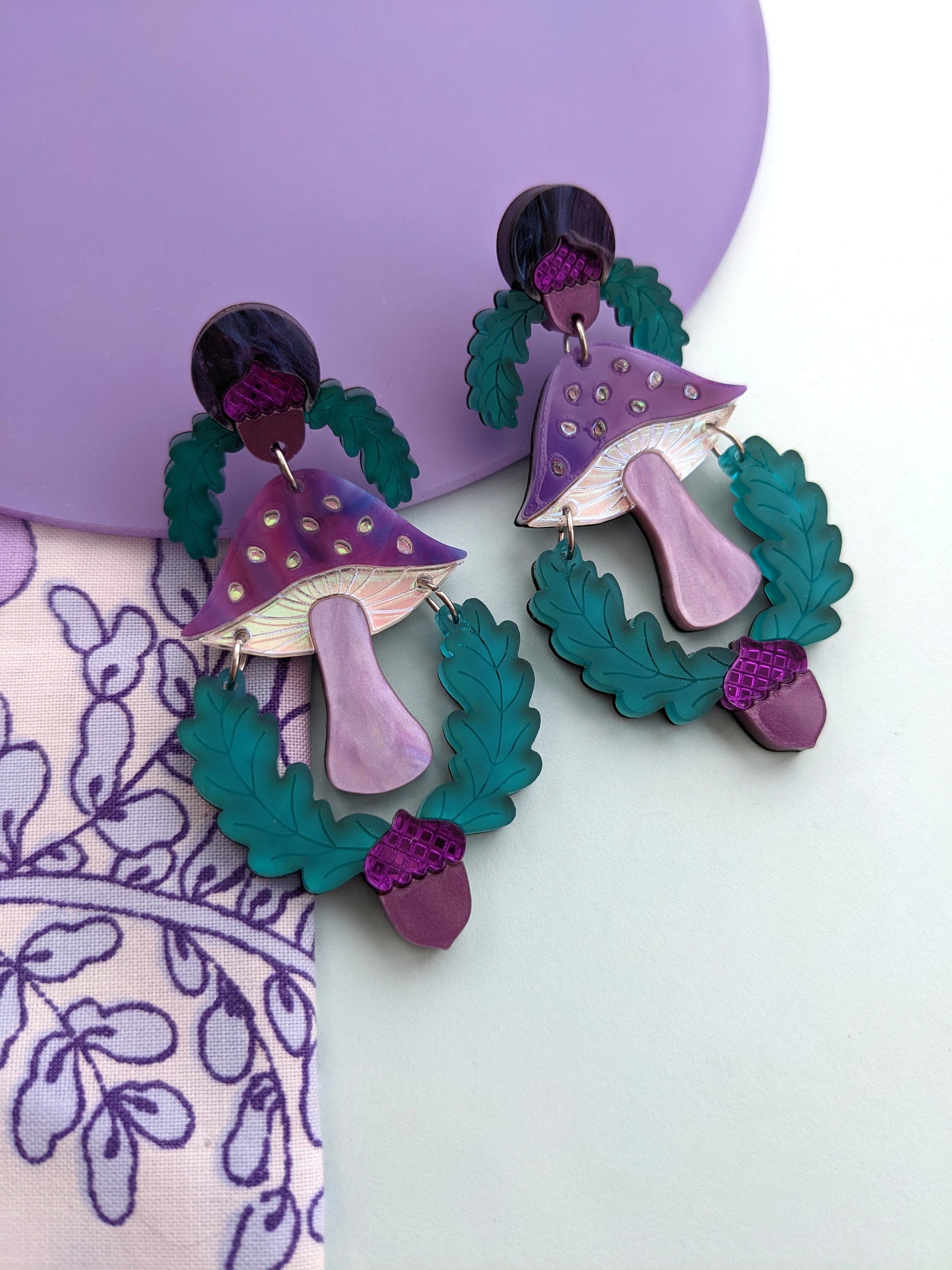 Inspired by a love of mushrooms and nature, these Aurora mushroom earrings are completely laser cut from acrylic sheet right down to the spots on the caps! They are quite statement and unusual looking yet are easy to wear and lightweight. Each earrings measures approximately h6.5cm x w3.5cm and feature frosted, marble, pearl marble, mirror and iridescent acrylic all assembled onto black painted and varnished 0.8mm birch plywood bases. All work is solely done by Rock The Panda designer and maker Ruth Anna Moore in Sheffield, United Kingdom. The earring posts and butterfly backs are made from surgical steel and the jump rings are made from stainless steel 304. Note that the purple marble acrylic will have variation and the iridescent acrylic looks different in different lighting and at different angles; it shines, pink, green, white and indigo. The purple stalks are cut from the underneath of a lightly glittered marble so odd bits of holographic glitter may appear on them.