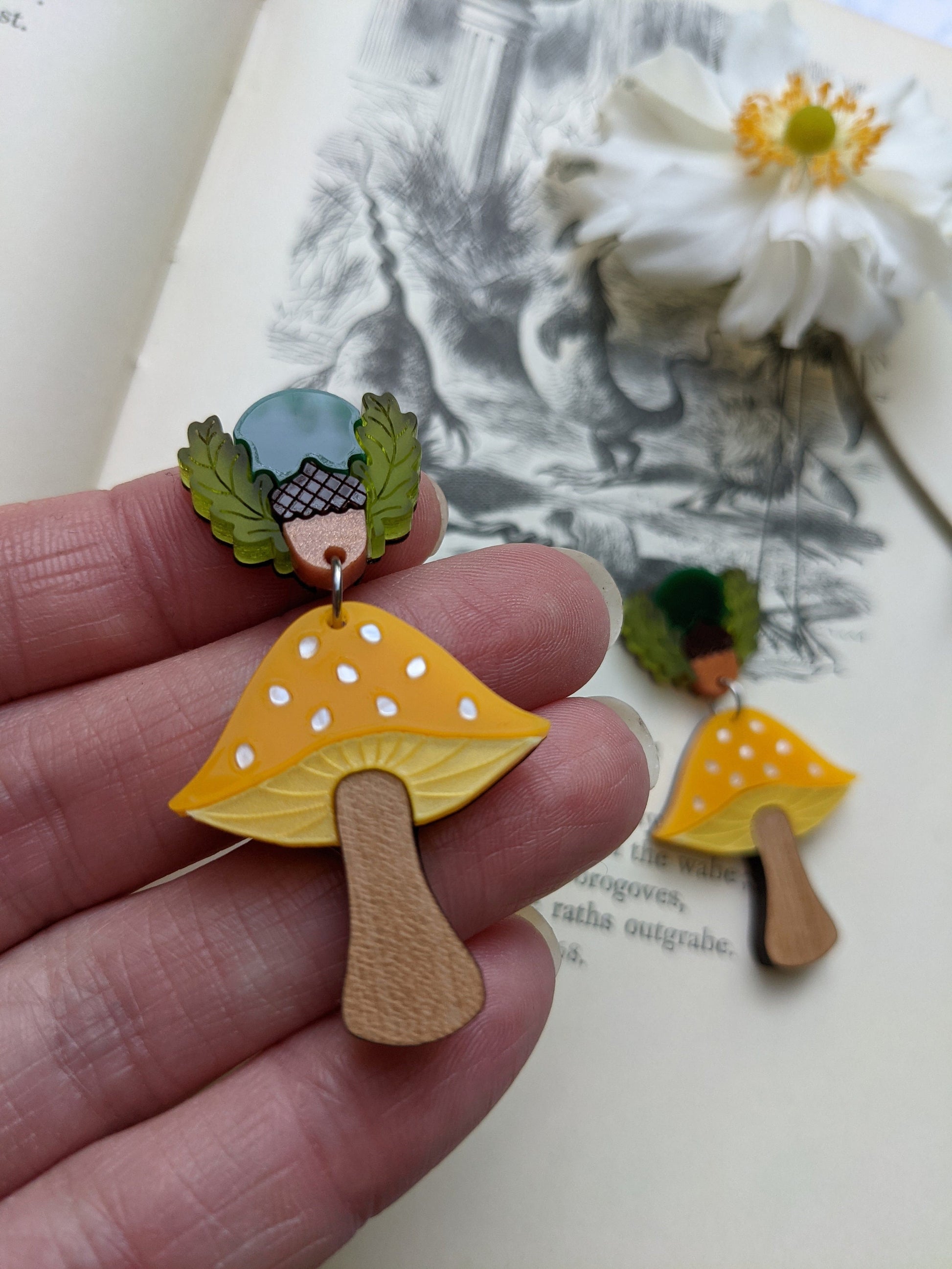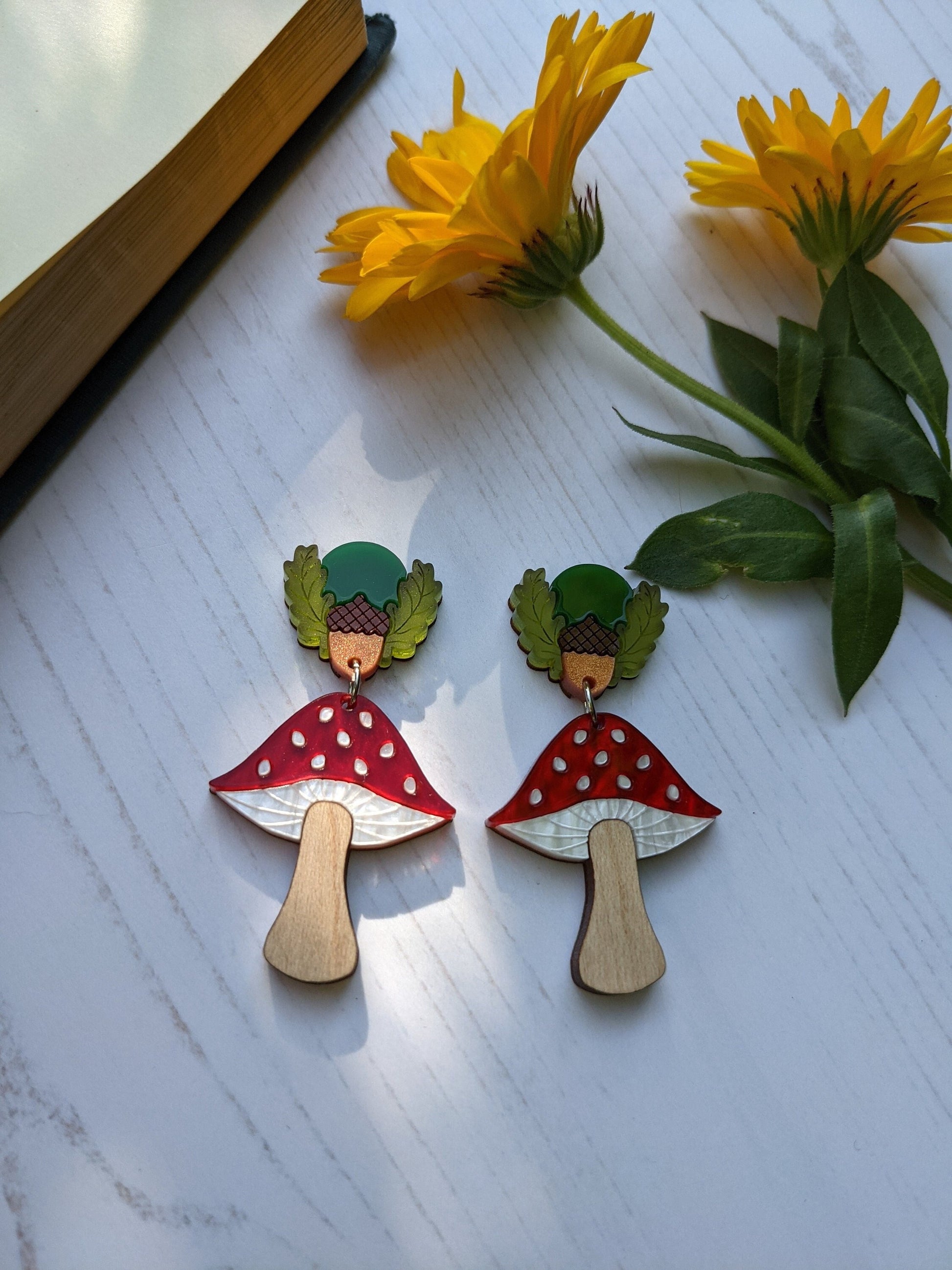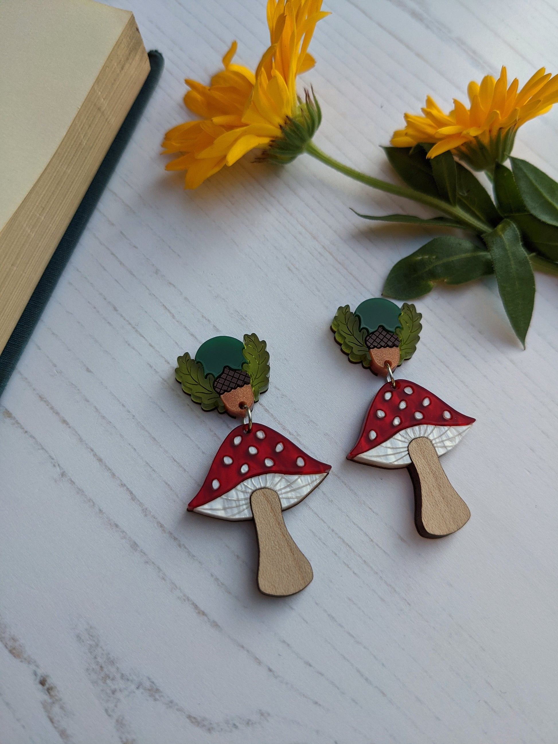 Inspired by a love of toadstools and nature, these Autumnal toadstool earrings are completely laser cut from acrylic sheet right down to the spots on the caps! They are super light and easy to wear. Each earrings measures approximately h5cm x w2.7cm and feature forest green and brown Perspex, frosted green Perspex, marble yellow, white, red and copper hand mixed acrylic as well as solid cherry wood (yellow) and solid maple wood (red) all assembled onto an hand sanded and varnished 0.8mm birch plywood base. All work is solely done by Rock The Panda designer and maker Ruth Anna Moore in Sheffield, United Kingdom. The earring posts and butterfly backs are made from surgical steel and the jump rings are made from stainless steel 304. Note that the grain of the wood can vary between pieces but I do check wooden pieces before assembling and I don't send any out that I wouldn't be happy to receive myself.