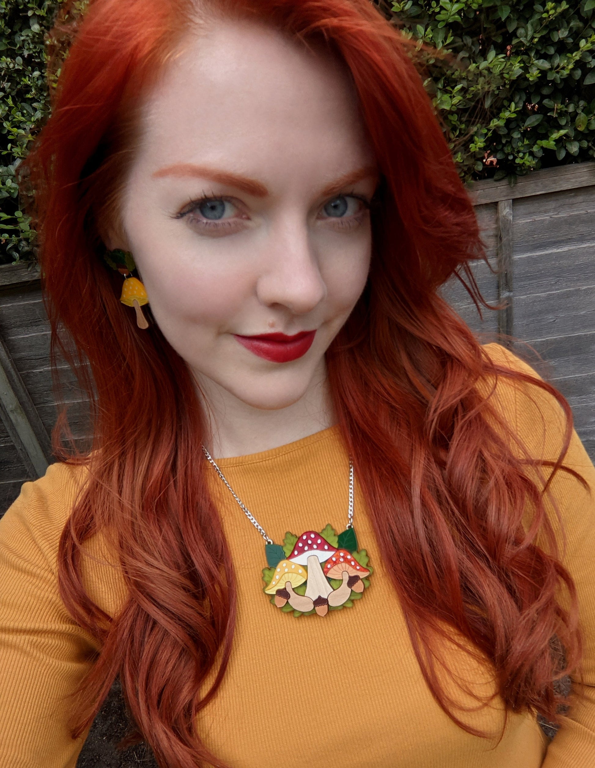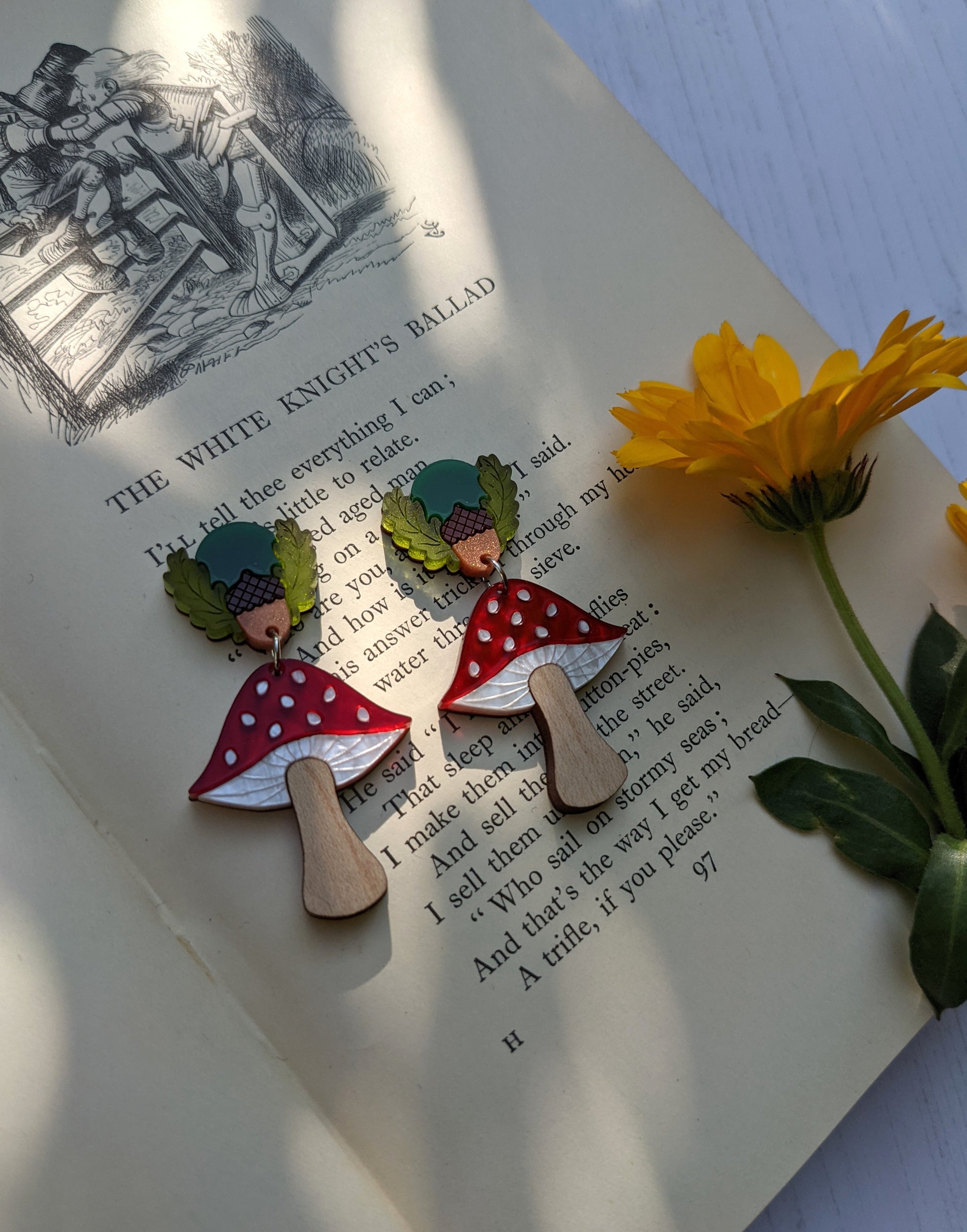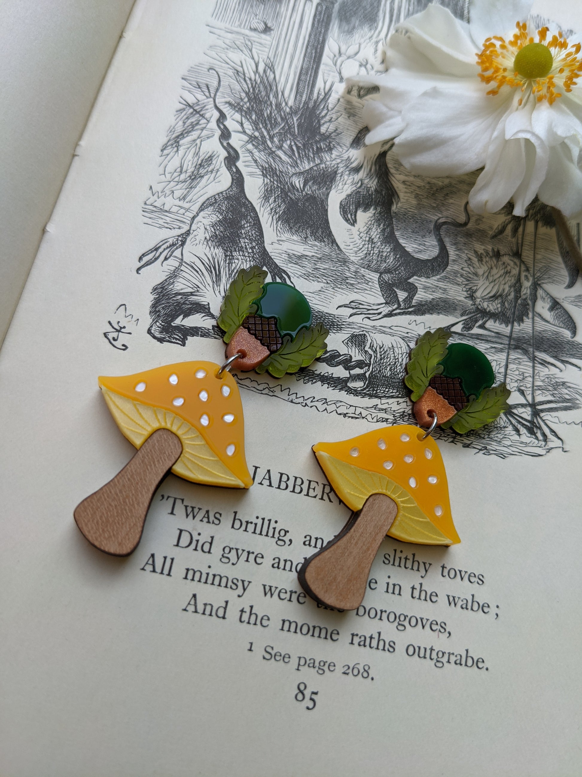 Inspired by a love of toadstools and nature, these Autumnal toadstool earrings are completely laser cut from acrylic sheet right down to the spots on the caps! They are super light and easy to wear. Each earrings measures approximately h5cm x w2.7cm and feature forest green and brown Perspex, frosted green Perspex, marble yellow, white, red and copper hand mixed acrylic as well as solid cherry wood (yellow) and solid maple wood (red) all assembled onto an hand sanded and varnished 0.8mm birch plywood base. All work is solely done by Rock The Panda designer and maker Ruth Anna Moore in Sheffield, United Kingdom. The earring posts and butterfly backs are made from surgical steel and the jump rings are made from stainless steel 304. Note that the grain of the wood can vary between pieces but I do check wooden pieces before assembling and I don't send any out that I wouldn't be happy to receive myself.