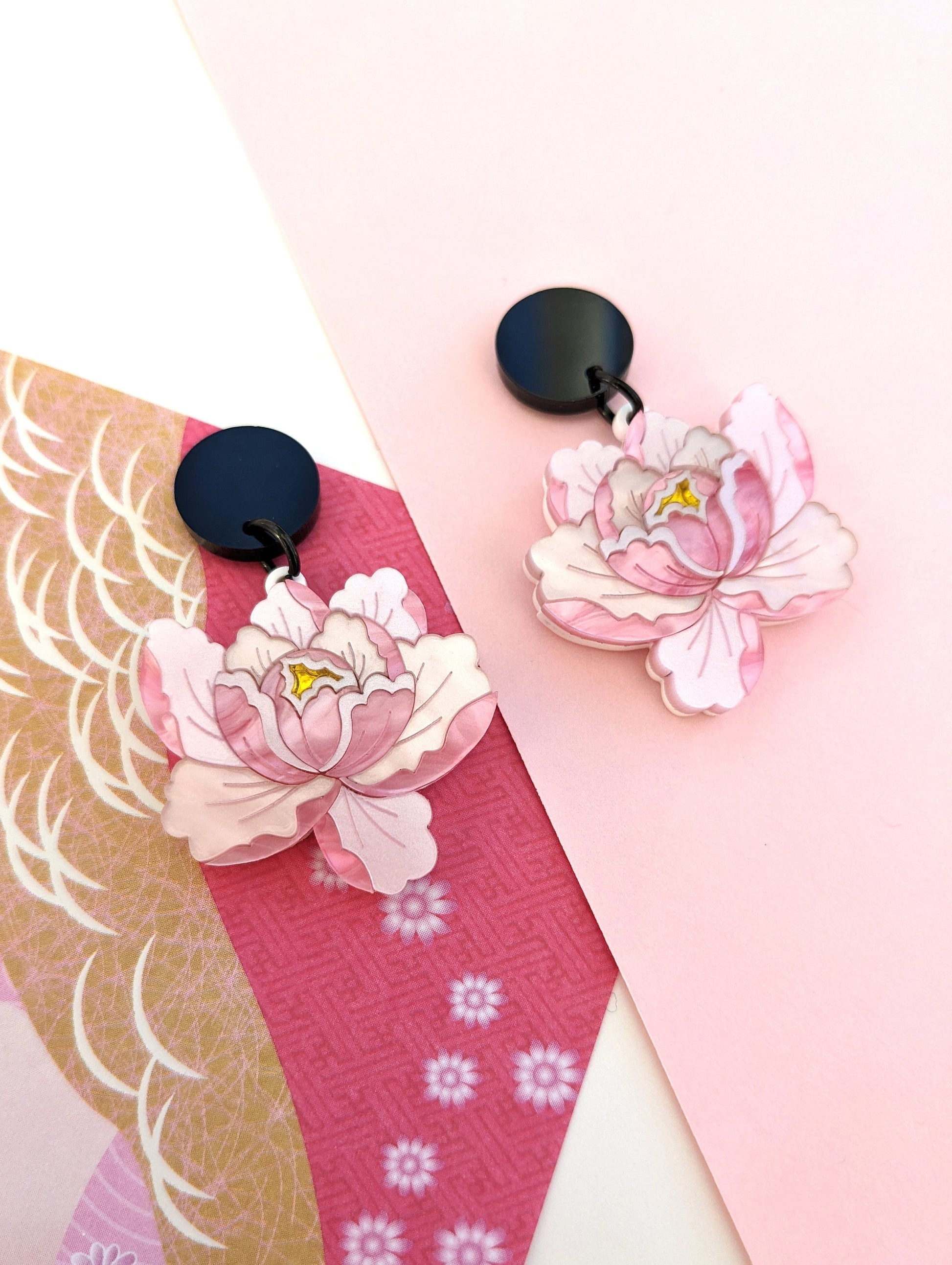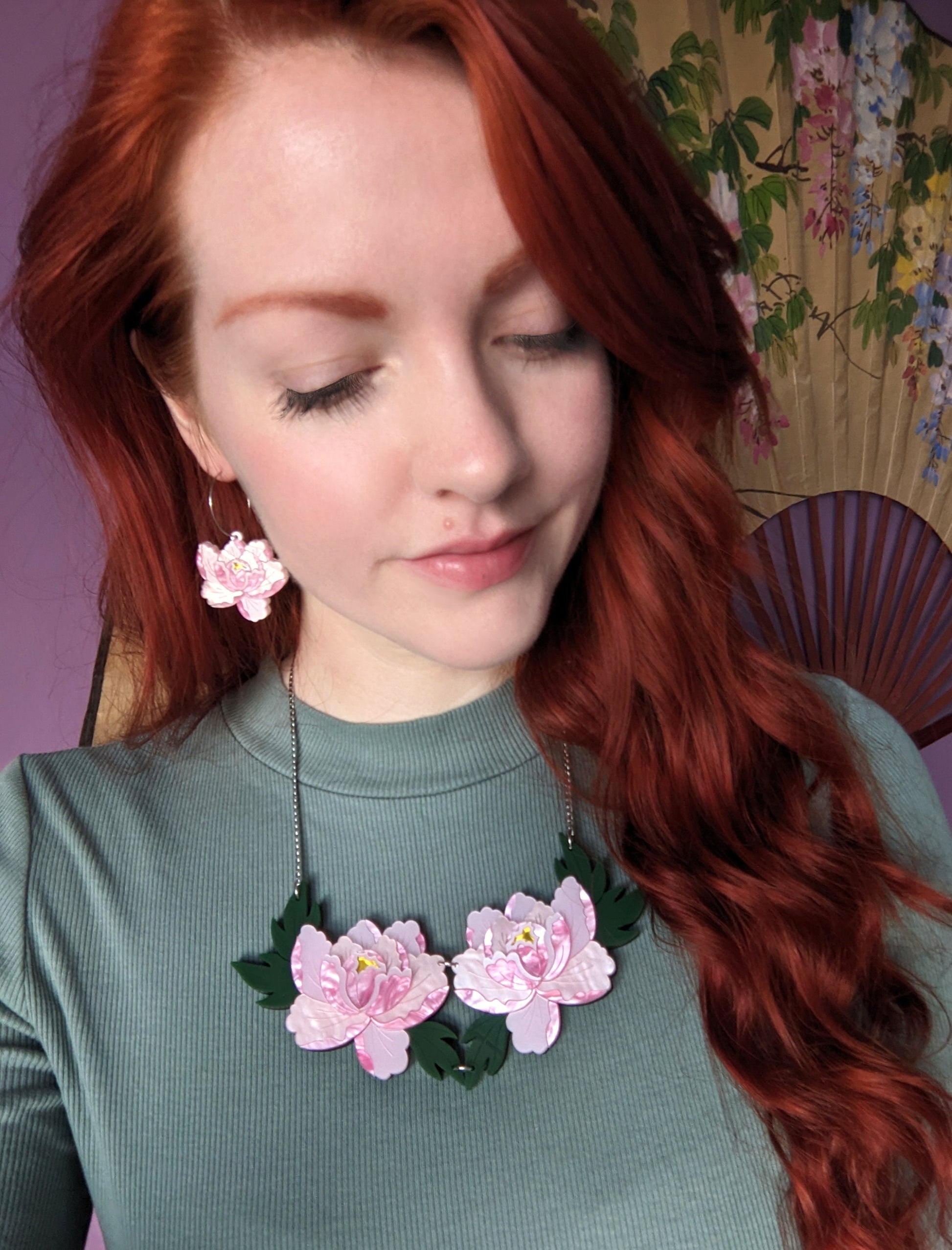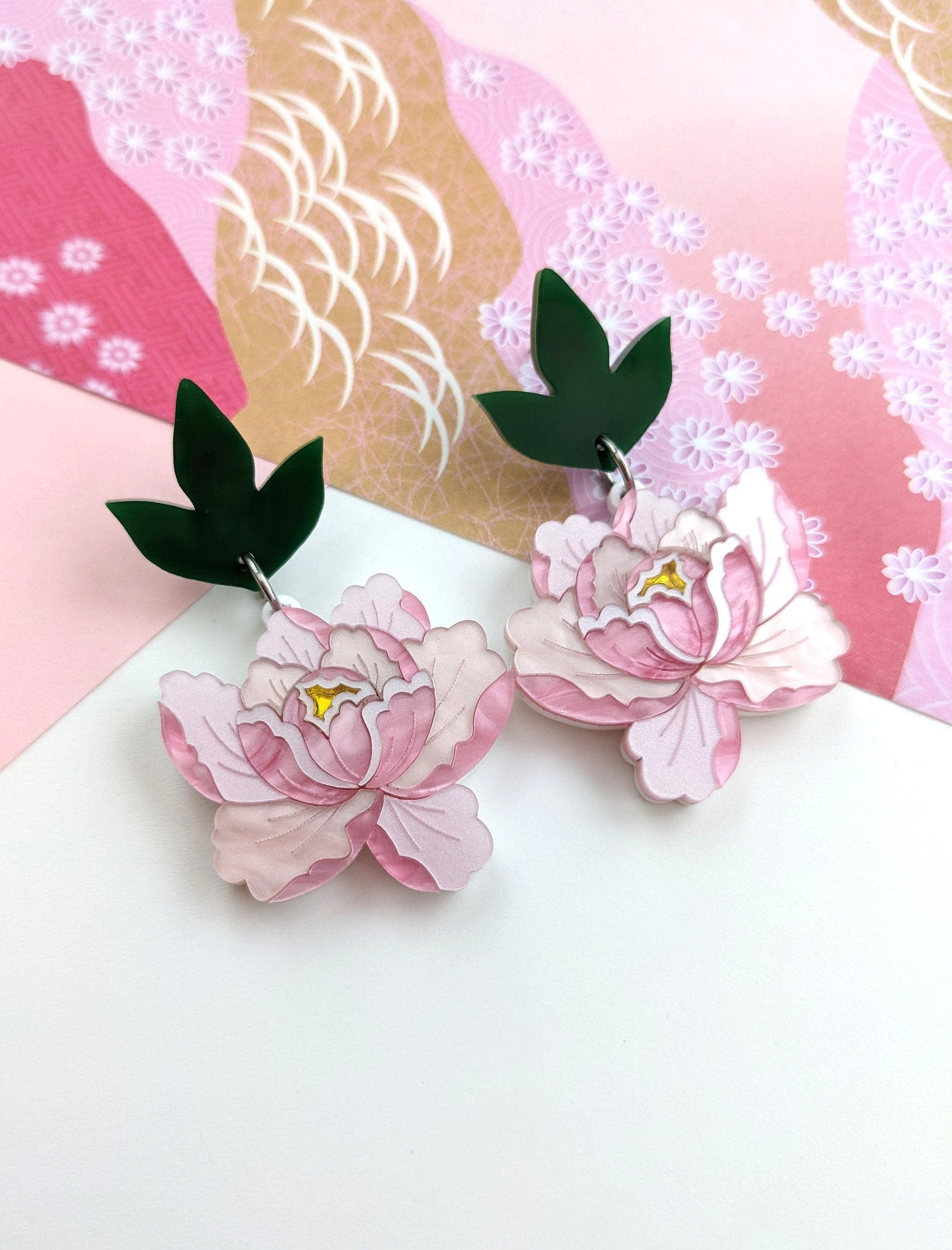 These detailed peony earrings are made up of 24 pieces (each), 3 different types of pink acrylic and also have yellow mirrored centres. Each flower measures approximately h32mmxw33mm at the angle when worn. You have a choice of either black studs, stainless steel hoops or leaf studs (to match the statement peony necklace) to hang them from all of which are made from surgical steel and the backs for the studs are butterfly backs. New Style - stainless steel half hoops. I don't currently have a photo of the pale pink on the half hoops though so the vibrant pink ones in the photo are there to give you an idea of how they look.