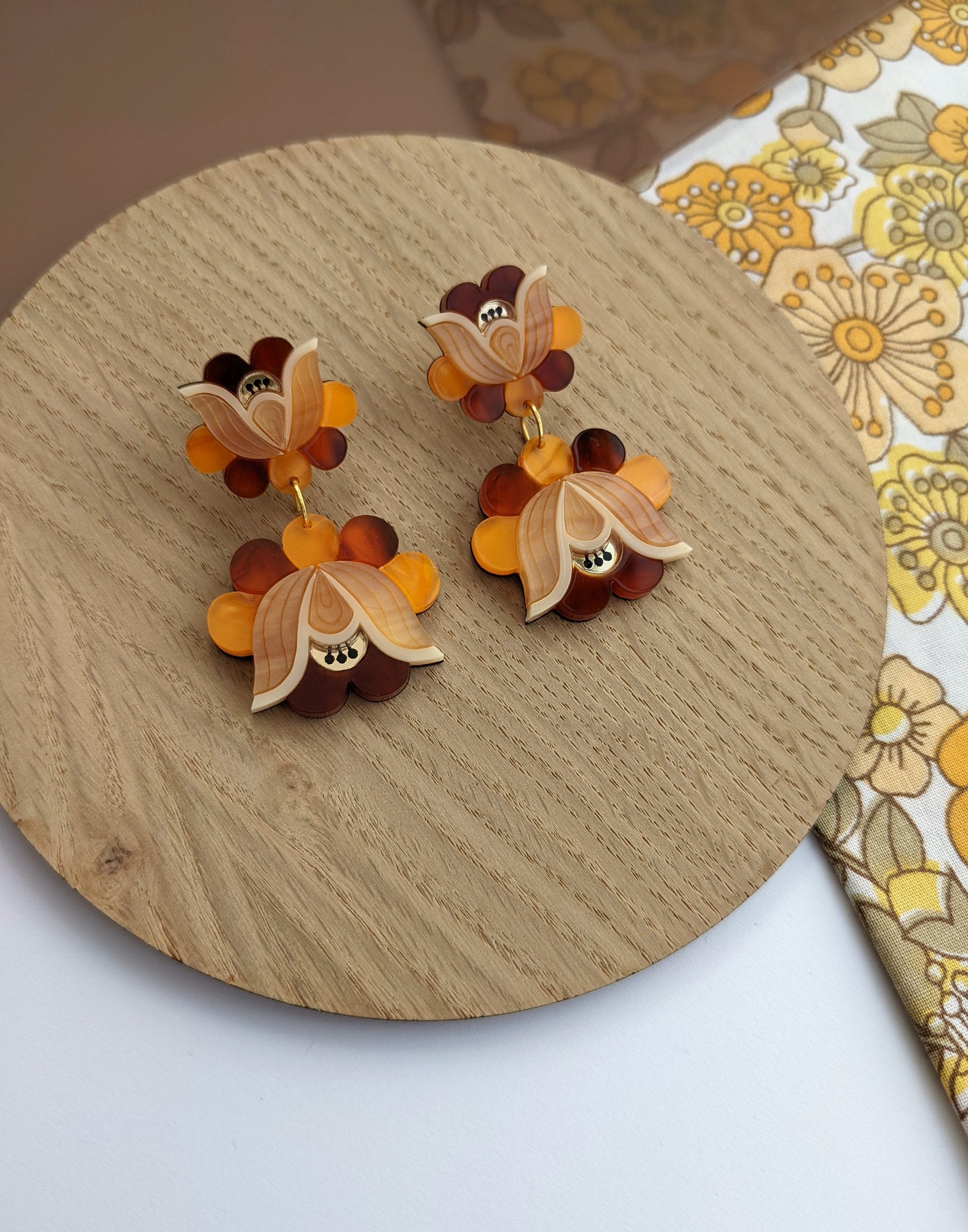 Inspired by a mixture of folk art combined with my love of the 70s decade, these mid folk floral earrings are made from 48 individually laser cut pieces. They are lightweight and easy to wear, weighing in at 5grams each. They measure approximately h5.3cm x w3.1cm and feature a mixture of hand mixed pearl marble, faux tortoiseshell, plain Perspex and mirror acrylic all hand assembled onto varnished 0.8mm plywood backplates. All work is solely done by Rock The Panda designer and maker Ruth Anna Moore in Sheffield, United Kingdom. The jump rings are made from gold plated stainless steel and the posts and butterfly backs are surgical steel. I suggest wearing the plastic stopper (I provide) as well as the backs to insure they aren't lost.