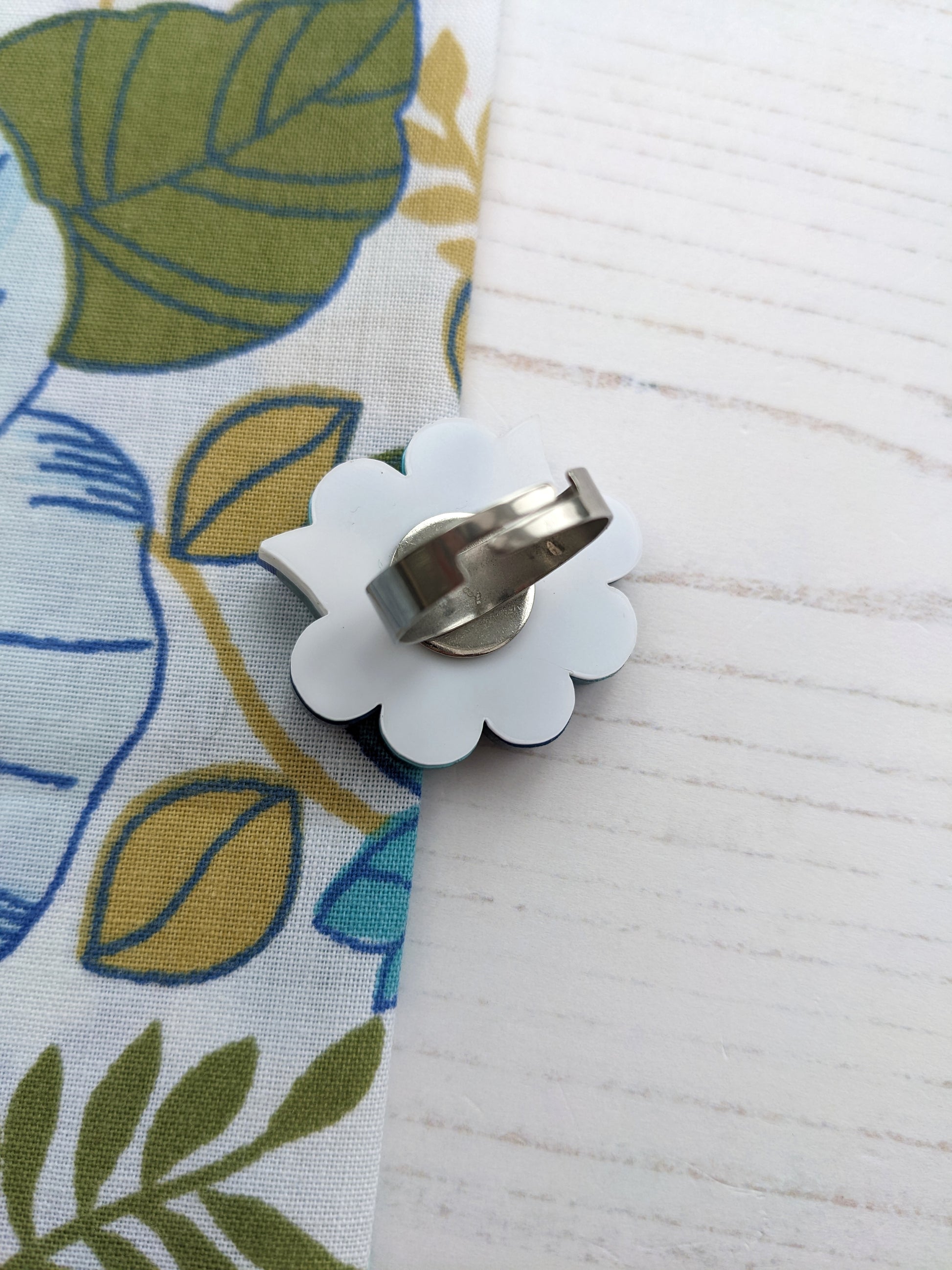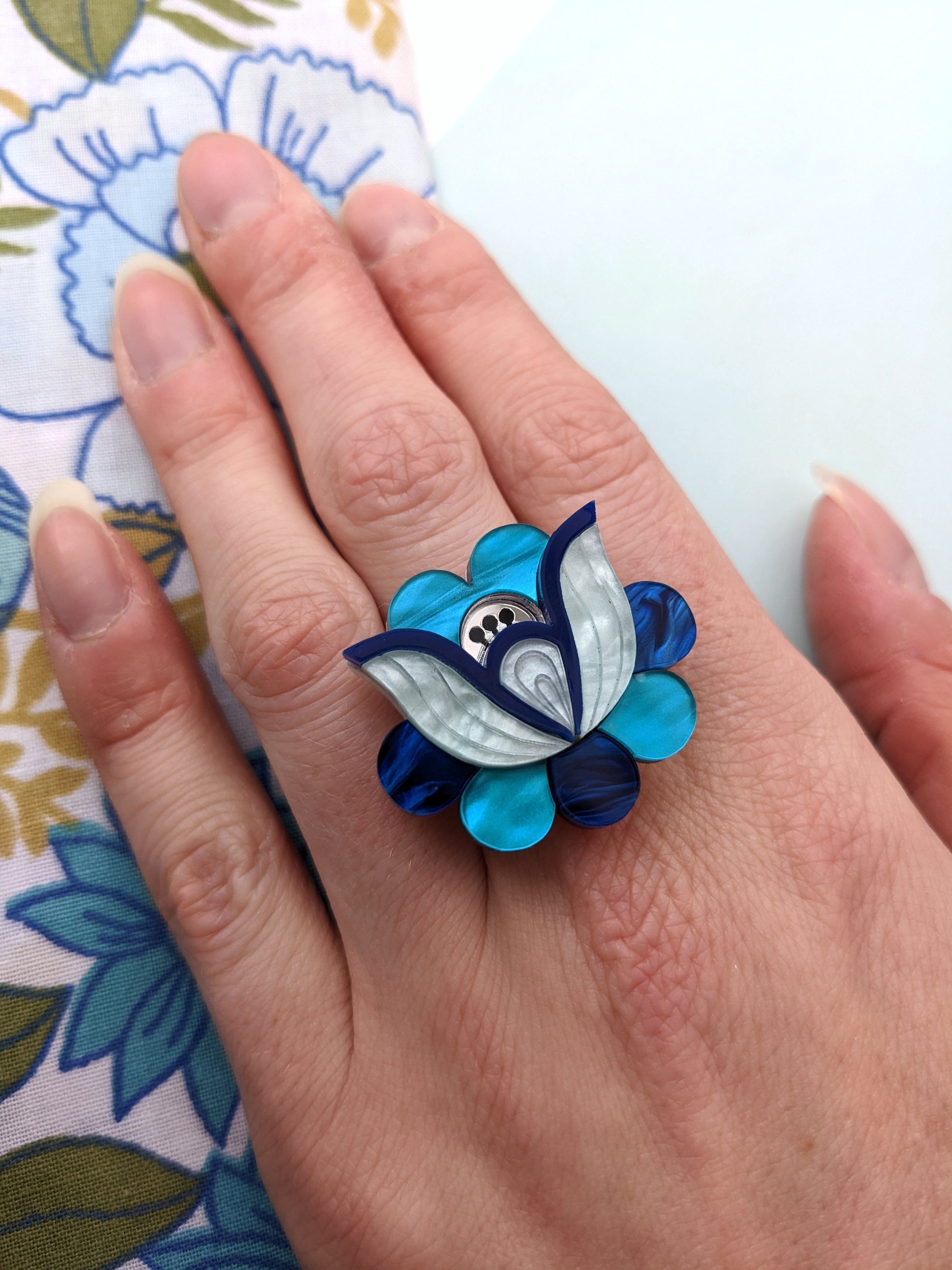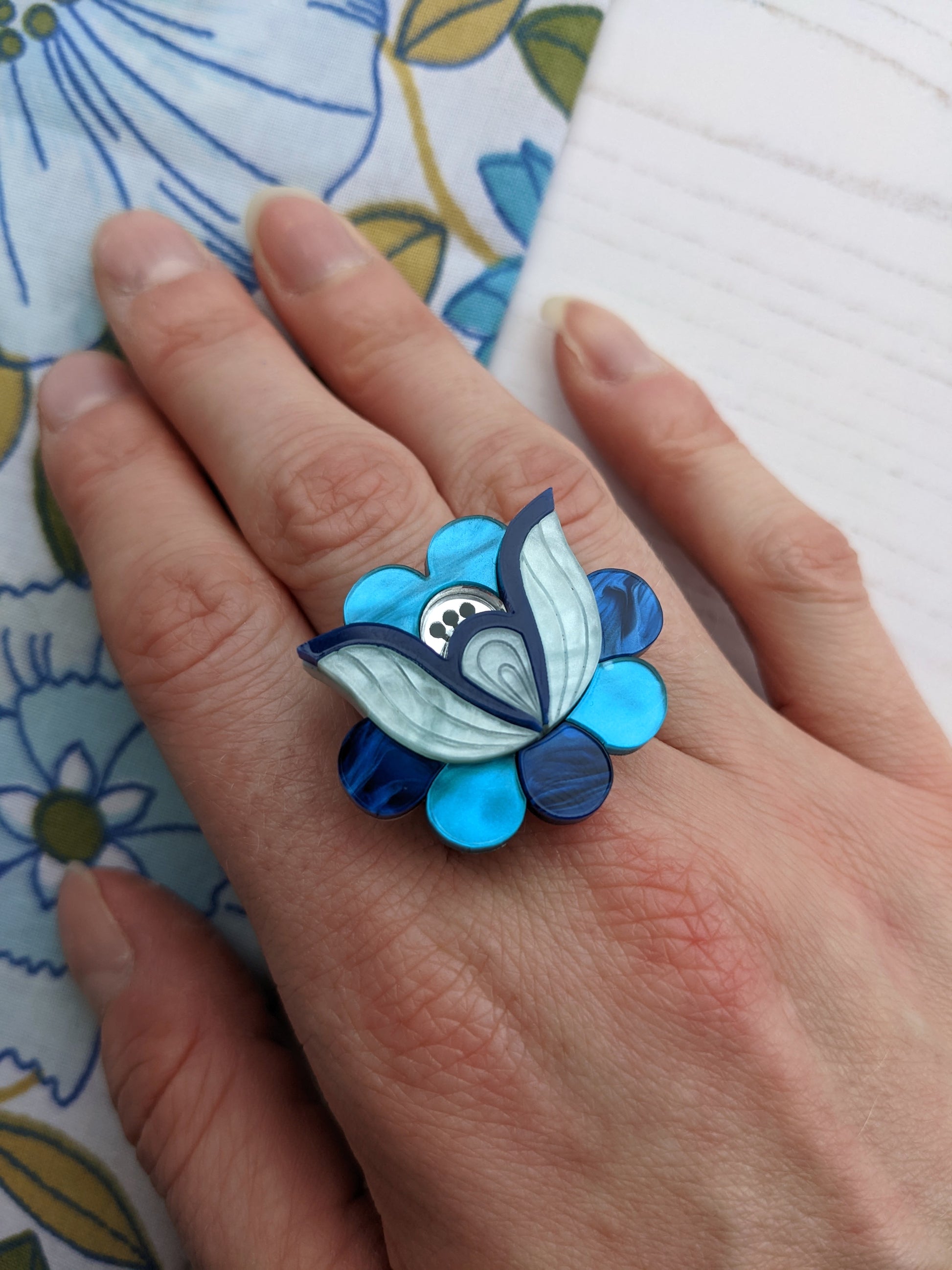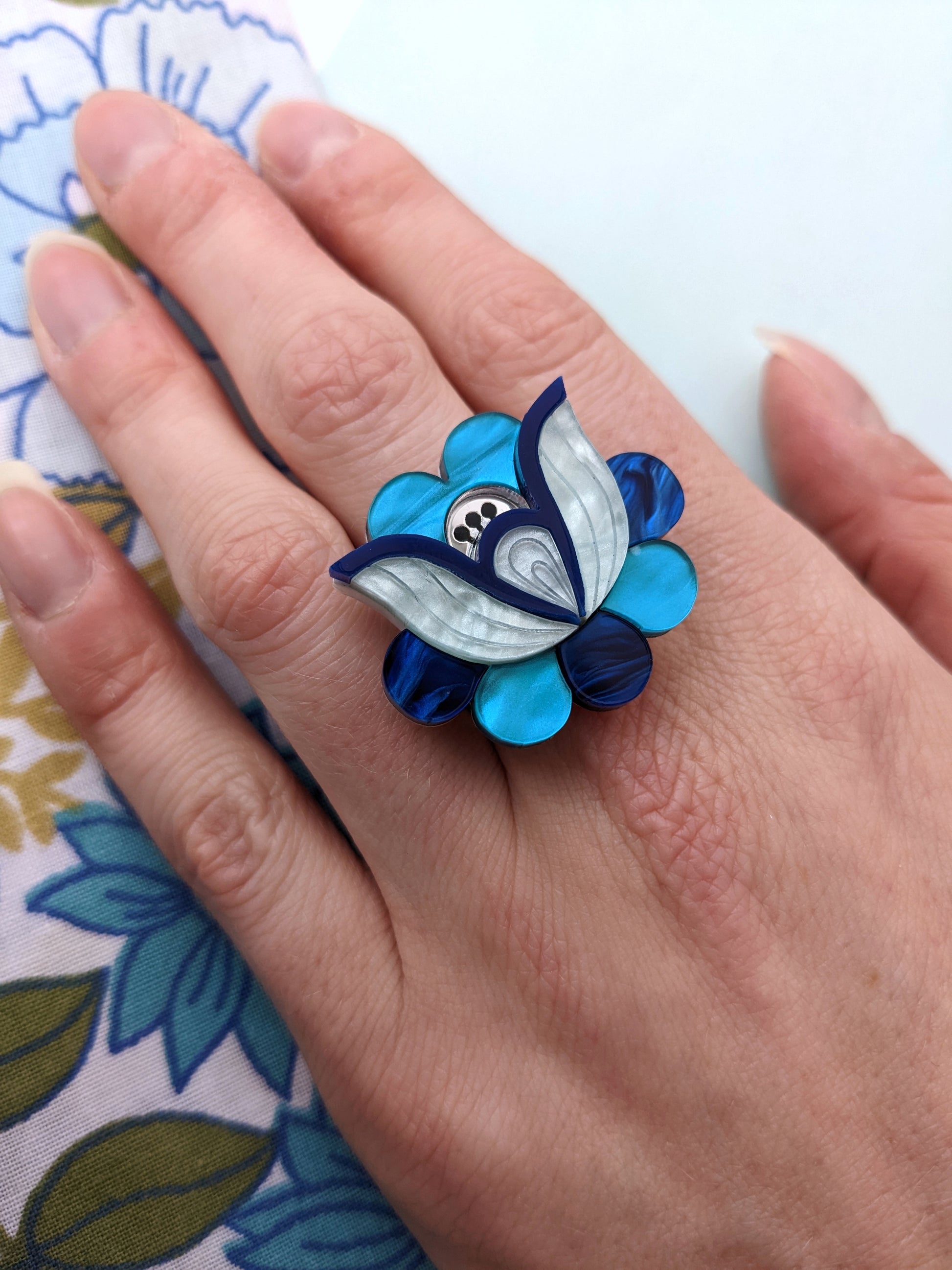 Inspired by a mixture of folk art mixed with my love of the 70s decade, this folk floral ring is made from 13 individually laser cut pieces. It's quite a statement looking piece that has a strong retro vibe and it coordinate nicely with the other pieces from this collection. The ring measures approximately h2.7cm x w3.1cm and feature a mixture of hand mixed pearl marble, plain perspex and mirror acrylic. The ring shank is adjustable accommodating UK size M - UK size Q. US 6 - 8 1/2. EU 52 - 58 (though my middle finger is about an L and I find it comfortable on there). This ring isn't meant for heavy duty wear and it is advised to take it off during activities that may cause the ring to get knocked. It's also advised to take the ring off when you wash your hands.