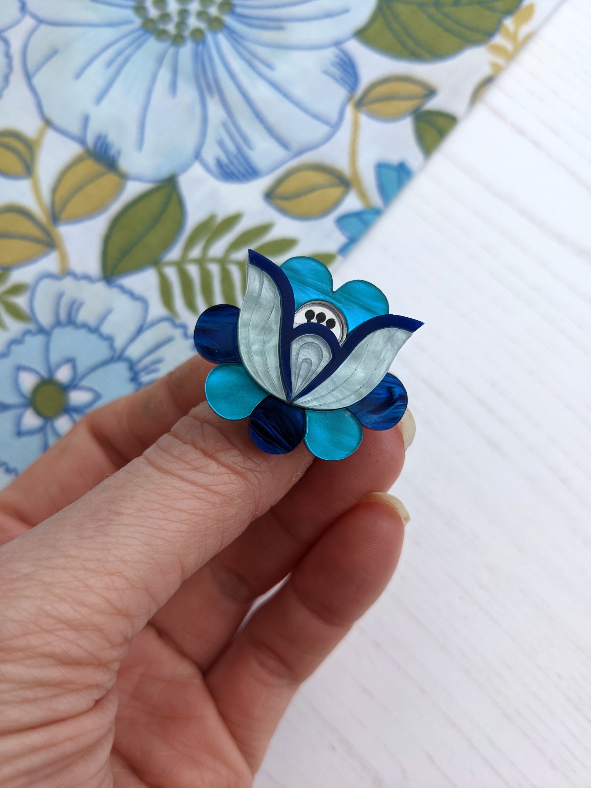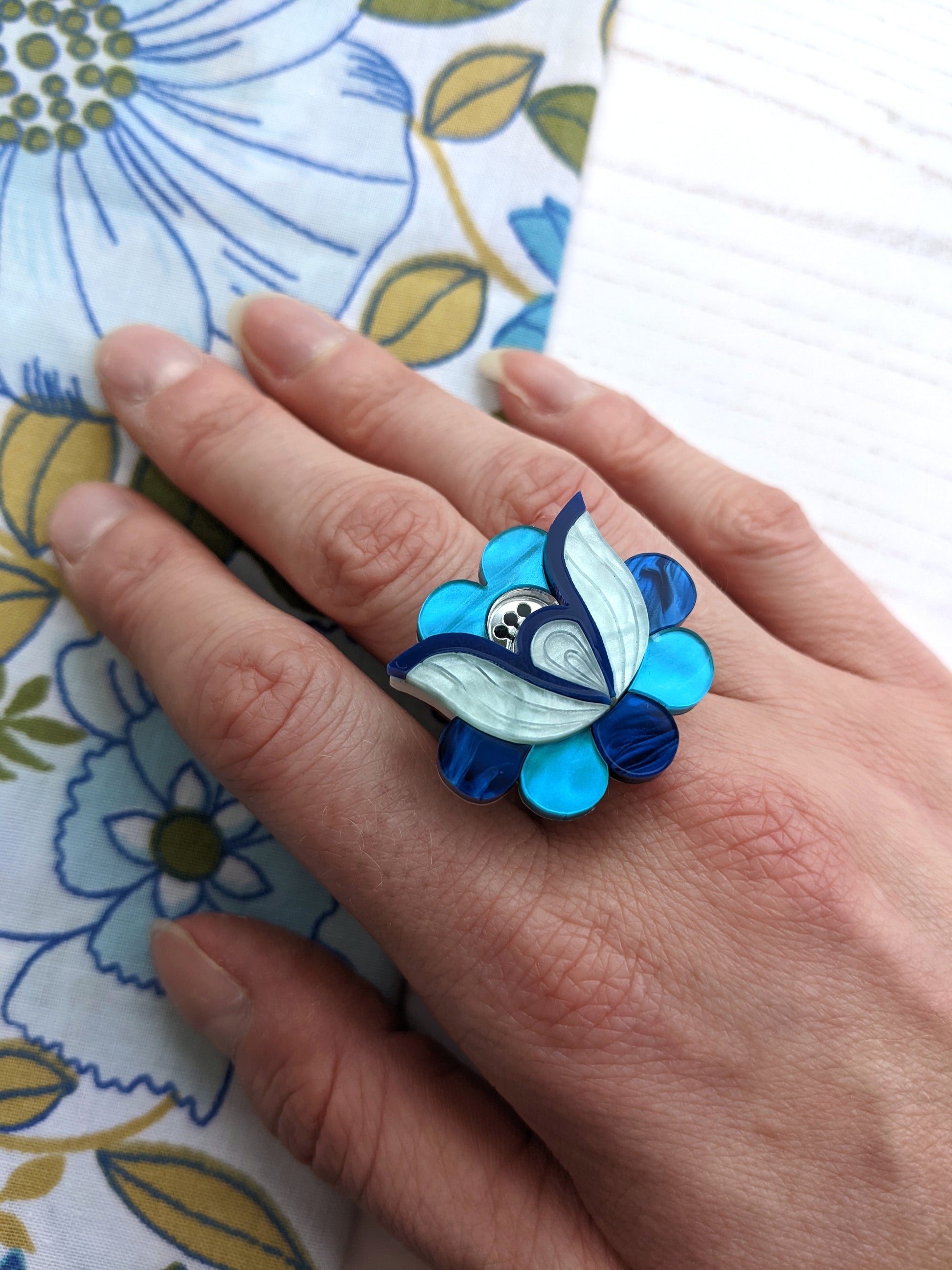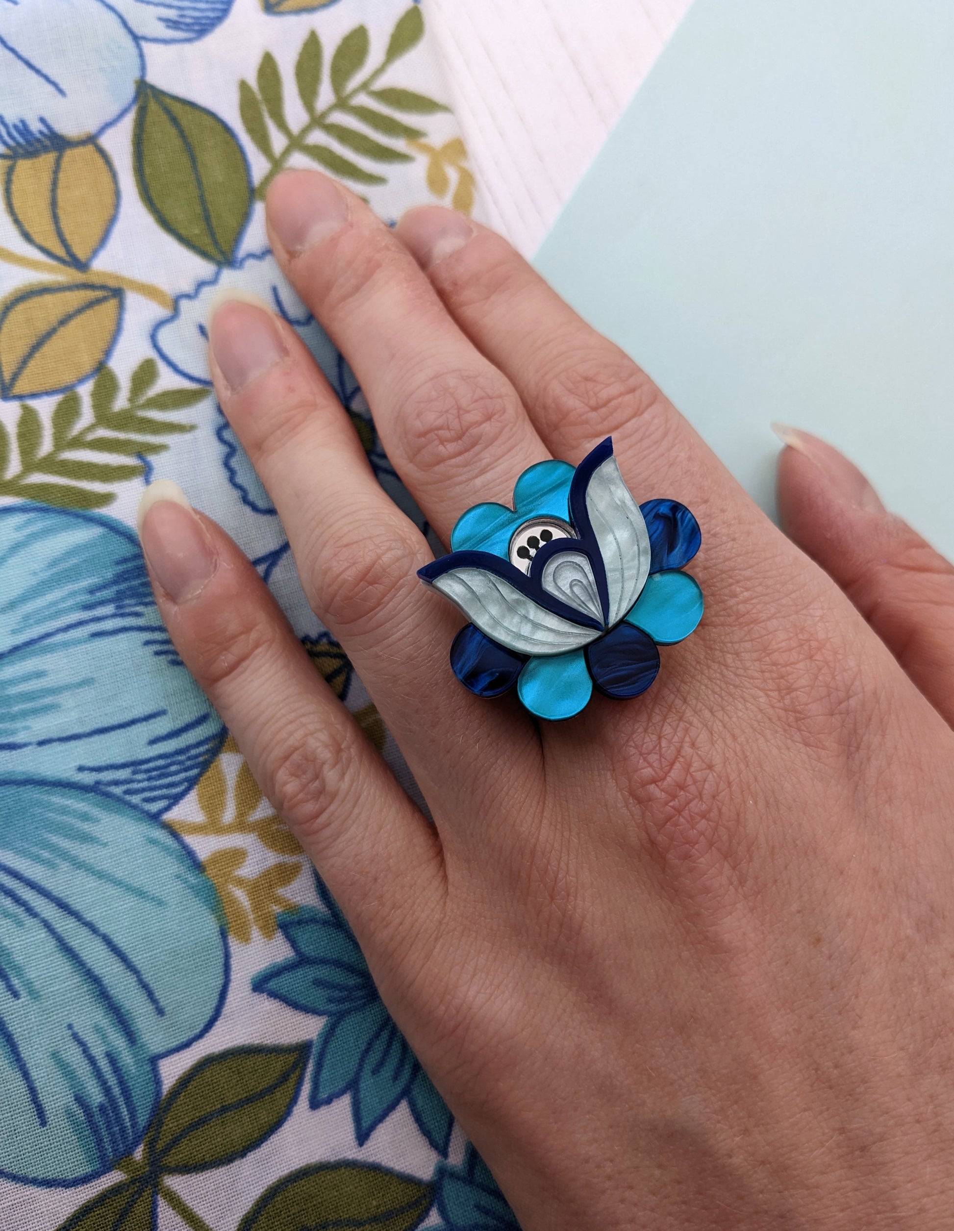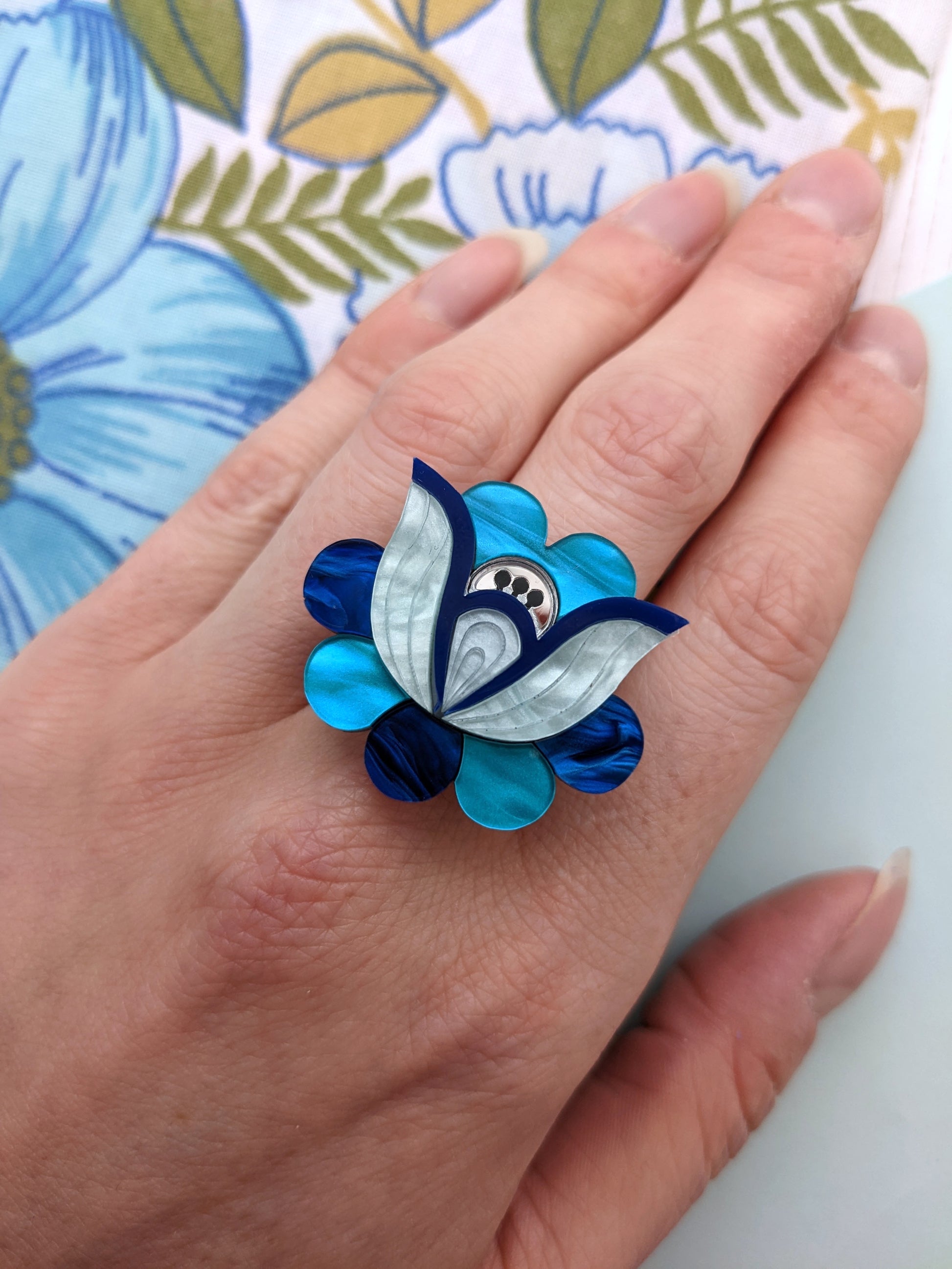 Inspired by a mixture of folk art mixed with my love of the 70s decade, this folk floral ring is made from 13 individually laser cut pieces. It's quite a statement looking piece that has a strong retro vibe and it coordinate nicely with the other pieces from this collection. The ring measures approximately h2.7cm x w3.1cm and feature a mixture of hand mixed pearl marble, plain perspex and mirror acrylic. The ring shank is adjustable accommodating UK size M - UK size Q. US 6 - 8 1/2. EU 52 - 58 (though my middle finger is about an L and I find it comfortable on there). This ring isn't meant for heavy duty wear and it is advised to take it off during activities that may cause the ring to get knocked. It's also advised to take the ring off when you wash your hands.