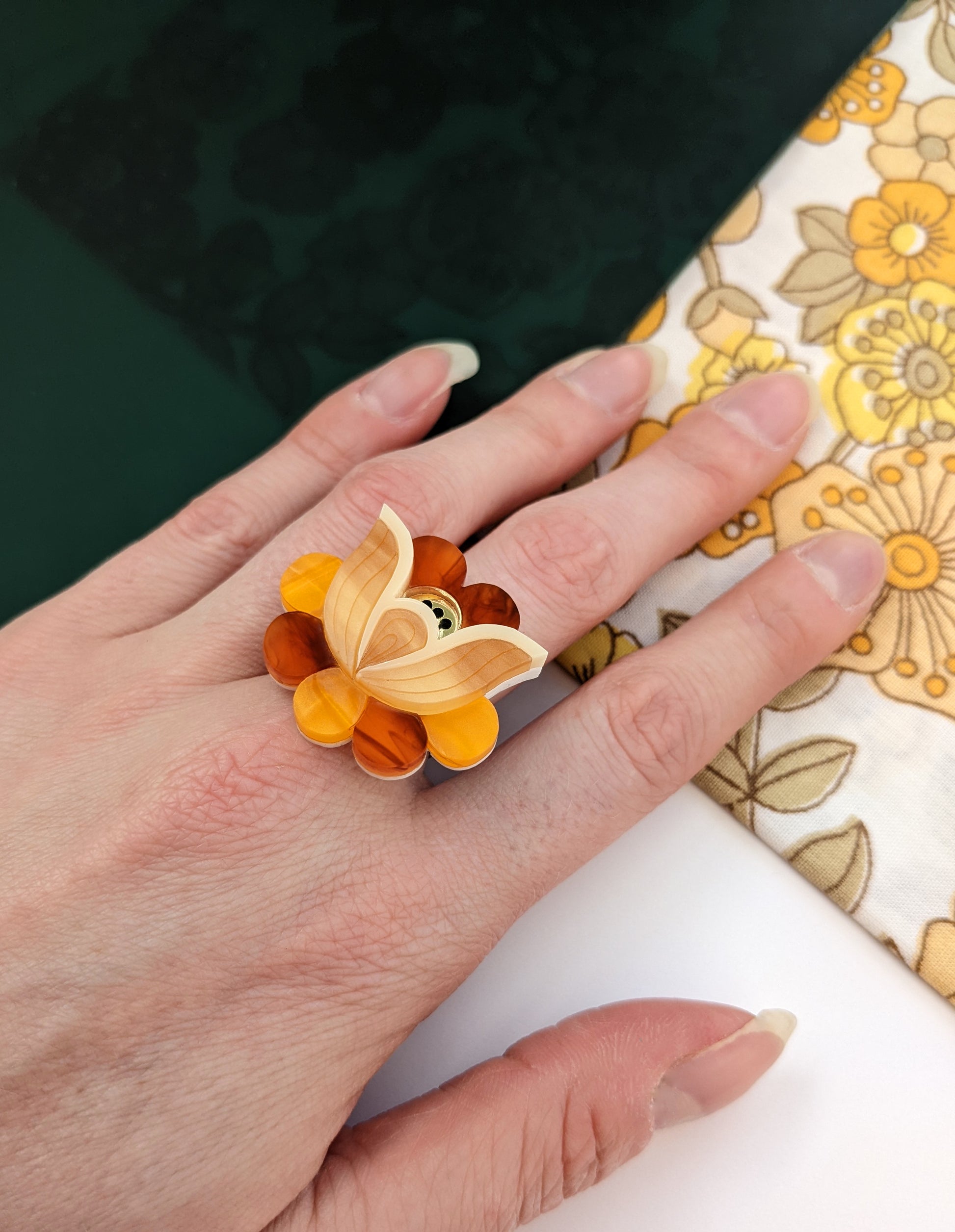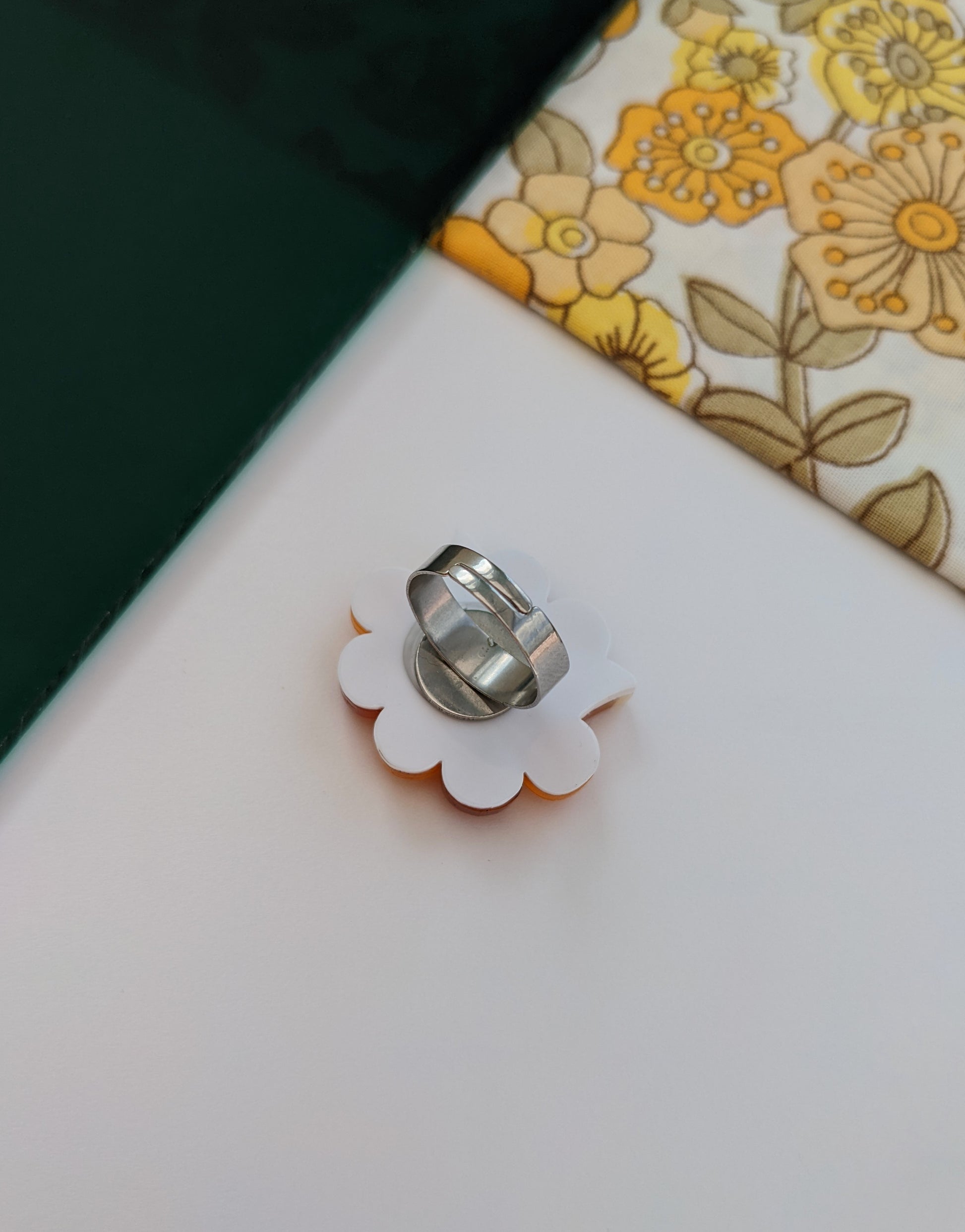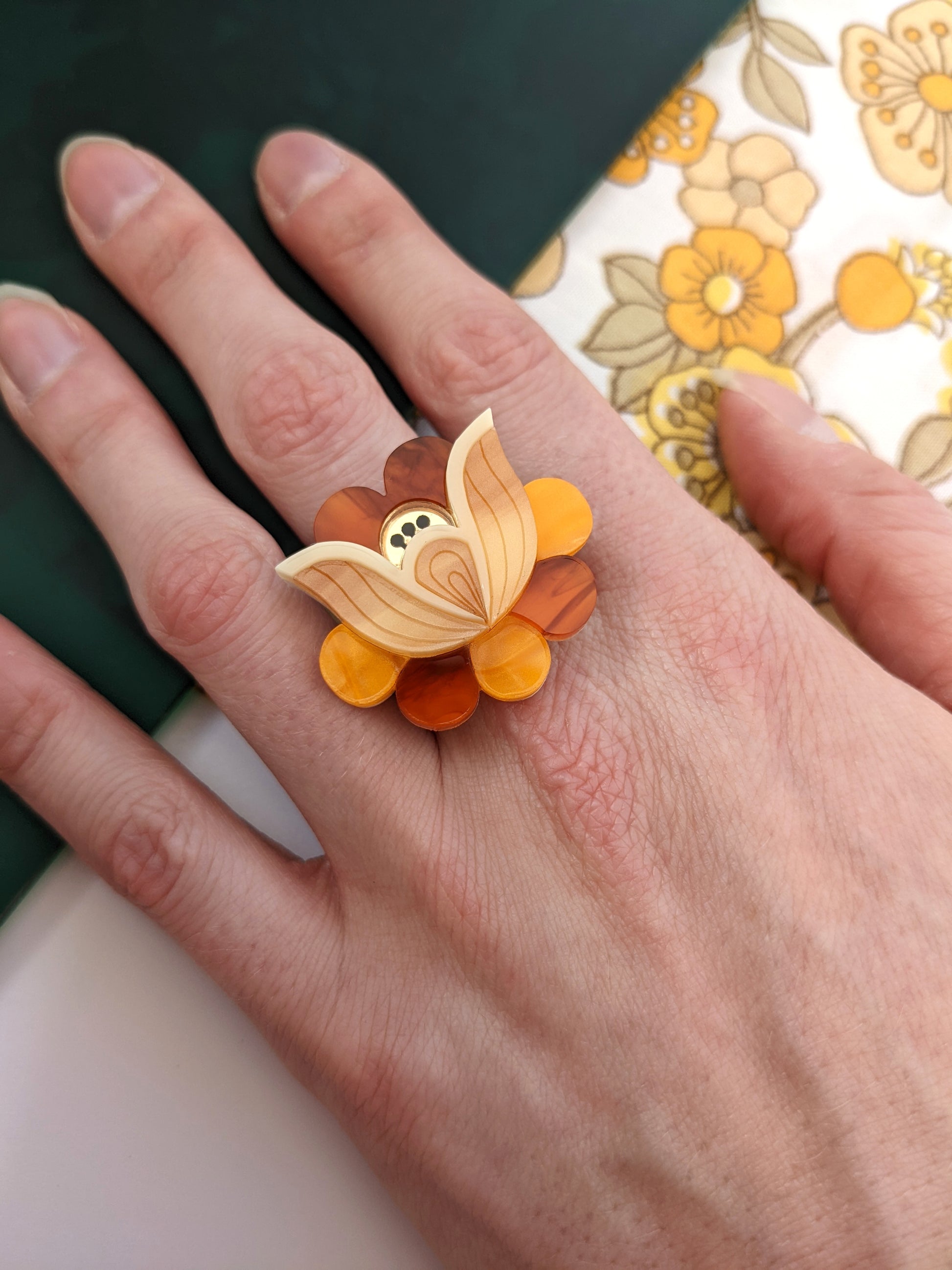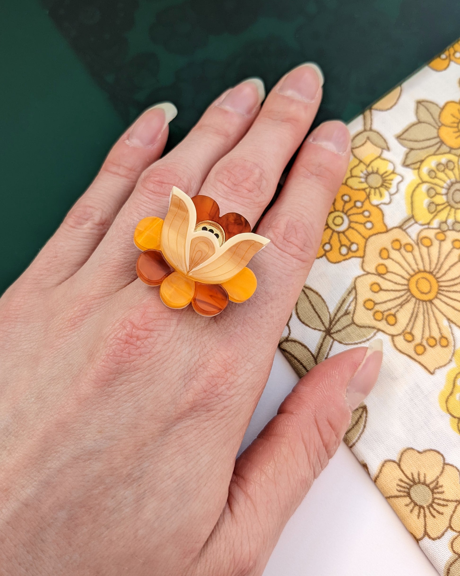 Inspired by a mixture of folk art mixed with my love of the 70s decade, this folk floral ring is made from 13 individually laser cut pieces. It's quite a statement looking piece that has a strong retro vibe and it coordinate nicely with the other pieces from this collection. The ring measures approximately h2.7cm x w3.1cm and feature a mixture of hand mixed pearl marble, faux tortoiseshell, plain Perspex and mirror acrylic. The ring shank is adjustable accommodating UK size M - UK size Q. US 6 - 8 1/2. EU 52 - 58 (though my middle finger is about an L and I find it comfortable on there). All work is solely done by Rock The Panda designer and maker Ruth Anna Moore in Sheffield, United Kingdom.