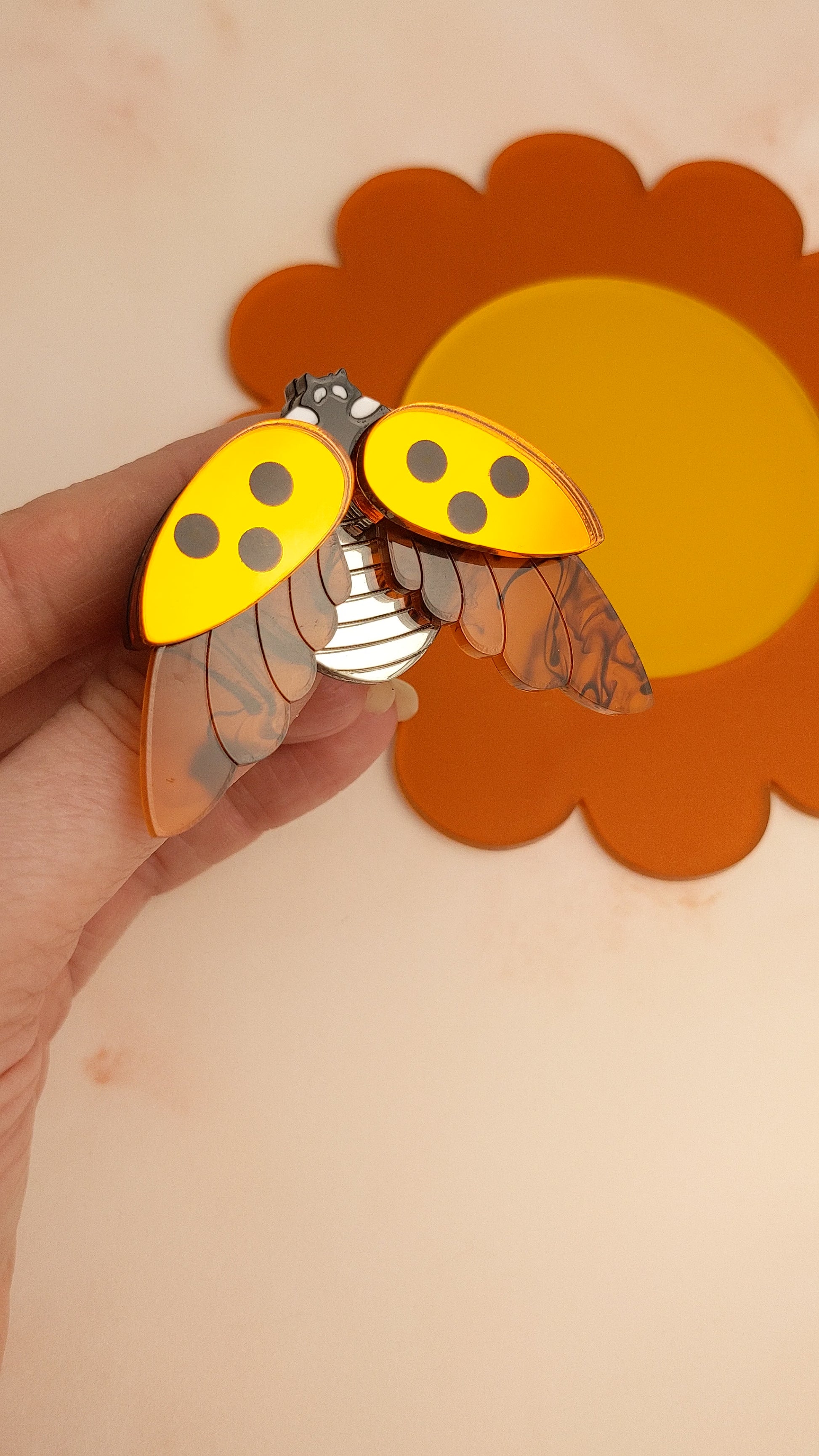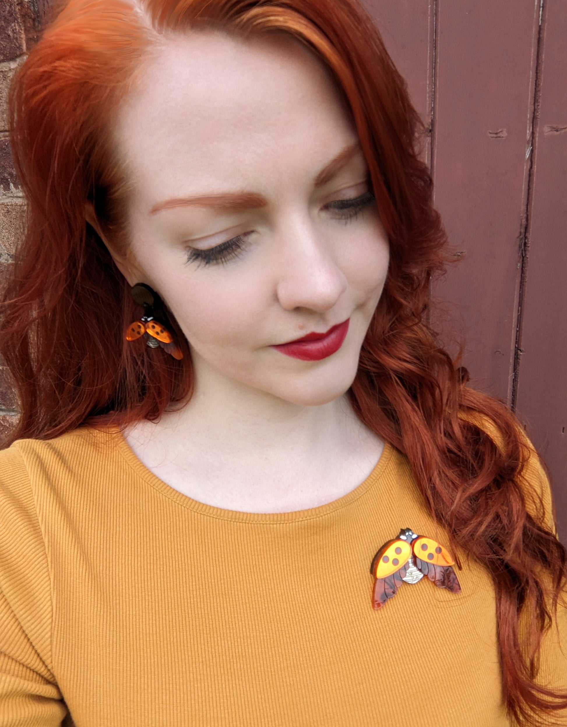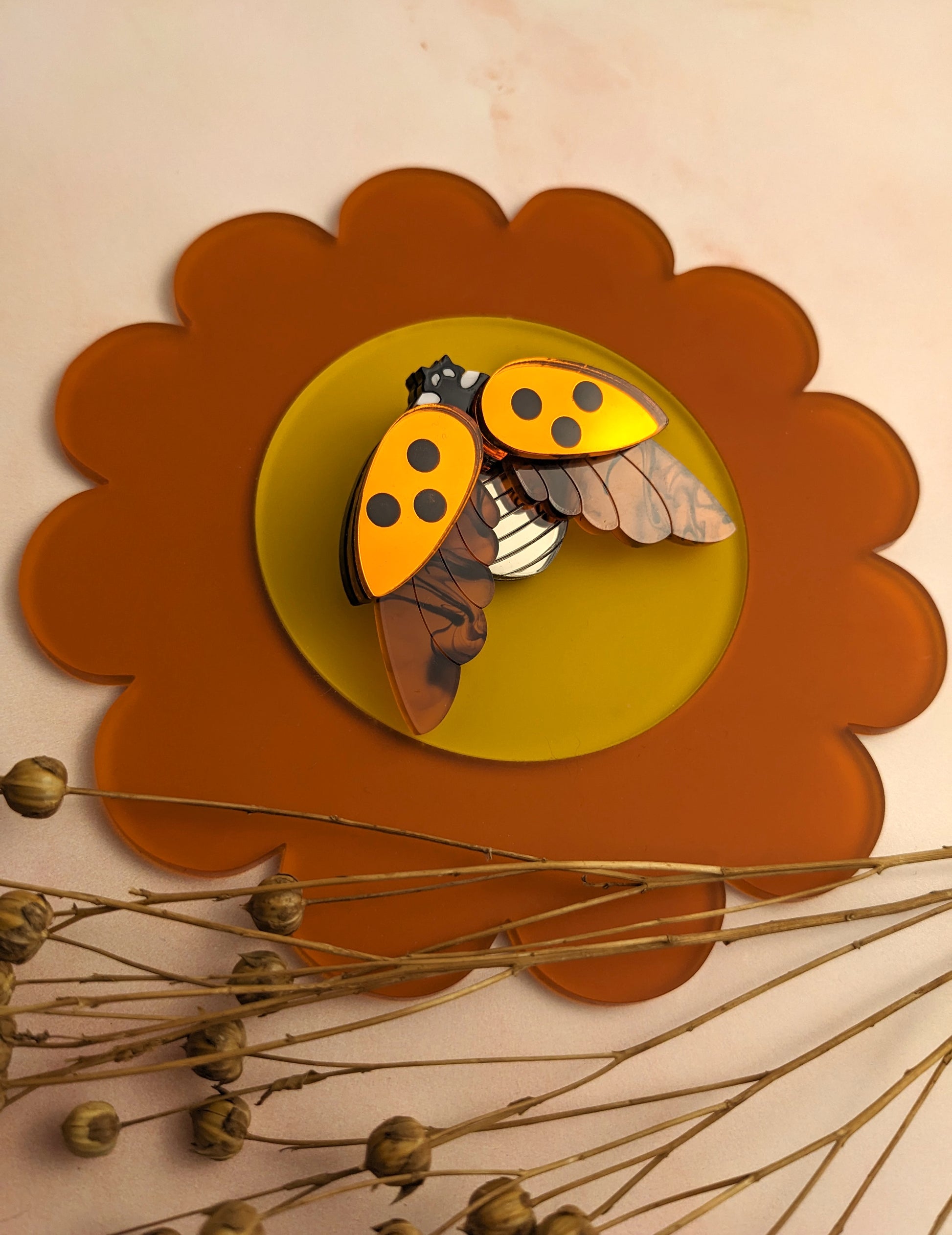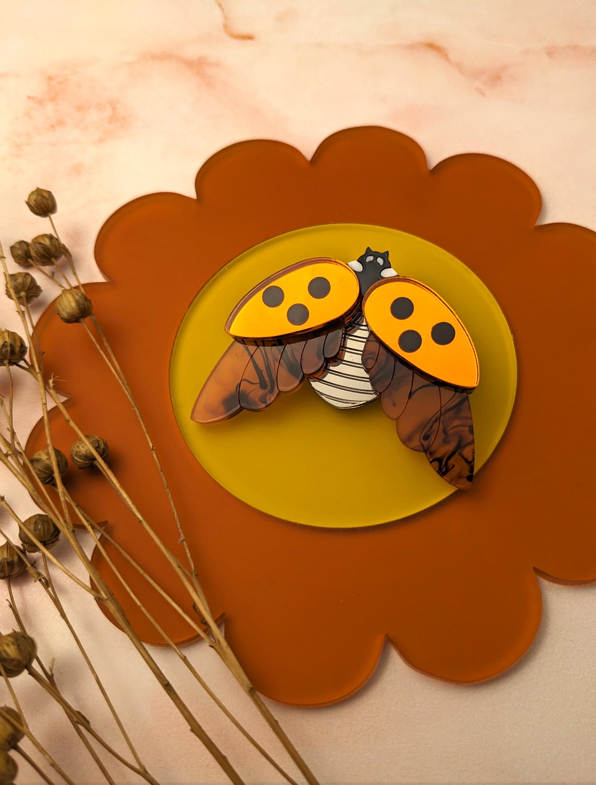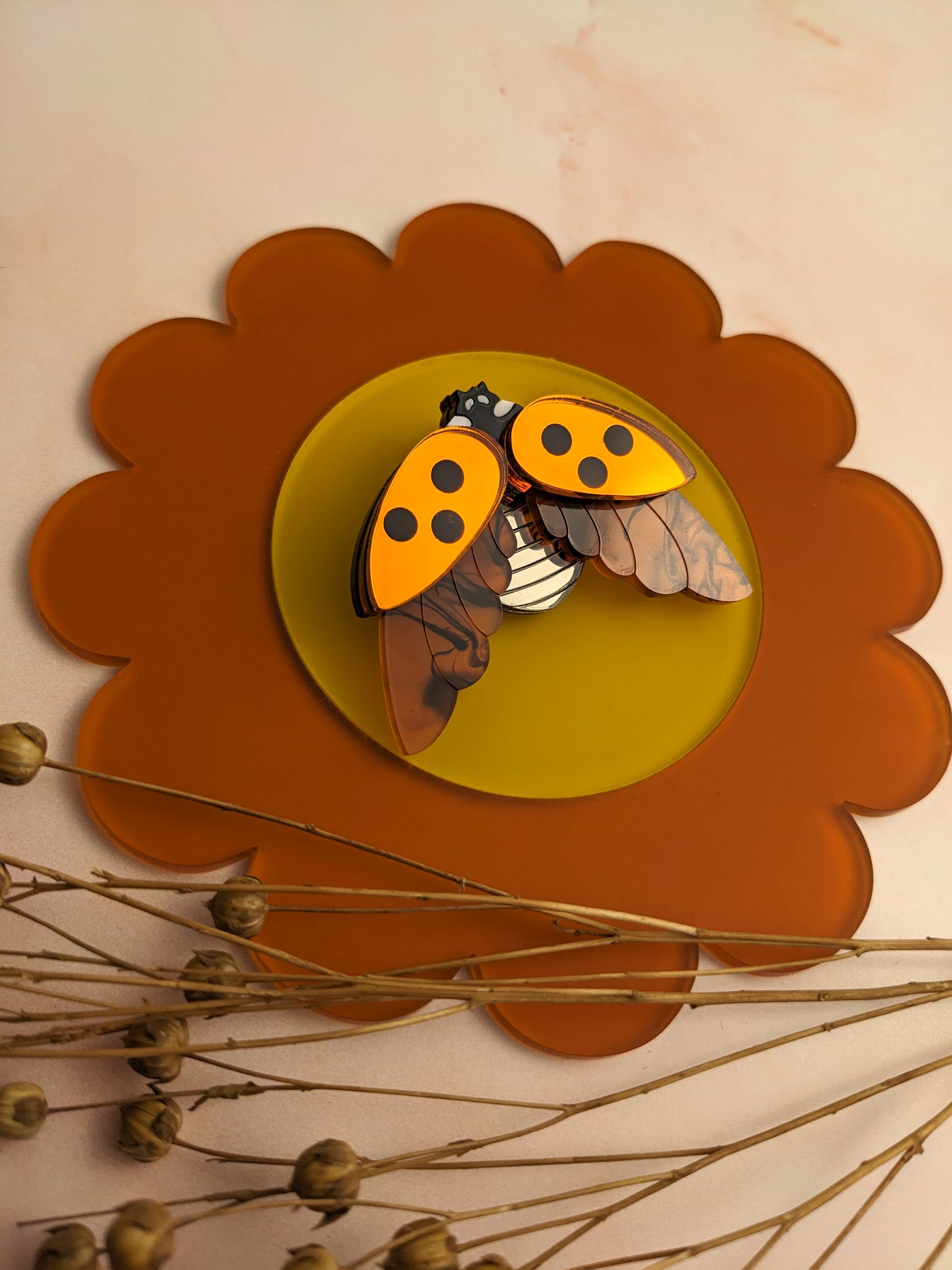 This ladybird brooch was inspired by my childhood love of ladybirds. I focused on the different wing stages when I designed the statement necklace and felt this was the best shape for the brooch. Each brooch is quite chunky but is backed with 1mm black acrylic so is easy to wear. I thought long and hard about the layering of these and remembered that you can get 4mm mirror acrylic so it was perfect for the layering of this piece to make them appear layered like real ladybirds with the order of the wings. The outer coloured wings are made from orange mirror acrylic and the spots are engraved and painted underneath. The transparent wings have a likeness to real ladybird wings and are made from an ink/smoke like tortoishell acrylic, and the bodies are a greyish bronze mirror acrylic.