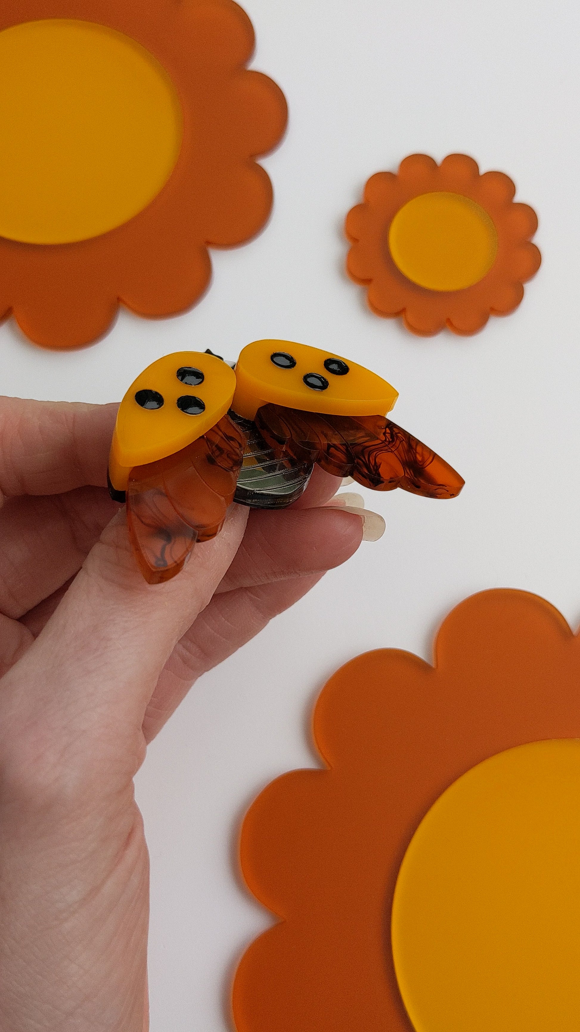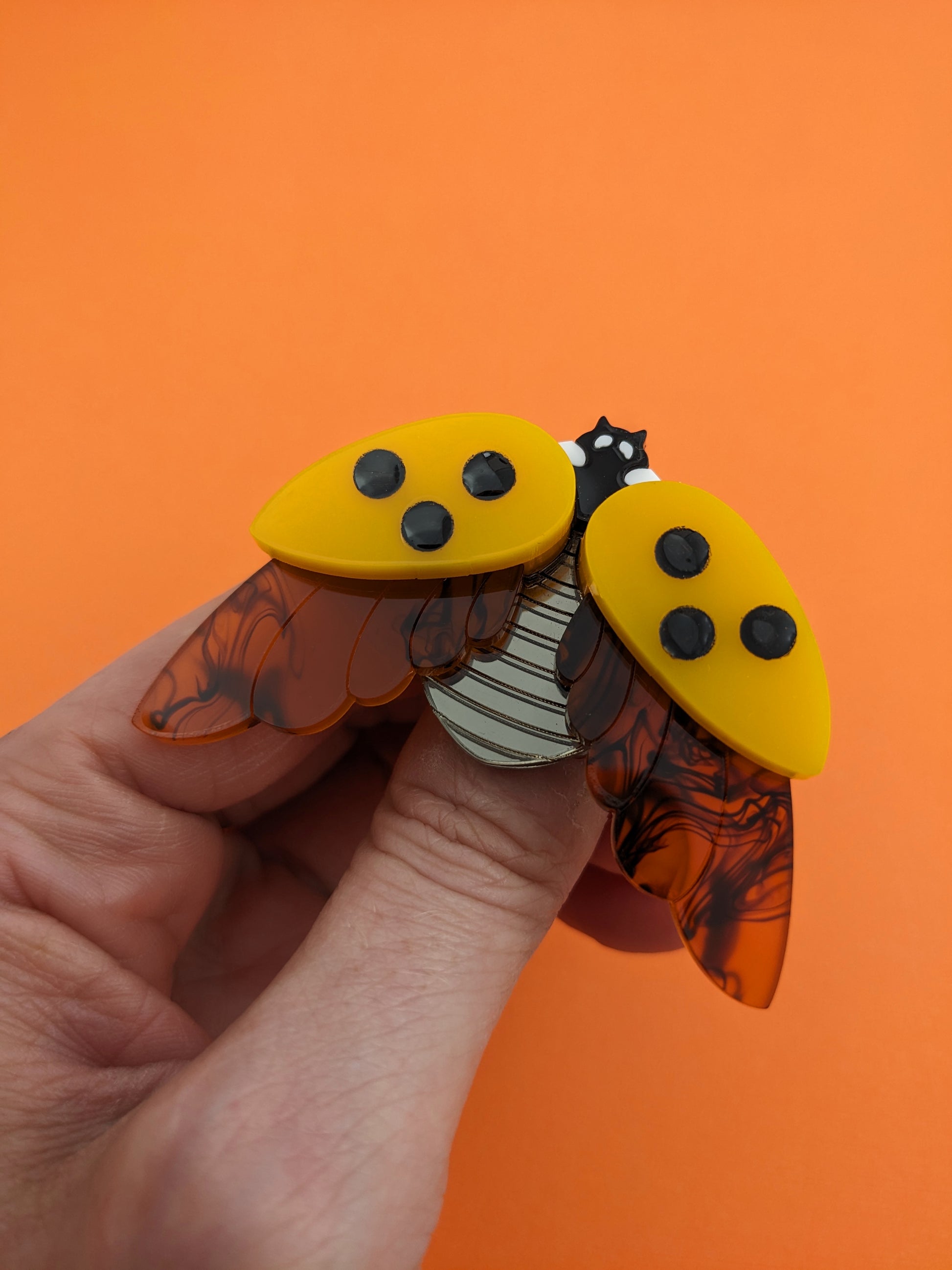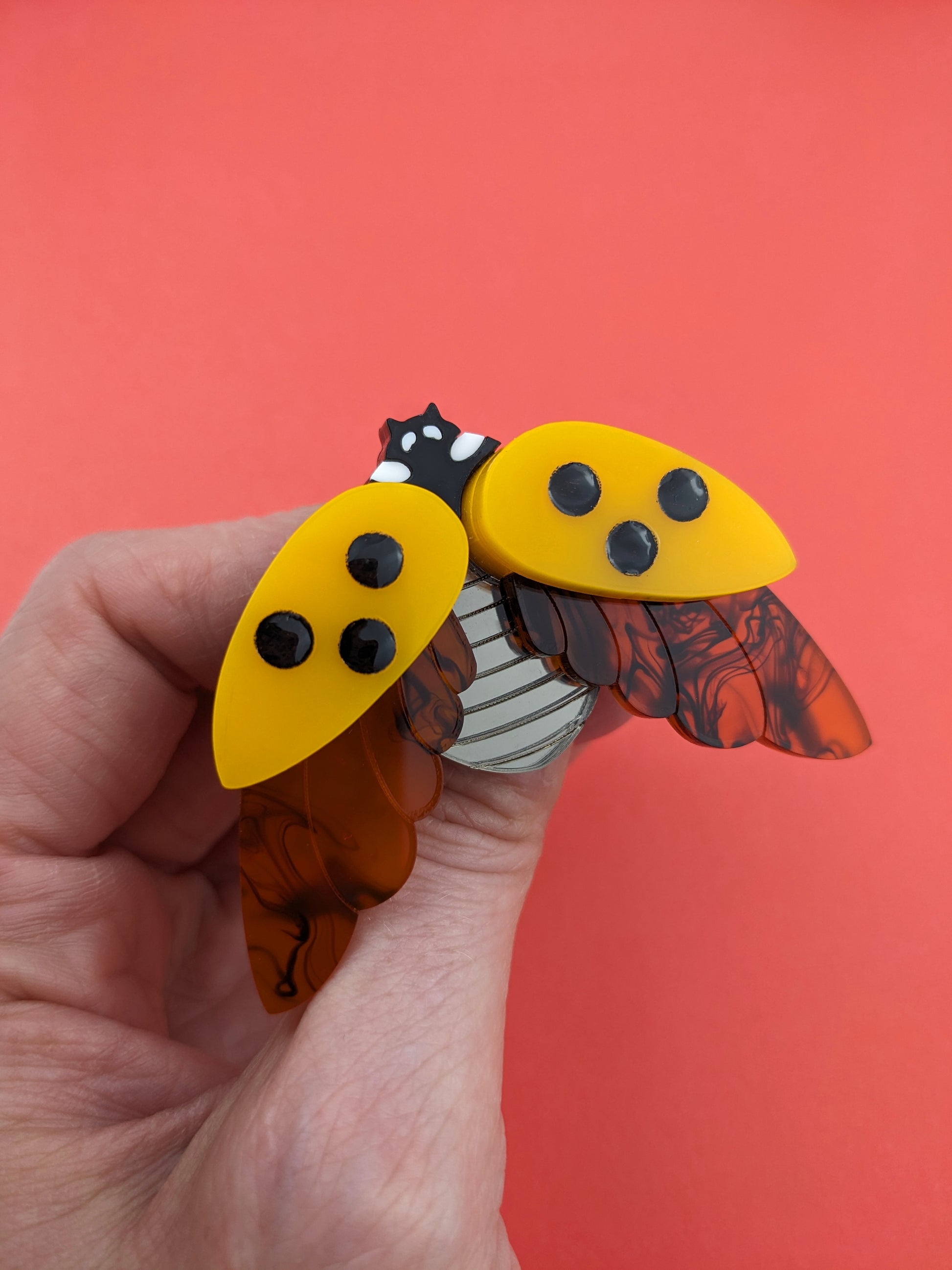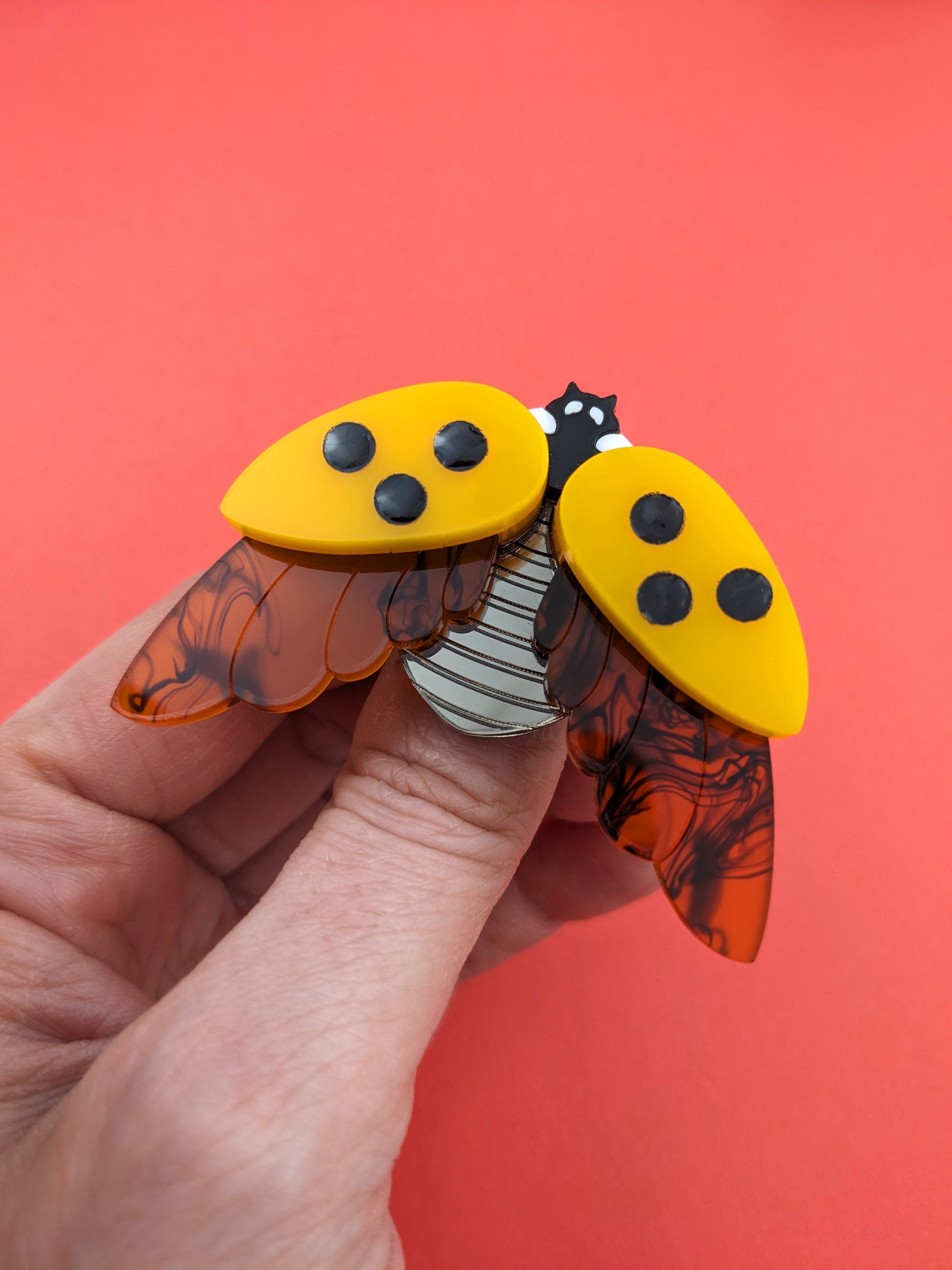 This ladybird brooch was inspired by my childhood love of ladybirds. I focused on the different wing stages when I designed the statement necklace and felt this was the best shape for the brooch. Each brooch is quite chunky but is backed with 1mm black acrylic so is easy to wear. I thought long and hard about the layering of these and remembered that you can get 5mm coloured acrylic so it was perfect for the layering of this piece to make them appear layered like real ladybirds with the order of the wings. The outer coloured wings are made from plain yellow acrylic and the spots are engraved and painted, and have a layer on uv resin over the top. This is done by hand so they will vary a little. The transparent wings have a likeness to real ladybird wings and are made from an ink/smoke like tortoishell acrylic, and the bodies are a greyish bronze mirror acrylic. If you prefer the plain orange or the red from the statement necklace, you can request these via email or the order notes.