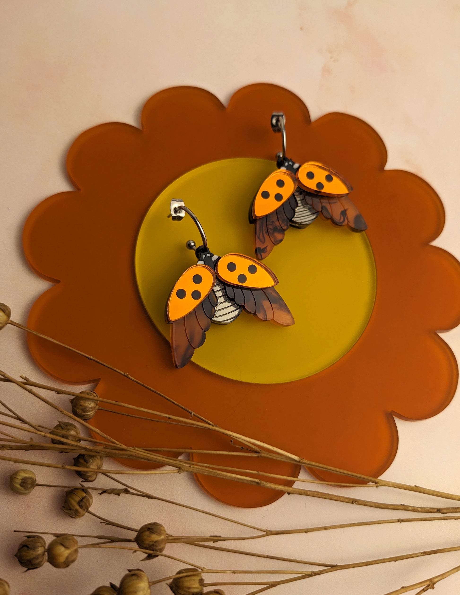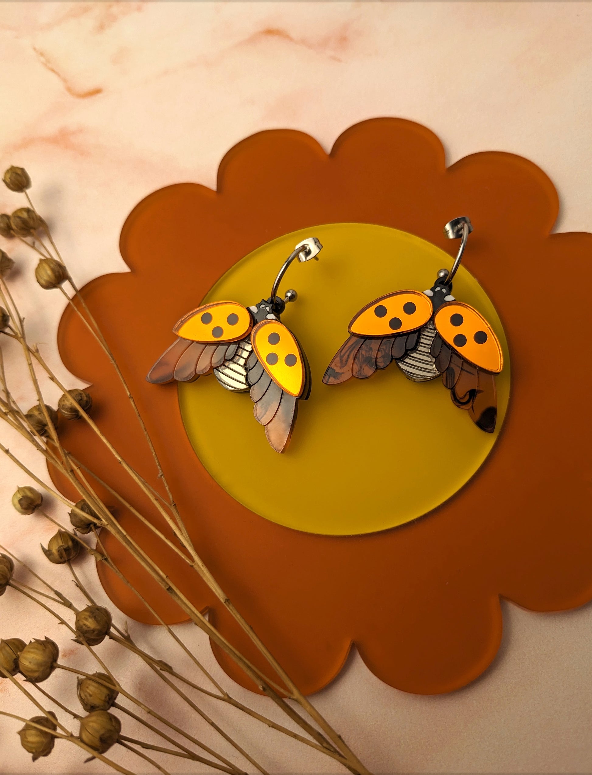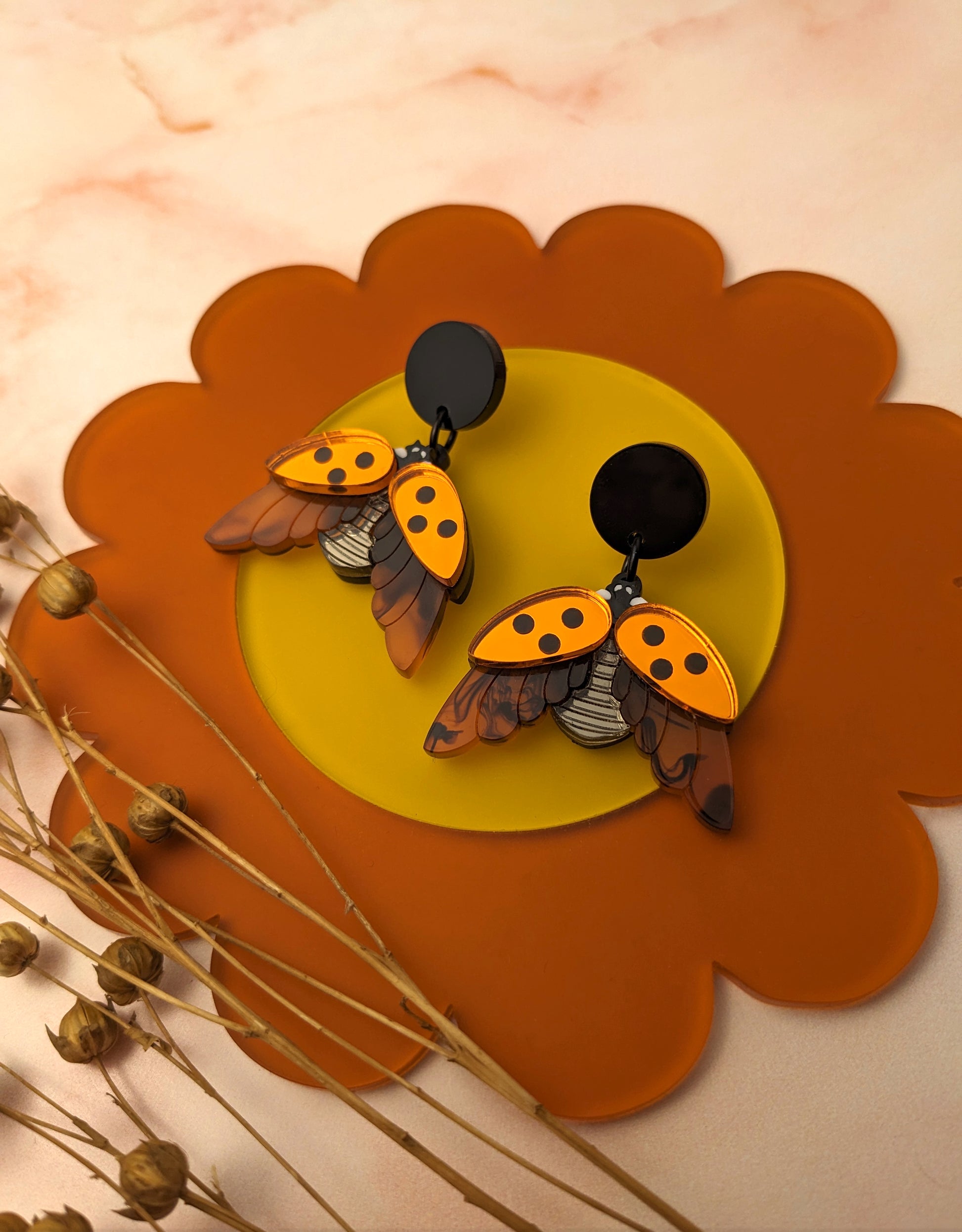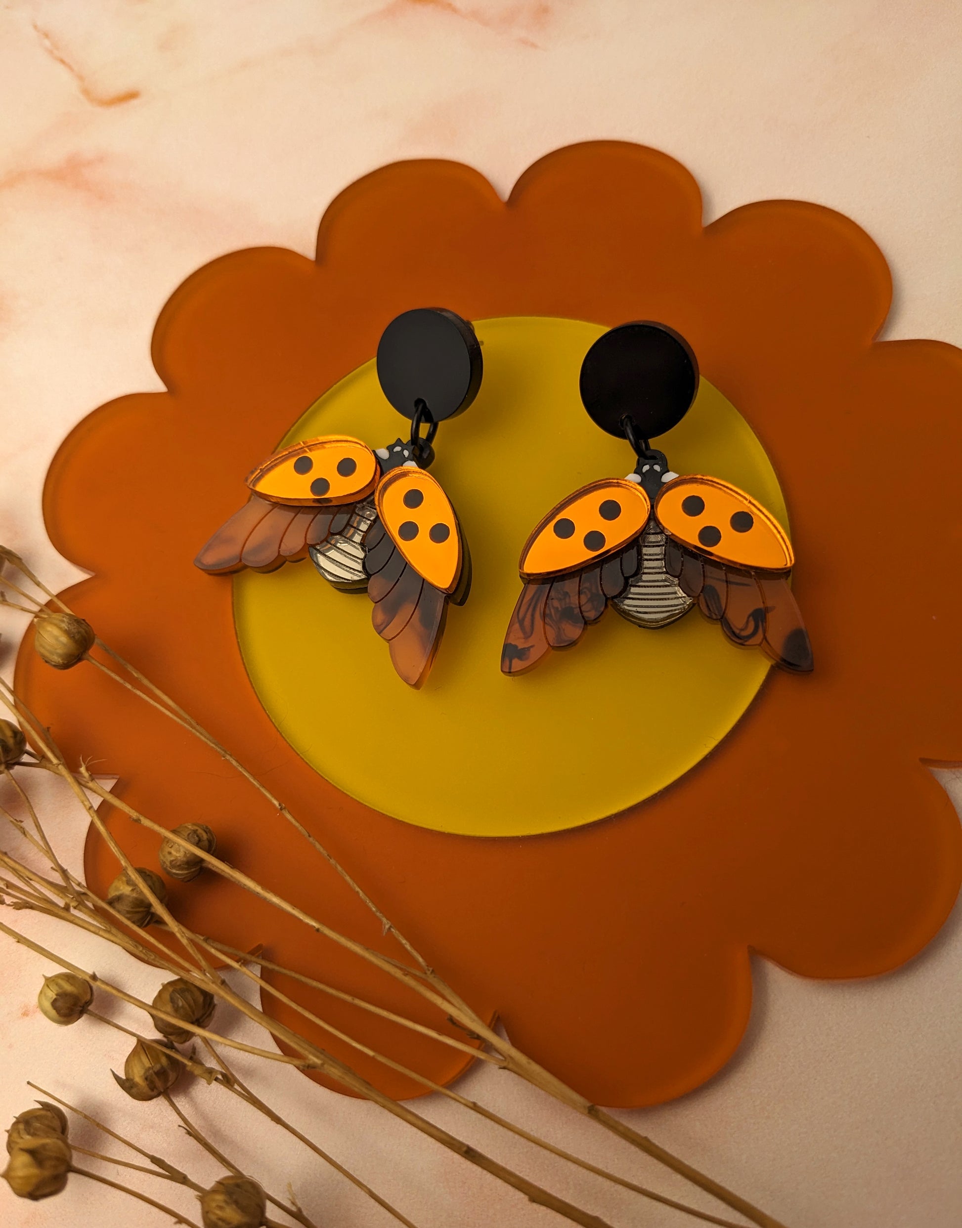 These ladybird earrings were inspired by my childhood love of ladybirds. I focused on the different wing stages when I designed the statement necklace and felt this was the best shape for the dangle earrings. Each ladybird is backed with 2mm black acrylic so they're easy to wear. The outer wings are orange mirror acrylic and have engraved and painted spots which are sealed under the acrylic. They then have tortoiseshell acrylic for the transparent wings which I feel is a good likeness, and the bodies are a greyish bronze mirror acrylic.