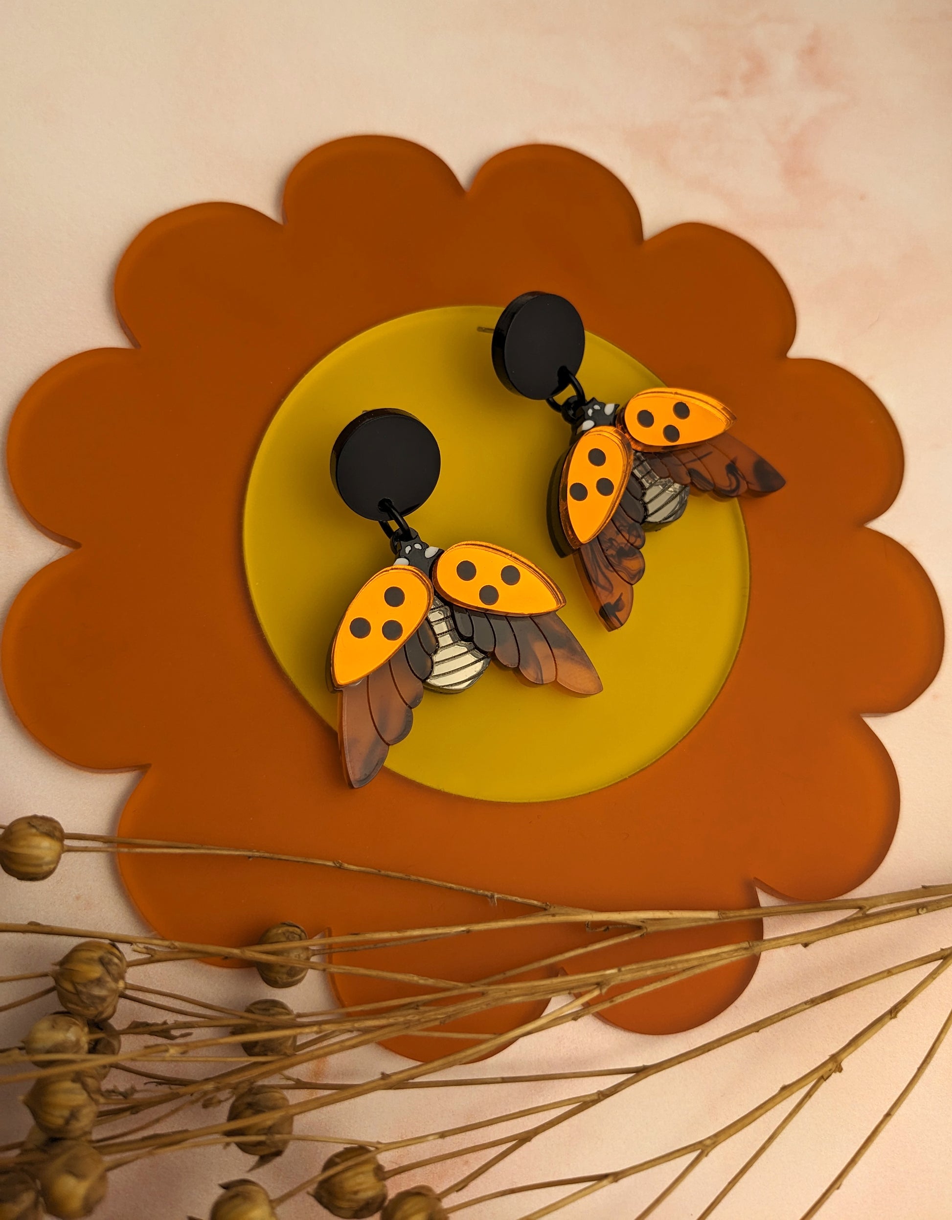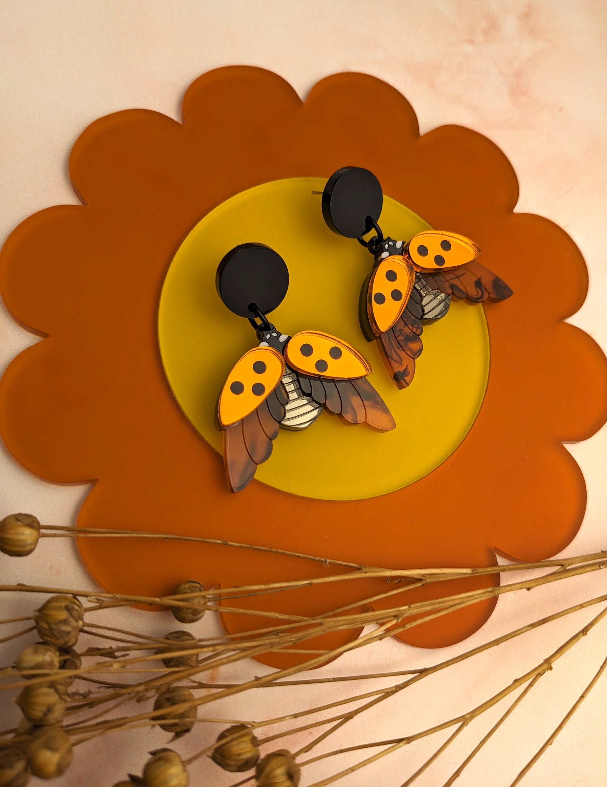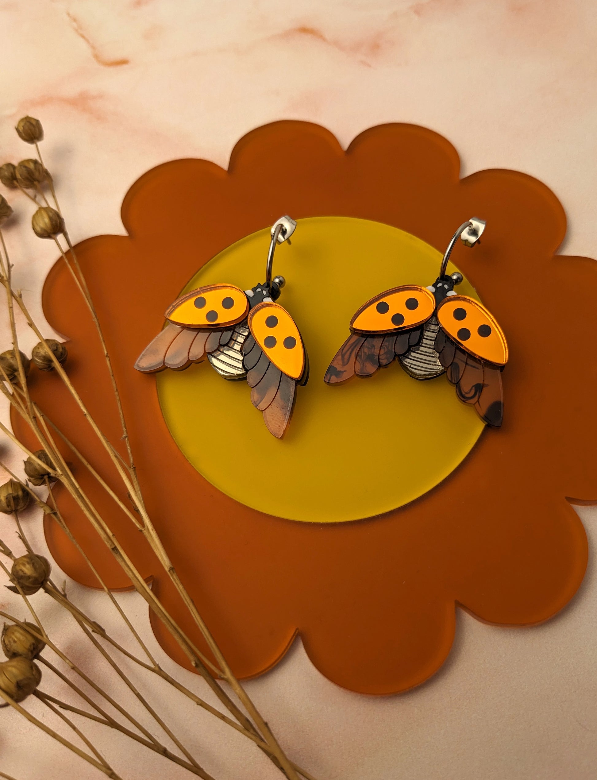 These ladybird earrings were inspired by my childhood love of ladybirds. I focused on the different wing stages when I designed the statement necklace and felt this was the best shape for the dangle earrings. Each ladybird is backed with 2mm black acrylic so they're easy to wear. The outer wings are orange mirror acrylic and have engraved and painted spots which are sealed under the acrylic. They then have tortoiseshell acrylic for the transparent wings which I feel is a good likeness, and the bodies are a greyish bronze mirror acrylic.