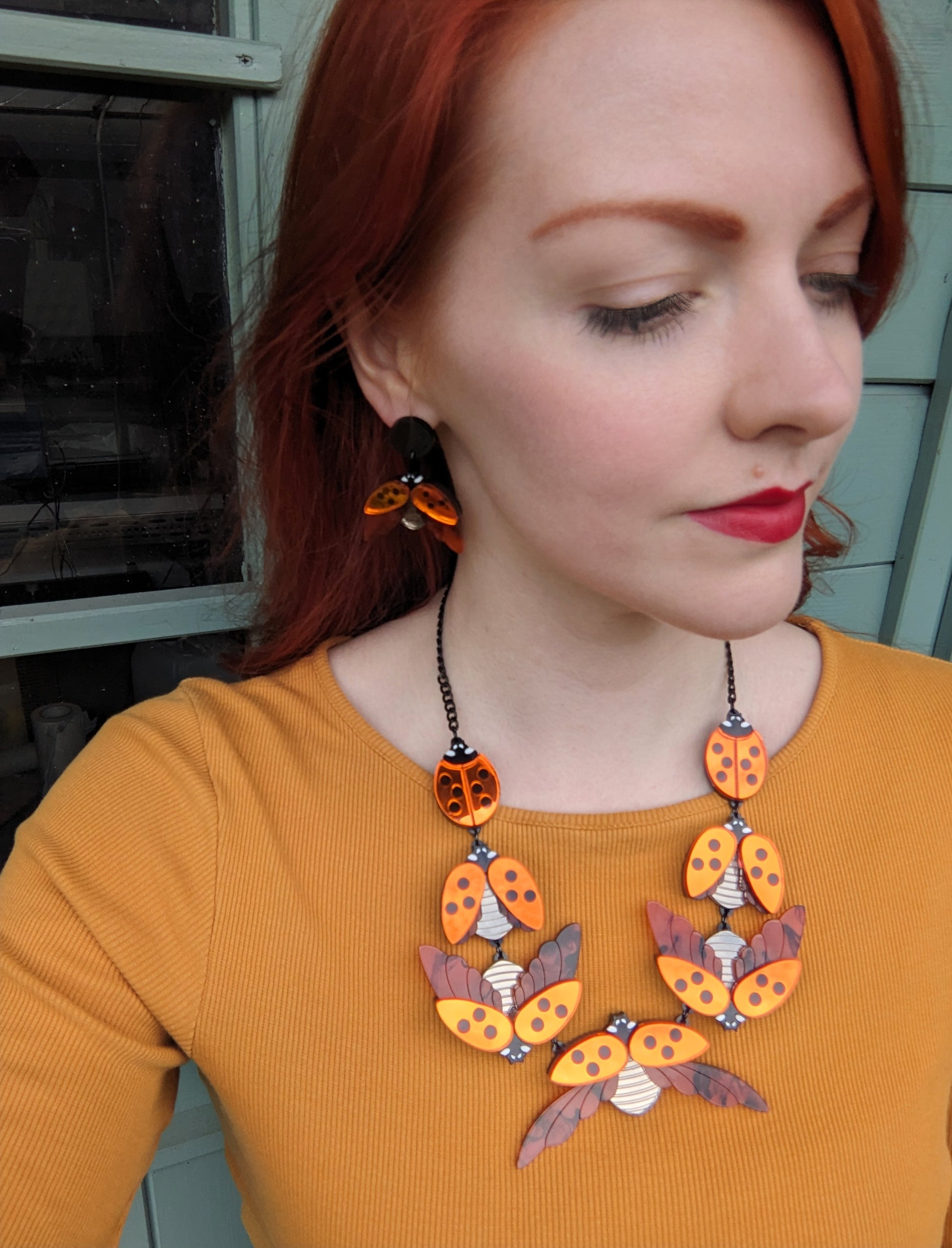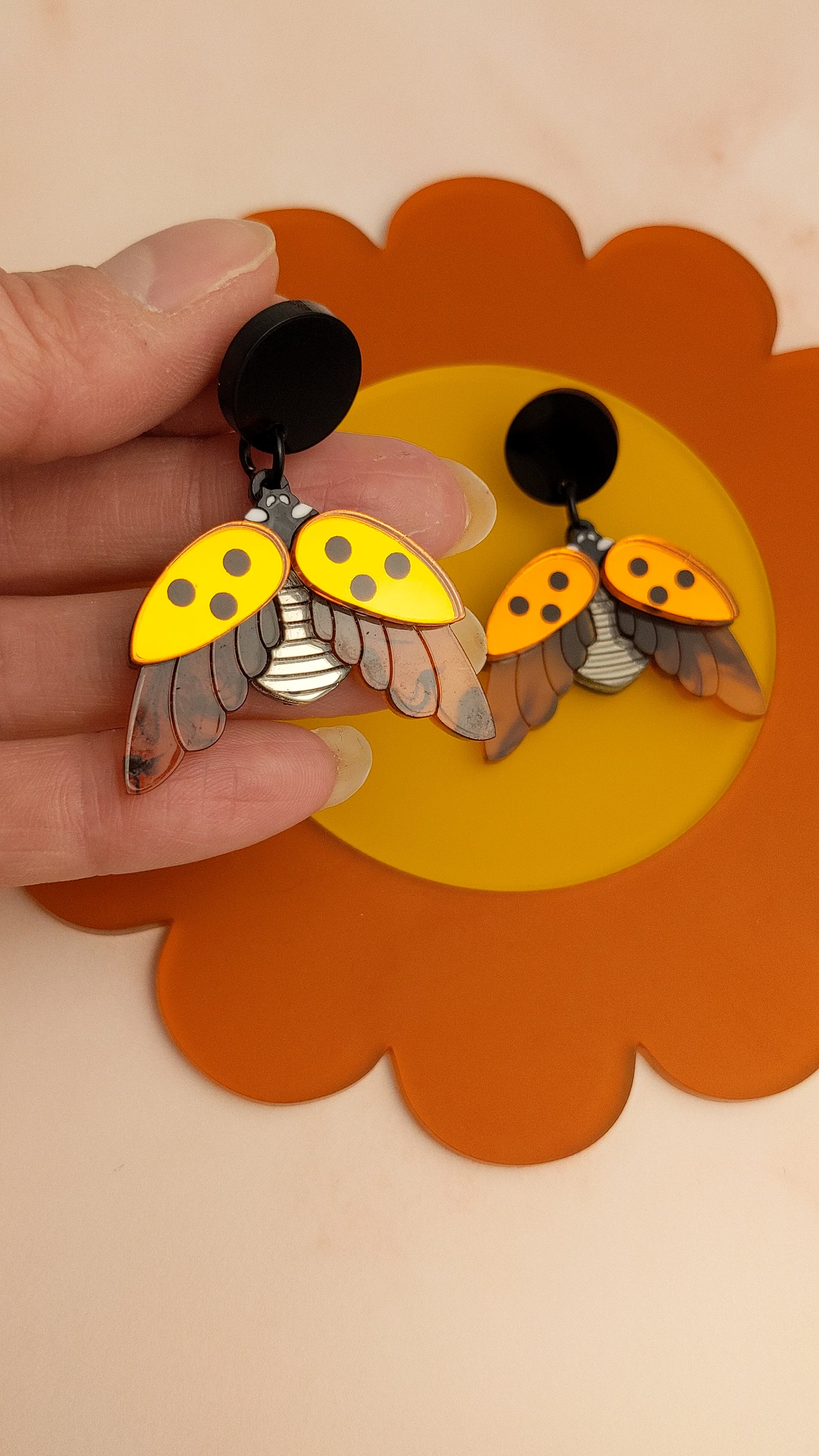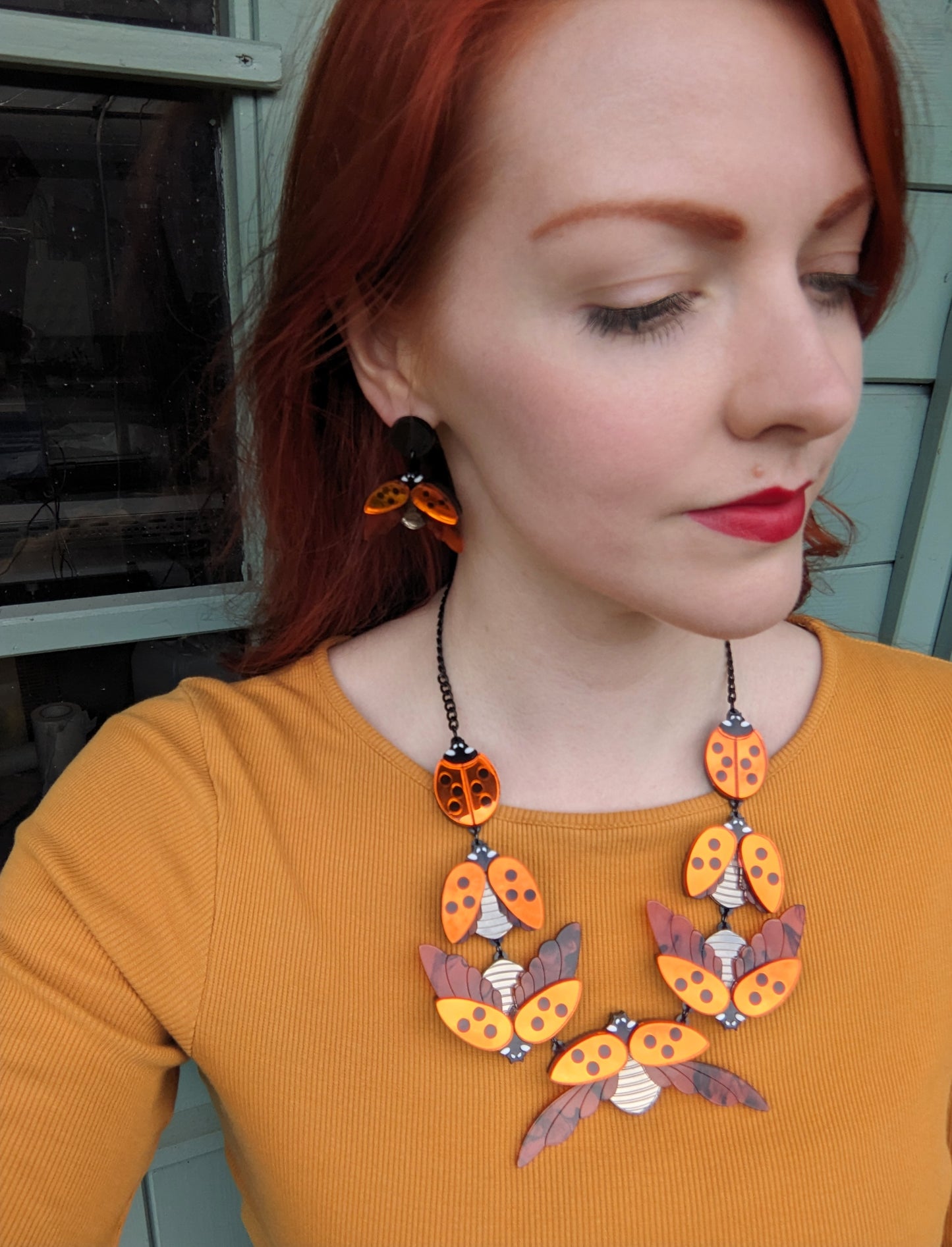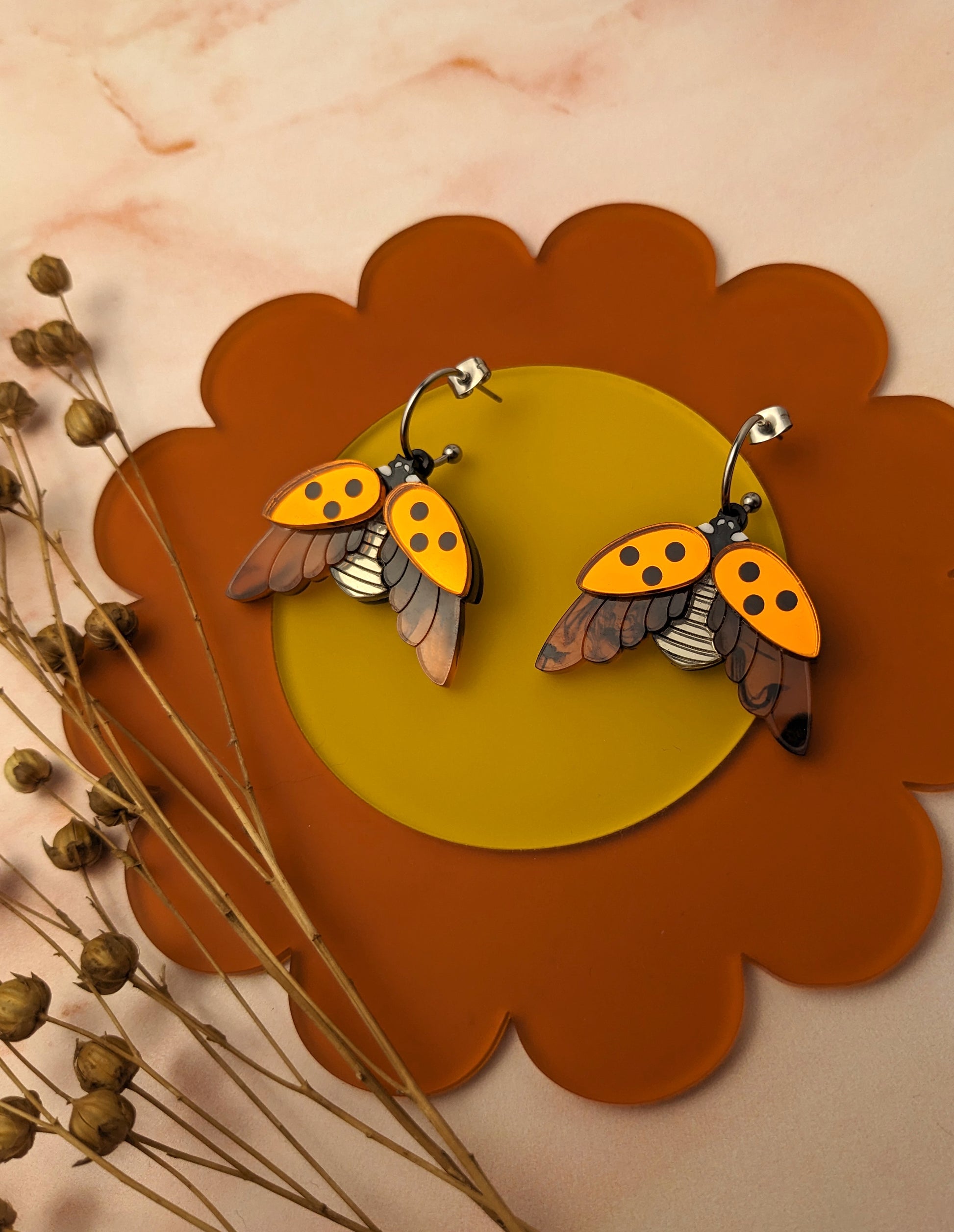 These ladybird earrings were inspired by my childhood love of ladybirds. I focused on the different wing stages when I designed the statement necklace and felt this was the best shape for the dangle earrings. Each ladybird is backed with 2mm black acrylic so they're easy to wear. The outer wings are orange mirror acrylic and have engraved and painted spots which are sealed under the acrylic. They then have tortoiseshell acrylic for the transparent wings which I feel is a good likeness, and the bodies are a greyish bronze mirror acrylic.