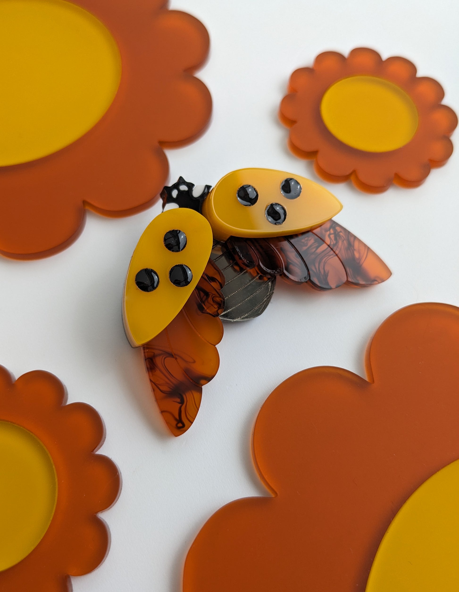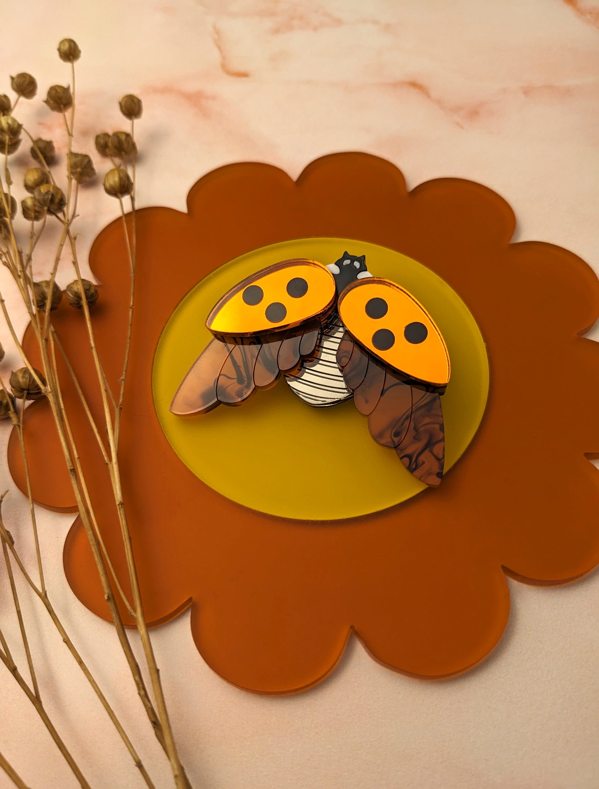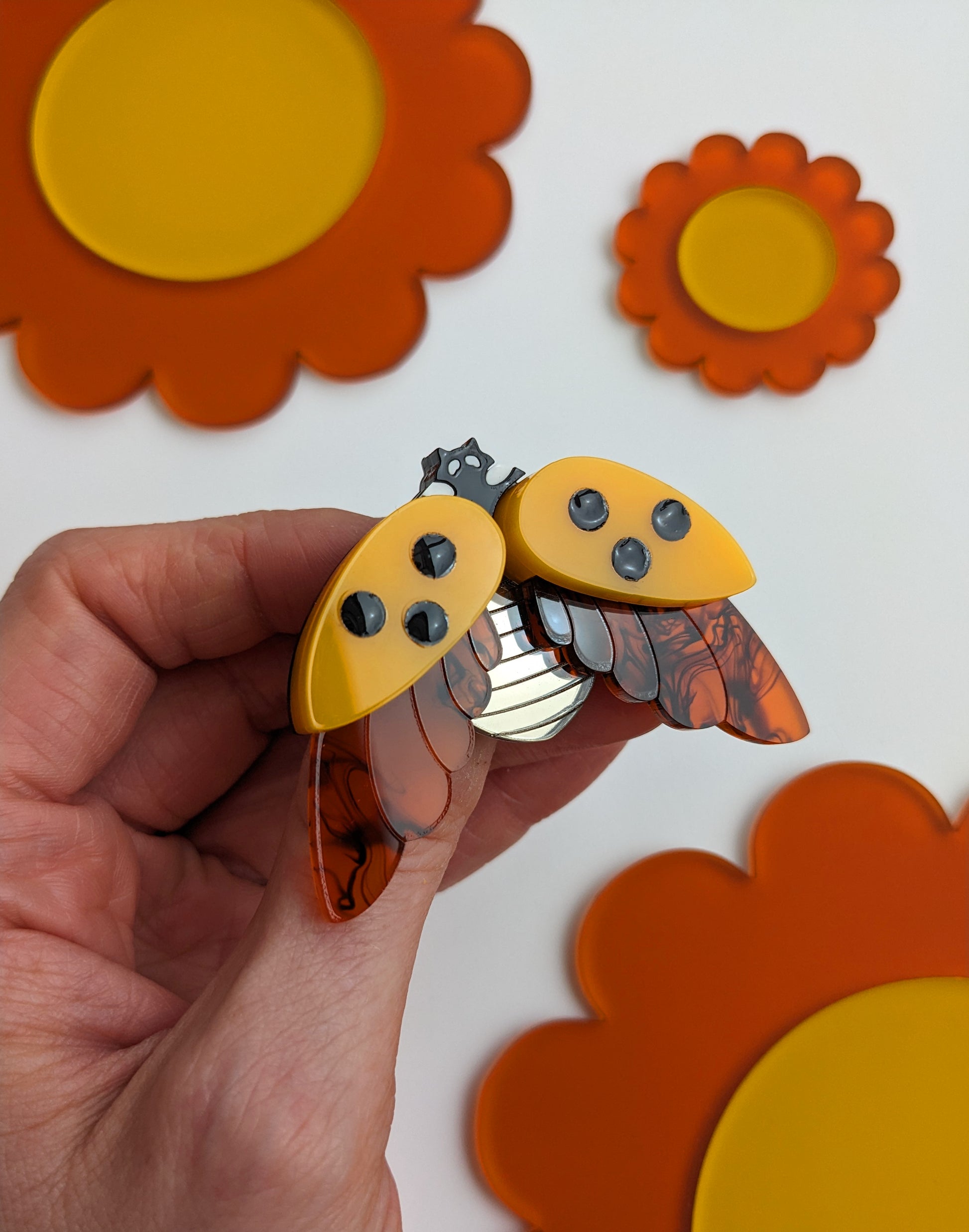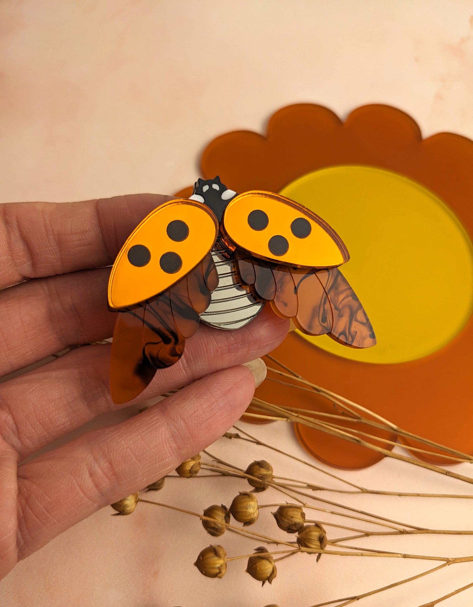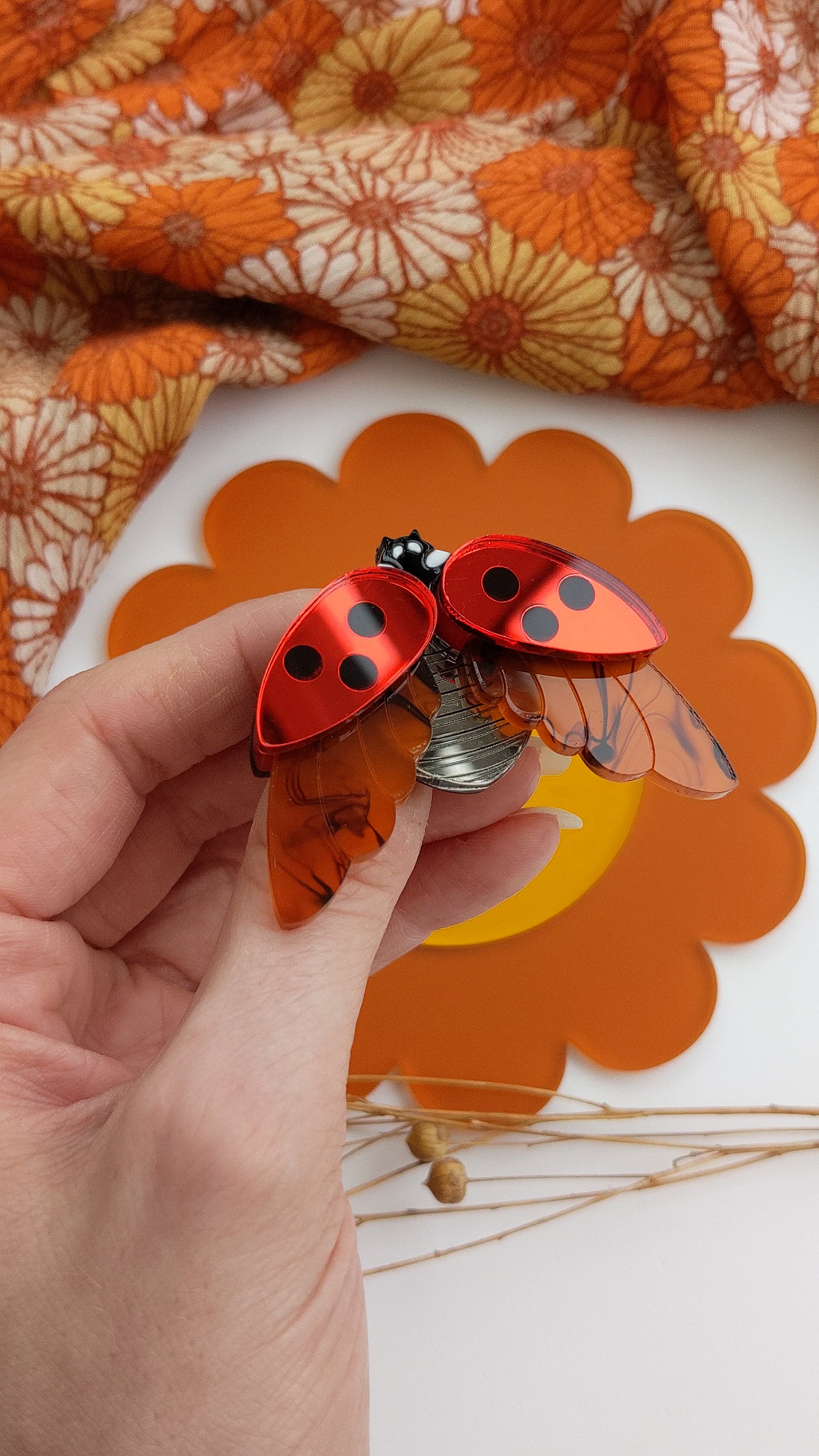 This ladybird brooch was inspired by my childhood love of ladybirds. I focused on the different wing stages when I designed the statement necklace and felt this was the best shape for the brooch. Each brooch is quite chunky but is backed with 2mm black acrylic so is easy to wear. I thought long and hard about the layering of these and realised that you can get thicker acrylic so it was perfect for the layering of this piece to make them appear layered like real ladybirds with the order of the wings. Choose from three options from the menu for the outer coloured wings. Red and orange mirror acrylic will have spots that are engraved and painted underneath whilst the yellow will have them engraved and painted on the outside with uv resin over the top. This is done by hand so they will vary a little. The transparent wings have a likeness to real ladybird wings and are made from an ink/smoke like tortoishell acrylic, and the bodies are a greyish bronze mirror acrylic. The Brooch photos are there as examples of the colours but I've only made up the red mirror so far as an actual pendant.