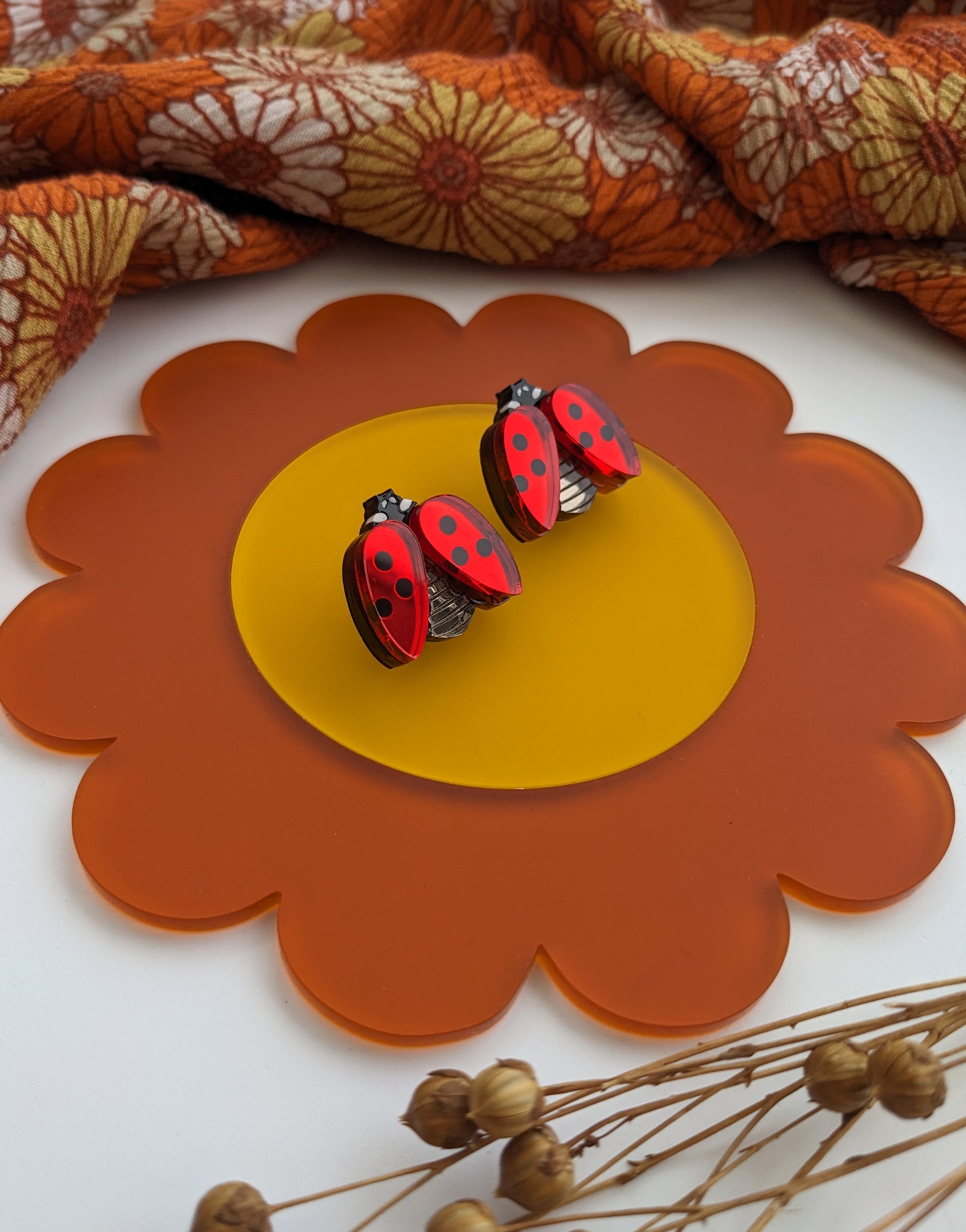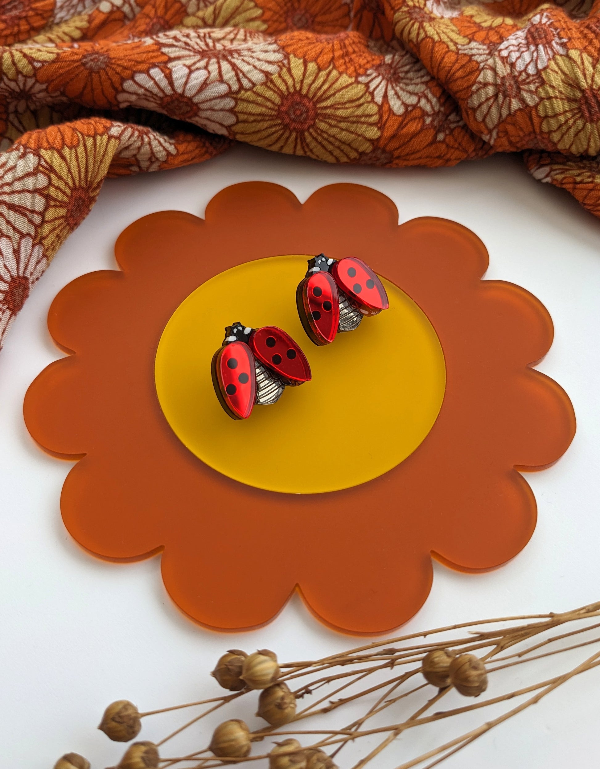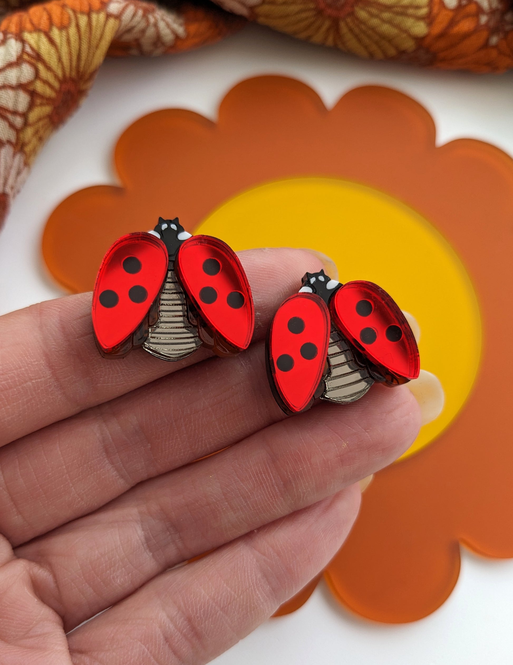 These ladybird studs were inspired by my childhood love of ladybirds. I focused on the different wing stages when I designed the statement necklace and felt this was the best shape for the studs. Each ladybird is backed with 1mm black painted and varnished plywood they're easy to wear. The outer wings are mirror red acrylic and have engraved and painted spots sealed neatly underneath. They then have a little bit of tortoiseshell acrylic peeking out for the transparent wings and the bodies are a greyish bronze mirror acrylic.
