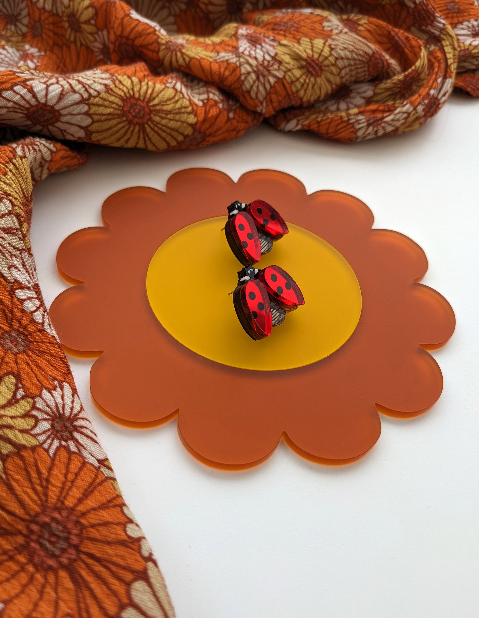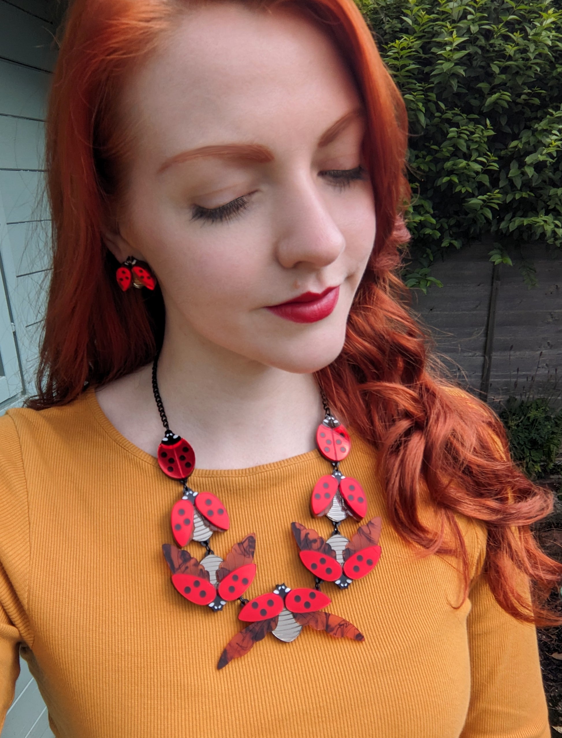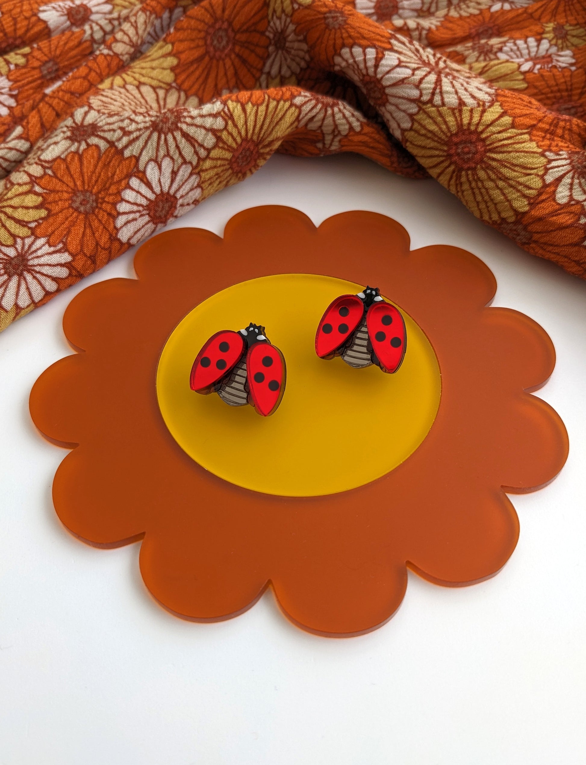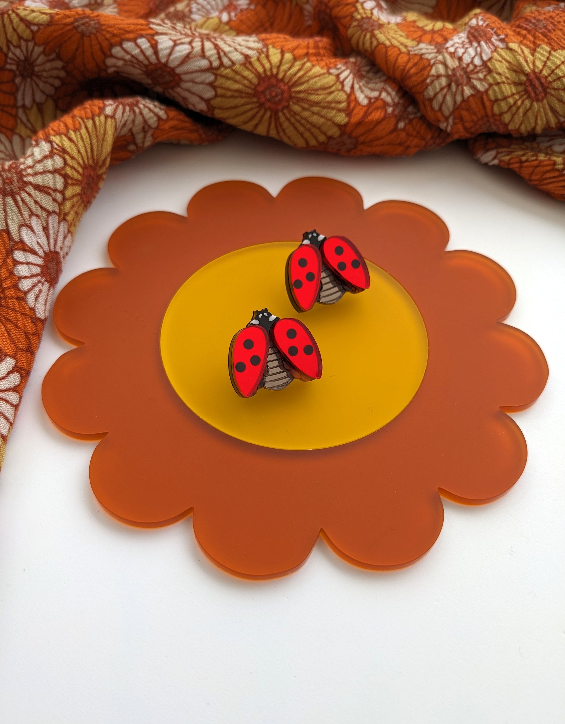These ladybird studs were inspired by my childhood love of ladybirds. I focused on the different wing stages when I designed the statement necklace and felt this was the best shape for the studs. Each ladybird is backed with 1mm black painted and varnished plywood they're easy to wear. The outer wings are mirror red acrylic and have engraved and painted spots sealed neatly underneath. They then have a little bit of tortoiseshell acrylic peeking out for the transparent wings and the bodies are a greyish bronze mirror acrylic.