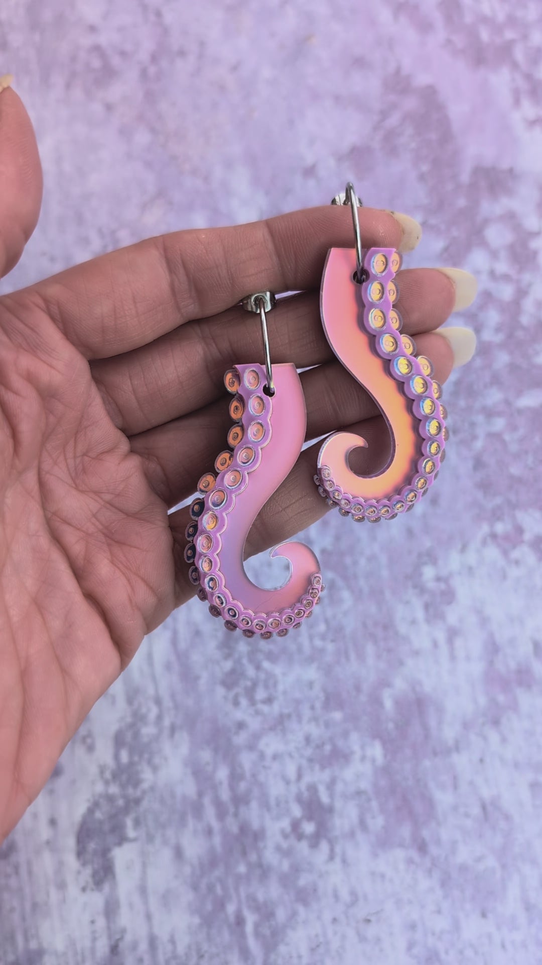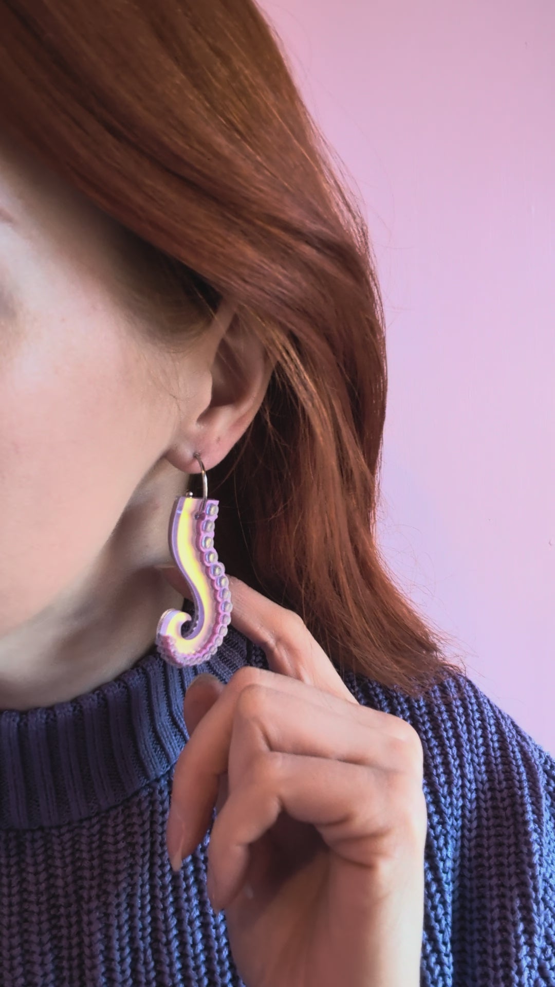These long tentacle earrings match the tentacle necklace perfectly and are the same size as the outer two tentacles, measuring in at approximately 5.4cm(h) x 2.7cm(w). Each tentacle consists of a striking frosted iridescent acrylic which has been customised/backed to create a more lilac toned opaque acrylic which shines through all the colours of a moody sunset (blue, purple pink, coral, orange and yellow) as it moves and shows differently in different lights. It's then accented with plain coral Perspex as well as a gloss iridescent acrylic which has also been backed - (purple). All hand assemble onto thin layers of clear acrylic to coordinate beautifully with the transparent edges of the iridescent acrylic. The clear backing, means that you can see the glue from the back but it looks so much better than opaque acrylic did from the front. Choose between gold plated and regular silver tone stainless steel hoops, Please also be careful not to scratch the underneath of the exposed iridescent acrylic backing underneath on the sucker parts as like the backing on mirrored acrylic, rough handling can cause it to scratch off. It doesn't touch any surfaces when they're laid flat though so it should be okay, especially if stored on the foam pad in the box they will arrive in. The inserts in the sucker sections are glued securely and will be double checked before shipping but obviously if they're prodded roughly, they may come loose so please handle carefully.