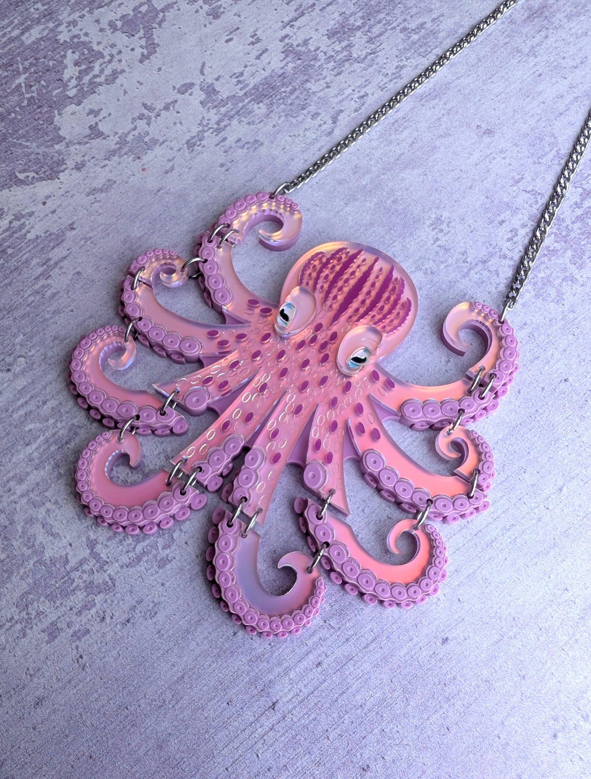 I made this medium sized octopus piece for those on a smaller budget that like articulated pieces but may not be able to afford the original statement size version. The main body consists of a striking frosted iridescent acrylic which has been customised/backed to create a more lilac toned opaque acrylic which shines through all the colours of a sunset (blue, purple, pink, coral, orange and yellow) as it moves and shows differently in different lights. It's then accented with plain light purple Perspex, plain magenta acrylic and white toned iridescent acrylic eyes. All hand assemble onto a 3mm plain matching purple base. Due to the size, I wasn't able to use the gloss iridescent acrylic in this piece and I've also had to change the jump ring placement too so the tentacles had to be simplified into just engraved plain purple. That said, it is still a very striking piece which measures approximately 11.5cm(w) x 10.2cm(h) . The chain and findings are made from anti tarnish stainless steel so the jump rings won't need changing. Choose between gold plated and regular silver tone. I'm wearing the necklace on the shortest length in the photos and it measures approximately 37cm extending to 48cm. If you think you'll need extra length you can message me or leave me a note for a couple more inches of the main chain but I will say that the necklace can't really be worn any lower as I don't think it will sit right. Please note with this one that there may be slight variation in tone to the iridescent acrylic.