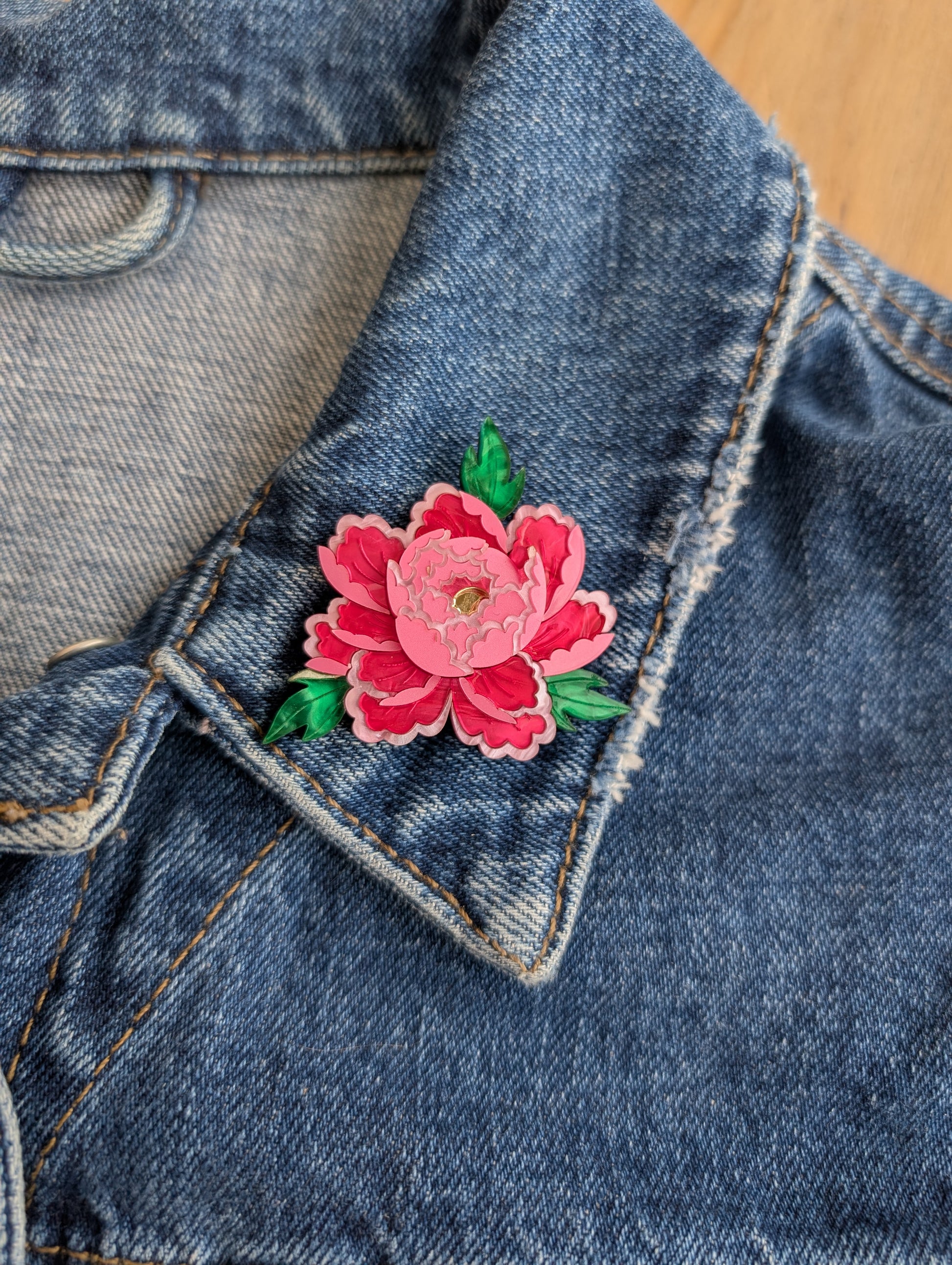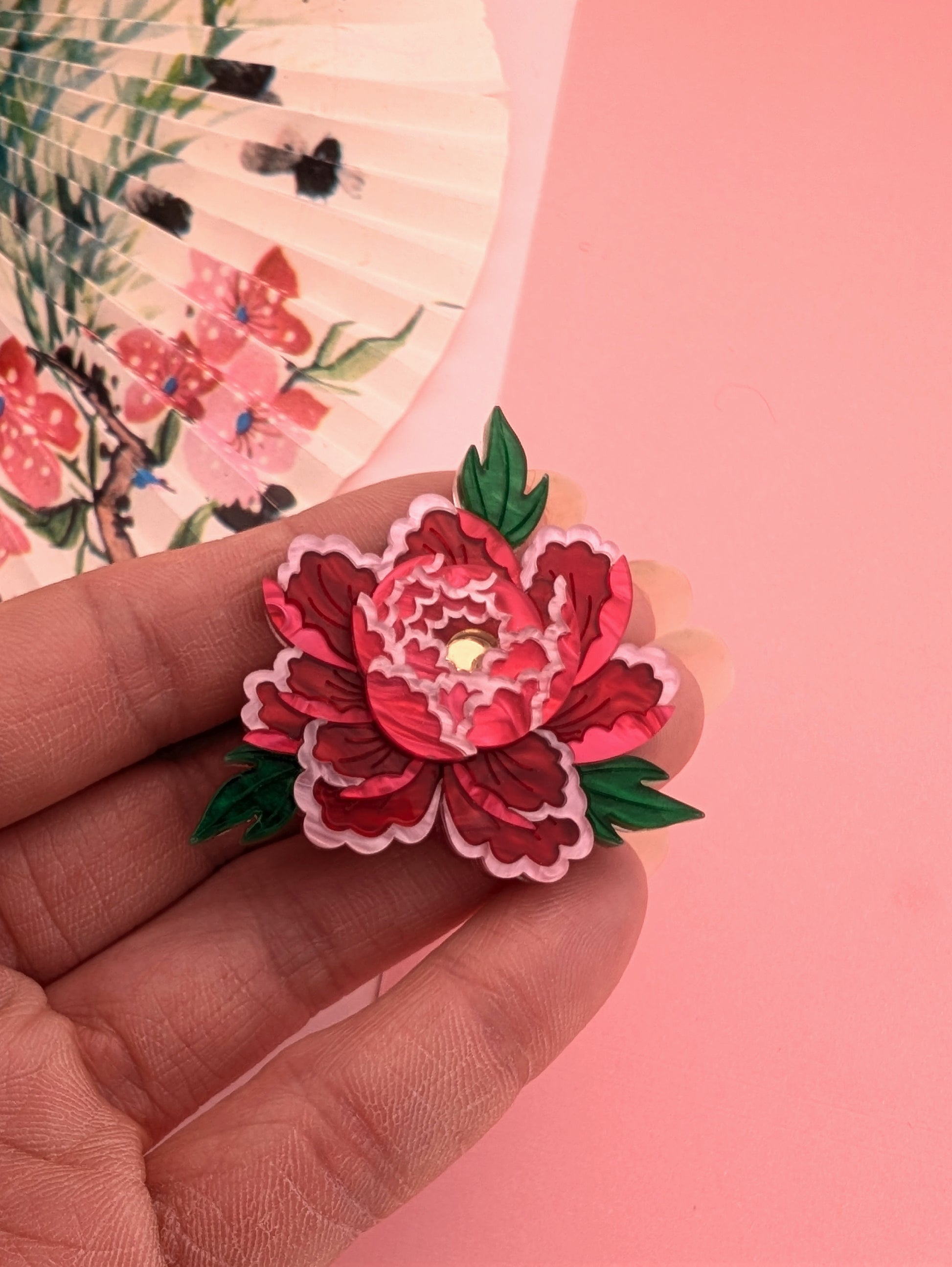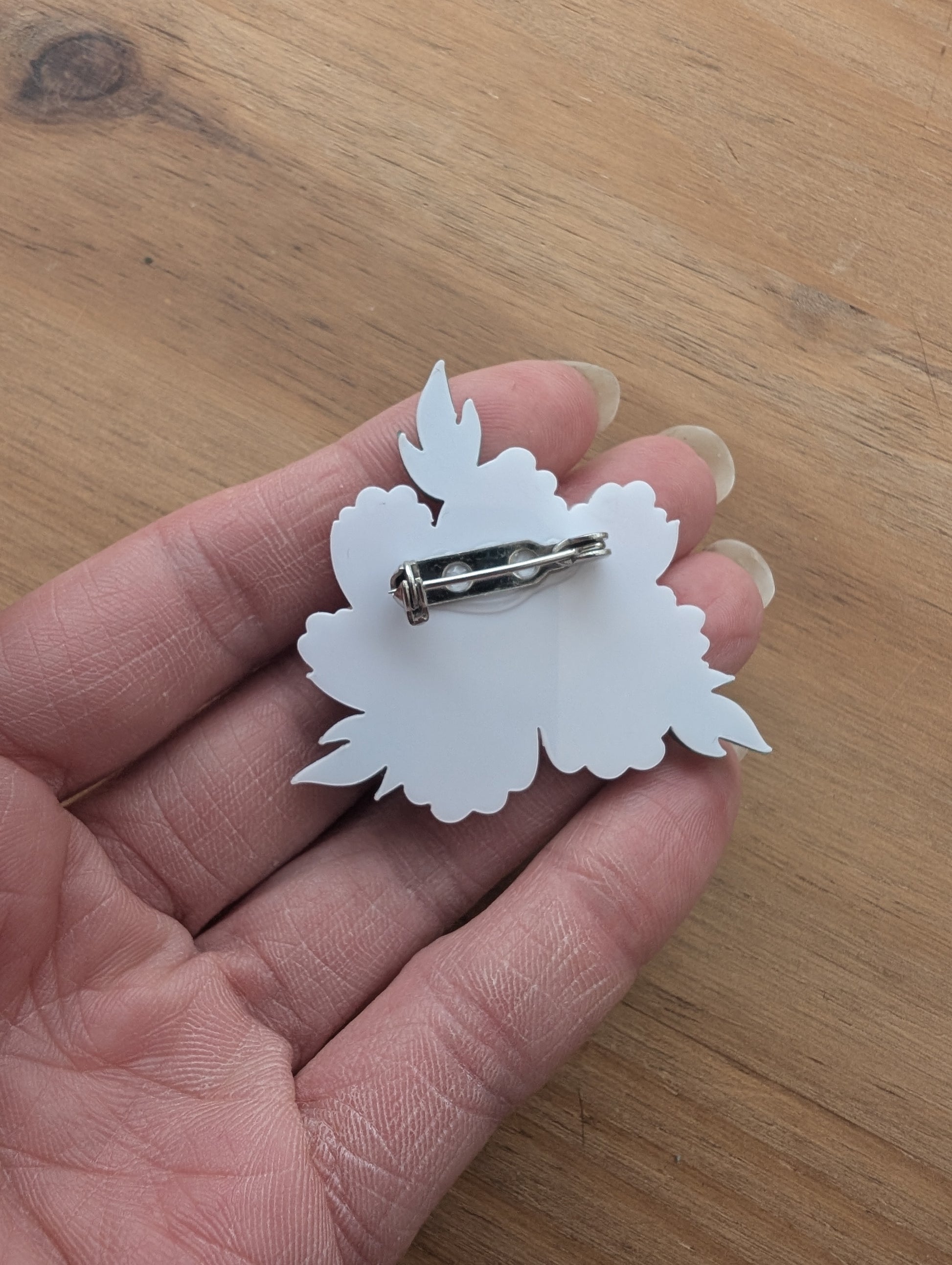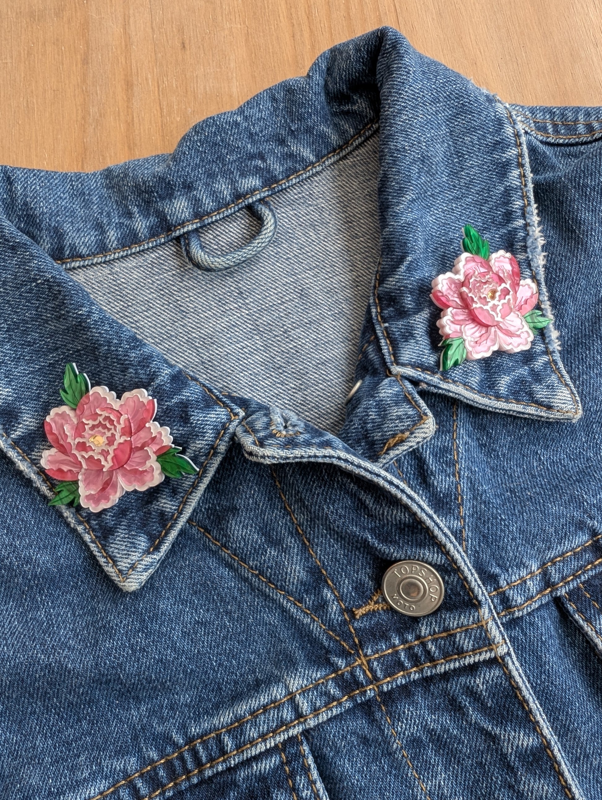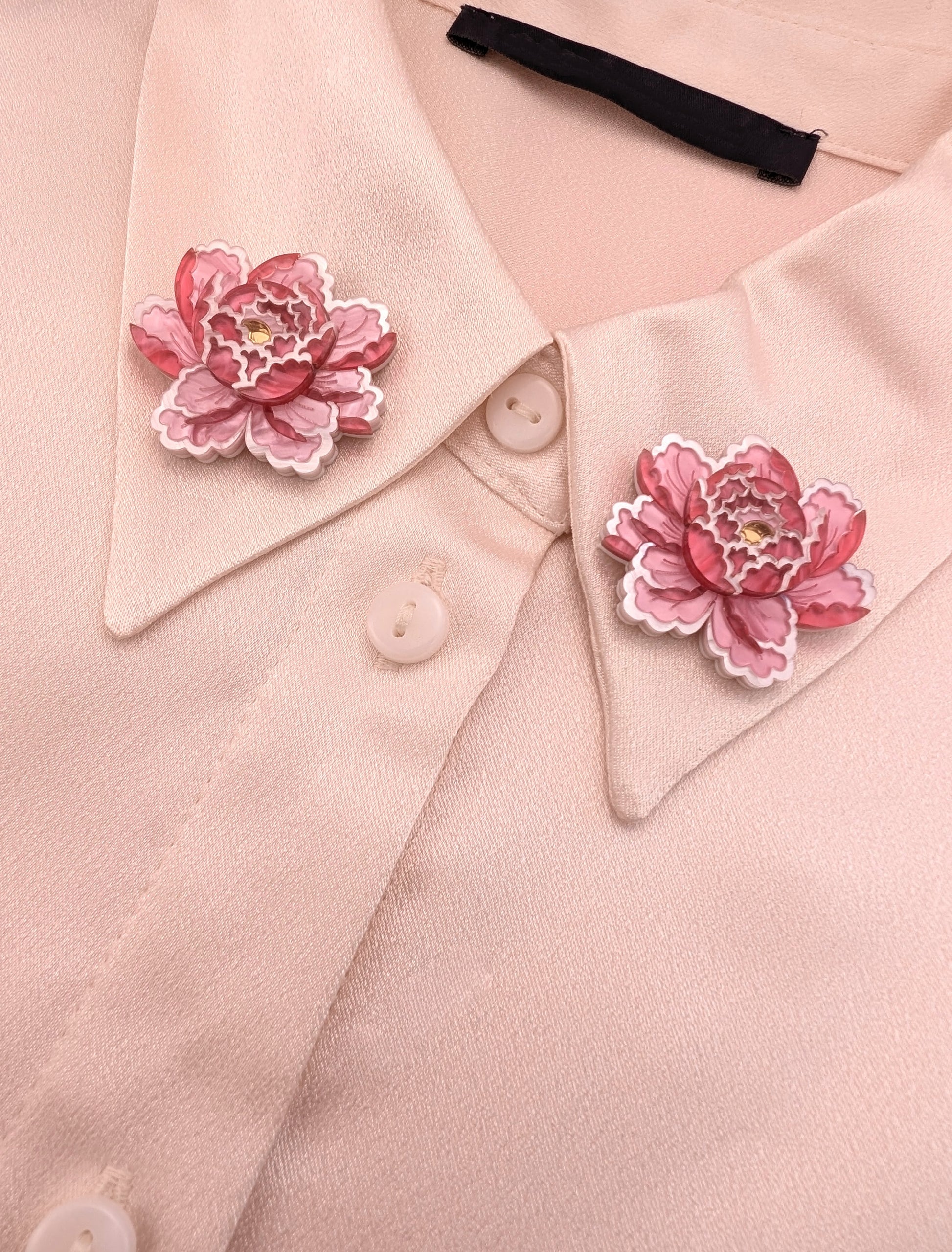 These mini brooches are an extra option and they look quite effective worn on the collar. They're super lightweight and easy to wear due to them being backed with 1mm thick white acrylic with small horizontal stainless steel brooch pins secured on the back. The design consists of two shades of pink, red and green pearl marble acrylic. Please note that there is some variation to the pearl marble acrylic, especially the deeper pink in the pale option. Some sheets can be lighter than others but I will prioritise the more pigmented sheets. Since this was a late addition and because I'm not too sure how popular they'll be, If you choose the single flower brooch option, you will receive the right flower on the photos of pairs.