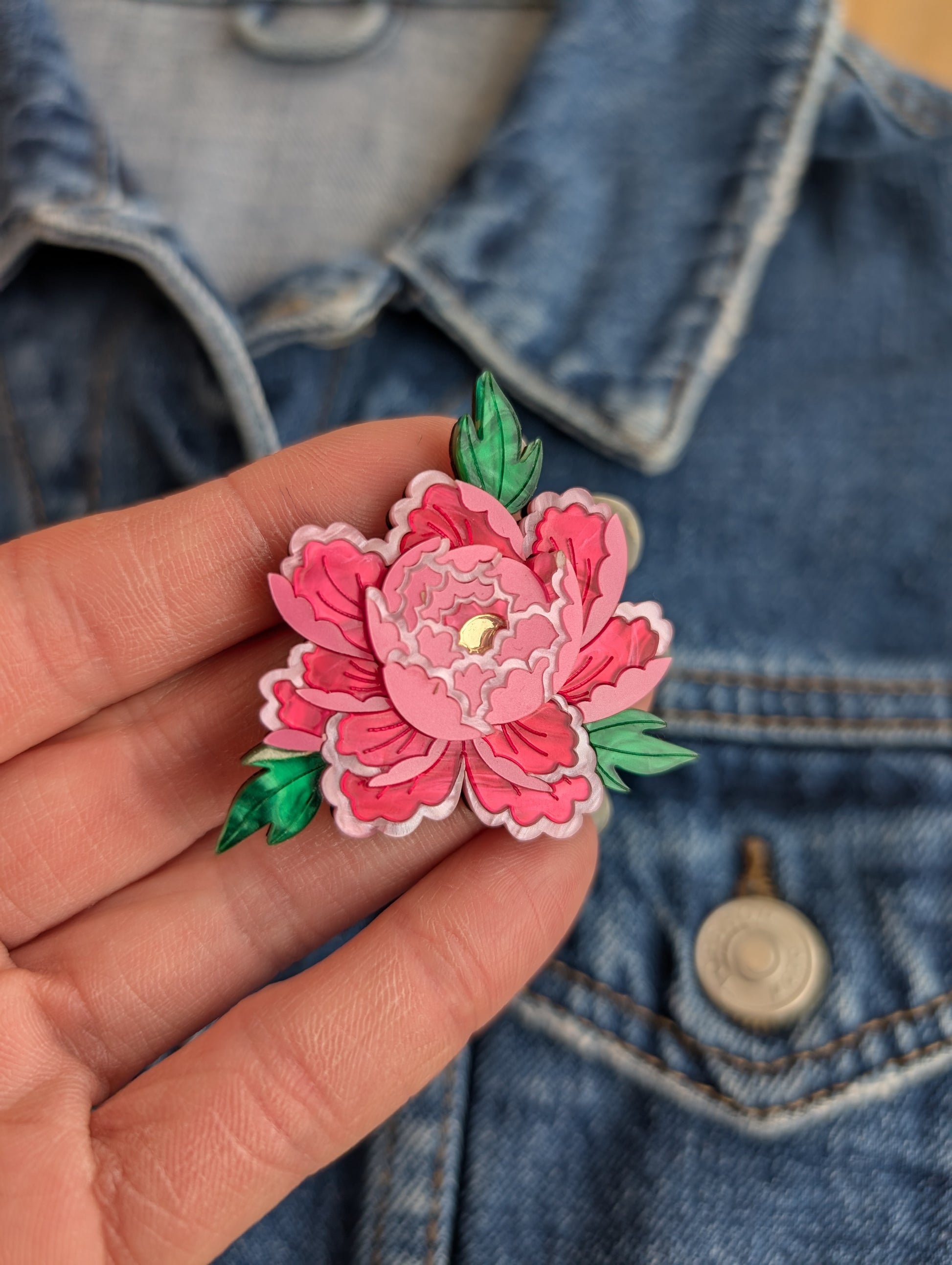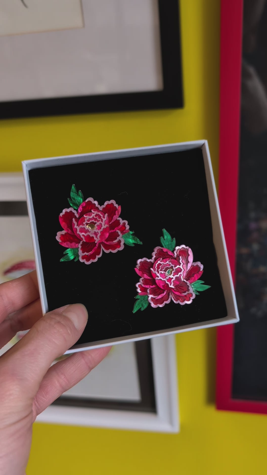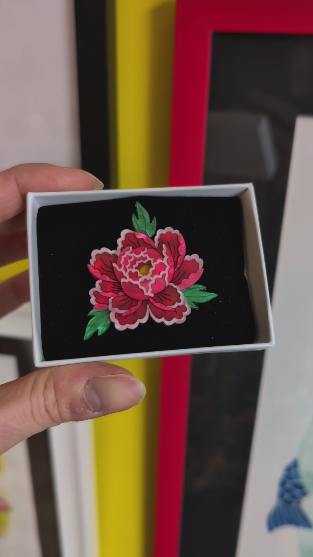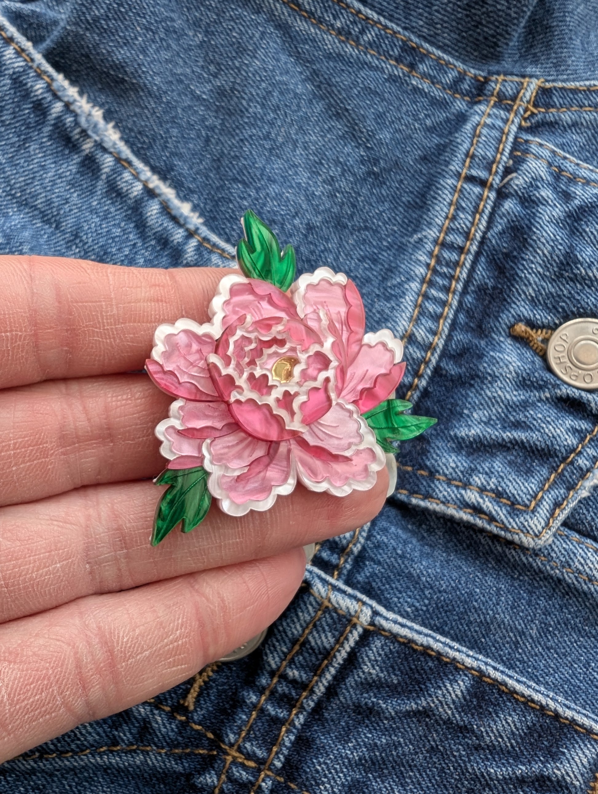 These mini brooches are an extra option and they look quite effective worn on the collar. They're super lightweight and easy to wear due to them being backed with 1mm thick white acrylic with small horizontal stainless steel brooch pins secured on the back. The design consists of two shades of pink, red and green pearl marble acrylic. Please note that there is some variation to the pearl marble acrylic, especially the deeper pink in the pale option. Some sheets can be lighter than others but I will prioritise the more pigmented sheets. Since this was a late addition and because I'm not too sure how popular they'll be, If you choose the single flower brooch option, you will receive the right flower on the photos of pairs.
