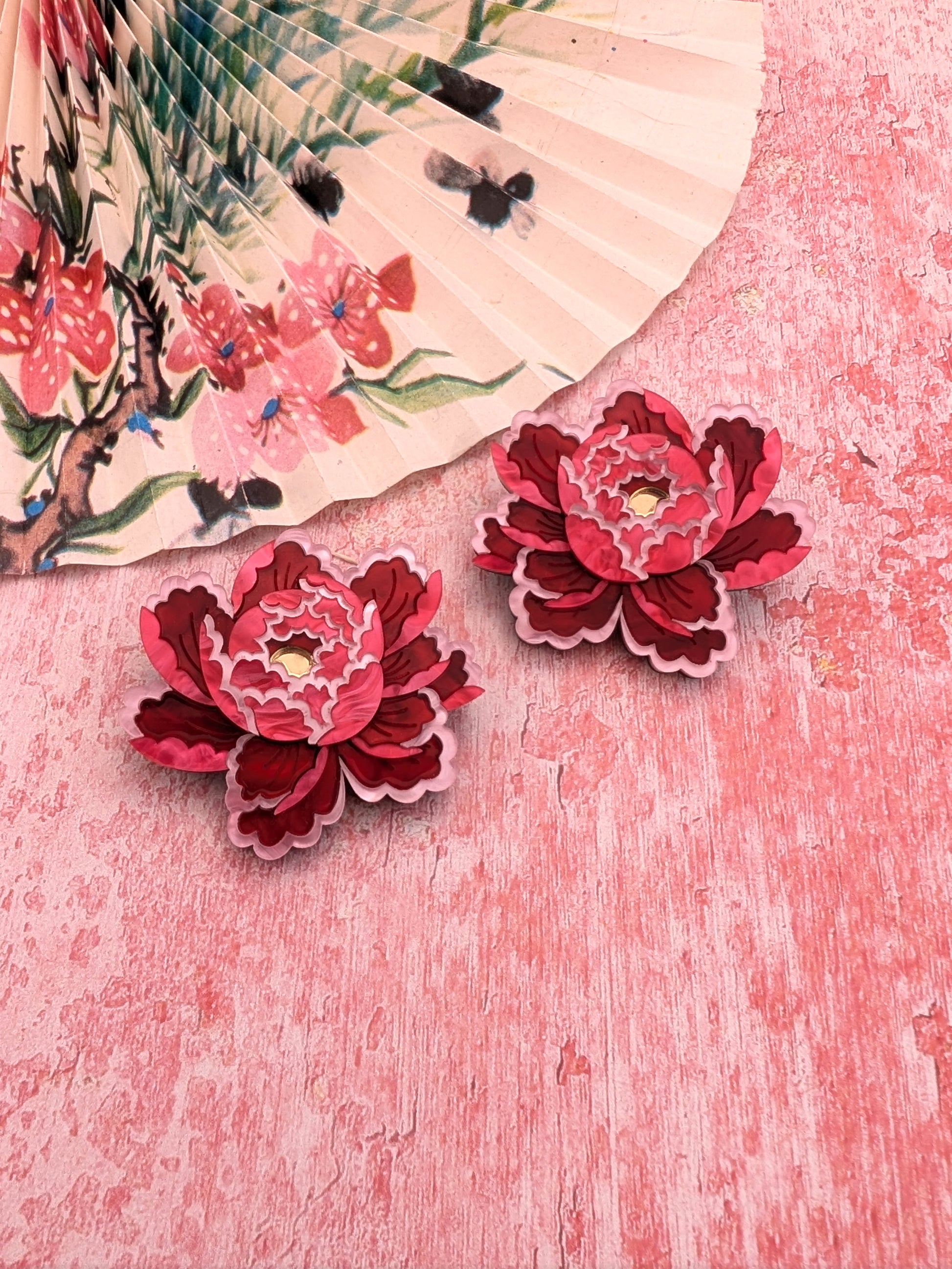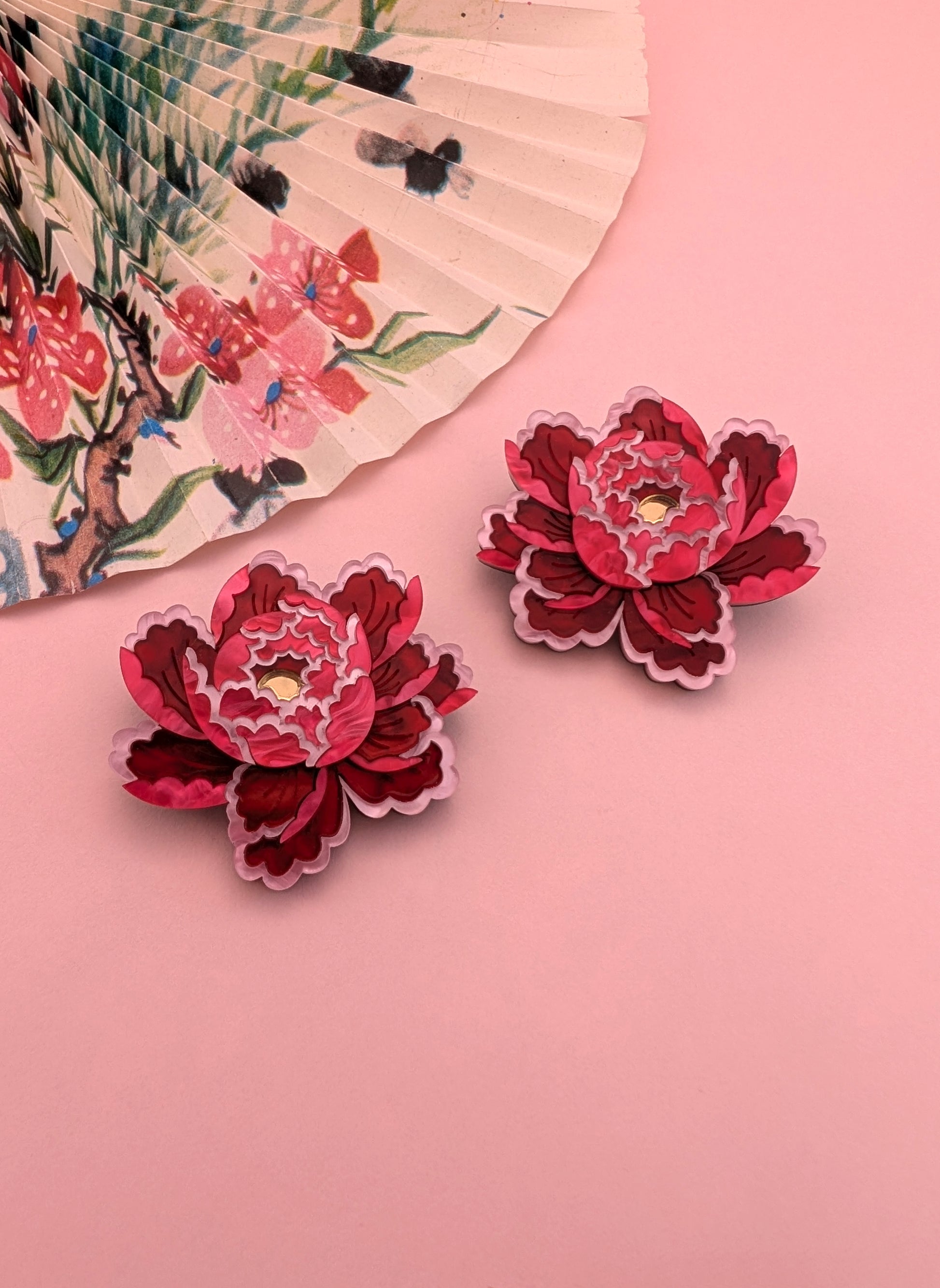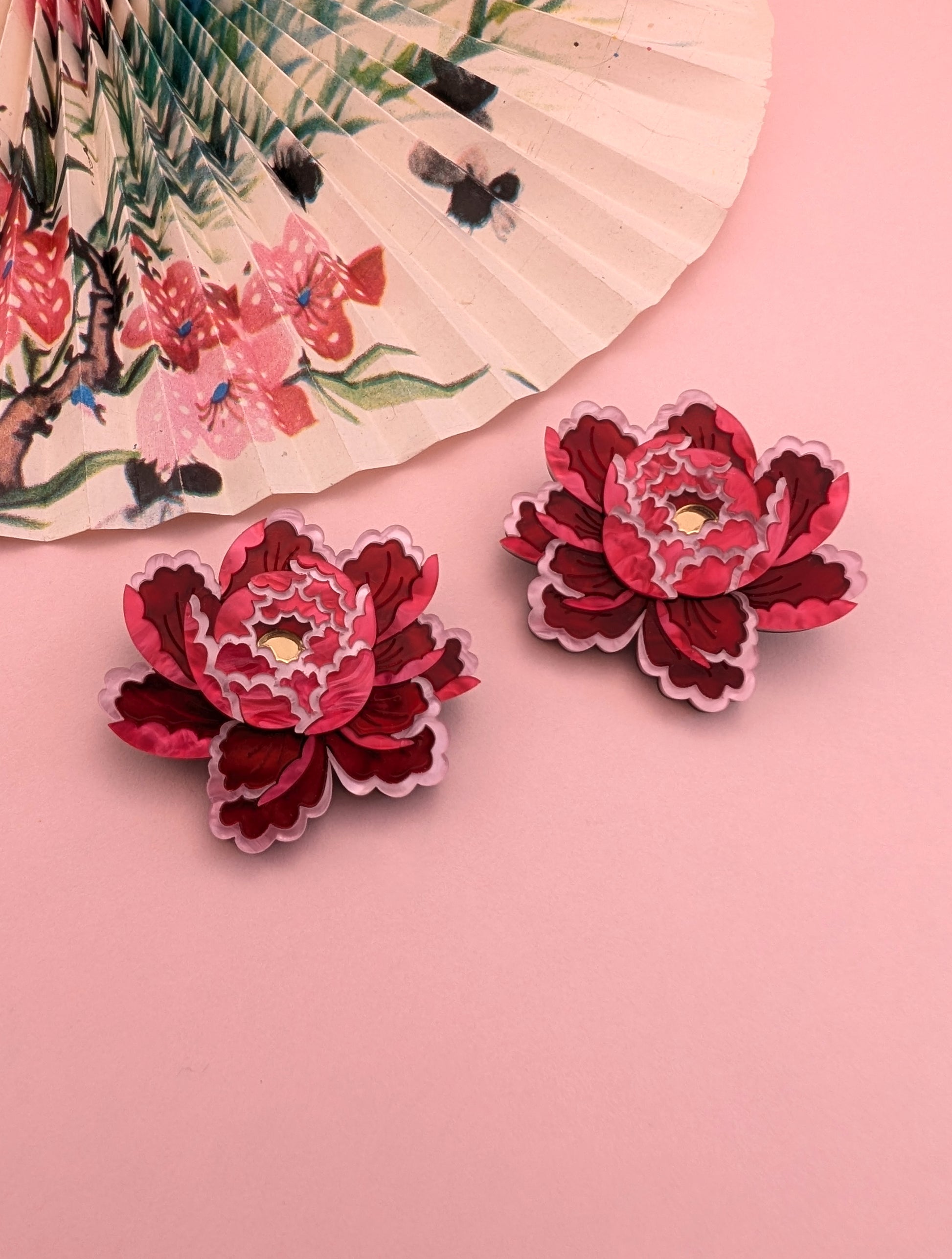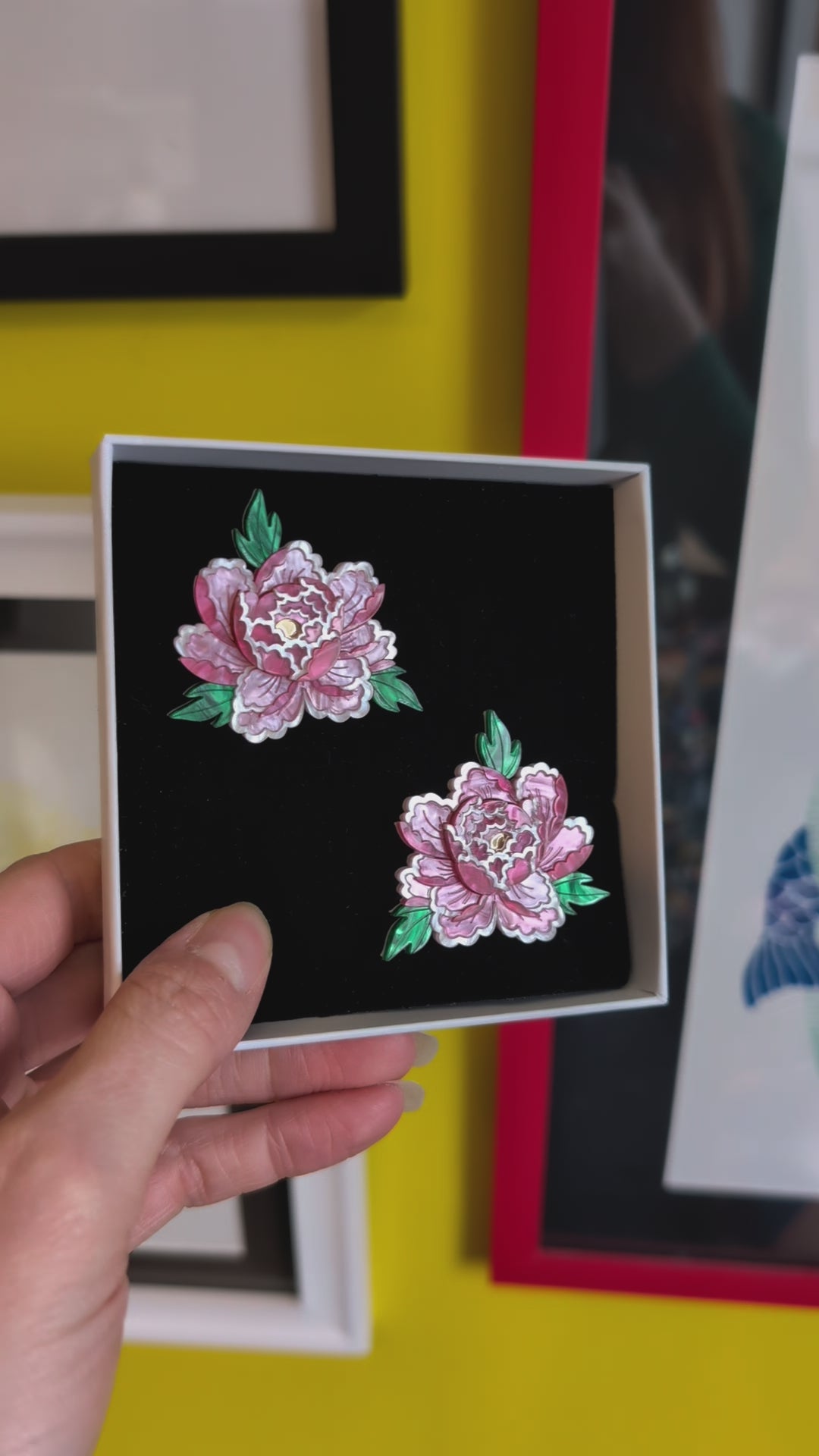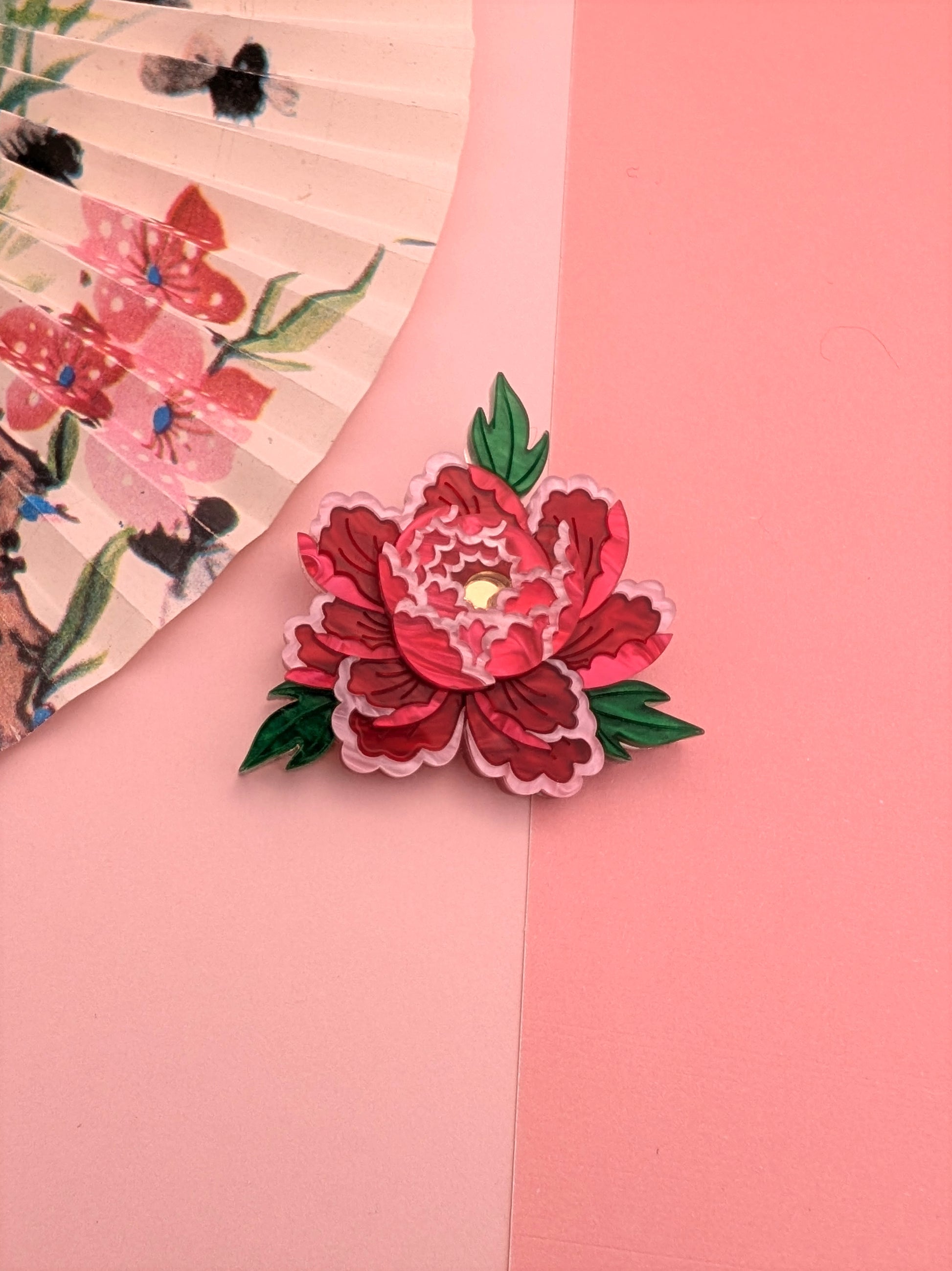 These mini brooches are an extra option and they look quite effective worn on the collar. They're super lightweight and easy to wear due to them being backed with 1mm thick white acrylic with small horizontal stainless steel brooch pins secured on the back. The design consists of two shades of pink, red and green pearl marble acrylic. Please note that there is some variation to the pearl marble acrylic, especially the deeper pink in the pale option. Some sheets can be lighter than others but I will prioritise the more pigmented sheets. Since this was a late addition and because I'm not too sure how popular they'll be, If you choose the single flower brooch option, you will receive the right flower on the photos of pairs.