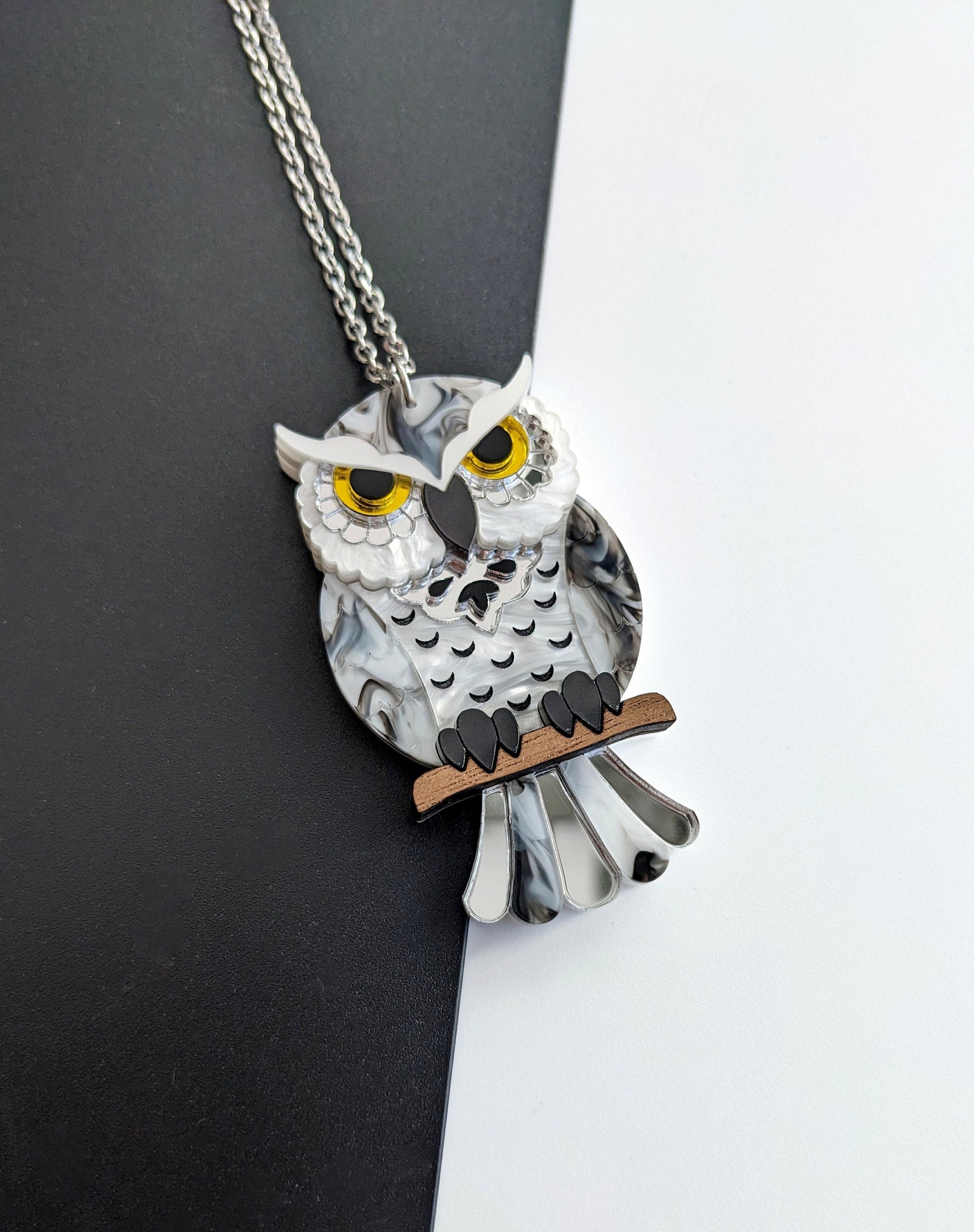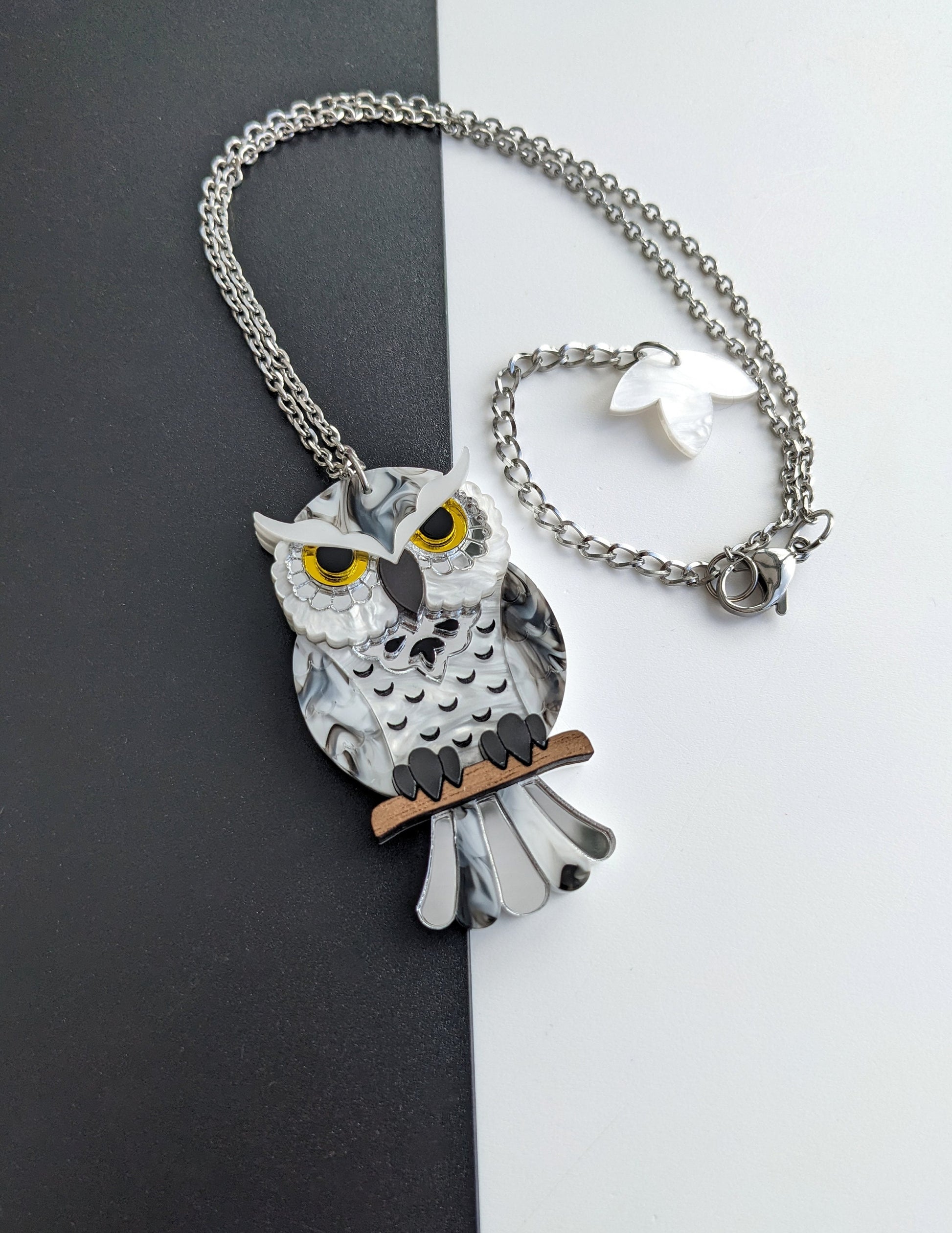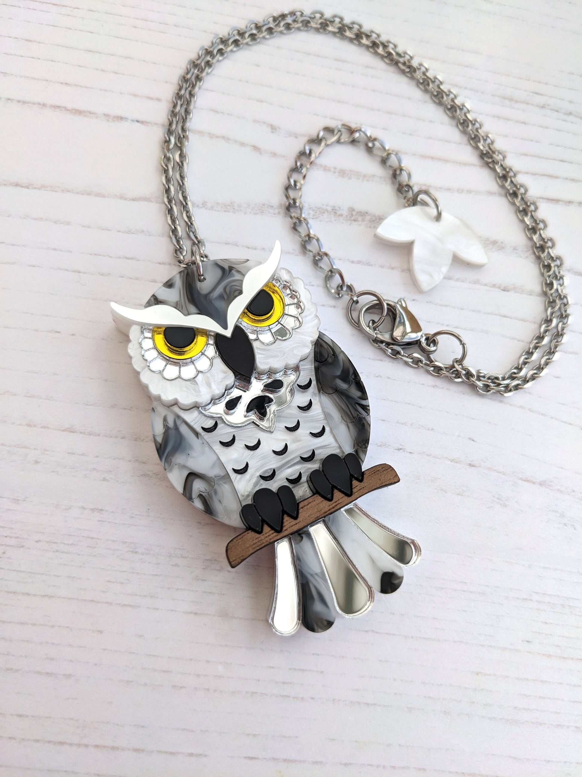 Inspired by a mixture of folk art, owls and with a slight retro vibe, this small owl necklace is laser cut from acrylic and assembled by hand. It is a sweet, wearable piece that measures approximately h6.9cm x w3.8cm and features a mixture of hand mixed white/black marble, frosted, plain Perspex and mirror acrylic backed with white Perspex. The chain is made from stainless steel 304 and measures approximately 45cm but it also comes with an 8.5cm extender chain. The chain is being worn at it's shortest length in the photo. Note that there is variation in the marble acrylic used and they will be chosen at random unless you message me and I can send a photo of the pieces available (if they're not pre order). The white centre section is engraved and hand painted which is why the price is slightly more than the previous colourways. All work is solely done by Rock The Panda designer and maker Ruth Anna Moore in Sheffield, United Kingdom.