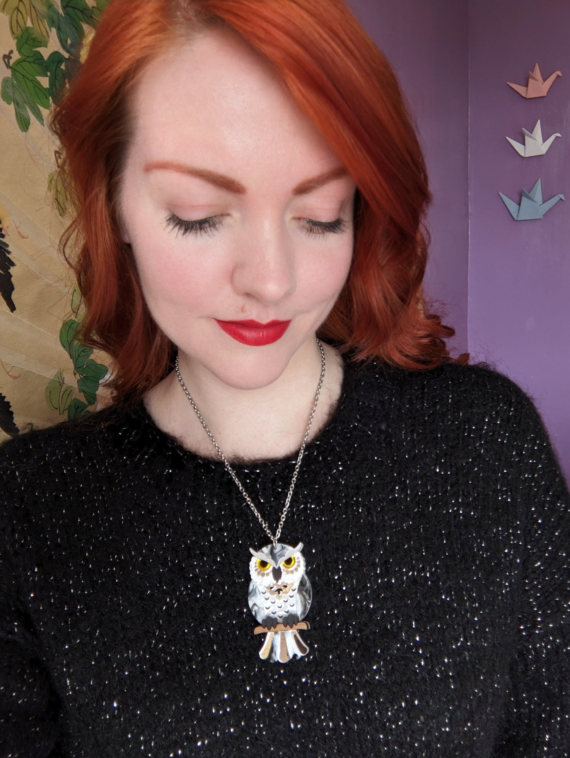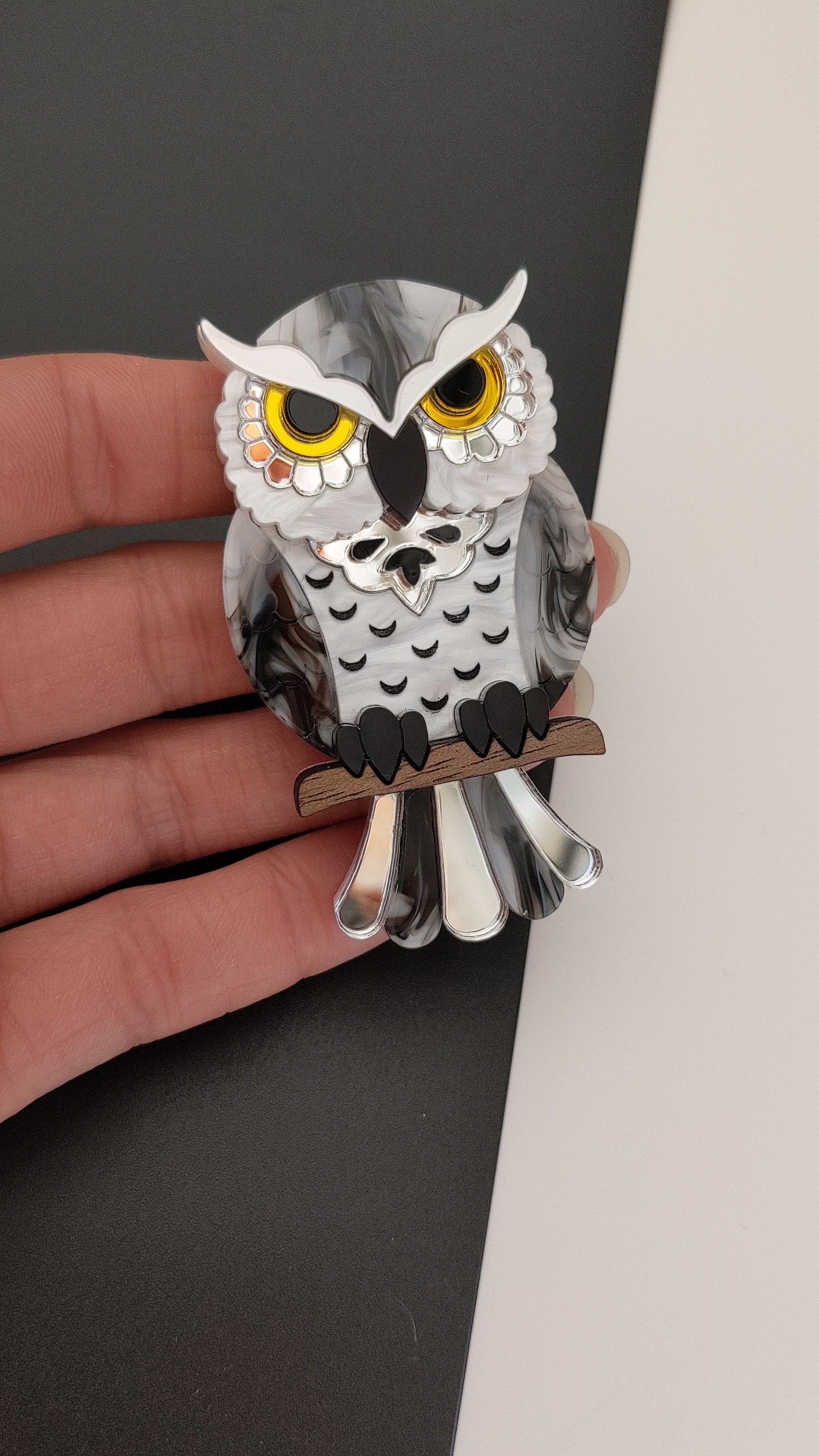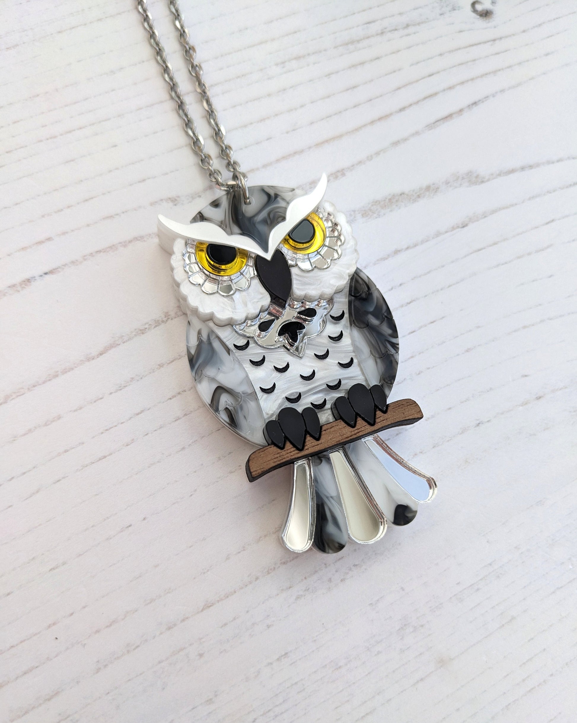 Inspired by a mixture of folk art, owls and with a slight retro vibe, this small owl necklace is laser cut from acrylic and assembled by hand. It is a sweet, wearable piece that measures approximately h6.9cm x w3.8cm and features a mixture of hand mixed white/black marble, frosted, plain Perspex and mirror acrylic backed with white Perspex. The chain is made from stainless steel 304 and measures approximately 45cm but it also comes with an 8.5cm extender chain. The chain is being worn at it's shortest length in the photo. Note that there is variation in the marble acrylic used and they will be chosen at random unless you message me and I can send a photo of the pieces available (if they're not pre order). The white centre section is engraved and hand painted which is why the price is slightly more than the previous colourways. All work is solely done by Rock The Panda designer and maker Ruth Anna Moore in Sheffield, United Kingdom.