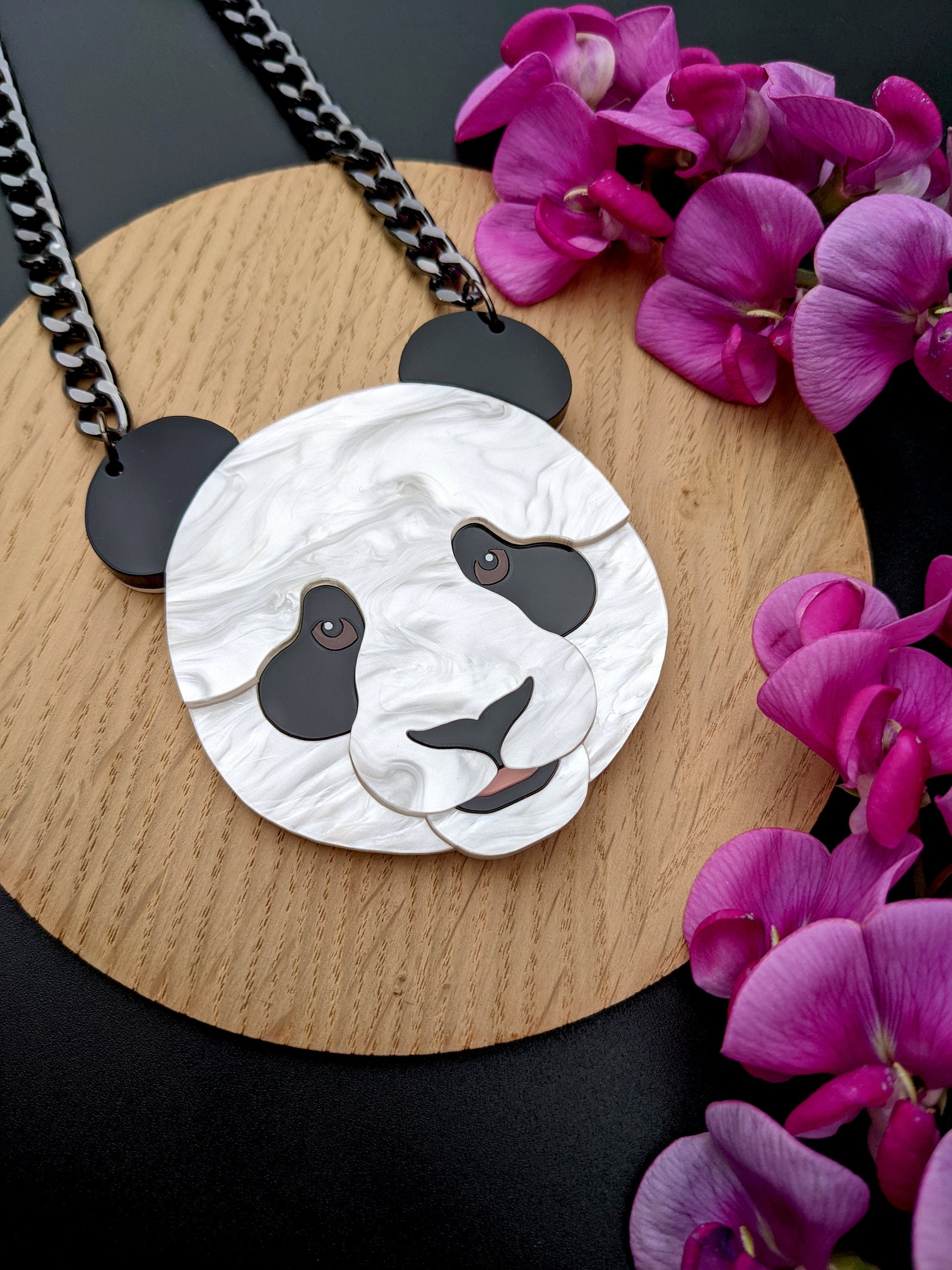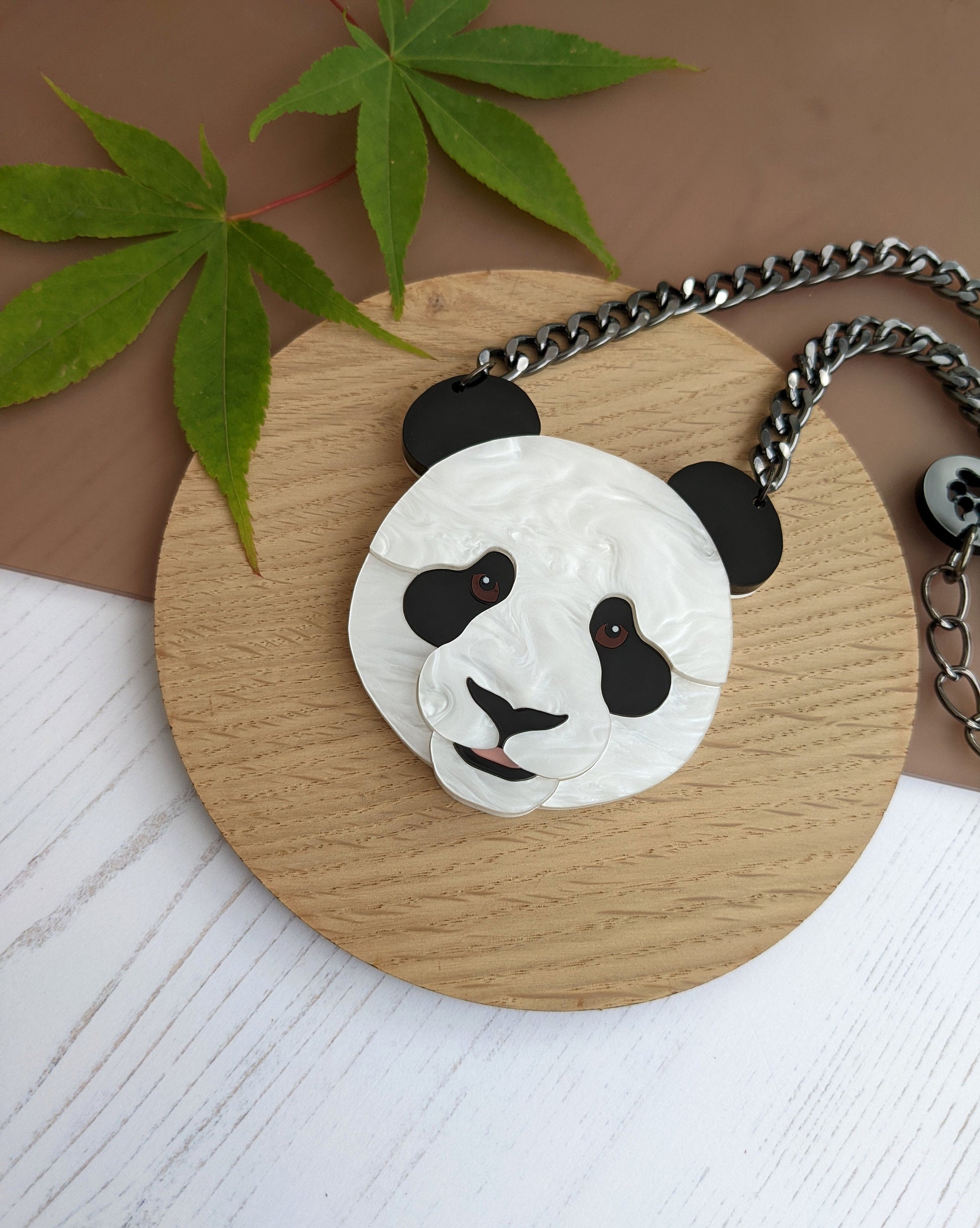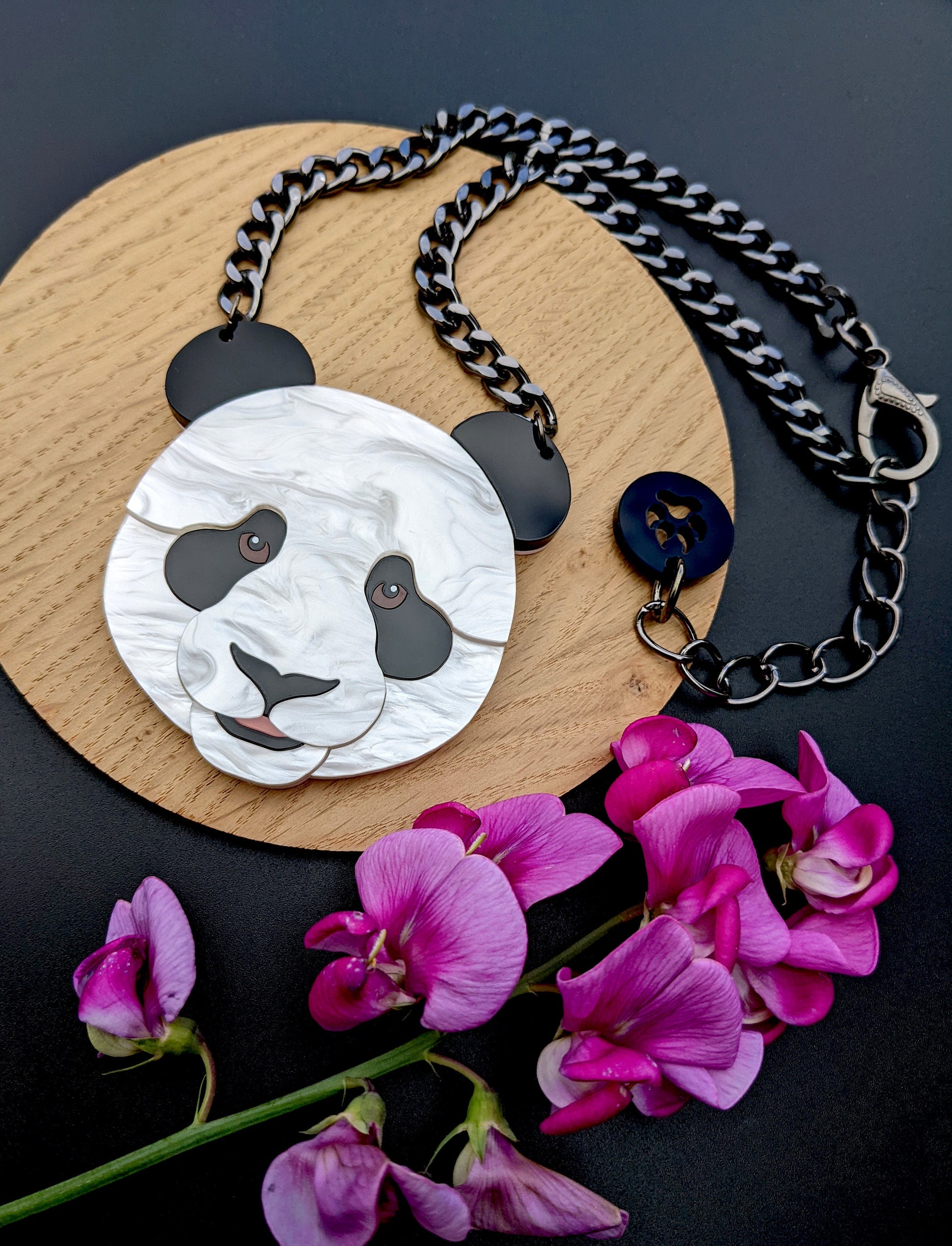This cute panda head necklace was requested by quite a few people the last time I made some pandas so I decided to go ahead with the design this time around. It's an average size I would say for acrylic jewellery measuring in at approximately h7.6cm x w7.2cm. I've chosen a chunky yet lightweight gunmetal coloured aluminium chain (for the bulk of it) which measures roughly 40cm but there is also a 10cm extender chain. I recommend and fairly thick chain for this design but if you prefer another on I've used for something else then I can switch it out if you send me an Etsy message. Chains can also be lengthened or shortened if requested via the order notes just tell me how much by.