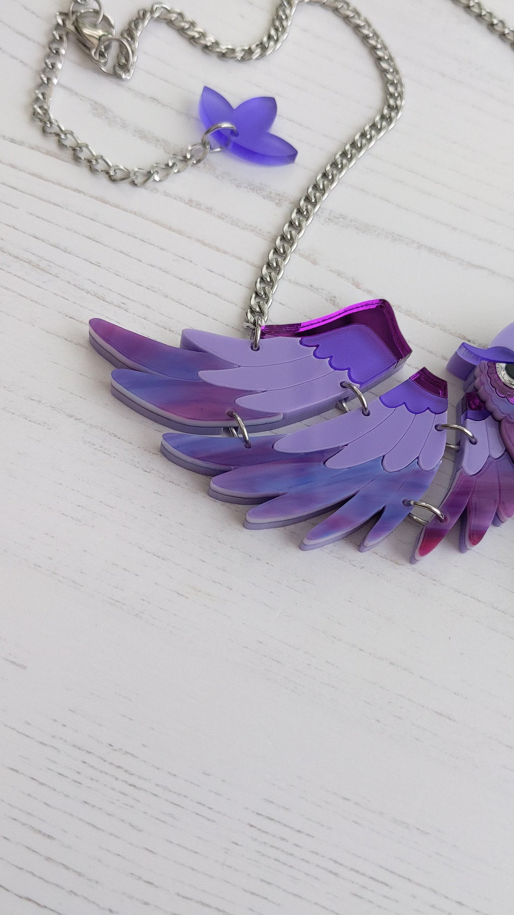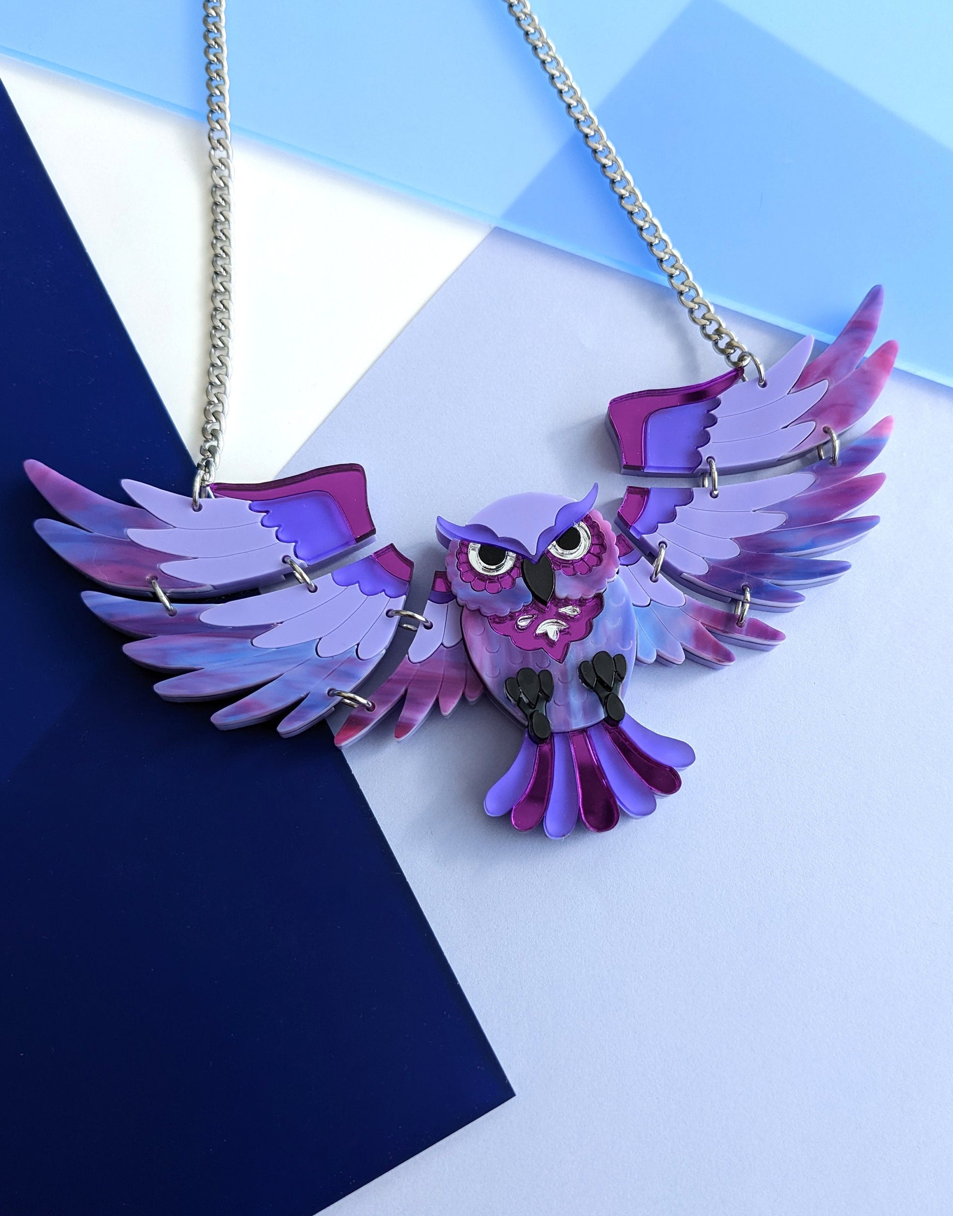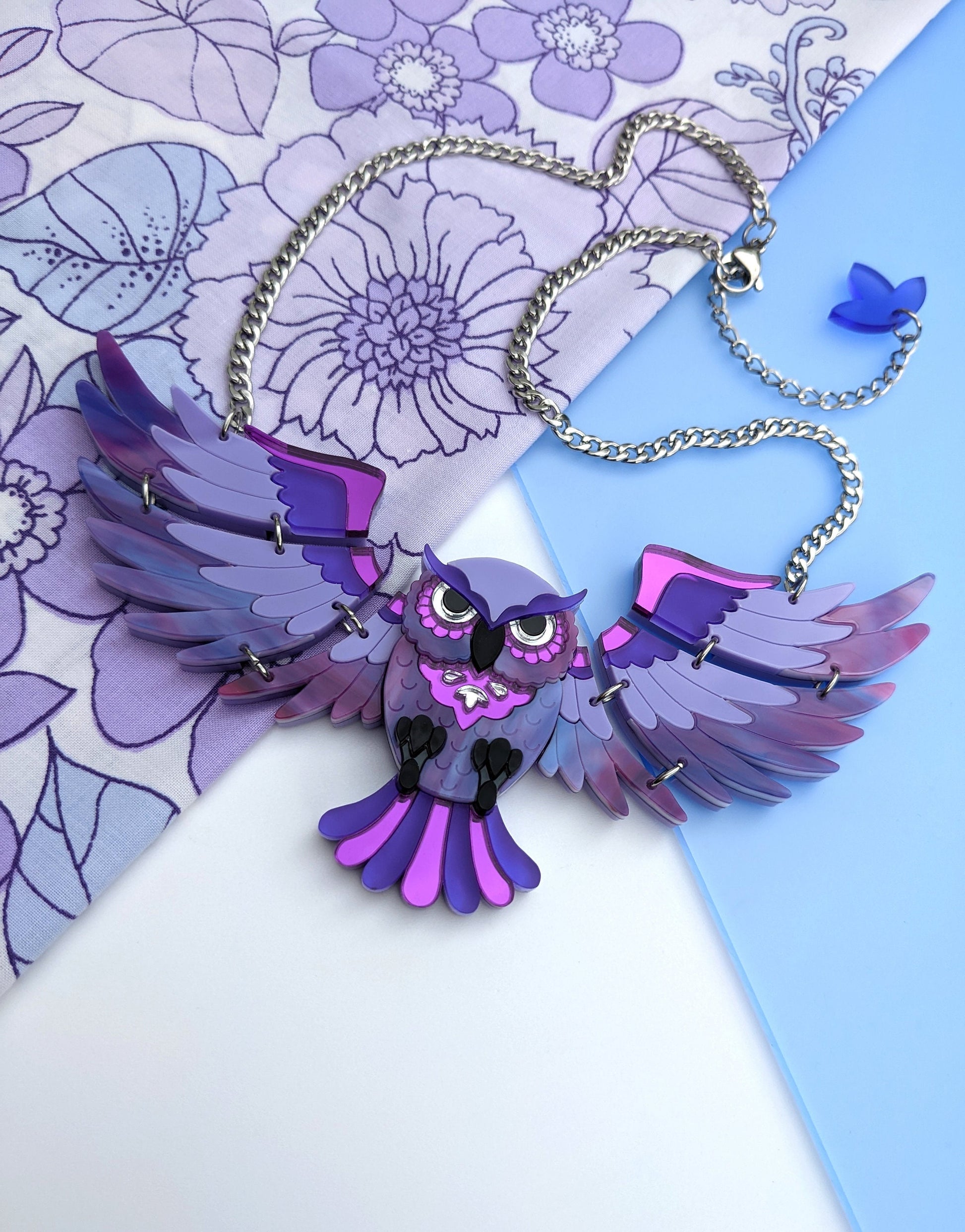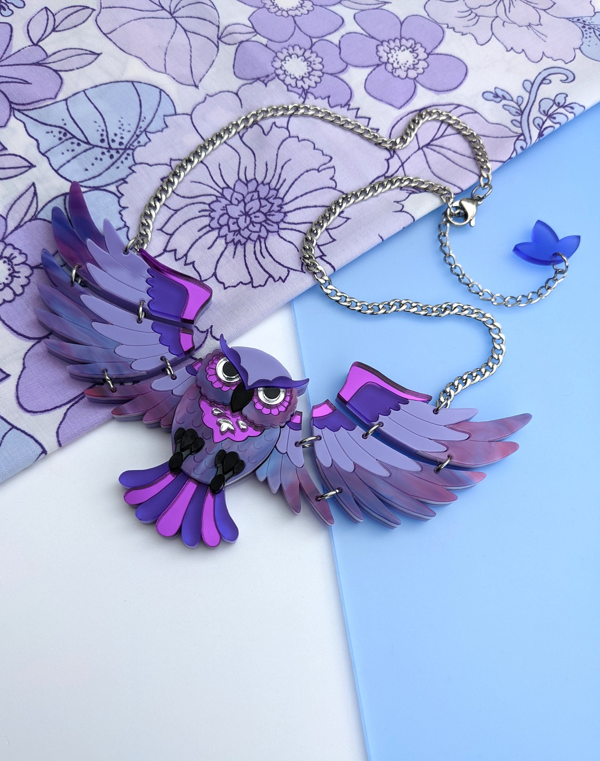 Inspired by a mixture of folk art, owls and with a slight retro vibe, this statement owl necklace is laser cut from acrylic and assembled by hand. It is a very detailed, unique piece that measures approximately h7.4cm x w16cm and features a mixture of hand mixed purple/blue/pink marble, frosted, plain Perspex and mirror acrylic. The chain is made from stainless steel 304 and measures approximately 40cm but it also comes with an 8cm extender chain. The chain is being worn at it's shortest length in the photo. Note that there is variation in the marble acrylic (see video), and they will be chosen at random unless you message me to see what I have available (if they aren't pre order). All work is solely done by Rock The Panda designer and maker Ruth Anna Moore in Sheffield, United Kingdom.