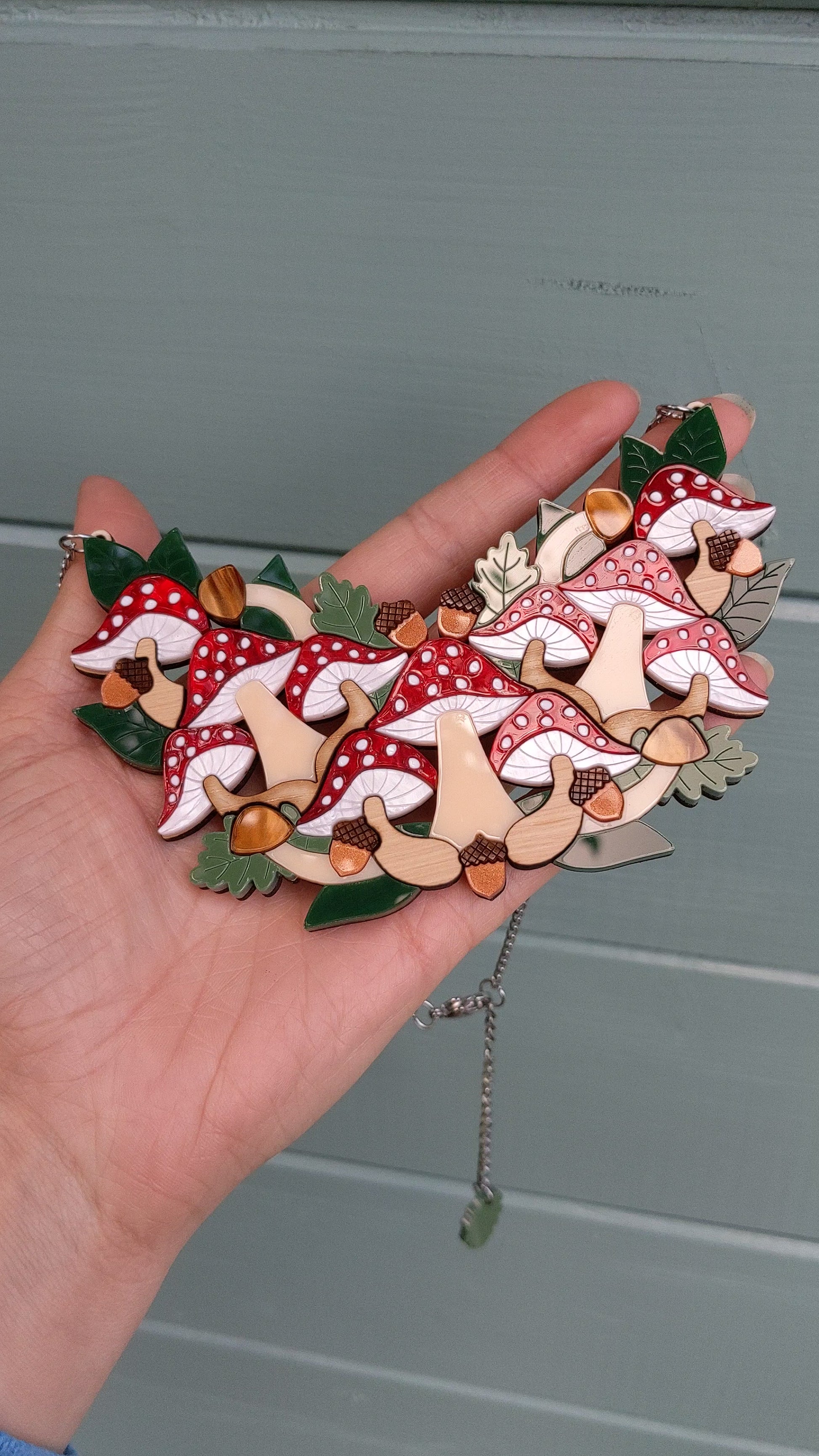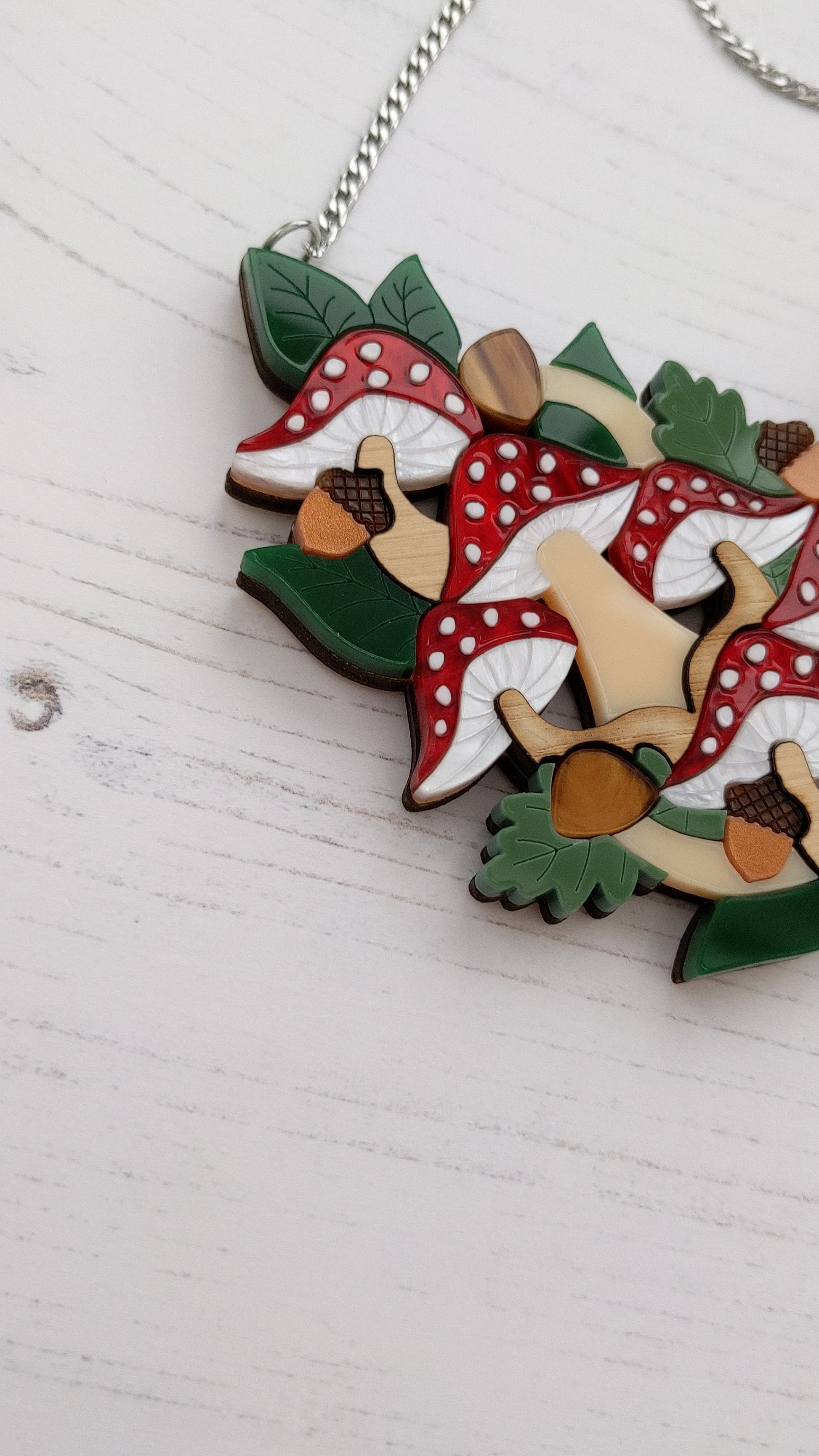 Inspired by a love of toadstools and nature, this woodland toadstool necklace is completely laser cut from acrylic sheet right down to the spots on the caps! It is a very detailed, unique piece that measures approximately h8.1cm x w13cm and features forest green, cream, white and leaf green Perspex, marble white, red, and brown hand mixed acrylic as well as oak veneered plywood and ash veneered plywood all assembled onto an hand sanded and varnished 4mm American maple veneered MDF base (pre 2025 was 3mm poplar plywood).The loops connecting the chain have also been enlarged since the original was made in 2021 for practicality. All work is solely done by Rock The Panda designer and maker Ruth Anna Moore in Sheffield, United Kingdom. The chain is made from stainless steel 304 and measures approximately 36cm but it also comes with a 9cm extender chain. The chain is being worn at it's shortest length in the photos. Note that the grain of the wood can vary between pieces but I do check wooden pieces before assembling and I don't send any out that I wouldn't be happy to receive myself.