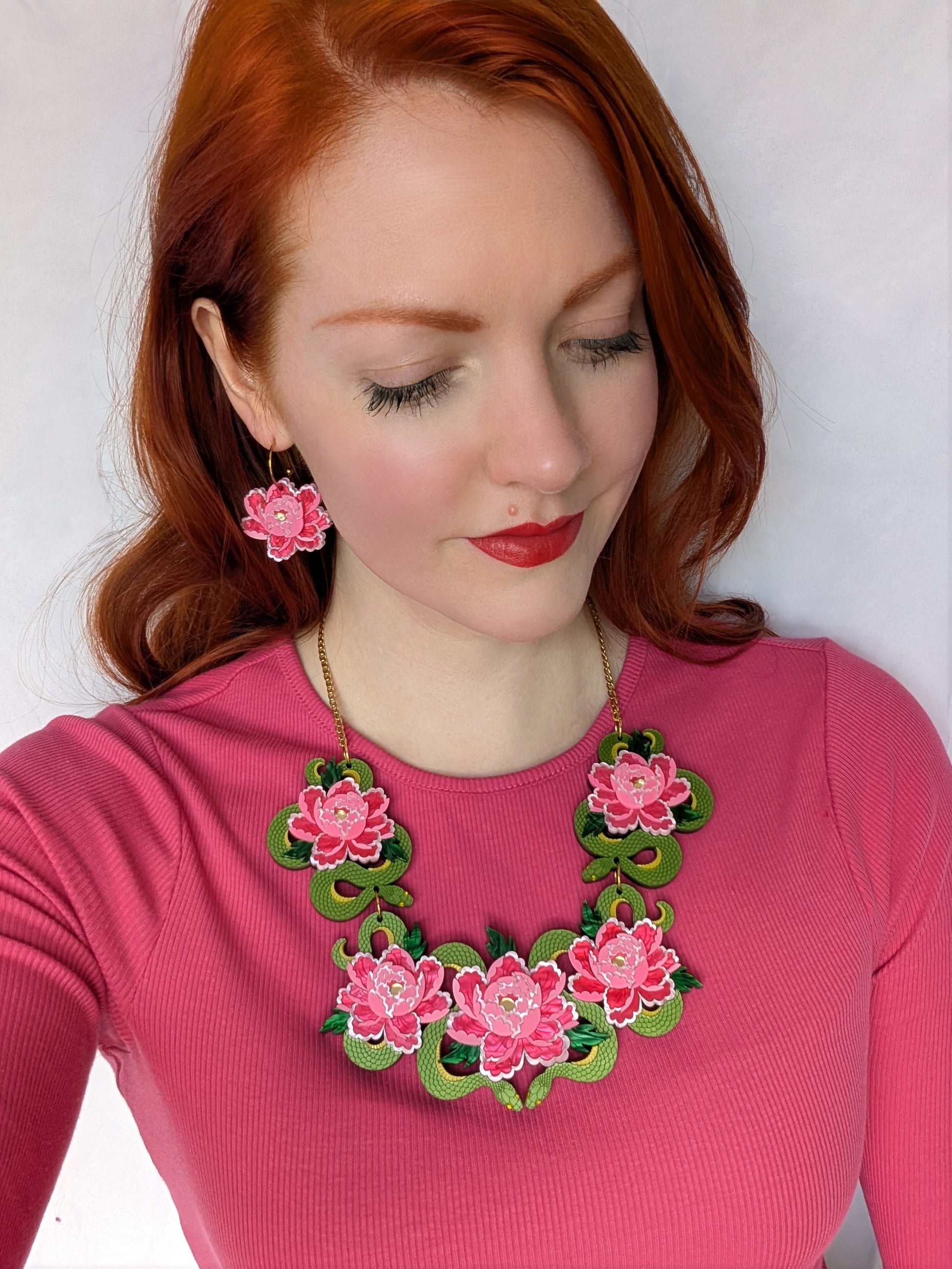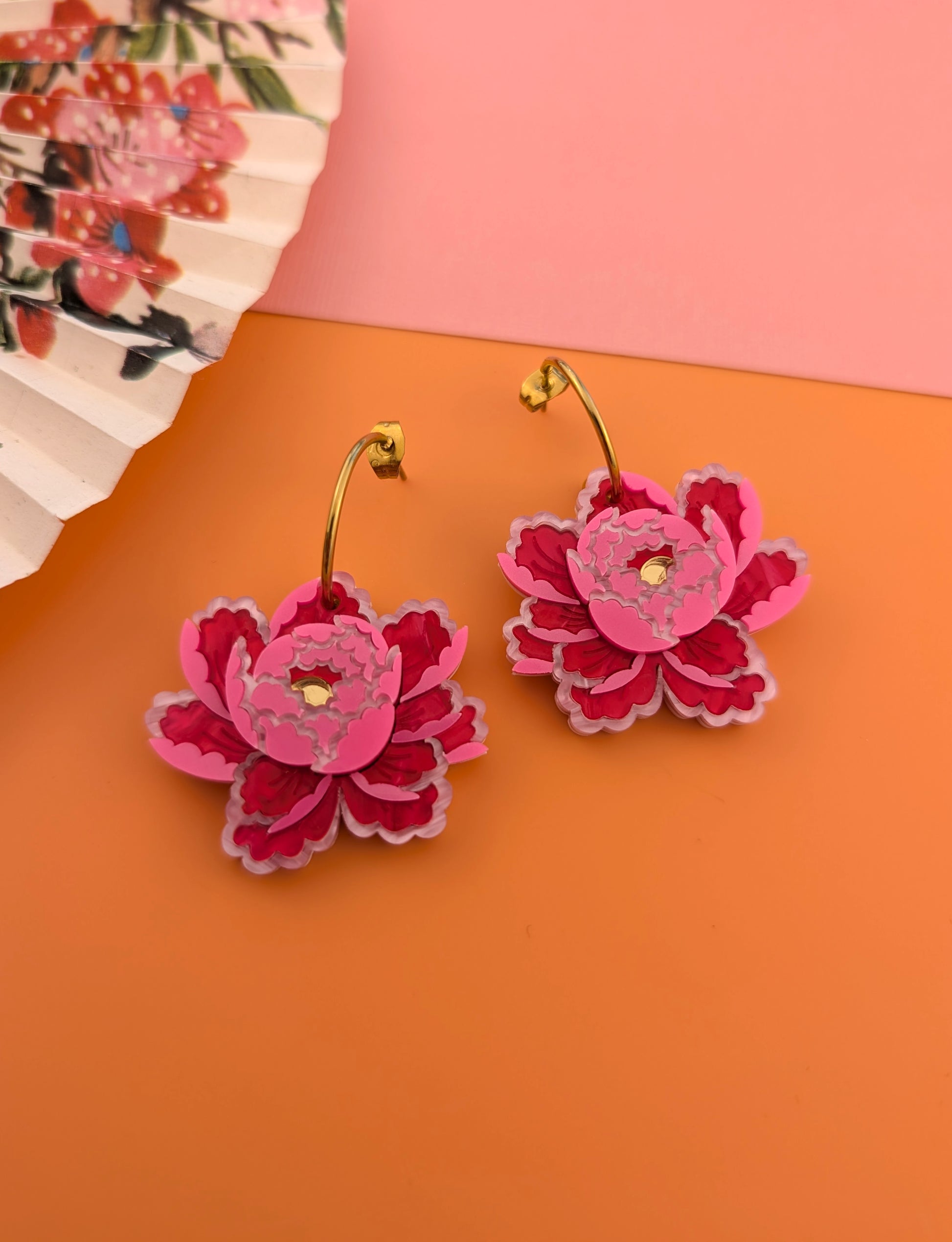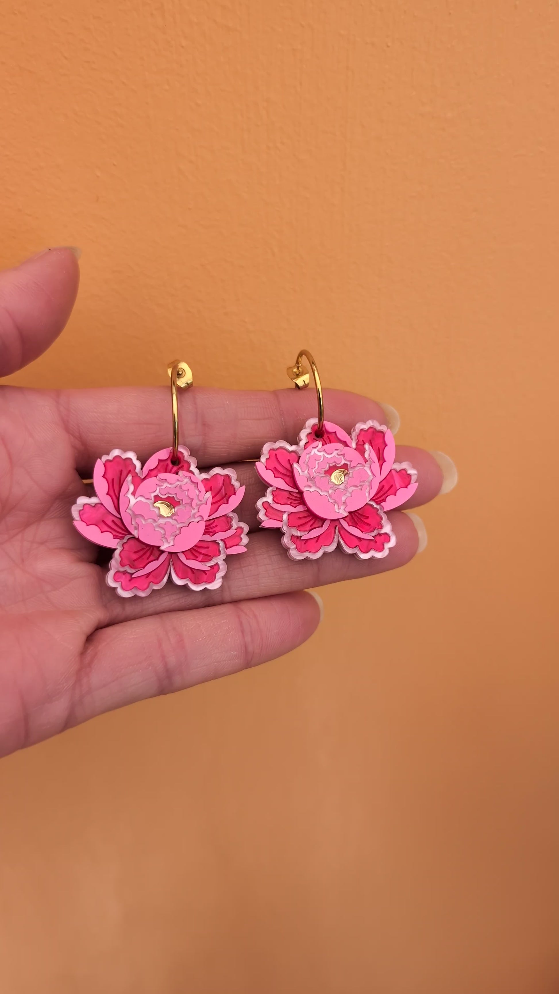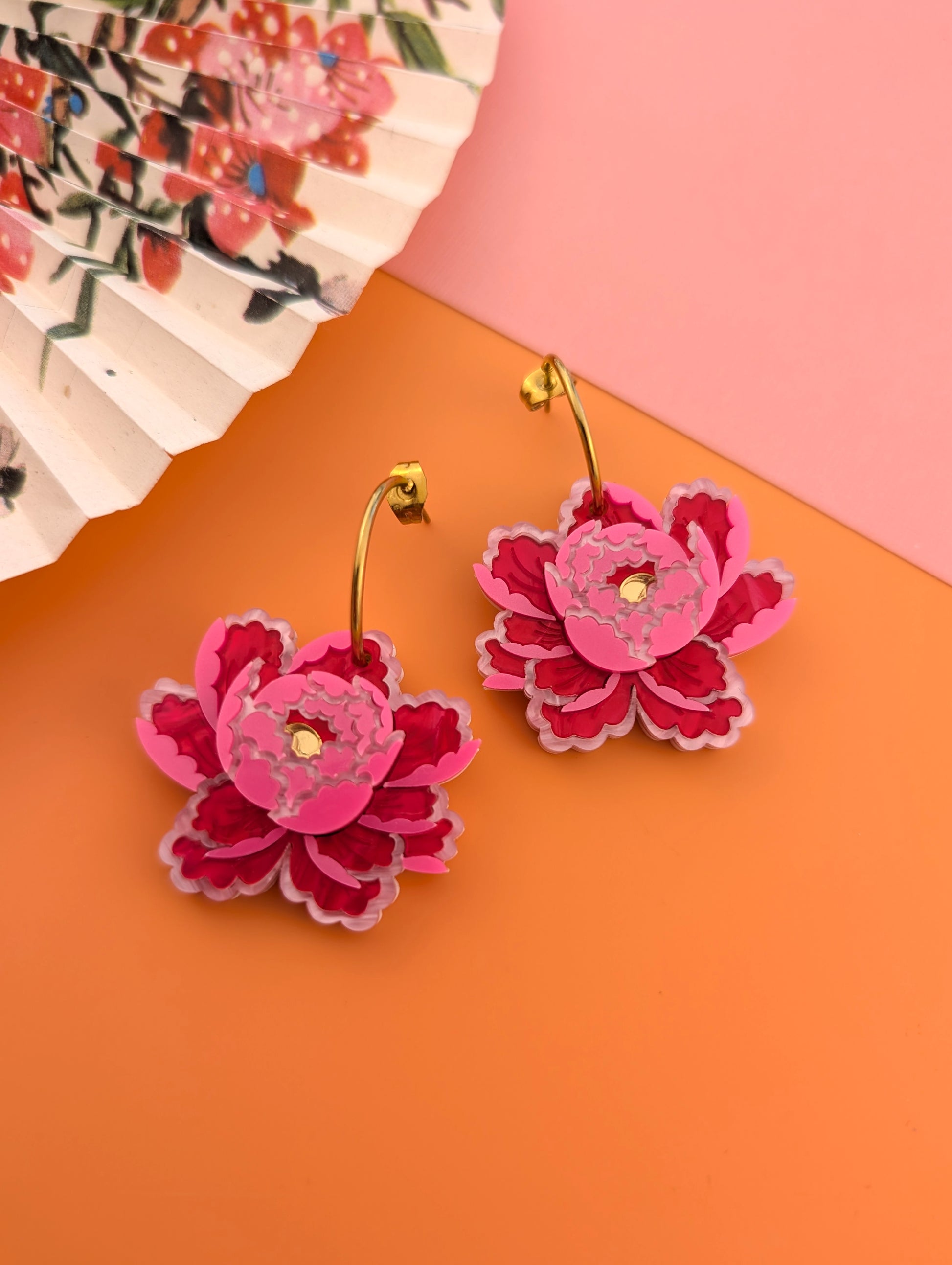 These peony inspired earrings are the perfect size for everyday wear and to wear to match the other pieces in the snakes and florals collection. Each flower measures approximately w35mm x h38mm (without the hoops) and they are super lightweight and easy to wear due to them being backed with 1mm thick white acrylic. The flower consist of a subtle pink metallic acrylic, two shades of pink pearl marble acrylic with gold mirror centres. Please note that there may be some variation to the pearl marble acrylic. There is the option of stainless steel or gold plated stainless steel hoops and you can also get frosted yellow centres with the silver tone option, but I have only made them up with gold centres to show.