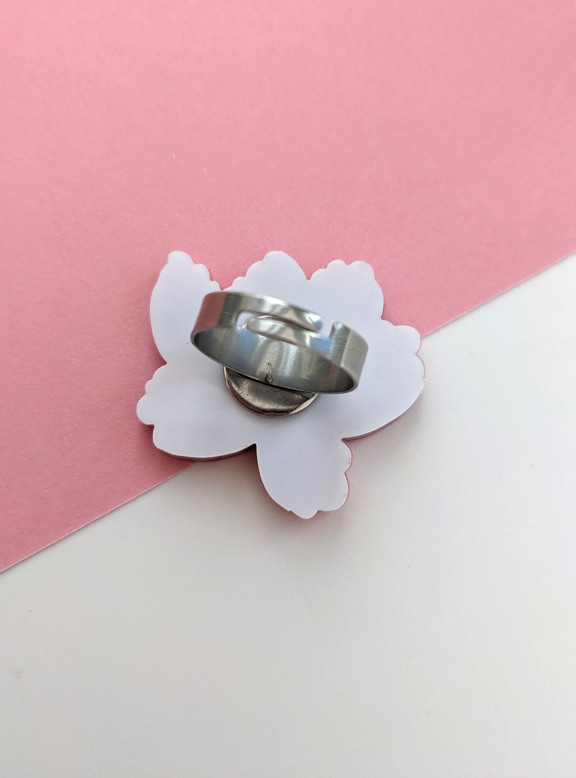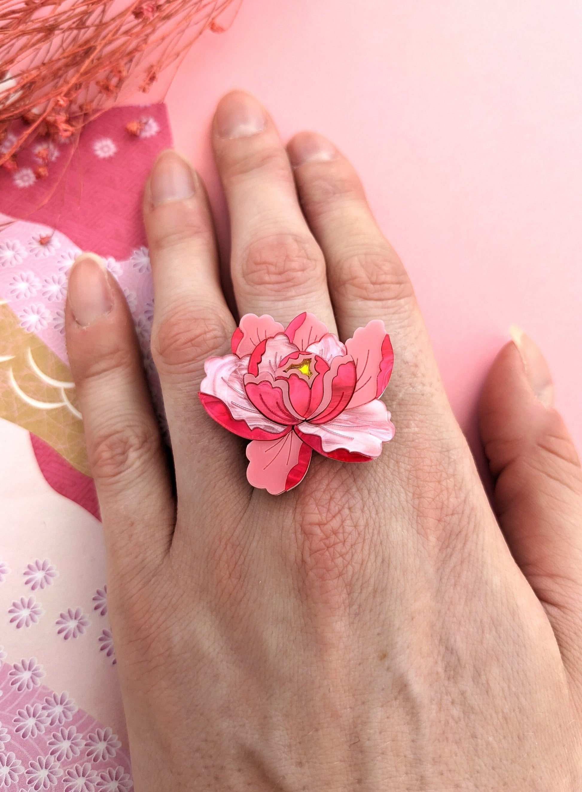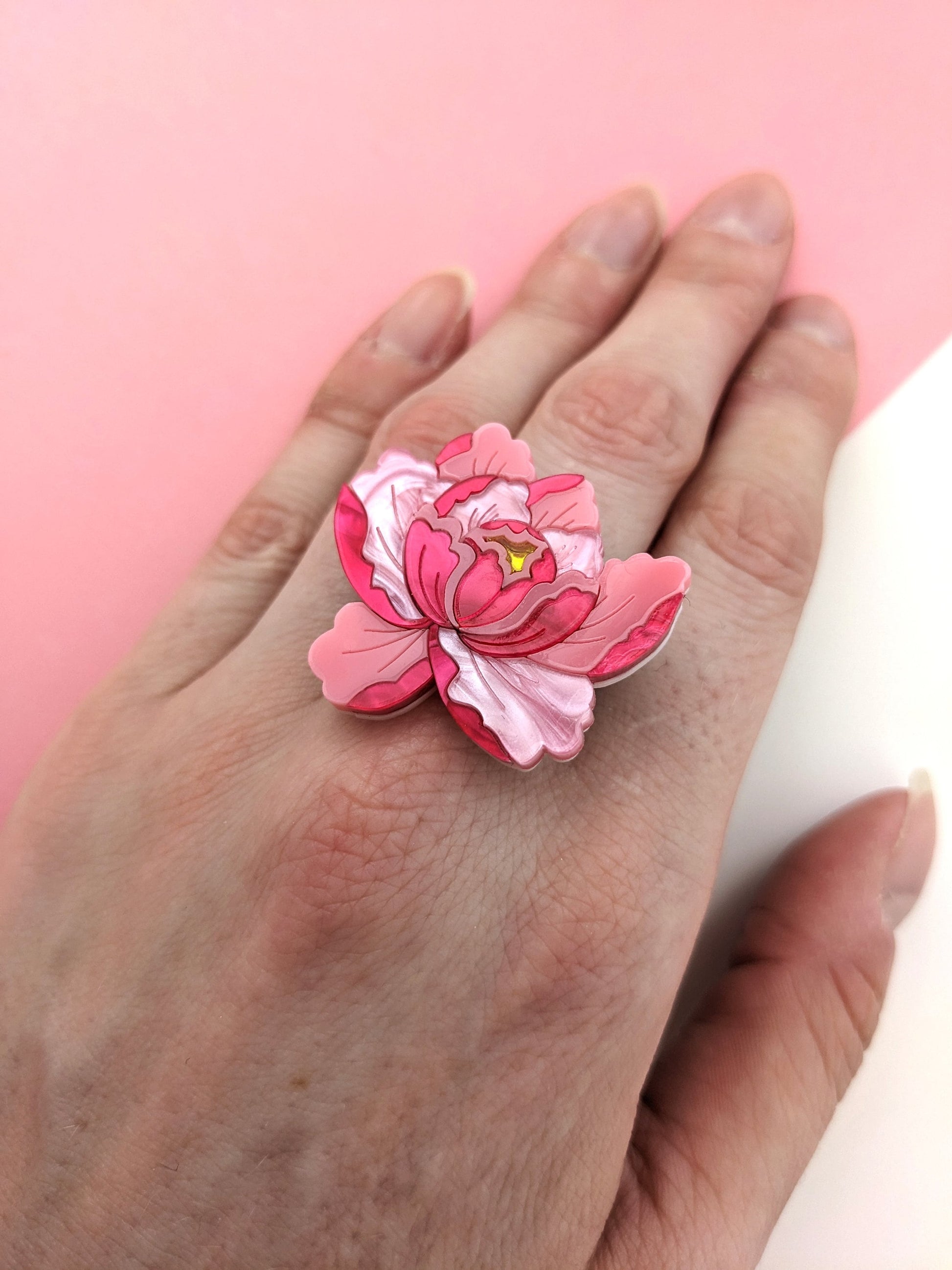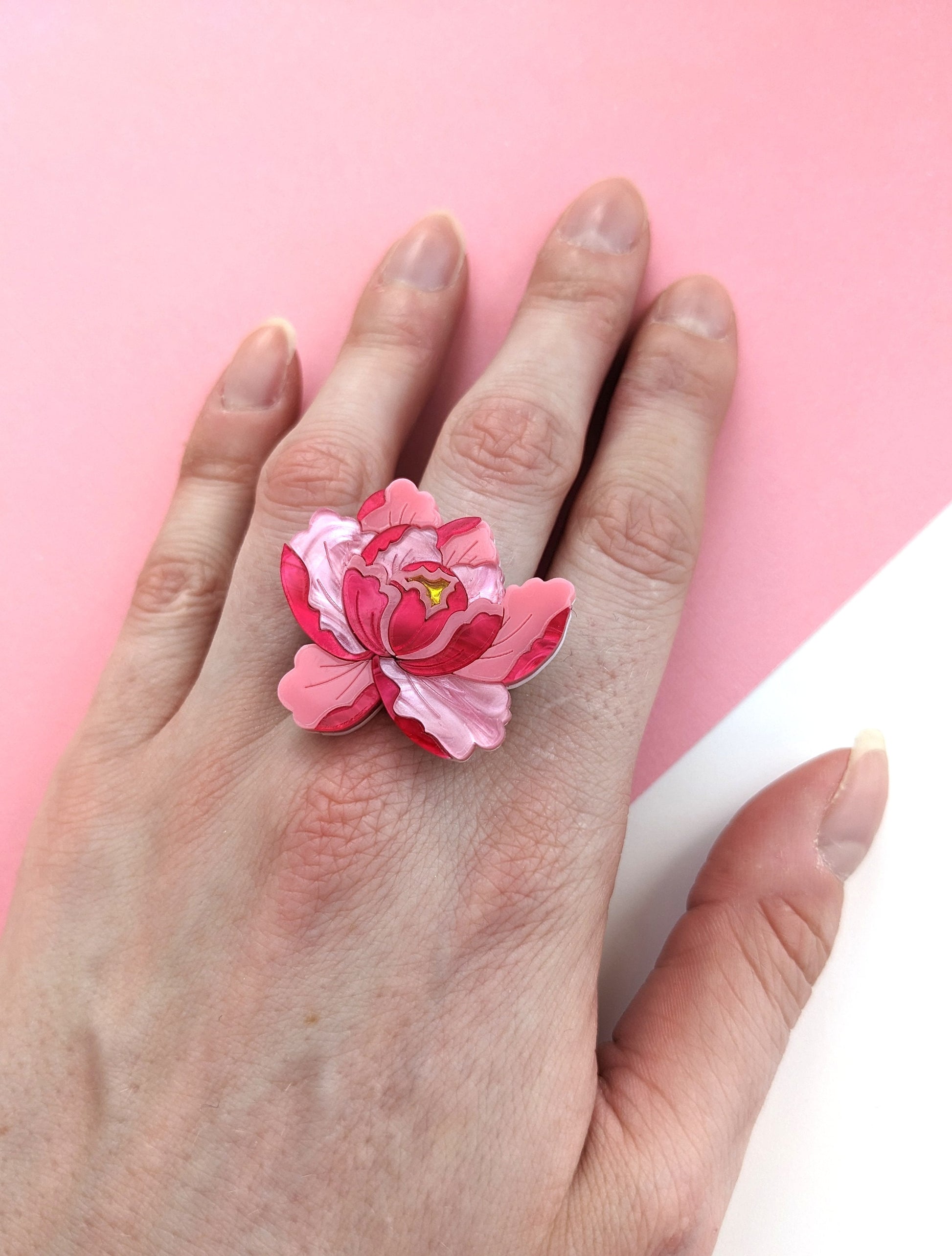 Inspired by Japanese style this peony ring is made from 24 individually laser cut pieces. It's quite a statement looking piece that coordinates nicely with the other pieces from this collection. The ring measures approximately h3.2cm x w3.3cm and feature a mixture of hand mixed pearl marble, plain and mirror acrylic. The ring shank is adjustable accommodating UK size M - UK size Q. US 6 - 8 1/2. EU 52 - 58 (though my middle finger is about an L and I find it comfortable on there). This ring isn't meant for heavy duty wear and it is advised to take it off during activities that may cause the ring to get knocked. It's also advised to take the ring off when you wash your hands.