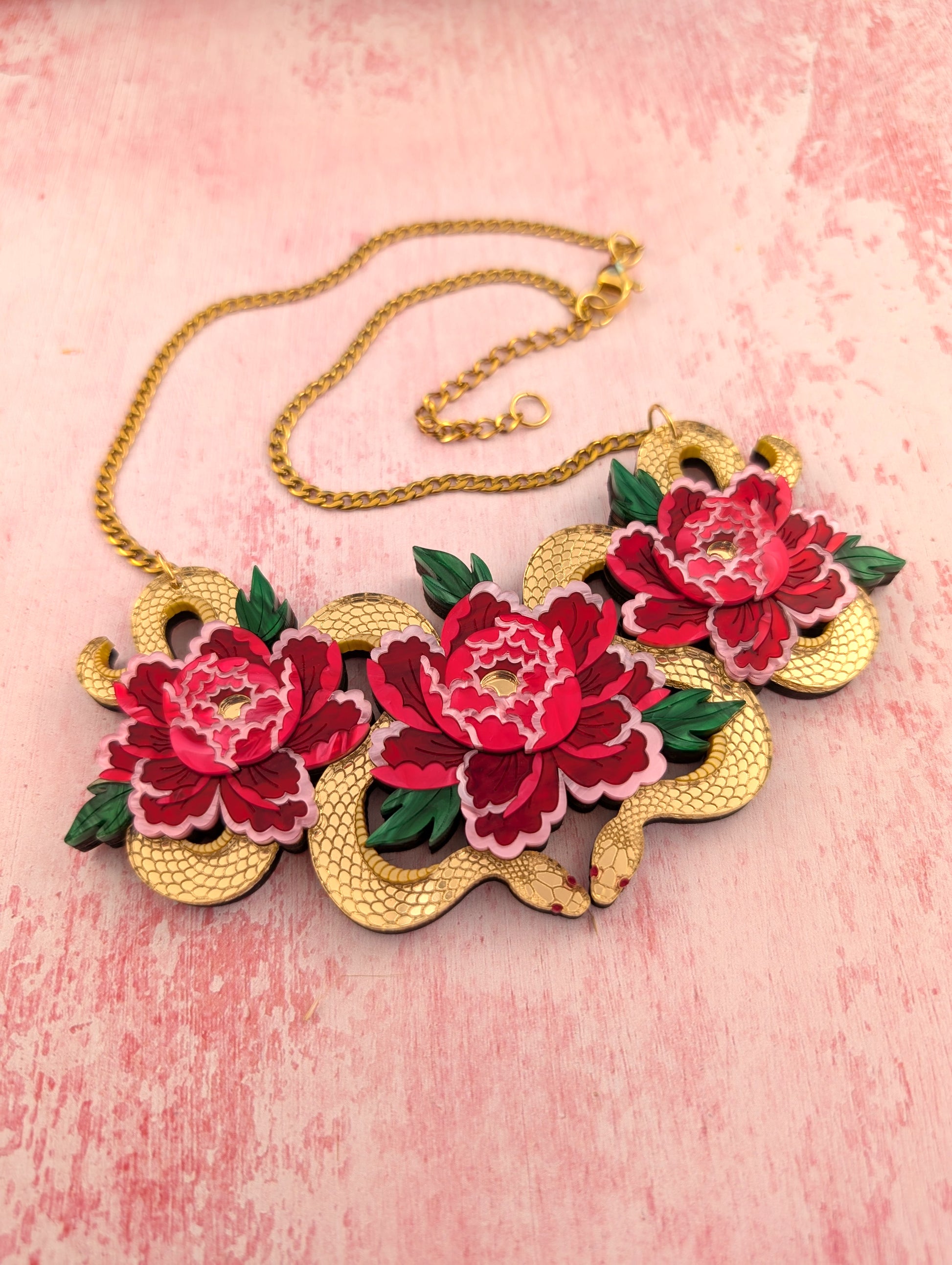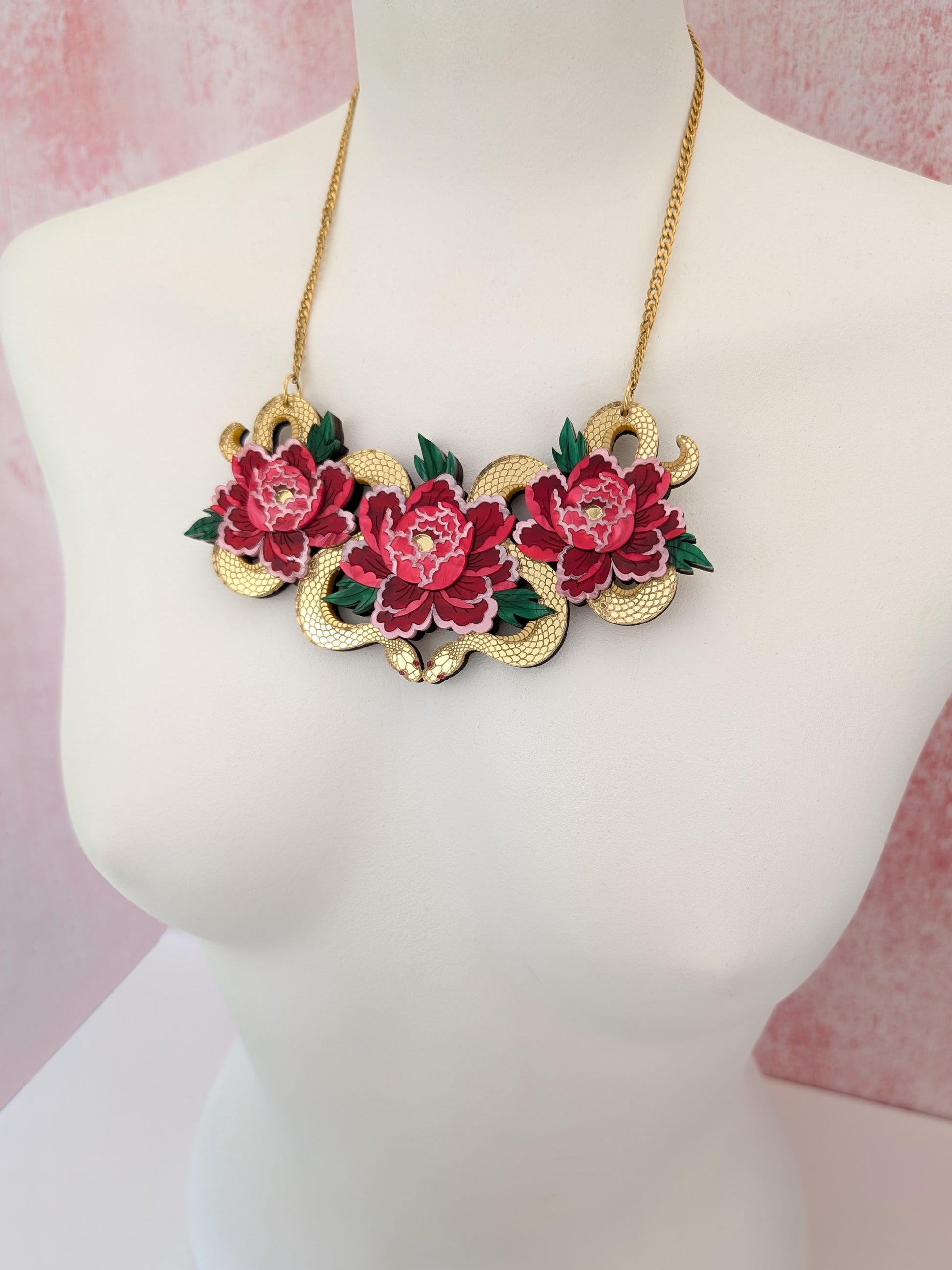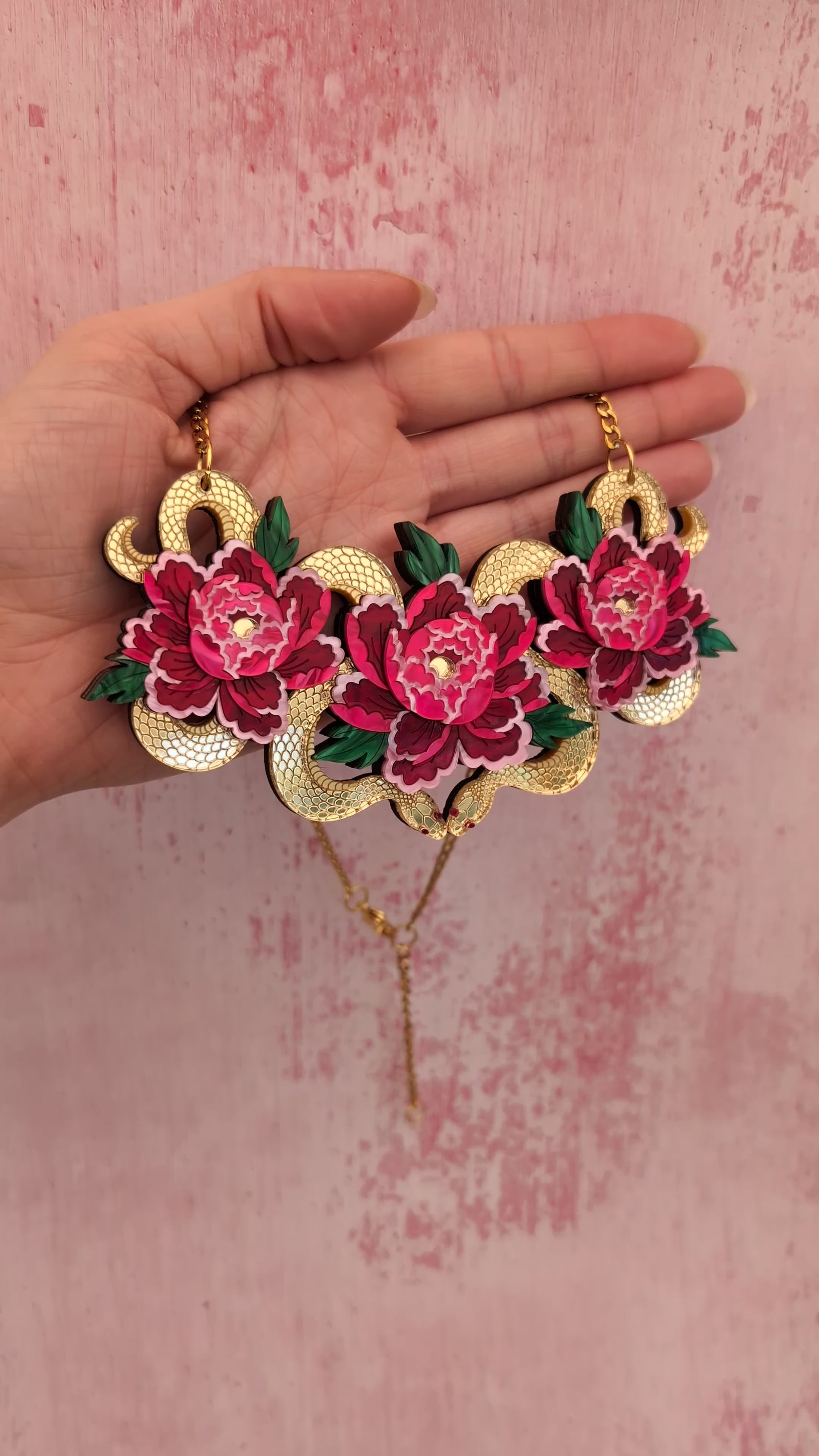 This is a medium sized option for the necklace but its still a striking piece, measuring in at w140mm x h75mm. The piece consists of a striking gold mirror acrylic for the snakes and red, vibrant pink, pale pink, and green pearl marble acrylic for the flowers. Please note that there may be variation between pieces. The chain and findings are made from anti tarnish gold plated stainless steel and the design is backed onto a 3.6mm varnished ash veneered plywood base for lightness and wear ability. It is for this reason that the piece doesn't feel bulky when on and it's super easy to wear. I'm wearing the necklaces on the shortest length in the photos. The chain measures approximately 39cm extending up to 47cm. If you think you'll need extra length you can message me or leave me a note for a couple more inches of the main chain.