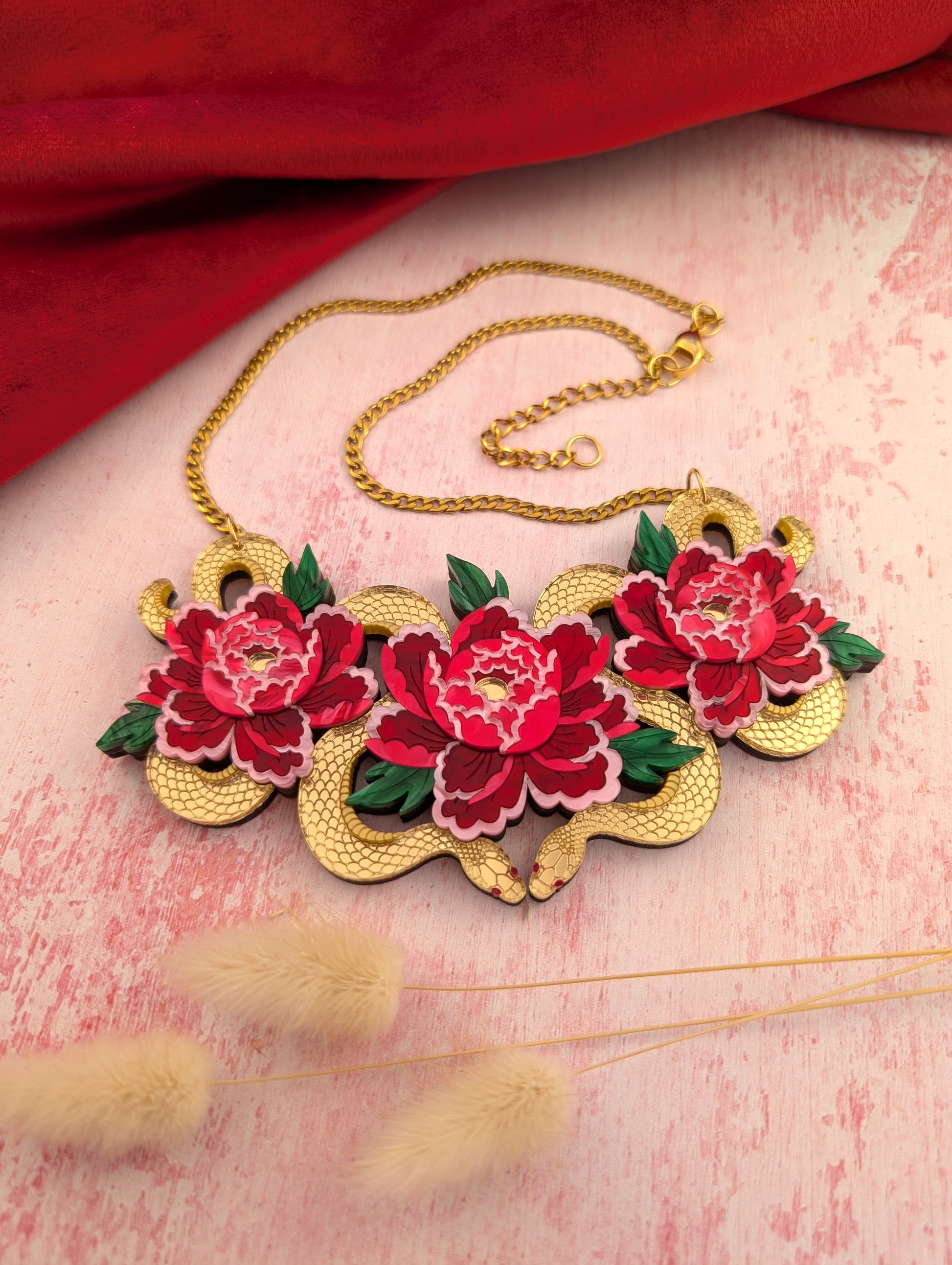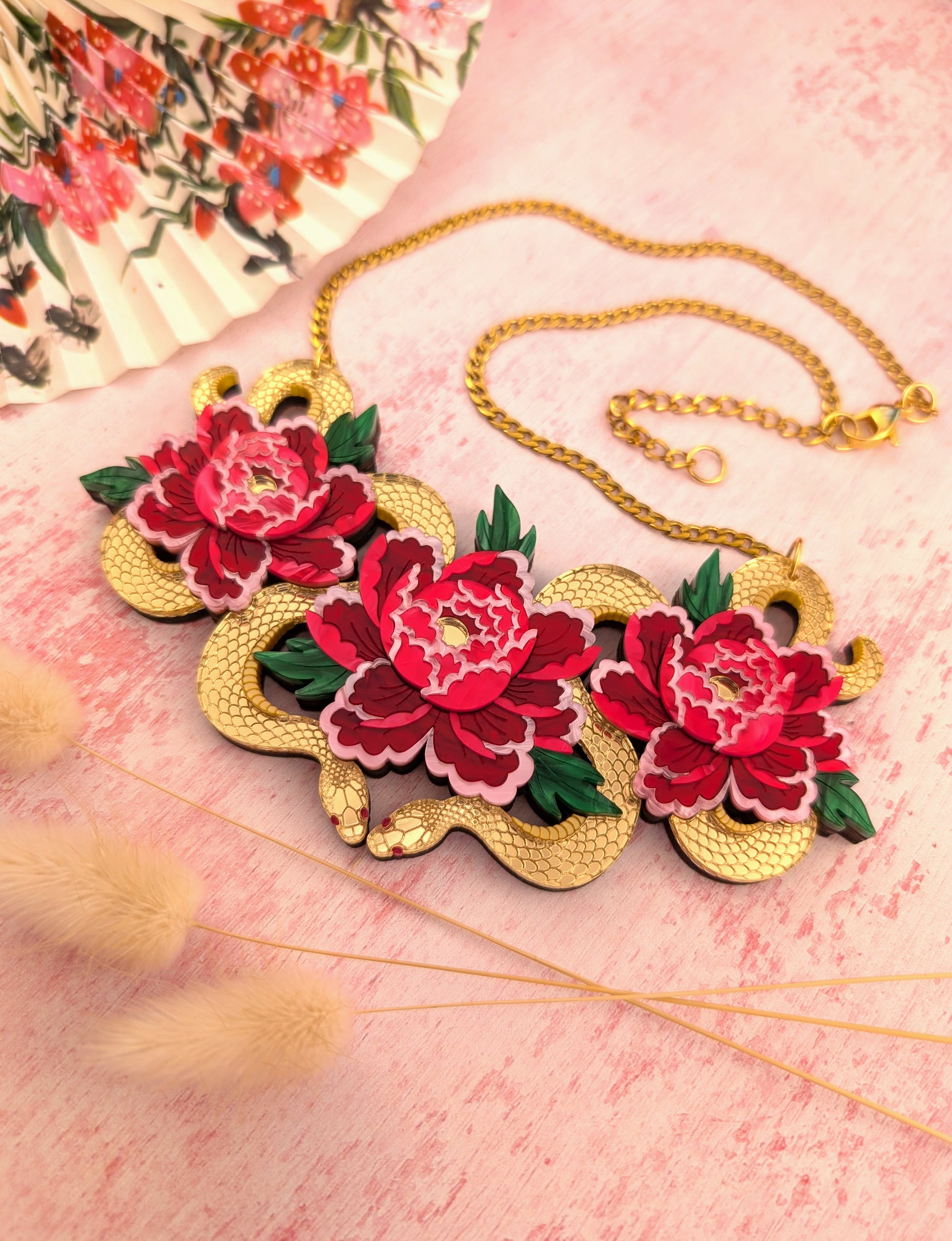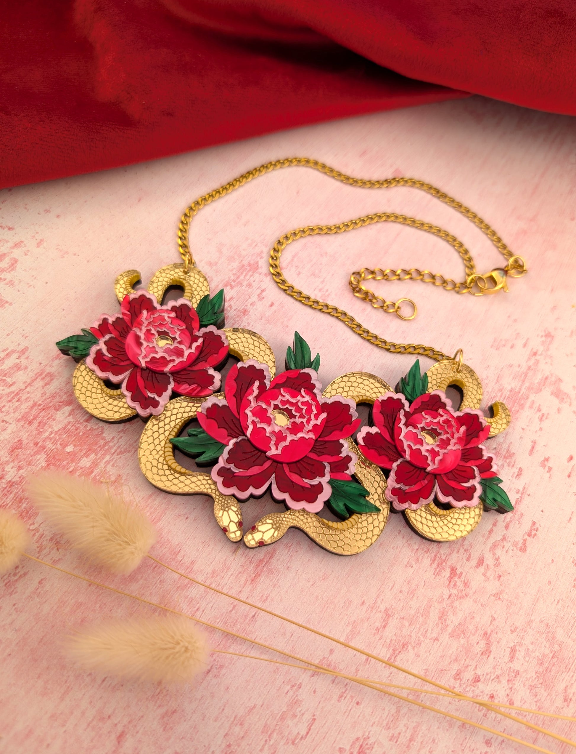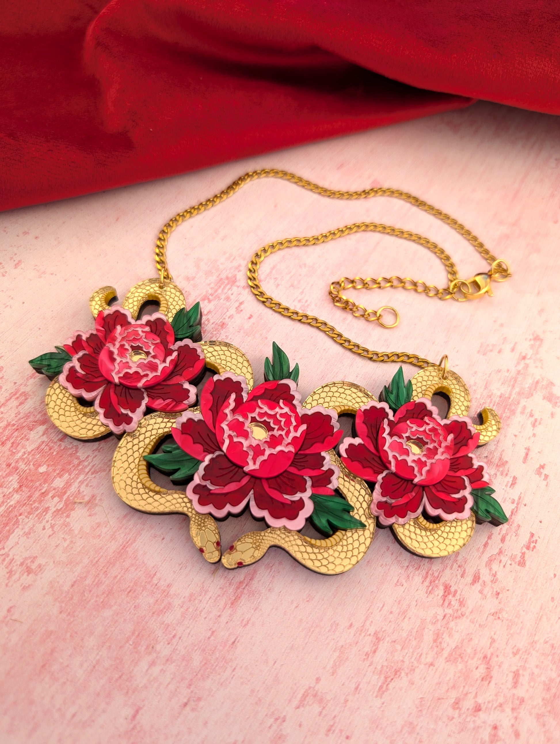 This is a medium sized option for the necklace but its still a striking piece, measuring in at w140mm x h75mm. The piece consists of a striking gold mirror acrylic for the snakes and red, vibrant pink, pale pink, and green pearl marble acrylic for the flowers. Please note that there may be variation between pieces. The chain and findings are made from anti tarnish gold plated stainless steel and the design is backed onto a 3.6mm varnished ash veneered plywood base for lightness and wear ability. It is for this reason that the piece doesn't feel bulky when on and it's super easy to wear. I'm wearing the necklaces on the shortest length in the photos. The chain measures approximately 39cm extending up to 47cm. If you think you'll need extra length you can message me or leave me a note for a couple more inches of the main chain.