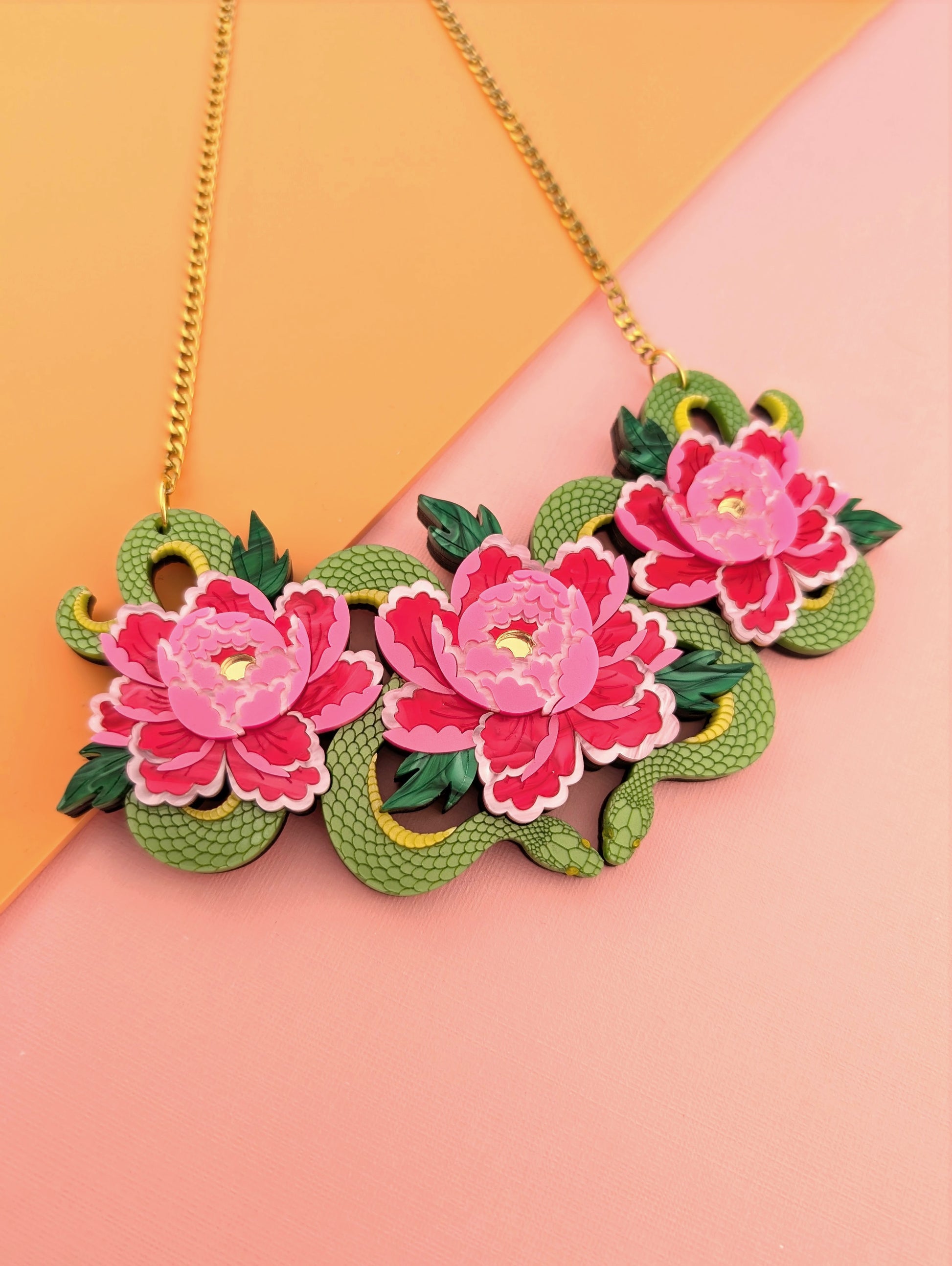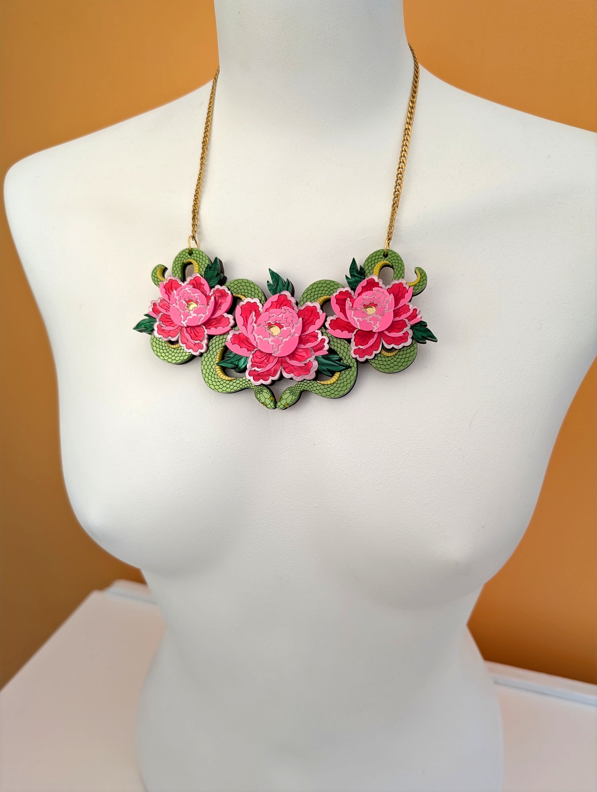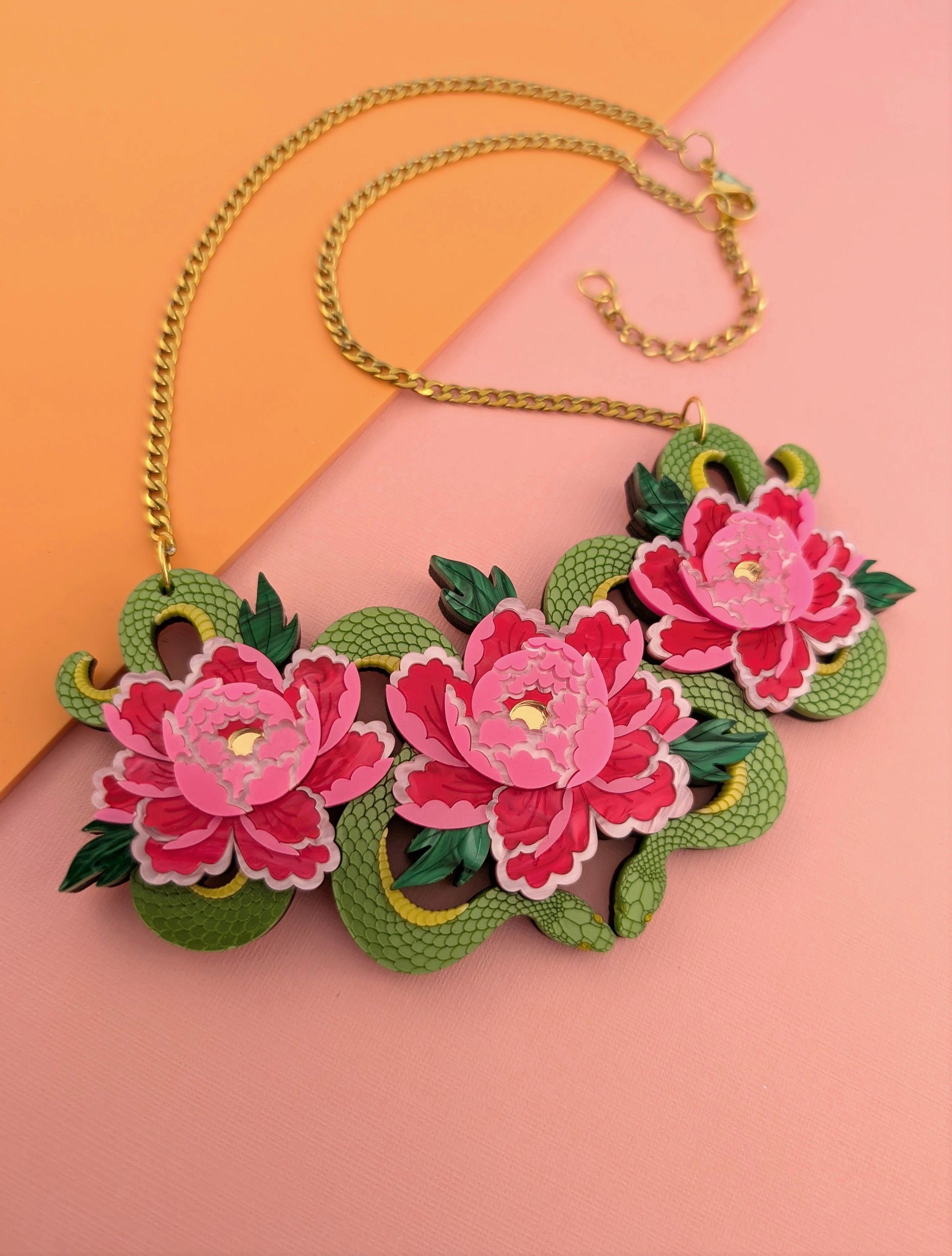 This is a medium sized option for the necklace but its still a striking piece, measuring in at w140mm x h75mm. The piece consists of a metallic kiwi green acrylic for the snakes and two shades of pink, and green pearl marble acrylic as well as a subtle pink metallic for the flowers. The chain and findings are made from anti tarnish gold plated stainless steel and the design is backed onto a 3.6mm varnished ash veneered plywood base for lightness and wear ability. It is for this reason that the piece doesn't feel bulky when on and it's super easy to wear. I'm wearing the necklaces on the shortest length in the photos. The chain measures approximately 39cm extending up to 47cm. If you think you'll need extra length you can message me or leave me a note for a couple more inches of the main chain. I've paired gold plated stainless steel with the design but there's no reason why a silver tone stainless steel chain wouldn't work, so I've made that an option for you with frosted yellow flower centres instead, I just haven't made one up to show but the floral pictured is an example what it would look like.
