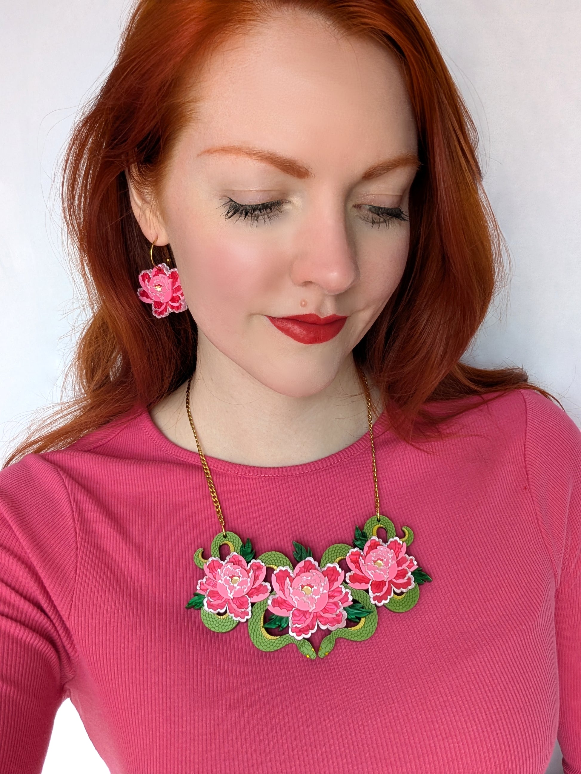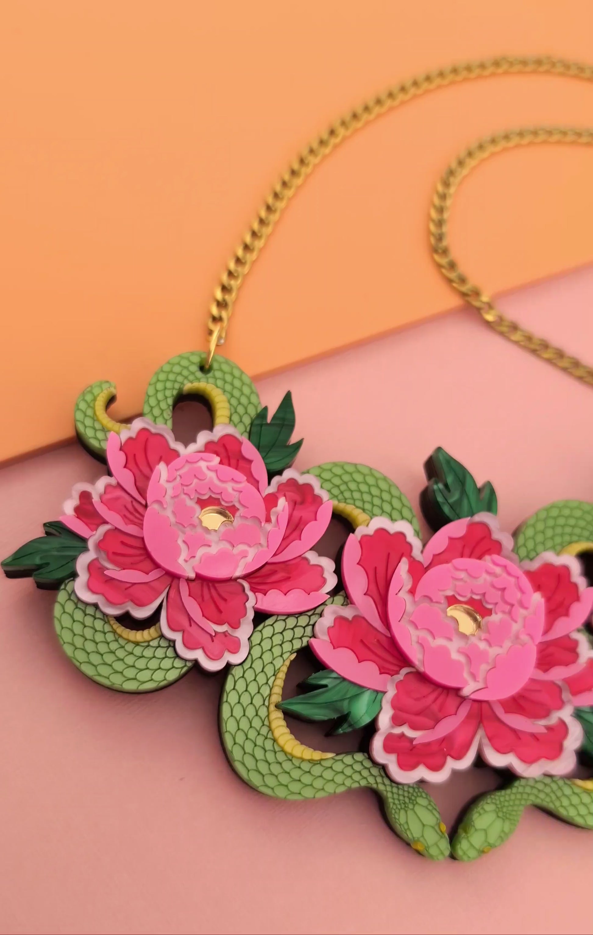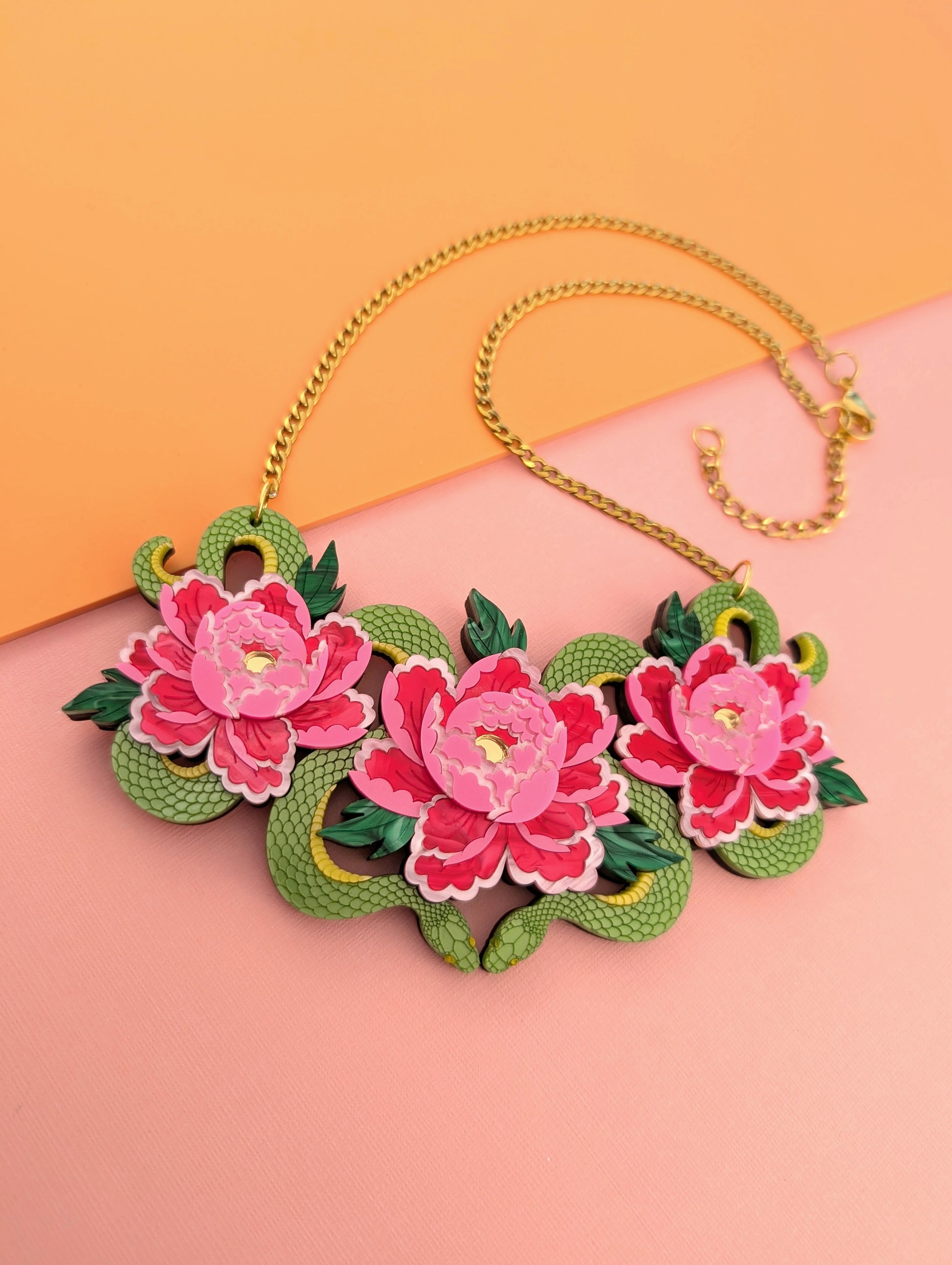 This is a medium sized option for the necklace but its still a striking piece, measuring in at w140mm x h75mm. The piece consists of a metallic kiwi green acrylic for the snakes and two shades of pink, and green pearl marble acrylic as well as a subtle pink metallic for the flowers. The chain and findings are made from anti tarnish gold plated stainless steel and the design is backed onto a 3.6mm varnished ash veneered plywood base for lightness and wear ability. It is for this reason that the piece doesn't feel bulky when on and it's super easy to wear. I'm wearing the necklaces on the shortest length in the photos. The chain measures approximately 39cm extending up to 47cm. If you think you'll need extra length you can message me or leave me a note for a couple more inches of the main chain. I've paired gold plated stainless steel with the design but there's no reason why a silver tone stainless steel chain wouldn't work, so I've made that an option for you with frosted yellow flower centres instead, I just haven't made one up to show but the floral pictured is an example what it would look like.